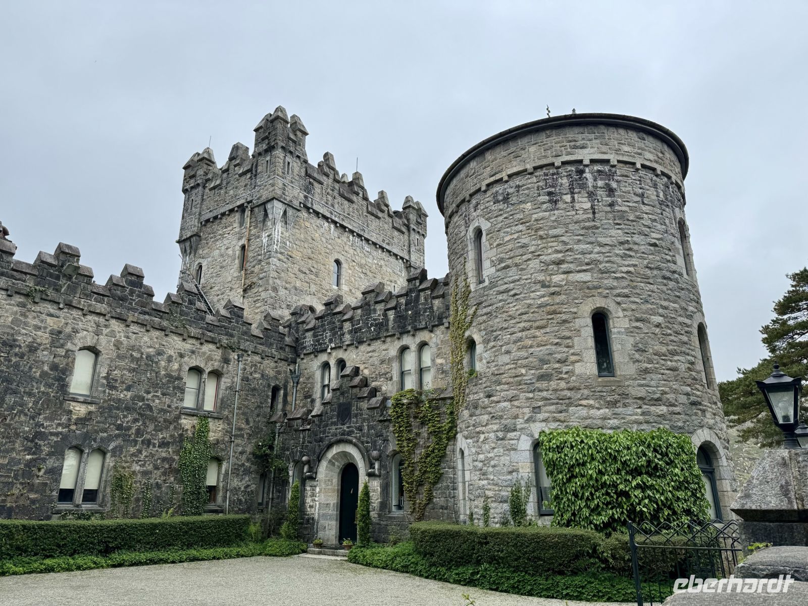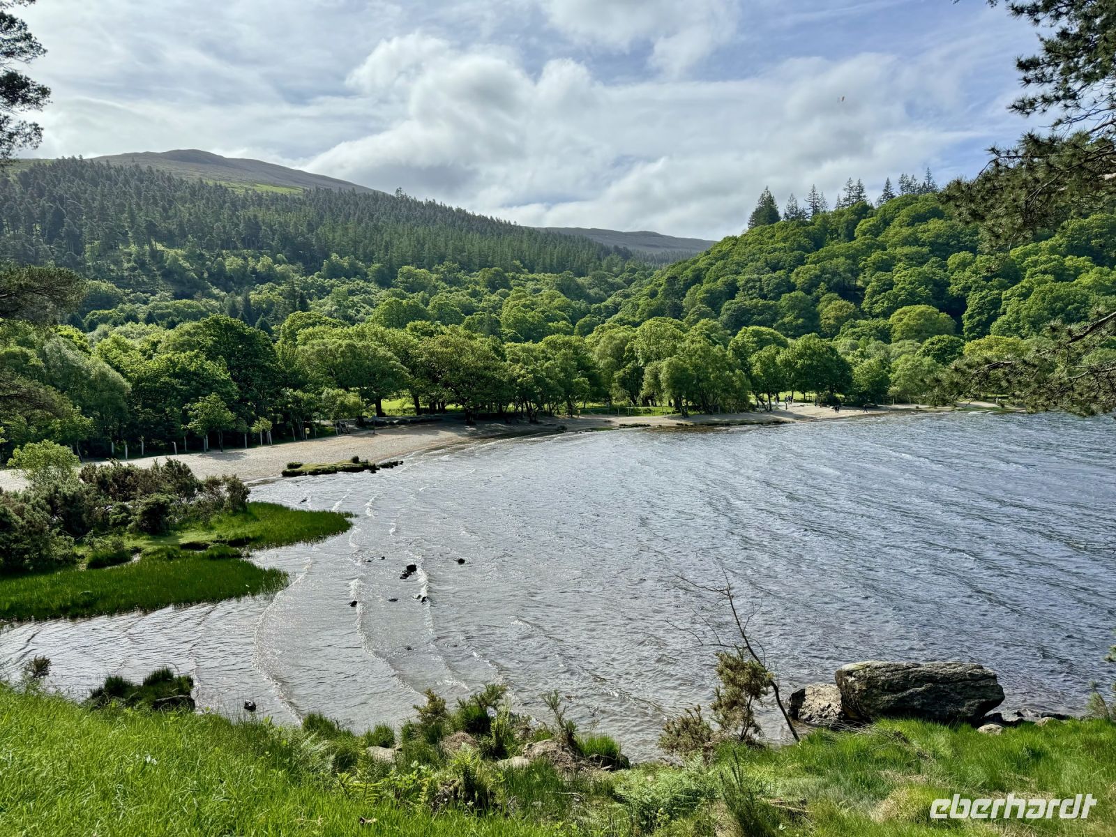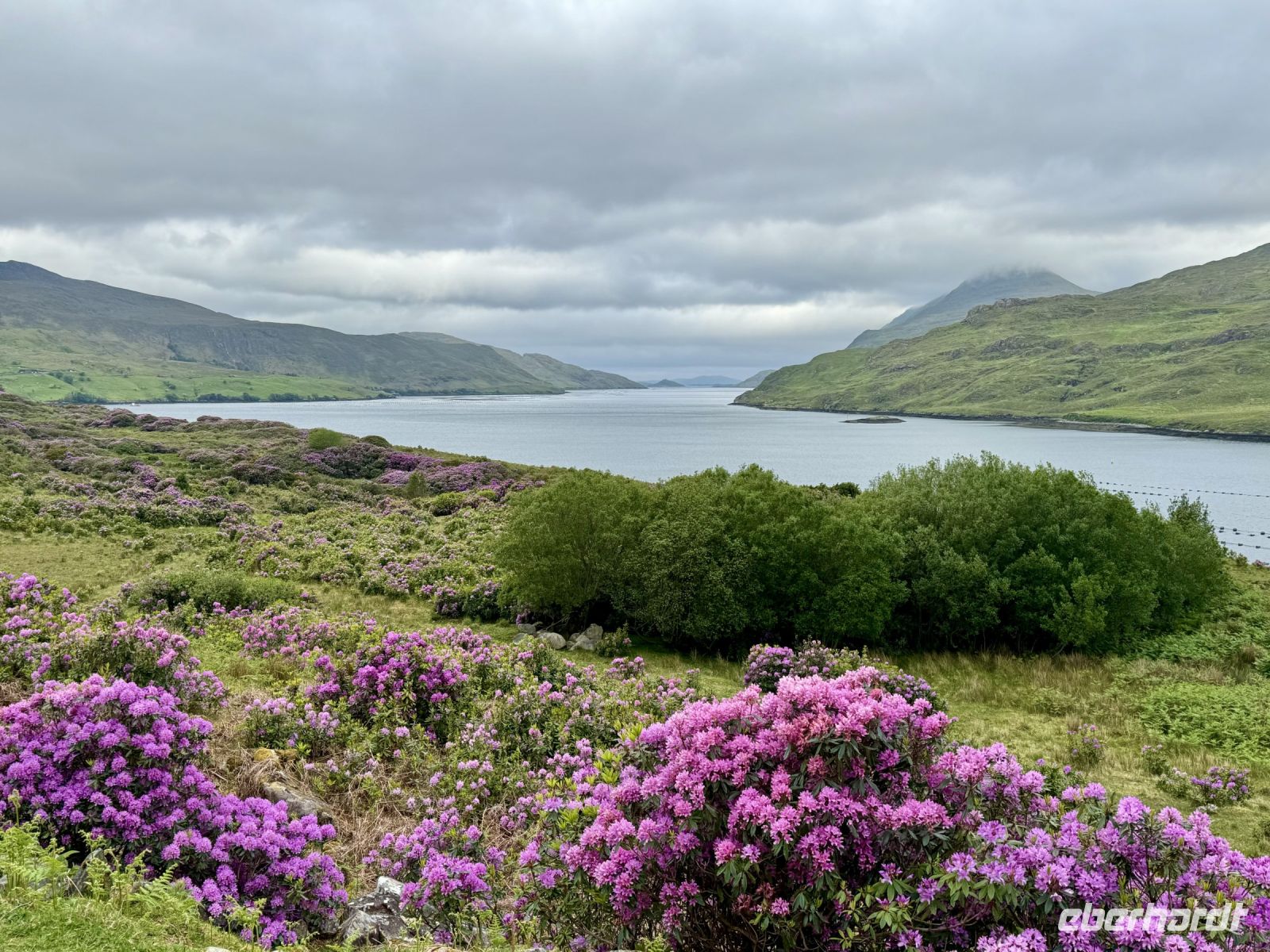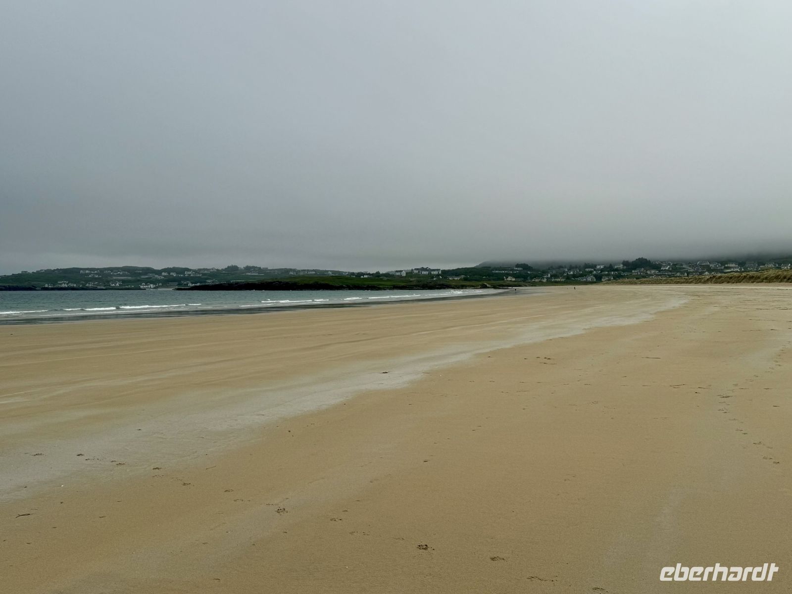 Ach, mein Herz schlägt für Glenveagh! Wären da nicht die Midges, die uns Wanderer vor allem im Sommer plagen, aber auch im Mai schon an einigen Stellen in kleinen Schwärmen auftreten, würde ich glatt einziehen in das hübsche kleine Schloss am Lough Veagh im Herzen der Derryveagh Mountains. Nach einer halben Stunde Fahrt haben wir den Nationalpark erreicht. Ein kurzer Film sorgt für die passende historische und musikalische Einstimmung auf den heutigen Tag. Mit einem Shuttlebus werden wir vom Besucherzentrum zum Castle gebracht und brechen von dort alsbald auf unsere erste gemeinsame Wanderung auf dieser Reise auf. Eine gute Gelegenheit, Ausrüstung und Kondition zu testen und miteinander ins Gespräch zu kommen … würde einen nicht die herrliche Landschaft des Tals immer wieder ablenken und zum Staunen bringen. Wir laufen am See entlang durch einen alten Eichenwald bis zu einem kleinen weißen Cottage, wo wir zur Stärkung für den Rückweg eine Pause einlegen. Donal ist die letzten Meter schon vorgelaufen und räumt uns Stühle vor die Hütte. Auf dem Rückweg zum Schloss machen wir fast alle einen Abstecher zum Aussichtspunkt. Die kurze Quälerei den Hügel hinauf lohnt sich immer wieder, werden wir doch mit einer wunderbaren Aussicht über das ganze Tal belohnt. Ein just in diesem Moment heraufziehender Regenschauer kann uns nicht die gute Stimmung verderben, zumal er schnell wieder endet. Unsere Wanderung endet im Park bzw. viktorianischen Garten des Schlosses, der uns mit einer wahren Blütenpracht in Rot, Weiß, Gelb und einem zarten Rosa empfängt. Nun können wir uns im Schlosscafé mit einem Kaffee, Tee, Kuchen oder warmen Essen belohnen, weiter die Gartenanlage erkunden und sogar noch ein paar zusätzliche Schritte sammeln, indem wir auch die vier Kilometer zurück zum Busparkplatz laufen. Den Rest des Nachmittags verbringen wir mir einer kleinen Rundfahrt durch das County Donegal. Sie führt uns an einen weiteren schönen Aussichtspunkt oberhalb des Poisoned Glen. Nur leider hängt ein dichter Nebel über allem, sodass wir auch den Mount Errigal, den höchsten Berg Donegals, nur schemenhaft erahnen können. Je tiefer wir kommen, desto mehr (Meer) können wir wieder sehen. Am Strand von Dunfanaghy sind wir fast alleine und können unsere Freude ganz ungezwungen hinausrufen. Wir können gut verstehen, dass die Iren hier an diesem schönen Sandstrand den Sommer über gerne Urlaub machen, obgleich das Wasser des Nordatlantiks noch etwas kalt ist. Da wir immer noch mit unserem kleinen Sprinter unterwegs sind, können wir auf der Rückfahrt nach Letterkenny sogar noch einen Abstecher zum Doe Castle machen, einem irischen Wohnturm aus dem 15. Jahrhundert, wunderschön an einer tiefen Bucht gelegen.