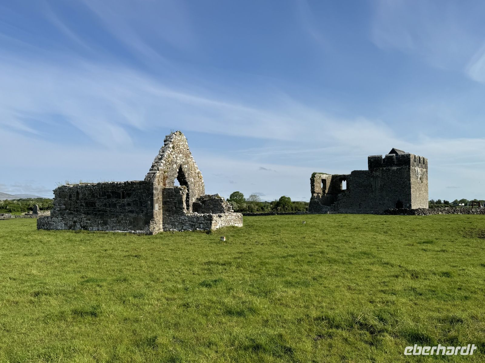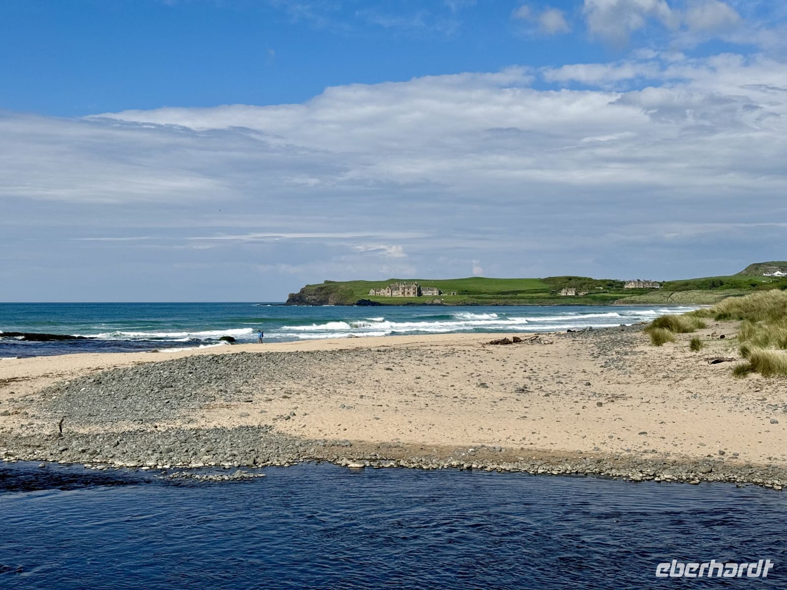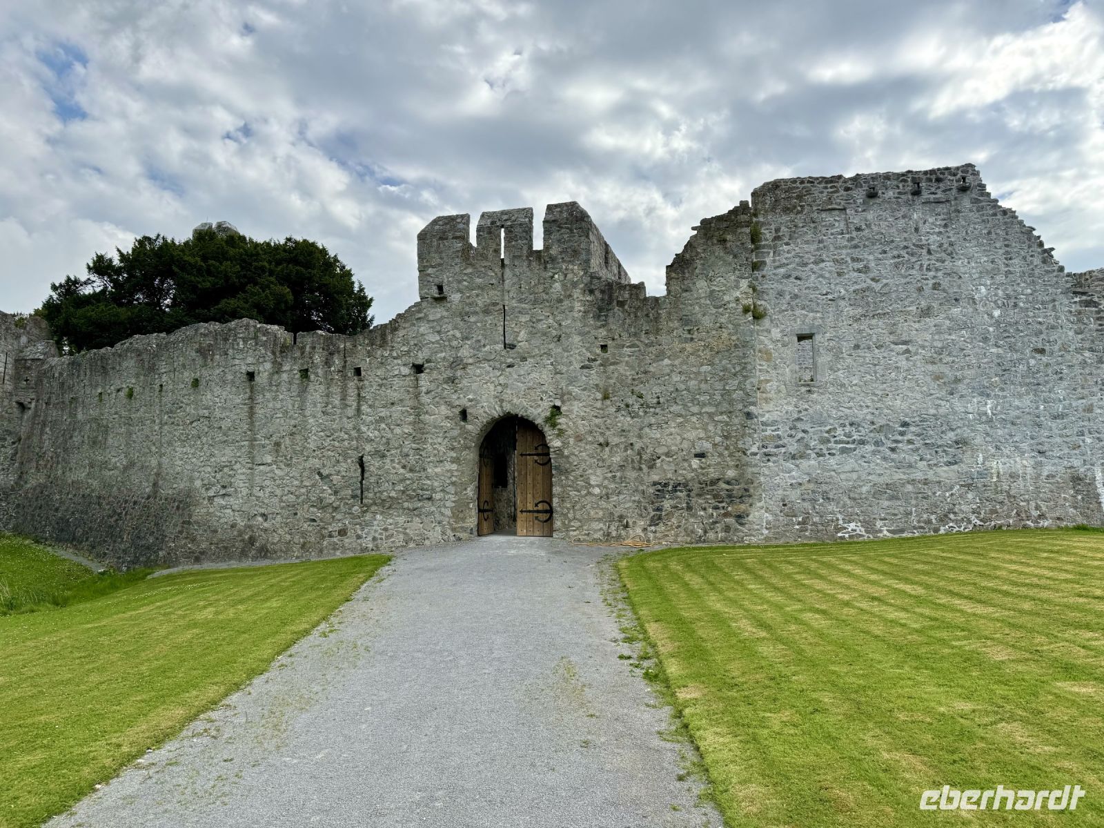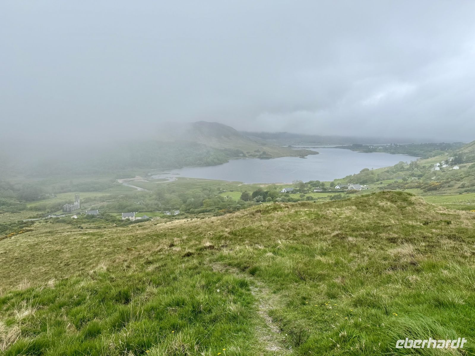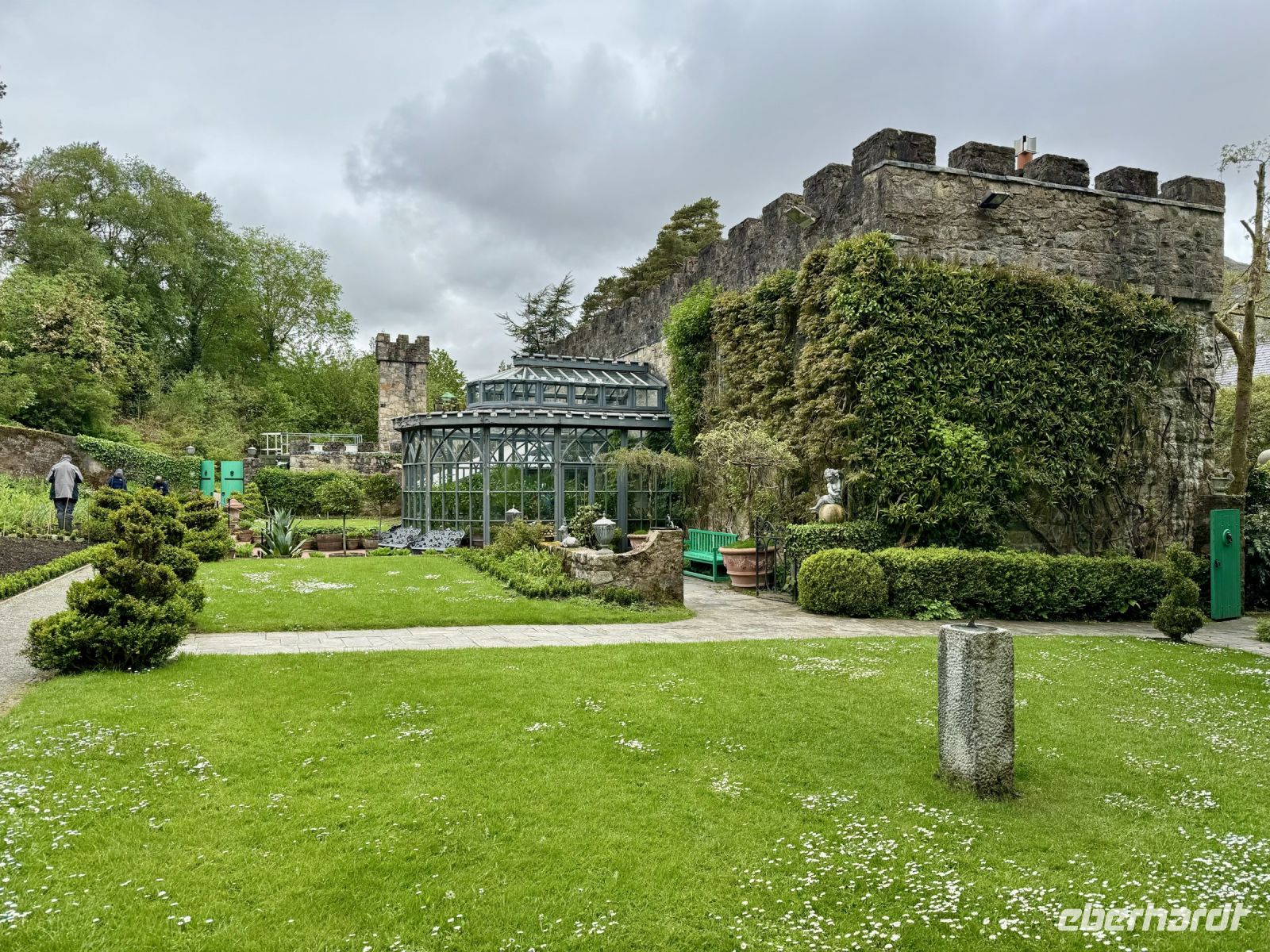 Ach, mein Herz schlägt für Glenveagh! Wären da nicht die Midges, die uns Wanderer vor allem im Sommer plagen, aber auch im Mai schon an einigen Stellen in kleinen Schwärmen auftreten, würde ich glatt einziehen in das hübsche kleine Schloss am Lough Veagh im Herzen der Derryveagh Mountains. Nach einer halben Stunde Fahrt haben wir den Nationalpark erreicht. Ein kurzer Film sorgt für die passende historische und musikalische Einstimmung auf den heutigen Tag. Mit einem Shuttlebus werden wir vom Besucherzentrum zum Castle gebracht und brechen von dort alsbald auf unsere erste gemeinsame Wanderung auf dieser Reise auf. Eine gute Gelegenheit, Ausrüstung und Kondition zu testen und miteinander ins Gespräch zu kommen … würde einen nicht die herrliche Landschaft des Tals immer wieder ablenken und zum Staunen bringen. Wir laufen am See entlang durch einen alten Eichenwald bis zu einem kleinen weißen Cottage, wo wir zur Stärkung für den Rückweg eine Pause einlegen. Donal ist die letzten Meter schon vorgelaufen und räumt uns Stühle vor die Hütte. Auf dem Rückweg zum Schloss machen wir fast alle einen Abstecher zum Aussichtspunkt. Die kurze Quälerei den Hügel hinauf lohnt sich immer wieder, werden wir doch mit einer wunderbaren Aussicht über das ganze Tal belohnt. Ein just in diesem Moment heraufziehender Regenschauer kann uns nicht die gute Stimmung verderben, zumal er schnell wieder endet. Unsere Wanderung endet im Park bzw. viktorianischen Garten des Schlosses, der uns mit einer wahren Blütenpracht in Rot, Weiß, Gelb und einem zarten Rosa empfängt. Nun können wir uns im Schlosscafé mit einem Kaffee, Tee, Kuchen oder warmen Essen belohnen, weiter die Gartenanlage erkunden und sogar noch ein paar zusätzliche Schritte sammeln, indem wir auch die vier Kilometer zurück zum Busparkplatz laufen. Den Rest des Nachmittags verbringen wir mir einer kleinen Rundfahrt durch das County Donegal. Sie führt uns an einen weiteren schönen Aussichtspunkt oberhalb des Poisoned Glen. Nur leider hängt ein dichter Nebel über allem, sodass wir auch den Mount Errigal, den höchsten Berg Donegals, nur schemenhaft erahnen können. Je tiefer wir kommen, desto mehr (Meer) können wir wieder sehen. Am Strand von Dunfanaghy sind wir fast alleine und können unsere Freude ganz ungezwungen hinausrufen. Wir können gut verstehen, dass die Iren hier an diesem schönen Sandstrand den Sommer über gerne Urlaub machen, obgleich das Wasser des Nordatlantiks noch etwas kalt ist. Da wir immer noch mit unserem kleinen Sprinter unterwegs sind, können wir auf der Rückfahrt nach Letterkenny sogar noch einen Abstecher zum Doe Castle machen, einem irischen Wohnturm aus dem 15. Jahrhundert, wunderschön an einer tiefen Bucht gelegen.