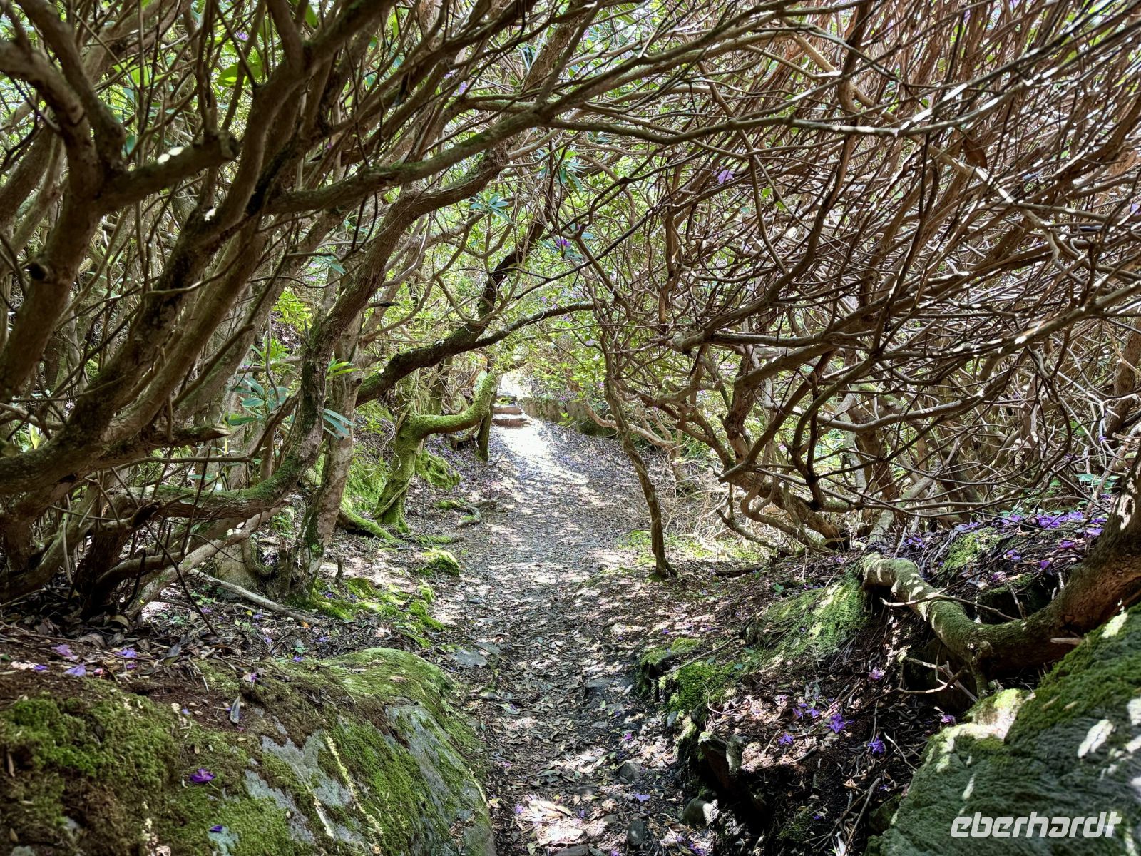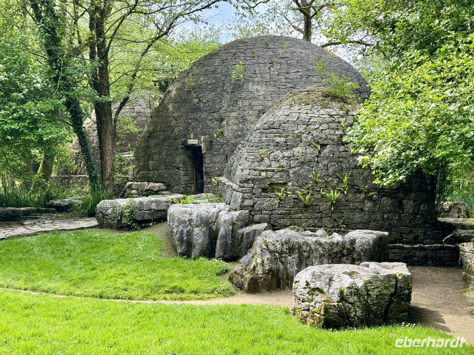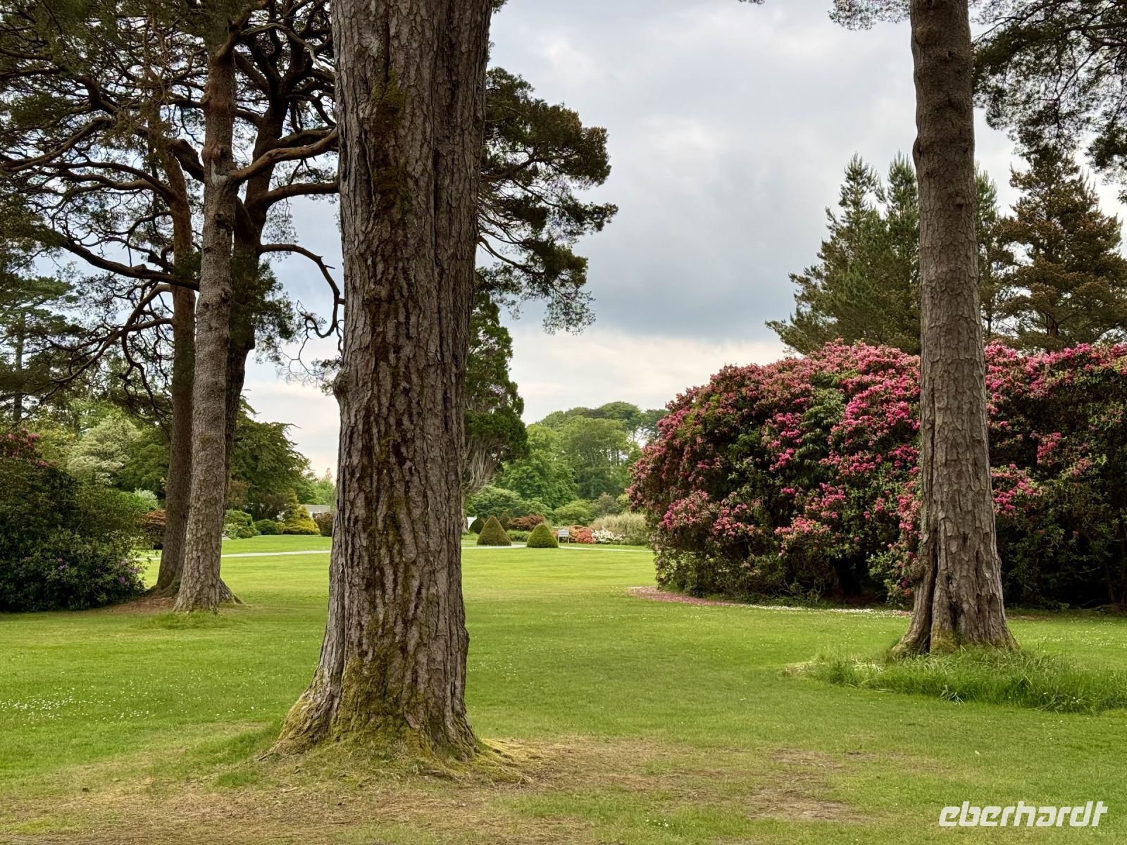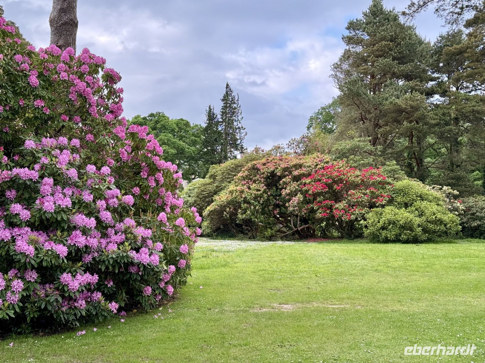 Ach, mein Herz schlägt für Glenveagh! Wären da nicht die Midges, die uns Wanderer vor allem im Sommer plagen, aber auch im Mai schon an einigen Stellen in kleinen Schwärmen auftreten, würde ich glatt einziehen in das hübsche kleine Schloss am Lough Veagh im Herzen der Derryveagh Mountains. Nach einer halben Stunde Fahrt haben wir den Nationalpark erreicht. Ein kurzer Film sorgt für die passende historische und musikalische Einstimmung auf den heutigen Tag. Mit einem Shuttlebus werden wir vom Besucherzentrum zum Castle gebracht und brechen von dort alsbald auf unsere erste gemeinsame Wanderung auf dieser Reise auf. Eine gute Gelegenheit, Ausrüstung und Kondition zu testen und miteinander ins Gespräch zu kommen … würde einen nicht die herrliche Landschaft des Tals immer wieder ablenken und zum Staunen bringen. Wir laufen am See entlang durch einen alten Eichenwald bis zu einem kleinen weißen Cottage, wo wir zur Stärkung für den Rückweg eine Pause einlegen. Donal ist die letzten Meter schon vorgelaufen und räumt uns Stühle vor die Hütte. Auf dem Rückweg zum Schloss machen wir fast alle einen Abstecher zum Aussichtspunkt. Die kurze Quälerei den Hügel hinauf lohnt sich immer wieder, werden wir doch mit einer wunderbaren Aussicht über das ganze Tal belohnt. Ein just in diesem Moment heraufziehender Regenschauer kann uns nicht die gute Stimmung verderben, zumal er schnell wieder endet. Unsere Wanderung endet im Park bzw. viktorianischen Garten des Schlosses, der uns mit einer wahren Blütenpracht in Rot, Weiß, Gelb und einem zarten Rosa empfängt. Nun können wir uns im Schlosscafé mit einem Kaffee, Tee, Kuchen oder warmen Essen belohnen, weiter die Gartenanlage erkunden und sogar noch ein paar zusätzliche Schritte sammeln, indem wir auch die vier Kilometer zurück zum Busparkplatz laufen. Den Rest des Nachmittags verbringen wir mir einer kleinen Rundfahrt durch das County Donegal. Sie führt uns an einen weiteren schönen Aussichtspunkt oberhalb des Poisoned Glen. Nur leider hängt ein dichter Nebel über allem, sodass wir auch den Mount Errigal, den höchsten Berg Donegals, nur schemenhaft erahnen können. Je tiefer wir kommen, desto mehr (Meer) können wir wieder sehen. Am Strand von Dunfanaghy sind wir fast alleine und können unsere Freude ganz ungezwungen hinausrufen. Wir können gut verstehen, dass die Iren hier an diesem schönen Sandstrand den Sommer über gerne Urlaub machen, obgleich das Wasser des Nordatlantiks noch etwas kalt ist. Da wir immer noch mit unserem kleinen Sprinter unterwegs sind, können wir auf der Rückfahrt nach Letterkenny sogar noch einen Abstecher zum Doe Castle machen, einem irischen Wohnturm aus dem 15. Jahrhundert, wunderschön an einer tiefen Bucht gelegen.