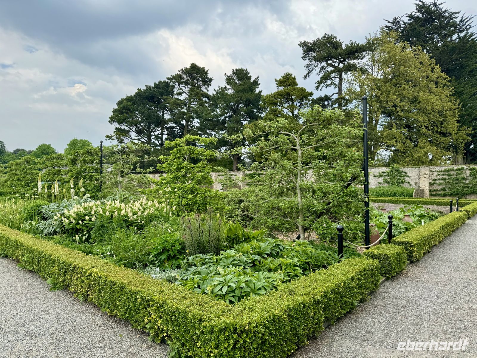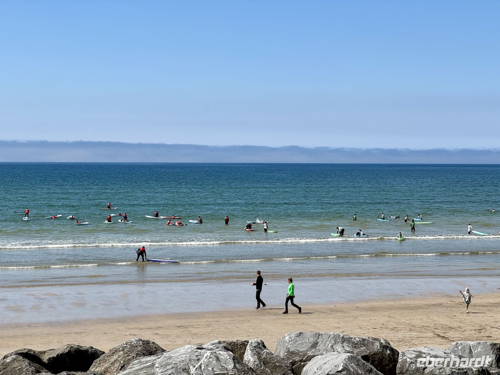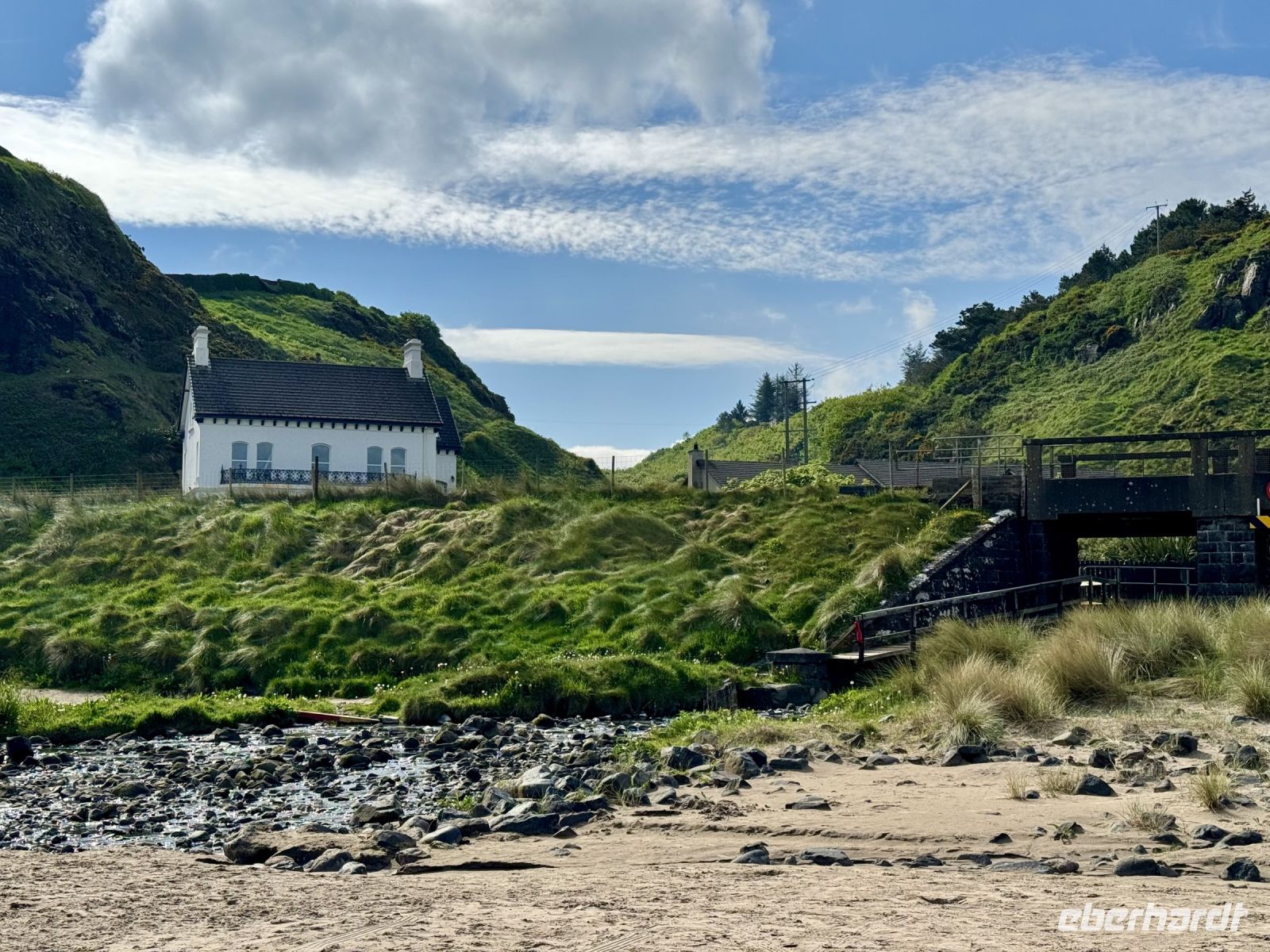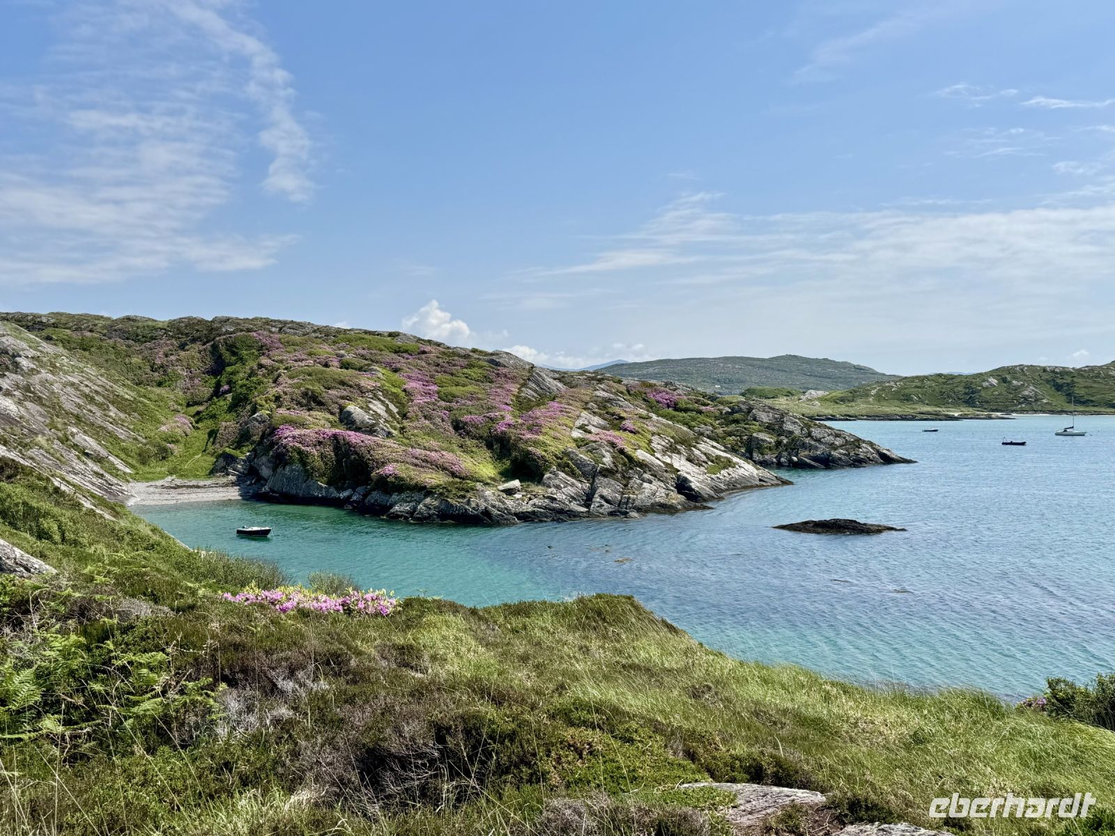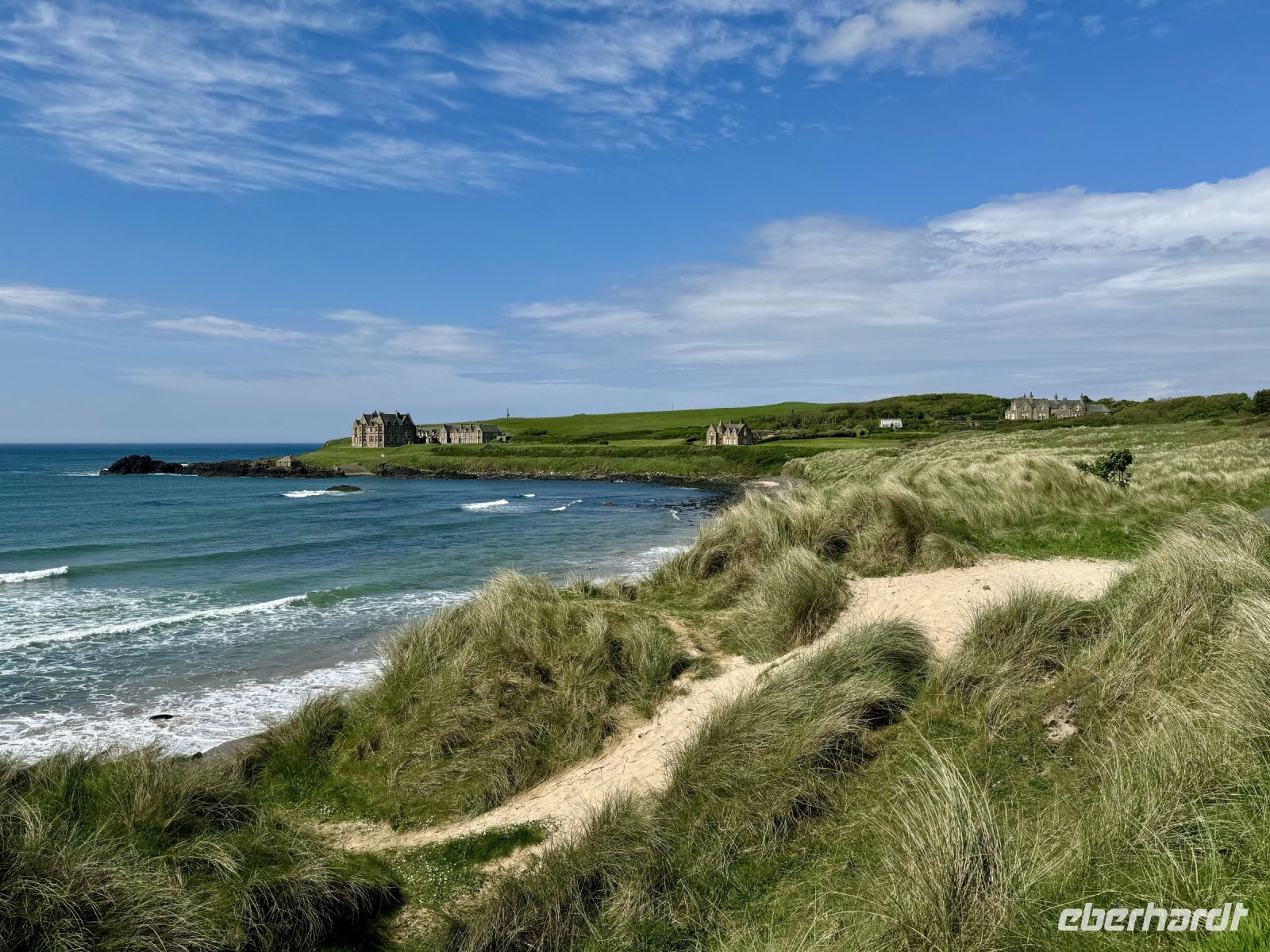 Ach, mein Herz schlägt für Glenveagh! Wären da nicht die Midges, die uns Wanderer vor allem im Sommer plagen, aber auch im Mai schon an einigen Stellen in kleinen Schwärmen auftreten, würde ich glatt einziehen in das hübsche kleine Schloss am Lough Veagh im Herzen der Derryveagh Mountains. Nach einer halben Stunde Fahrt haben wir den Nationalpark erreicht. Ein kurzer Film sorgt für die passende historische und musikalische Einstimmung auf den heutigen Tag. Mit einem Shuttlebus werden wir vom Besucherzentrum zum Castle gebracht und brechen von dort alsbald auf unsere erste gemeinsame Wanderung auf dieser Reise auf. Eine gute Gelegenheit, Ausrüstung und Kondition zu testen und miteinander ins Gespräch zu kommen … würde einen nicht die herrliche Landschaft des Tals immer wieder ablenken und zum Staunen bringen. Wir laufen am See entlang durch einen alten Eichenwald bis zu einem kleinen weißen Cottage, wo wir zur Stärkung für den Rückweg eine Pause einlegen. Donal ist die letzten Meter schon vorgelaufen und räumt uns Stühle vor die Hütte. Auf dem Rückweg zum Schloss machen wir fast alle einen Abstecher zum Aussichtspunkt. Die kurze Quälerei den Hügel hinauf lohnt sich immer wieder, werden wir doch mit einer wunderbaren Aussicht über das ganze Tal belohnt. Ein just in diesem Moment heraufziehender Regenschauer kann uns nicht die gute Stimmung verderben, zumal er schnell wieder endet. Unsere Wanderung endet im Park bzw. viktorianischen Garten des Schlosses, der uns mit einer wahren Blütenpracht in Rot, Weiß, Gelb und einem zarten Rosa empfängt. Nun können wir uns im Schlosscafé mit einem Kaffee, Tee, Kuchen oder warmen Essen belohnen, weiter die Gartenanlage erkunden und sogar noch ein paar zusätzliche Schritte sammeln, indem wir auch die vier Kilometer zurück zum Busparkplatz laufen. Den Rest des Nachmittags verbringen wir mir einer kleinen Rundfahrt durch das County Donegal. Sie führt uns an einen weiteren schönen Aussichtspunkt oberhalb des Poisoned Glen. Nur leider hängt ein dichter Nebel über allem, sodass wir auch den Mount Errigal, den höchsten Berg Donegals, nur schemenhaft erahnen können. Je tiefer wir kommen, desto mehr (Meer) können wir wieder sehen. Am Strand von Dunfanaghy sind wir fast alleine und können unsere Freude ganz ungezwungen hinausrufen. Wir können gut verstehen, dass die Iren hier an diesem schönen Sandstrand den Sommer über gerne Urlaub machen, obgleich das Wasser des Nordatlantiks noch etwas kalt ist. Da wir immer noch mit unserem kleinen Sprinter unterwegs sind, können wir auf der Rückfahrt nach Letterkenny sogar noch einen Abstecher zum Doe Castle machen, einem irischen Wohnturm aus dem 15. Jahrhundert, wunderschön an einer tiefen Bucht gelegen.