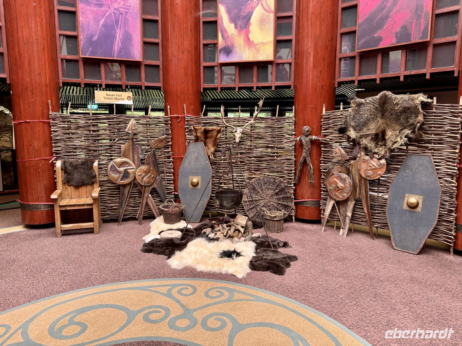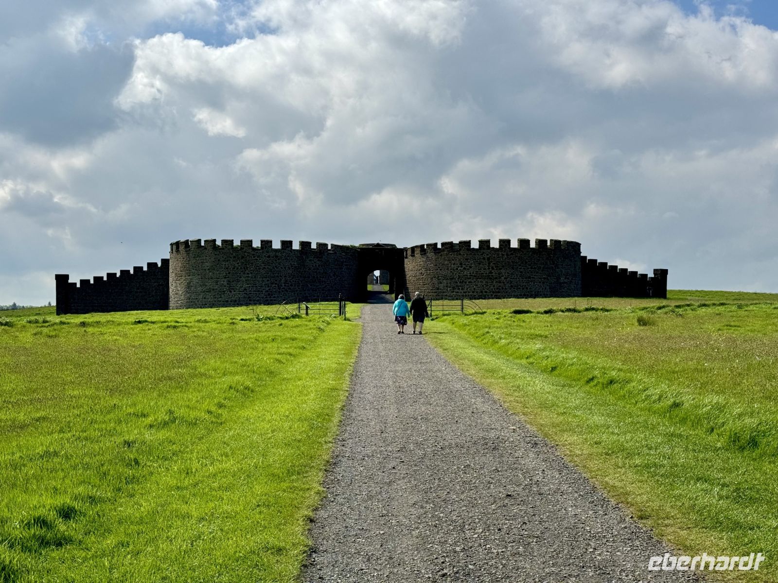 Wir stärken uns beim Frühstück und verlassen dann Dublin in Richtung Norden. Ab heute ist mein „Irish Dad“ Donal unser Fahrer. Er wird uns bis zum Ende der Tour begleiten. Wir wollen bis nach Letterkenny im County Donegal fahren, natürlich zwischendurch einige Stopps einlegen und langsam in die Geschichte und Kultur Irlands eintauchen. Welcher Ort würde sich für einen solchen Einstieg besser eignen als das historische Zentrum rund um den Königssitz Hill of Tara und das Boyne Valley? Nun, das Wetter könnte zugegebenermaßen besser sein. Ist es vielleicht der Heilige Patrick selbst, der leise Tränen vom Himmel weint, weil sein geliebtes irisches Volk langsam vom katholischen Glauben abfällt? Einst hatte er auf dem Hill of Slane das erste Osterfeuer entzündet und sein eigenes Leben riskiert, um die Iren zum Christentum zu bekehren. Auf dem Hügel finden wir im kleinen Friedhof eine Statue, die an den Nationalheiligen und seine Taten erinnert. Vom Franziskanerkloster, Jahrhunderte nach St. Patrick erbaut, sind nur noch Ruinen erhalten. In Monasterboice sehen wir unseren ersten Rundturm auf dieser Reise — und drei der berühmten irischen Hochkreuze. Die Friedhöfe der frühchristlichen Klöster sind noch immer in Benutzung, wodurch sich ein seltsamer Schwebezustand zwischen Vergangenheit und Gegenwart ergibt. Wir nähern uns langsam der irisch-nordirischen Grenze, machen eine frühe Mittagspause und setzen dann die Fahrt zum Navan Fort bei Armagh fort. Eine Umleitung aufgrund eines Unfalls kostet uns etwas Zeit, sorgt aber für schöne landschaftliche Einblicke. Die Kelten erwarten uns bereits zu Nesseltee am Lagerfeuer. Eine weise alte Frau, einst eine mächtige Kriegerin, sowie ein junger Barde erzählen uns von ihrer Kultur und ihren Bräuchen. Ein Spaziergang bei leichtem Regen (und etwas ungemütlichem Wind) bringt uns schließlich hinauf auf den Hügel, auf dem einst der mysteriöse Tempel stand, der womöglich dem keltischen Sonnengott geweiht war. Bei Kaffee, Tee und Keksen können wir uns später im Besucherzentrum aufwärmen. Zum Abschluss unseres Aufenthalts im Navan Fort wartet ein Kinobesuch auf meine Gäste: Auf dem Programm steht ein Film über den Ulster-Zyklus, die nordirische Märchen- und Sagenwelt. In der Zwischenzeit ist unser neuer Bus angekommen, ein Mercedes Sprinter, der uns in den kommenden Tagen gute Dienste leisten wird. Mit ihm fahren wir weiter nach Letterkenny im County Donegal, wo wir für die nächsten drei Nächte Quartier beziehen.