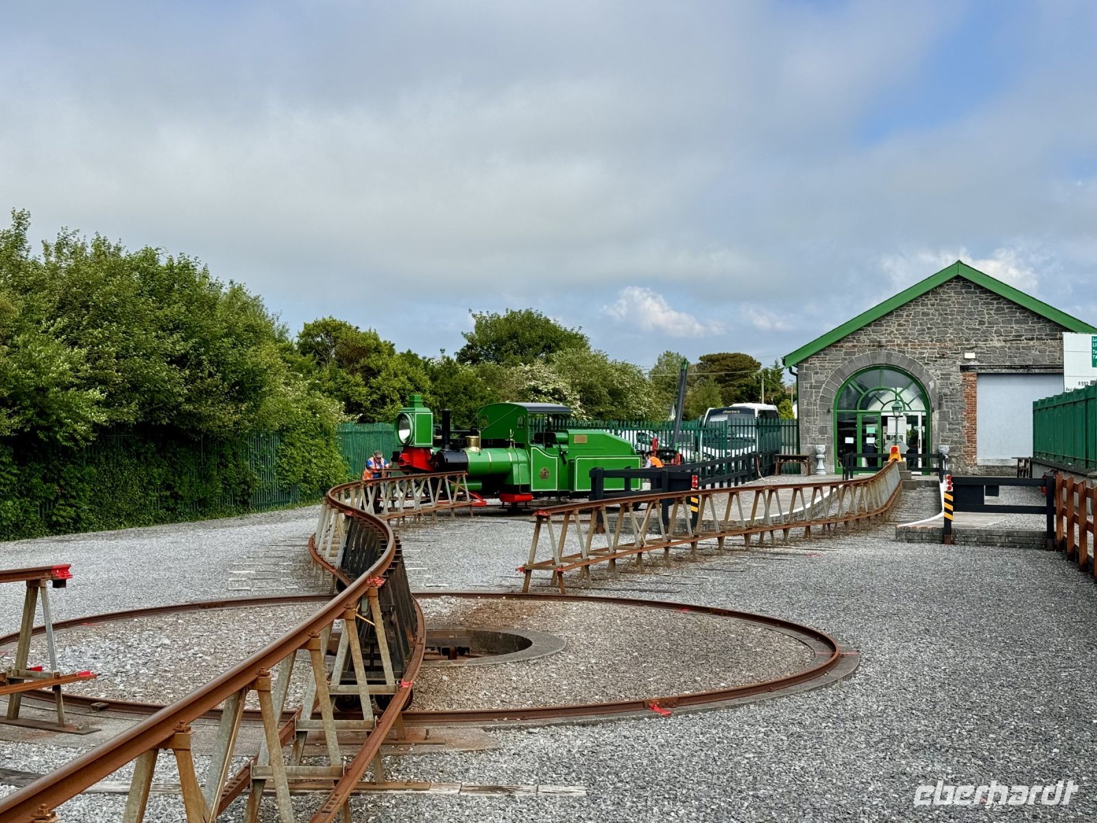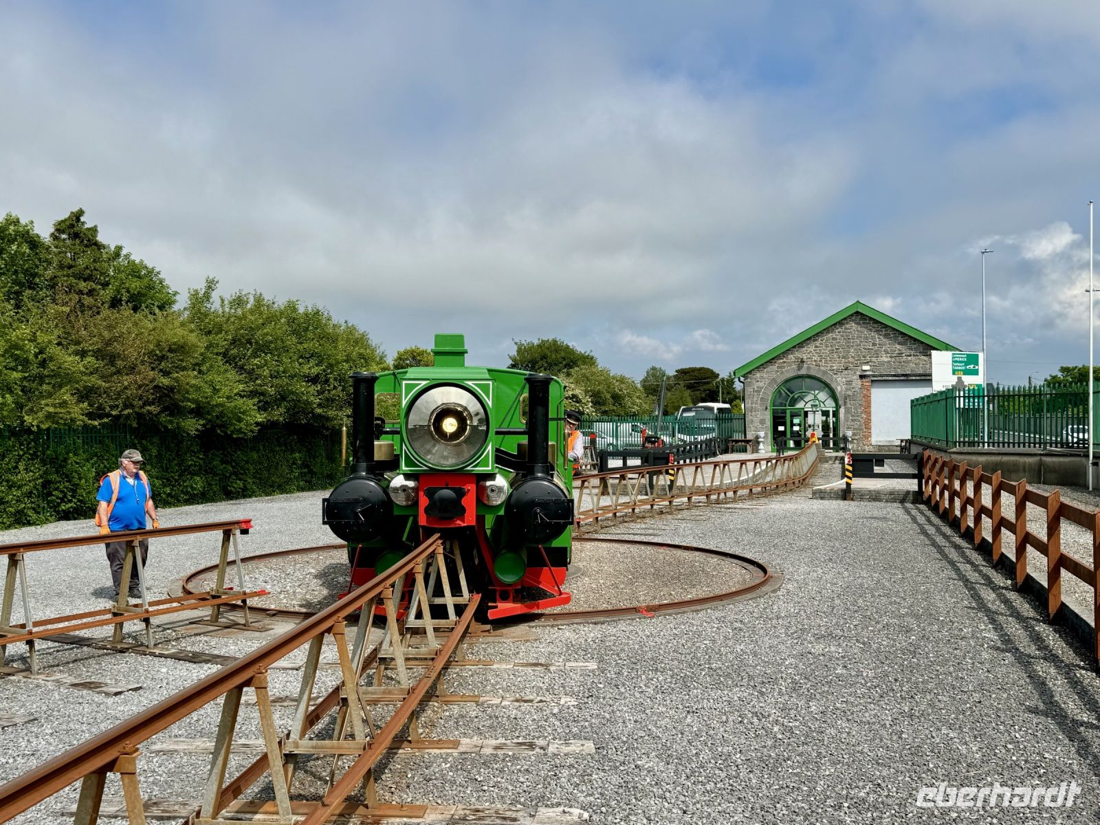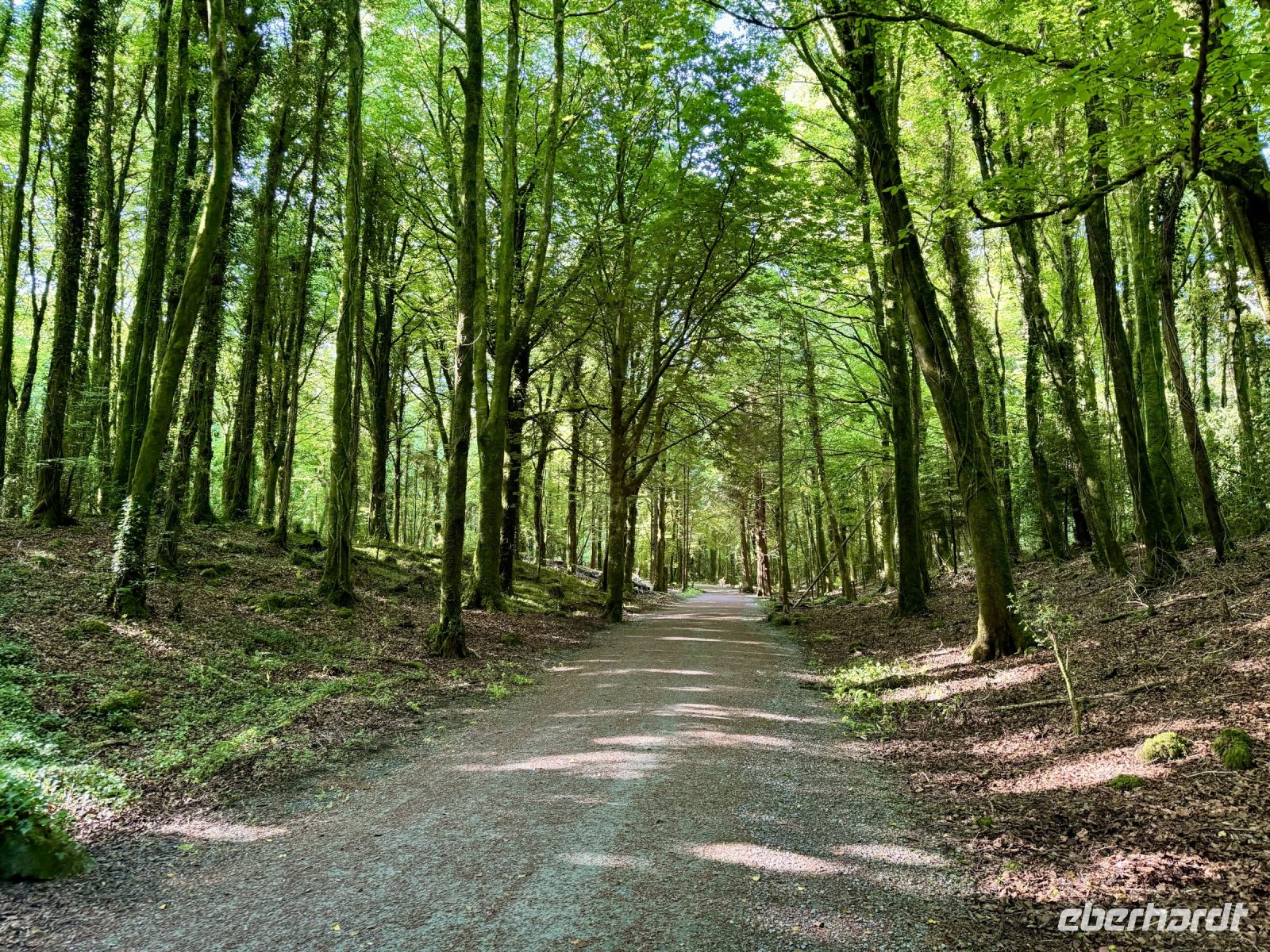 Vom Lady Gregory Hotel zu einem Spaziergang auf dem ehemaligen Landgut der Familie Gregory — so lautet der Plan für die heutige Vormittagsgestaltung. Meine Gäste freuen sich über die landschaftliche Abwechslung und schlagen vor, die kleine Wanderung doch unter dem Begriff „Waldbaden“ zu vermarkten. Das warme Sonnenlicht bahnt sich seinen Weg durchs Blätterdach, sorgt für herrliche Grüntöne. Wir wandeln nicht nur auf den Spuren von Lady Gregory, sondern auch von W. B. Yeats, George Bernhard Shaw und anderen berühmten Persönlichkeiten. In der Rinde des „Autograph Tree“, einer riesigen, sehr alten Blutbuche, haben sie sich verewigt. Zur Mittagszeit sind wir in Lahinch an der Uferpromenade, schauen auf den Strand und den Atlantik, auf die Schüler der Surfschule im Wasser und genießen unsere Sandwiches und Snacks oder auch ein leckeres Eis (sofern wir schnell genug sind, bevor die Schulklasse den Laden stürmt). Donal zeigt anschließend sein ganzes Können als Fahrer, indem er uns noch mit einem guten Zeitpuffer zur Fähre über den Shannon bringt. Es ist inzwischen so warm heute, dass Donal mit seinem Grundsatz bricht und sich nun doch ein Eis kauft — verdient hat er es sich allemal. Derweil lassen wir uns die Sonne ins Gesicht scheinen und halten Ausschau nach Delfinen, die sich aber heute nicht blicken lassen. (Wir wollen es mit dem Glück ja auch nicht übertreiben!) Mit der Lartigue Monorail in Listowel steht ein weiteres Verkehrsmittel auf dem Reiseplan, und ein ganz besonderes Kuriosum mit dazu. Erstaunen, Ungläubigkeit, Heiterkeit und Belustigung spiegeln sich in den Gesichtern meiner Gäste, während wir uns eine historische Videoaufzeichnung anschauen und selbst ein Stück mit einem Nachbau der seltsamen Eisenbahn fahren dürfen. Wir dürfen sogar für Fotos in die Lok und auch mal an der Pfeife ziehen! Bis nach Tralee sind es nun nur noch rund 30 Minuten Fahrt. Dabei passieren wir eine große Fabrik der Kerry-Gruppe — hier wird die gute Kerrygold-Butter produziert! Nach einem sehr guten Abendessen im ehrwürdigen Grand Hotel bringe ich meine Gäste zur Show „Celtic Steps“, die ihnen ganz bestimmt gefallen wird!