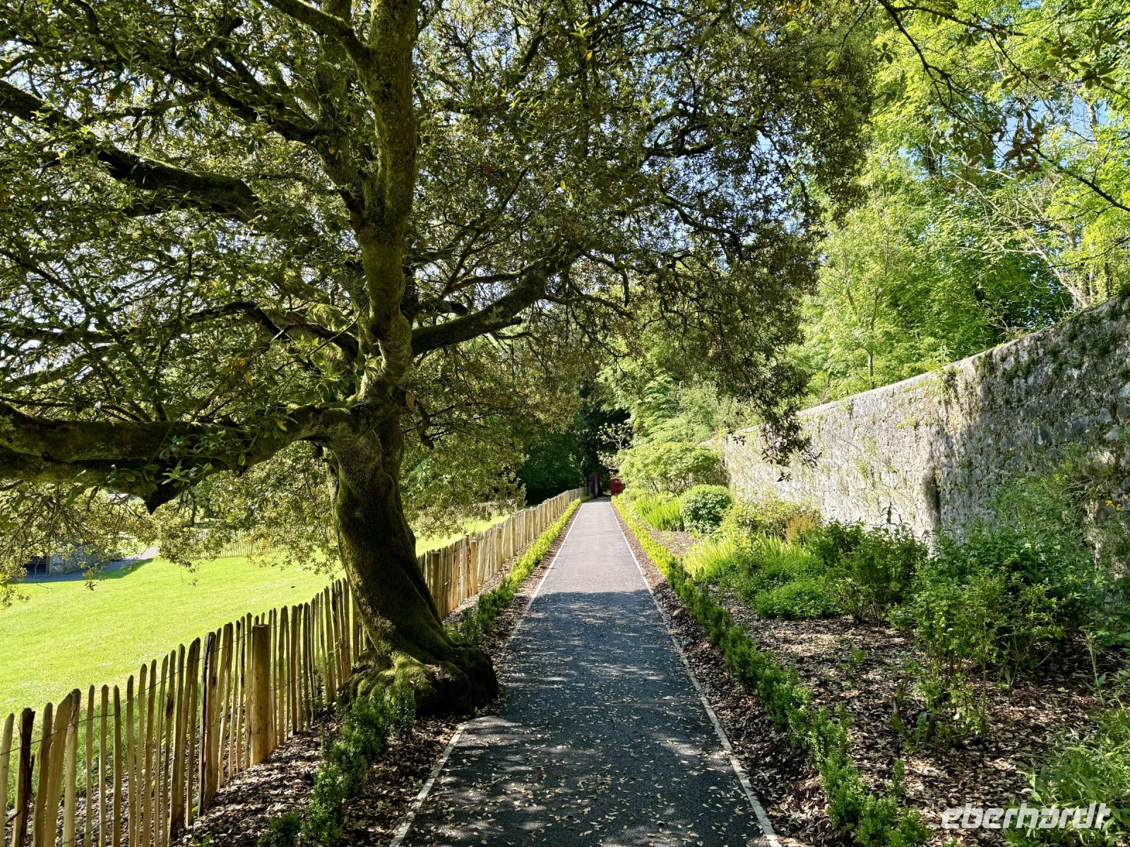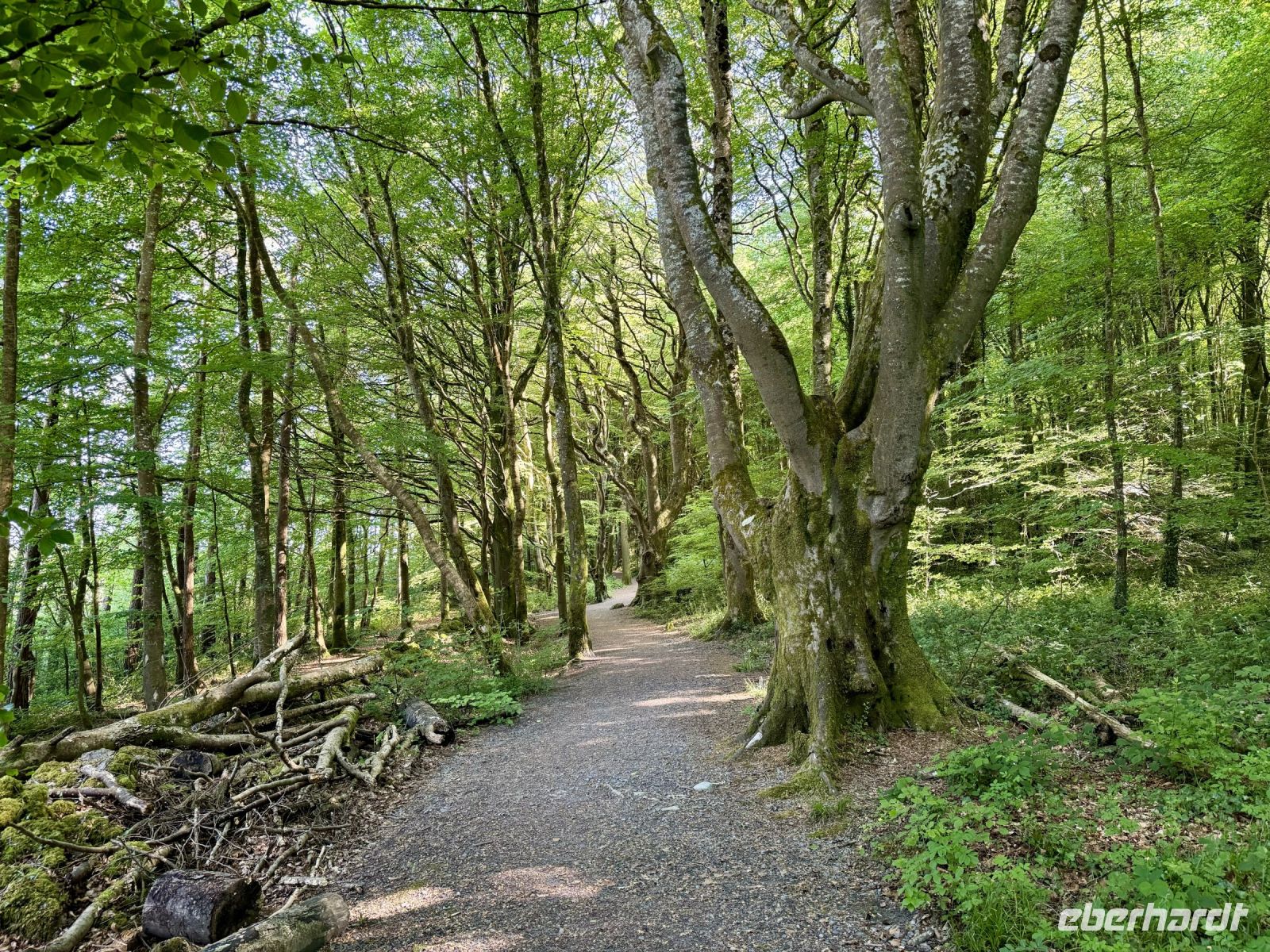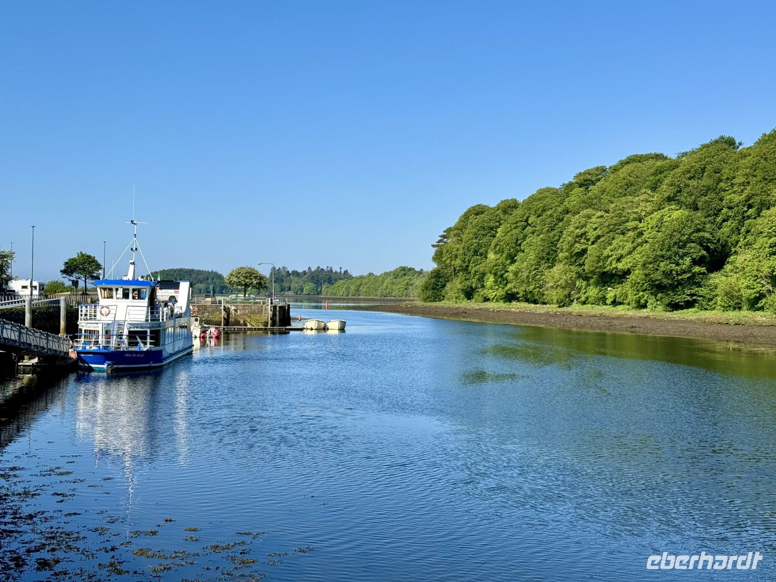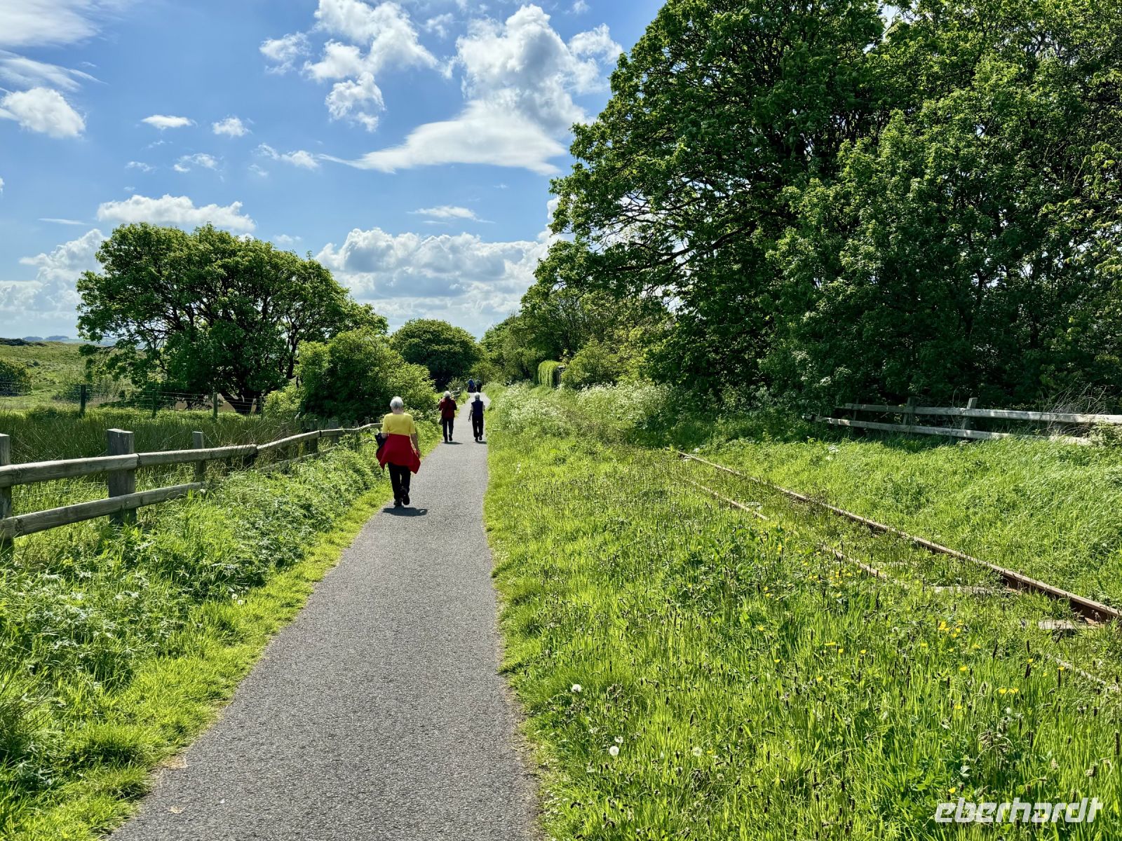 Vom Lady Gregory Hotel zu einem Spaziergang auf dem ehemaligen Landgut der Familie Gregory — so lautet der Plan für die heutige Vormittagsgestaltung. Meine Gäste freuen sich über die landschaftliche Abwechslung und schlagen vor, die kleine Wanderung doch unter dem Begriff „Waldbaden“ zu vermarkten. Das warme Sonnenlicht bahnt sich seinen Weg durchs Blätterdach, sorgt für herrliche Grüntöne. Wir wandeln nicht nur auf den Spuren von Lady Gregory, sondern auch von W. B. Yeats, George Bernhard Shaw und anderen berühmten Persönlichkeiten. In der Rinde des „Autograph Tree“, einer riesigen, sehr alten Blutbuche, haben sie sich verewigt. Zur Mittagszeit sind wir in Lahinch an der Uferpromenade, schauen auf den Strand und den Atlantik, auf die Schüler der Surfschule im Wasser und genießen unsere Sandwiches und Snacks oder auch ein leckeres Eis (sofern wir schnell genug sind, bevor die Schulklasse den Laden stürmt). Donal zeigt anschließend sein ganzes Können als Fahrer, indem er uns noch mit einem guten Zeitpuffer zur Fähre über den Shannon bringt. Es ist inzwischen so warm heute, dass Donal mit seinem Grundsatz bricht und sich nun doch ein Eis kauft — verdient hat er es sich allemal. Derweil lassen wir uns die Sonne ins Gesicht scheinen und halten Ausschau nach Delfinen, die sich aber heute nicht blicken lassen. (Wir wollen es mit dem Glück ja auch nicht übertreiben!) Mit der Lartigue Monorail in Listowel steht ein weiteres Verkehrsmittel auf dem Reiseplan, und ein ganz besonderes Kuriosum mit dazu. Erstaunen, Ungläubigkeit, Heiterkeit und Belustigung spiegeln sich in den Gesichtern meiner Gäste, während wir uns eine historische Videoaufzeichnung anschauen und selbst ein Stück mit einem Nachbau der seltsamen Eisenbahn fahren dürfen. Wir dürfen sogar für Fotos in die Lok und auch mal an der Pfeife ziehen! Bis nach Tralee sind es nun nur noch rund 30 Minuten Fahrt. Dabei passieren wir eine große Fabrik der Kerry-Gruppe — hier wird die gute Kerrygold-Butter produziert! Nach einem sehr guten Abendessen im ehrwürdigen Grand Hotel bringe ich meine Gäste zur Show „Celtic Steps“, die ihnen ganz bestimmt gefallen wird!