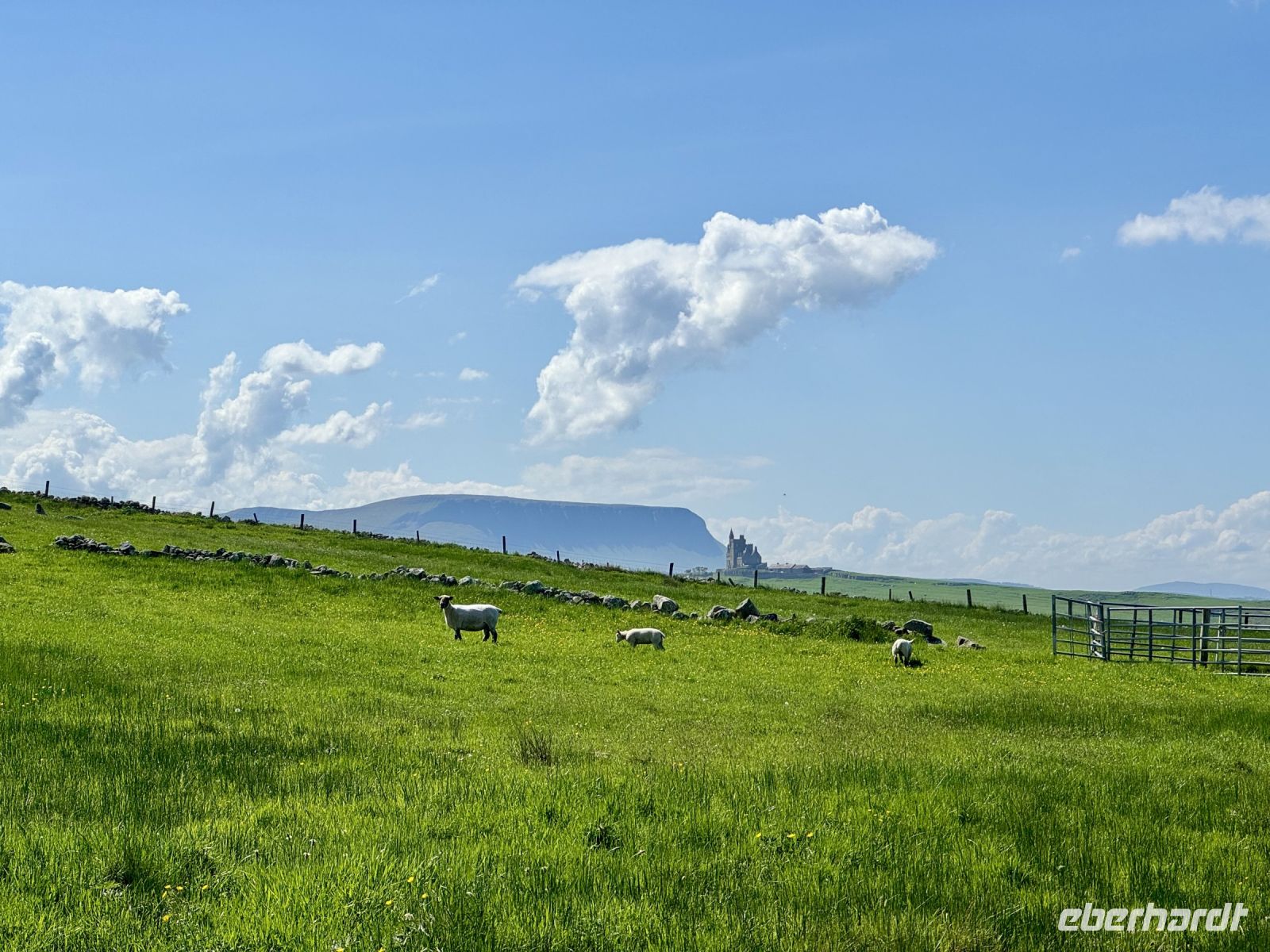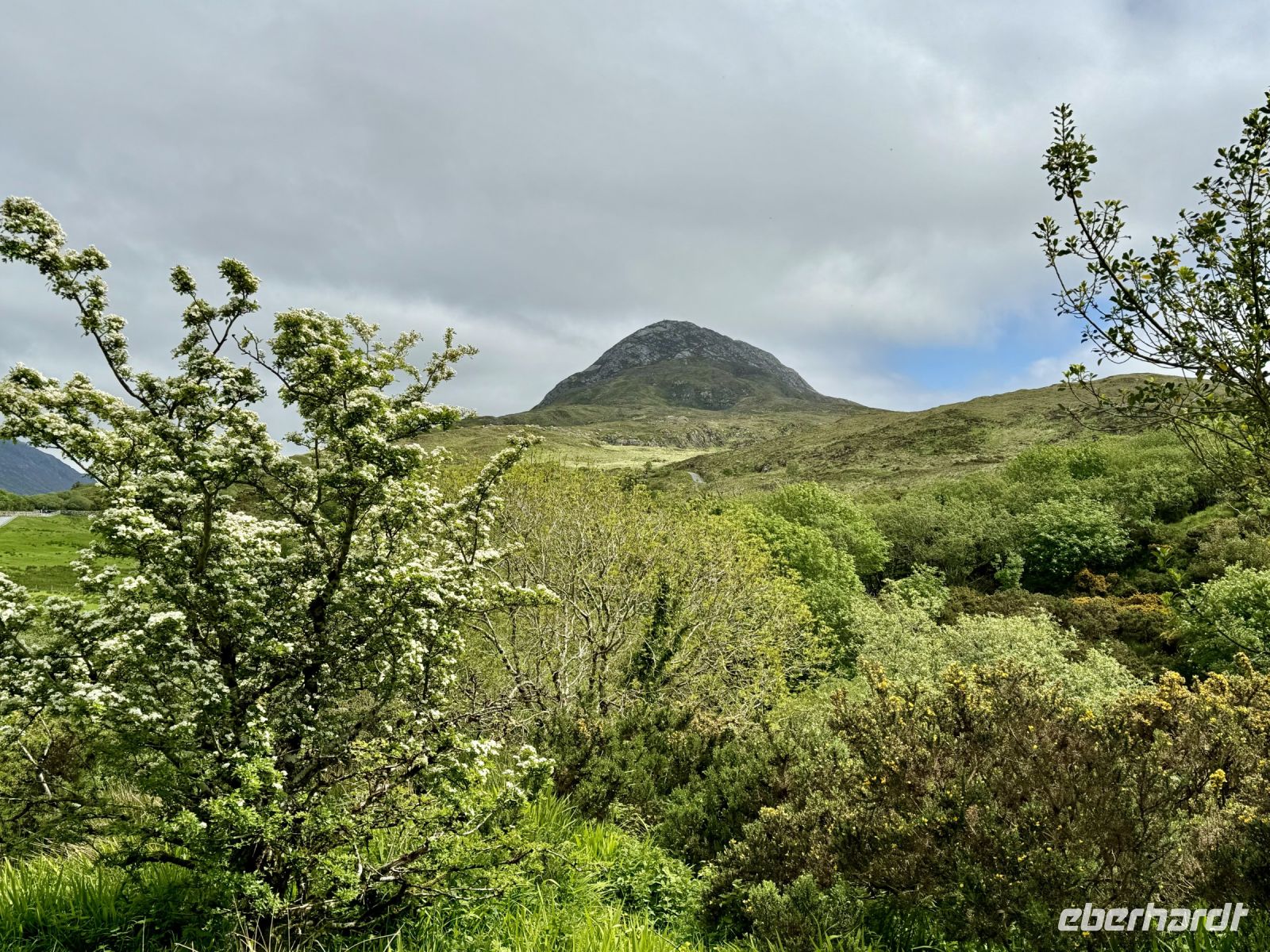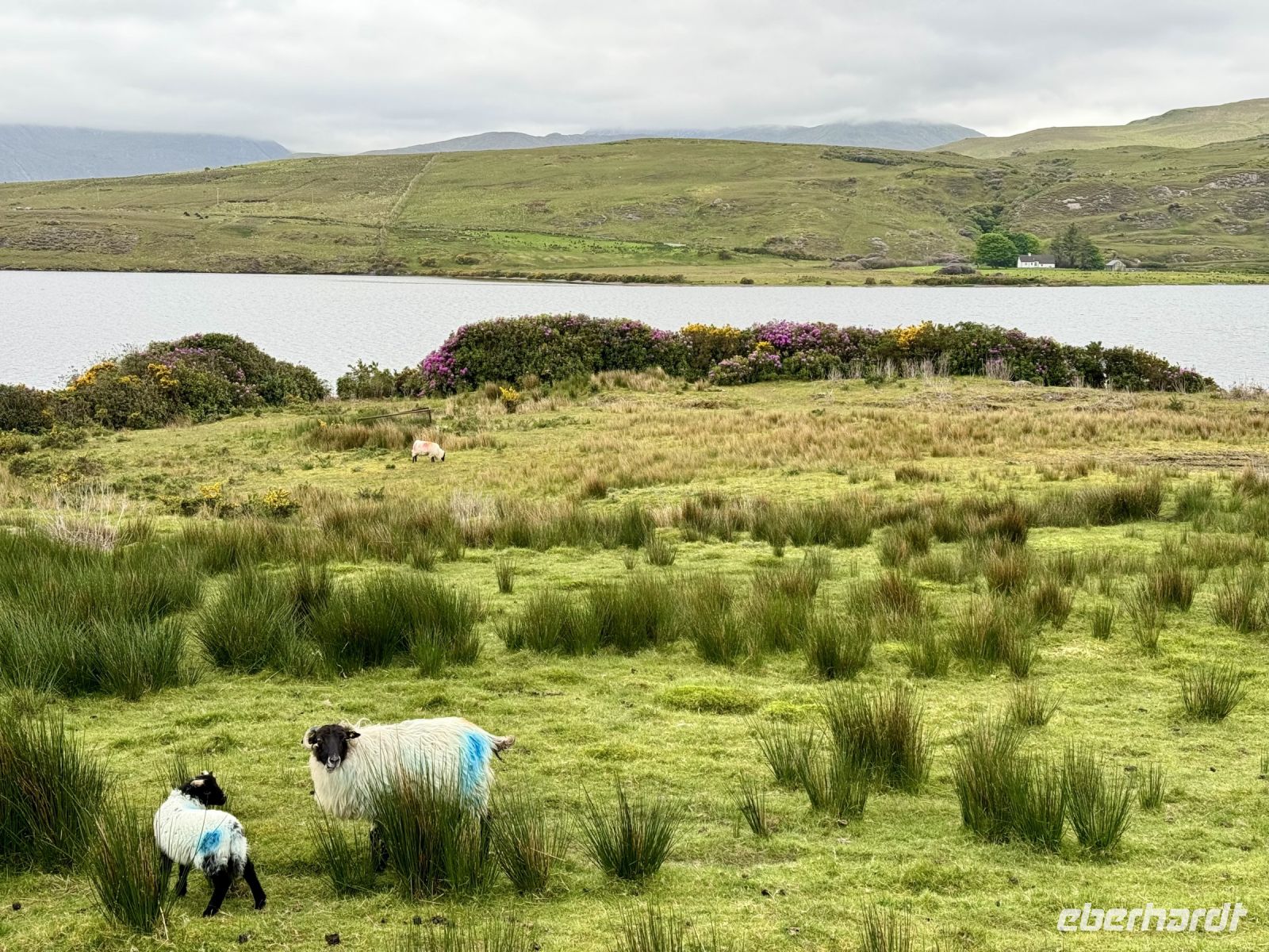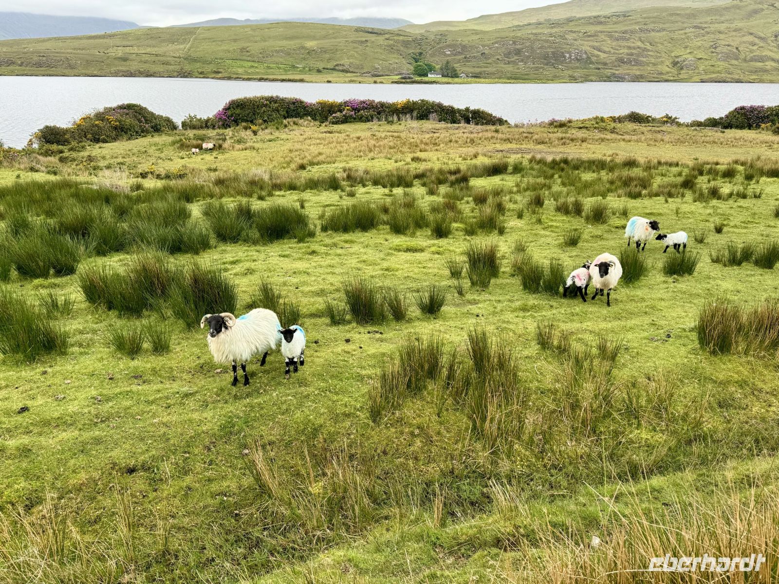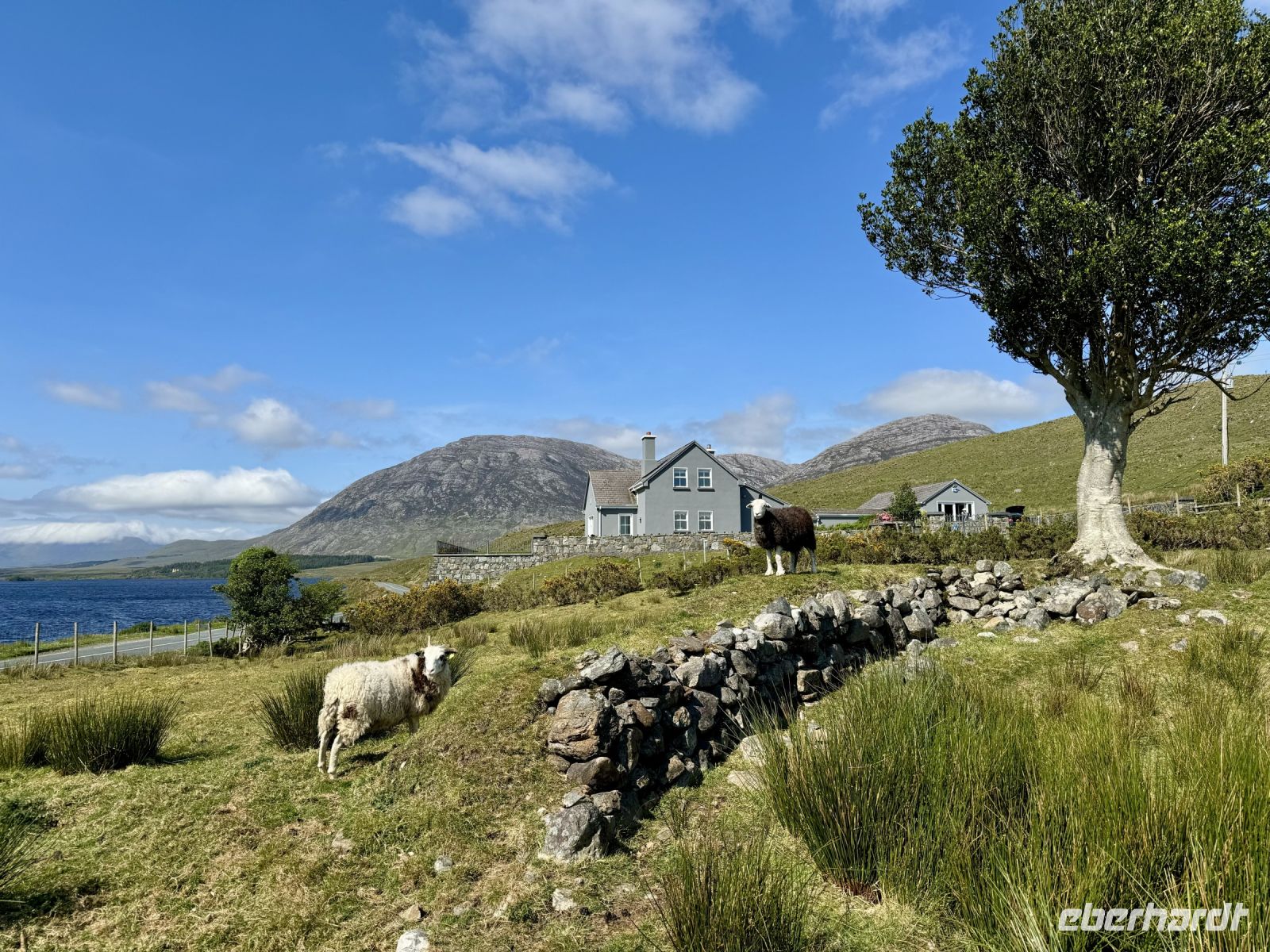 Nach einer Stunde Fahrt erreichen wir Donegal, die „Hauptstadt“ der gleichnamigen Grafschaft, und müssen feststellen, dass mein Lieblingscafé ausgerechnet jetzt eine Woche Betriebsferien hat. Wie soll ich den Tag nur ohne den besten Brownie der Welt überstehen? Dann muss wohl das fantastische Wetter den Tag für uns retten. Wir machen uns trotzdem eine schöne Zeit in Donegal, fotografieren das Castle und kaufen uns Verpflegung für die nachfolgende Wanderung um die Halbinsel Mullaghmore. Die dauert aufgrund des schönen Wetters länger als sonst, weil wir einfach an jeder Biegung stehen bleiben müssen, um die herrliche Landschaft zu fotografieren: die raue Küste, den blühenden Klee, das in allen Blautönen schimmernde Meer, die Klippen von Slieve League am Horizont, das Classiebawn Castle vor dem Ben Bulben als Hintergrund. Zurück am Hafen von Mullaghmore machen wir unsere Picknickpause und genießen noch einmal die Aussicht. Meine Postkarten, die ich als mögliche Beweismittel auf jeder Irlandreise mit mir führe, brauche ich heute nicht. So schön klar und deutlich habe ich den irischen Tafelberg und auch den Knocknarea bei Sligo mit dem Grab der Kriegerkönigin Maeve von Connacht noch nie gesehen. Auch der Croagh Patrick zeigt sich uns in seiner ganzen Pracht und Herrlichkeit, als wir uns am Nachmittag dem hübschen Städtchen Westport nähern. Auch wenn es uns „an arm and a leg“ kostet — wir gönnen uns heute einfach mal ein leckeres Eis, denn schließlich sind wir ja im Urlaub! Vom Aussichtspunkt am Heiligen Berg bewundern wir später in Murrisk die malerische Clew Bay mit ihren vielen kleinen Inseln und statten auch dem National Famine Monument einen kurzen Besuch ab. Zu unserem Hotel am Fjord in Leenane gelangen wir über einen Umweg durch das dramatische Doolough Valley samt zusätzlichem Fotostopp. Der Killary Harbour und die umliegenden Berge sind meine Lieblingsregion in Irland, und die vielen schwarzköpfigen Schafe am Straßenrand stimmen mir da stoisch kauend unwidersprochen zu. Es mag auch am vorzüglichen Essen liegen, das uns im Leenane Hotel erwartet.