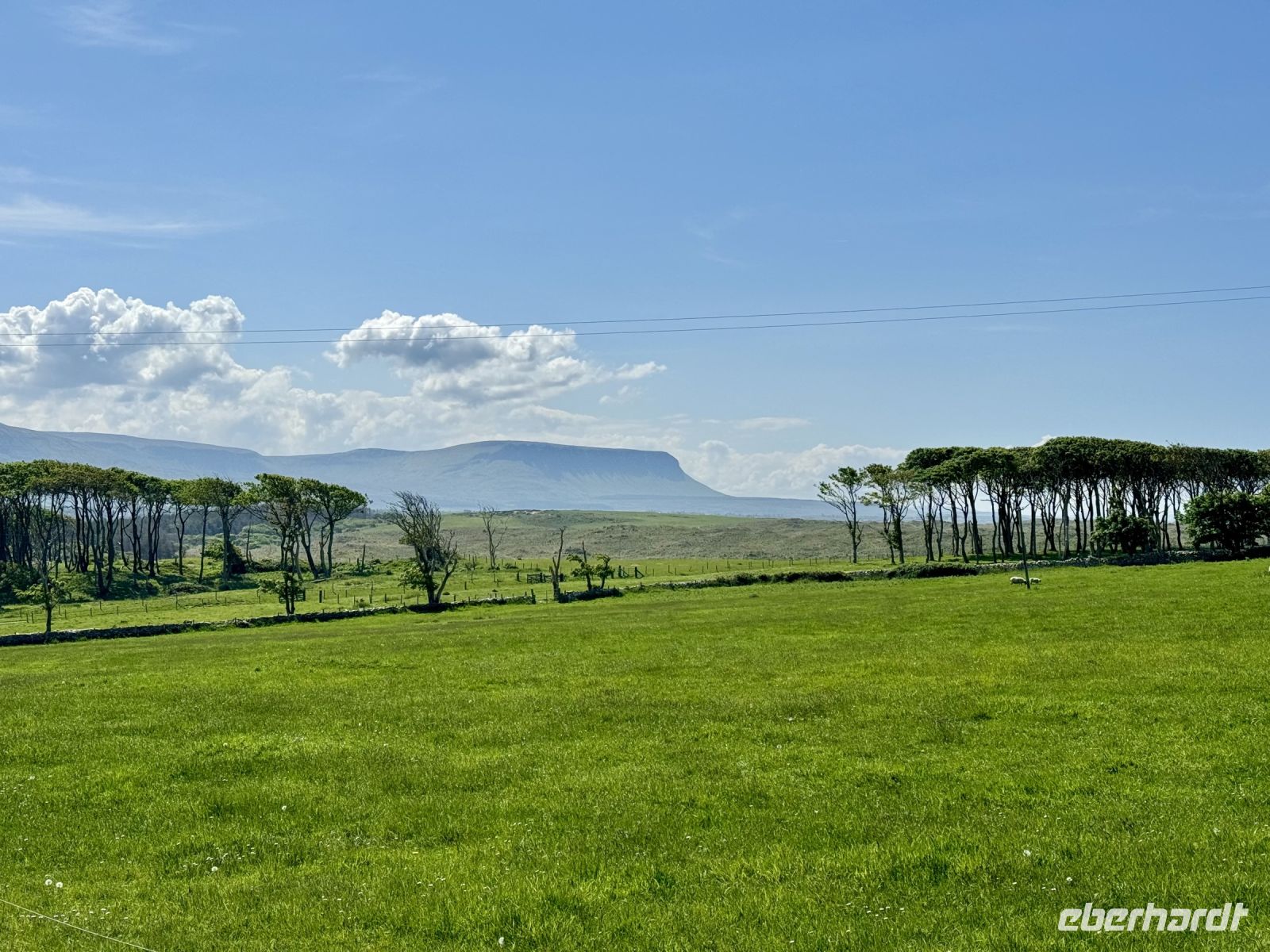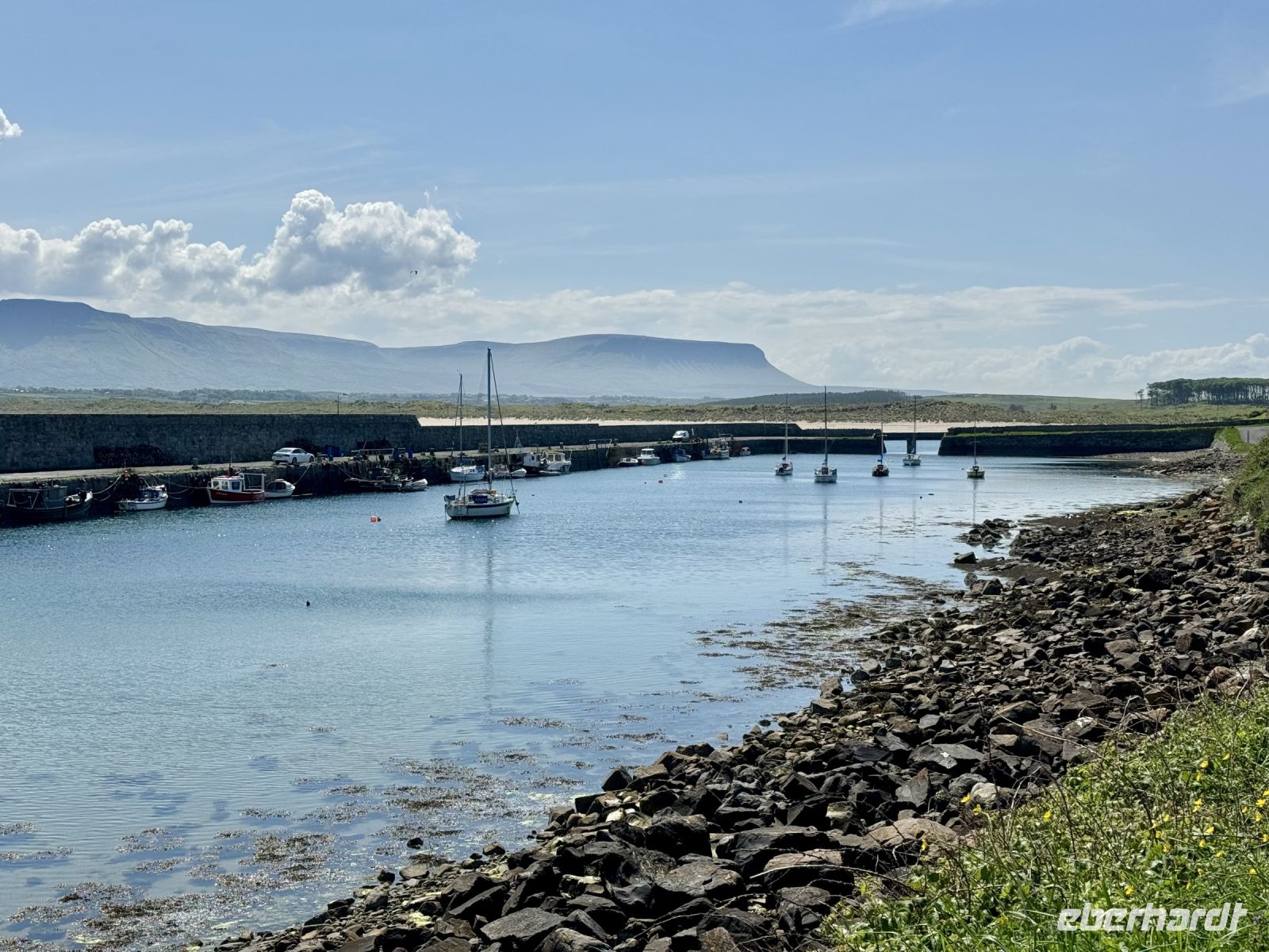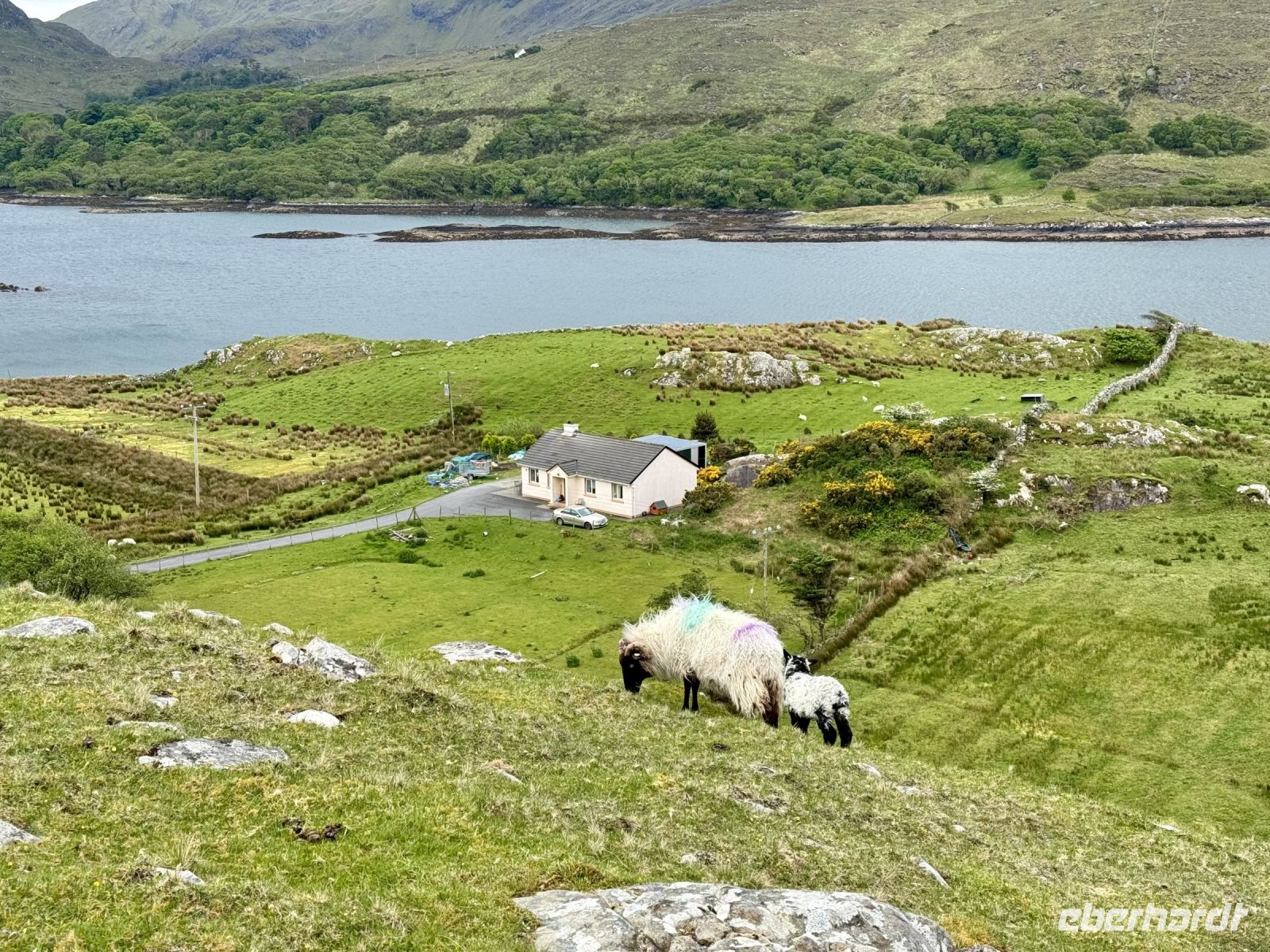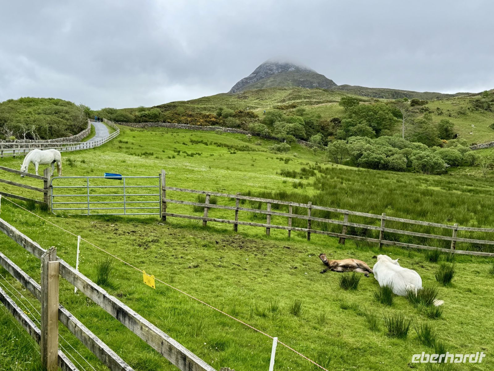 Nach einer Stunde Fahrt erreichen wir Donegal, die „Hauptstadt“ der gleichnamigen Grafschaft, und müssen feststellen, dass mein Lieblingscafé ausgerechnet jetzt eine Woche Betriebsferien hat. Wie soll ich den Tag nur ohne den besten Brownie der Welt überstehen? Dann muss wohl das fantastische Wetter den Tag für uns retten. Wir machen uns trotzdem eine schöne Zeit in Donegal, fotografieren das Castle und kaufen uns Verpflegung für die nachfolgende Wanderung um die Halbinsel Mullaghmore. Die dauert aufgrund des schönen Wetters länger als sonst, weil wir einfach an jeder Biegung stehen bleiben müssen, um die herrliche Landschaft zu fotografieren: die raue Küste, den blühenden Klee, das in allen Blautönen schimmernde Meer, die Klippen von Slieve League am Horizont, das Classiebawn Castle vor dem Ben Bulben als Hintergrund. Zurück am Hafen von Mullaghmore machen wir unsere Picknickpause und genießen noch einmal die Aussicht. Meine Postkarten, die ich als mögliche Beweismittel auf jeder Irlandreise mit mir führe, brauche ich heute nicht. So schön klar und deutlich habe ich den irischen Tafelberg und auch den Knocknarea bei Sligo mit dem Grab der Kriegerkönigin Maeve von Connacht noch nie gesehen. Auch der Croagh Patrick zeigt sich uns in seiner ganzen Pracht und Herrlichkeit, als wir uns am Nachmittag dem hübschen Städtchen Westport nähern. Auch wenn es uns „an arm and a leg“ kostet — wir gönnen uns heute einfach mal ein leckeres Eis, denn schließlich sind wir ja im Urlaub! Vom Aussichtspunkt am Heiligen Berg bewundern wir später in Murrisk die malerische Clew Bay mit ihren vielen kleinen Inseln und statten auch dem National Famine Monument einen kurzen Besuch ab. Zu unserem Hotel am Fjord in Leenane gelangen wir über einen Umweg durch das dramatische Doolough Valley samt zusätzlichem Fotostopp. Der Killary Harbour und die umliegenden Berge sind meine Lieblingsregion in Irland, und die vielen schwarzköpfigen Schafe am Straßenrand stimmen mir da stoisch kauend unwidersprochen zu. Es mag auch am vorzüglichen Essen liegen, das uns im Leenane Hotel erwartet.