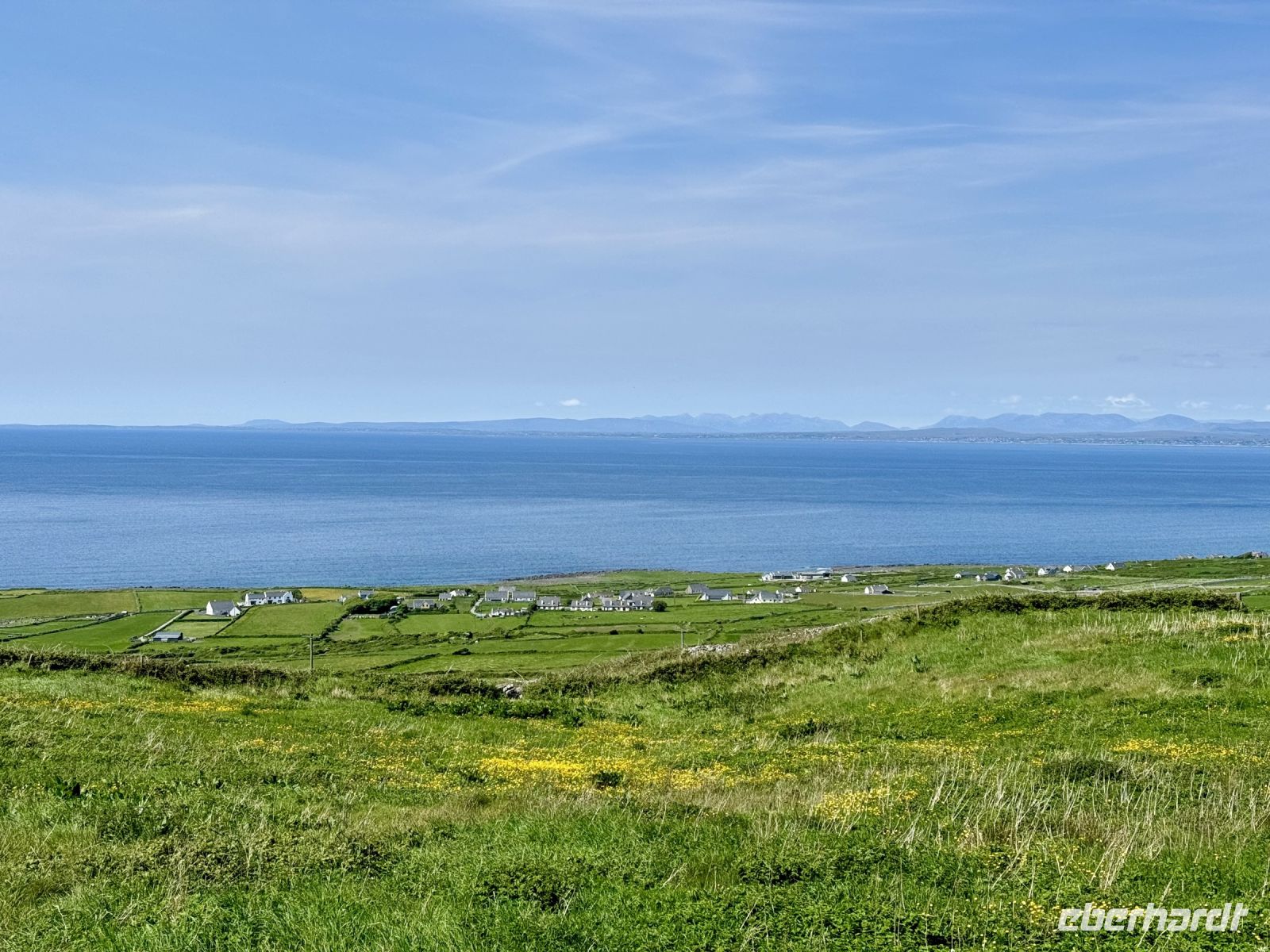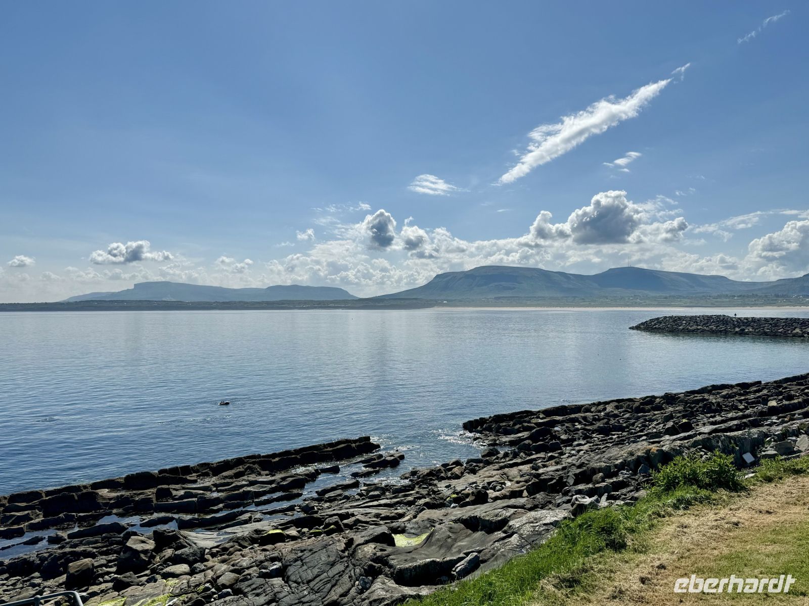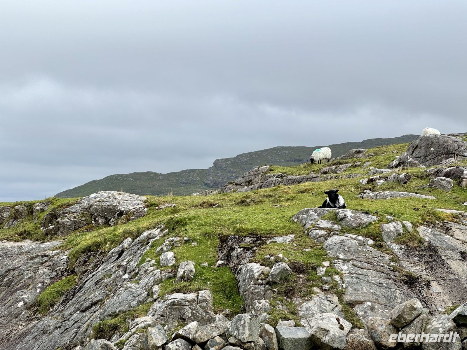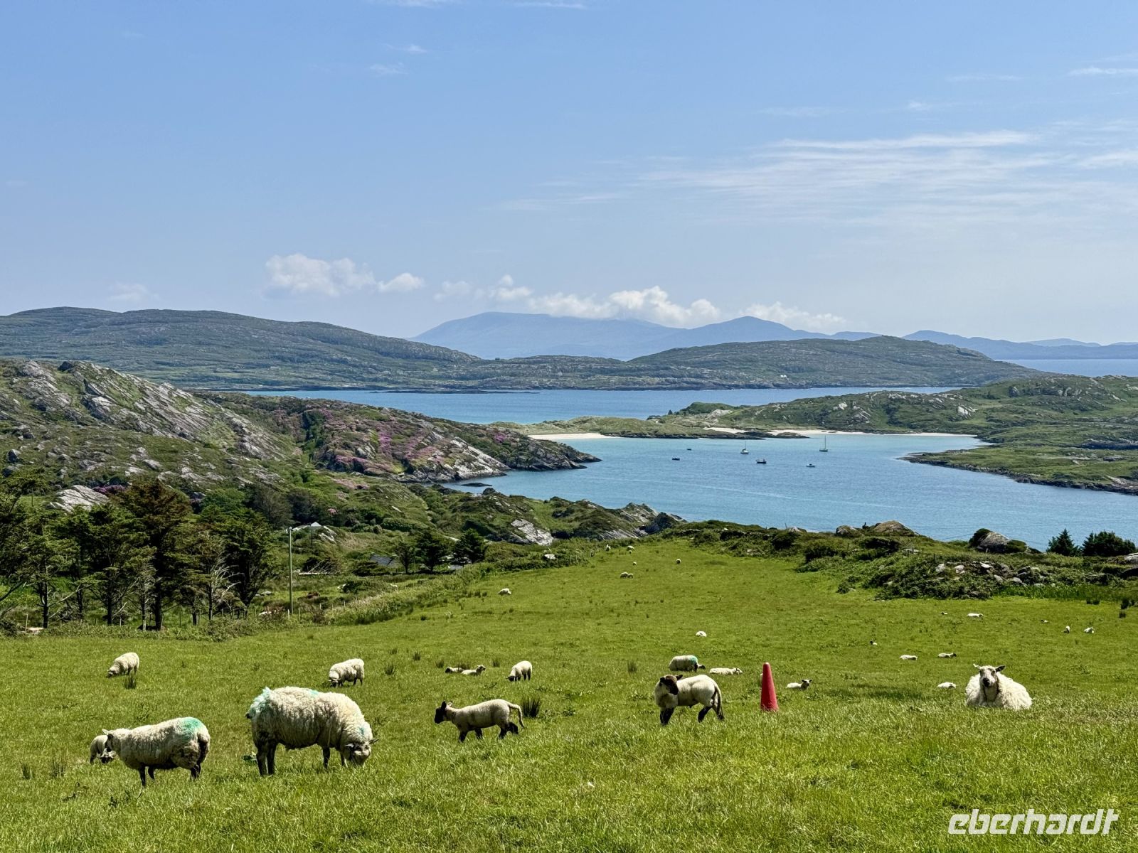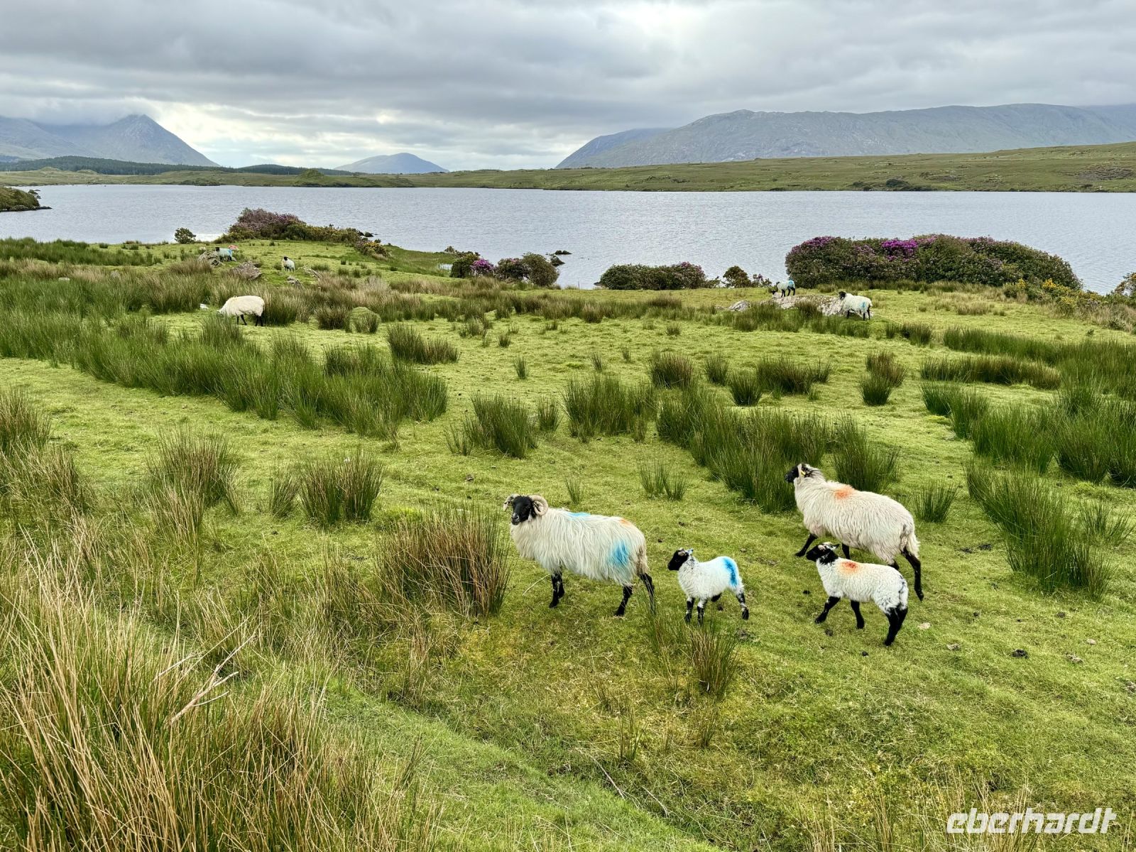 Nach einer Stunde Fahrt erreichen wir Donegal, die „Hauptstadt“ der gleichnamigen Grafschaft, und müssen feststellen, dass mein Lieblingscafé ausgerechnet jetzt eine Woche Betriebsferien hat. Wie soll ich den Tag nur ohne den besten Brownie der Welt überstehen? Dann muss wohl das fantastische Wetter den Tag für uns retten. Wir machen uns trotzdem eine schöne Zeit in Donegal, fotografieren das Castle und kaufen uns Verpflegung für die nachfolgende Wanderung um die Halbinsel Mullaghmore. Die dauert aufgrund des schönen Wetters länger als sonst, weil wir einfach an jeder Biegung stehen bleiben müssen, um die herrliche Landschaft zu fotografieren: die raue Küste, den blühenden Klee, das in allen Blautönen schimmernde Meer, die Klippen von Slieve League am Horizont, das Classiebawn Castle vor dem Ben Bulben als Hintergrund. Zurück am Hafen von Mullaghmore machen wir unsere Picknickpause und genießen noch einmal die Aussicht. Meine Postkarten, die ich als mögliche Beweismittel auf jeder Irlandreise mit mir führe, brauche ich heute nicht. So schön klar und deutlich habe ich den irischen Tafelberg und auch den Knocknarea bei Sligo mit dem Grab der Kriegerkönigin Maeve von Connacht noch nie gesehen. Auch der Croagh Patrick zeigt sich uns in seiner ganzen Pracht und Herrlichkeit, als wir uns am Nachmittag dem hübschen Städtchen Westport nähern. Auch wenn es uns „an arm and a leg“ kostet — wir gönnen uns heute einfach mal ein leckeres Eis, denn schließlich sind wir ja im Urlaub! Vom Aussichtspunkt am Heiligen Berg bewundern wir später in Murrisk die malerische Clew Bay mit ihren vielen kleinen Inseln und statten auch dem National Famine Monument einen kurzen Besuch ab. Zu unserem Hotel am Fjord in Leenane gelangen wir über einen Umweg durch das dramatische Doolough Valley samt zusätzlichem Fotostopp. Der Killary Harbour und die umliegenden Berge sind meine Lieblingsregion in Irland, und die vielen schwarzköpfigen Schafe am Straßenrand stimmen mir da stoisch kauend unwidersprochen zu. Es mag auch am vorzüglichen Essen liegen, das uns im Leenane Hotel erwartet.