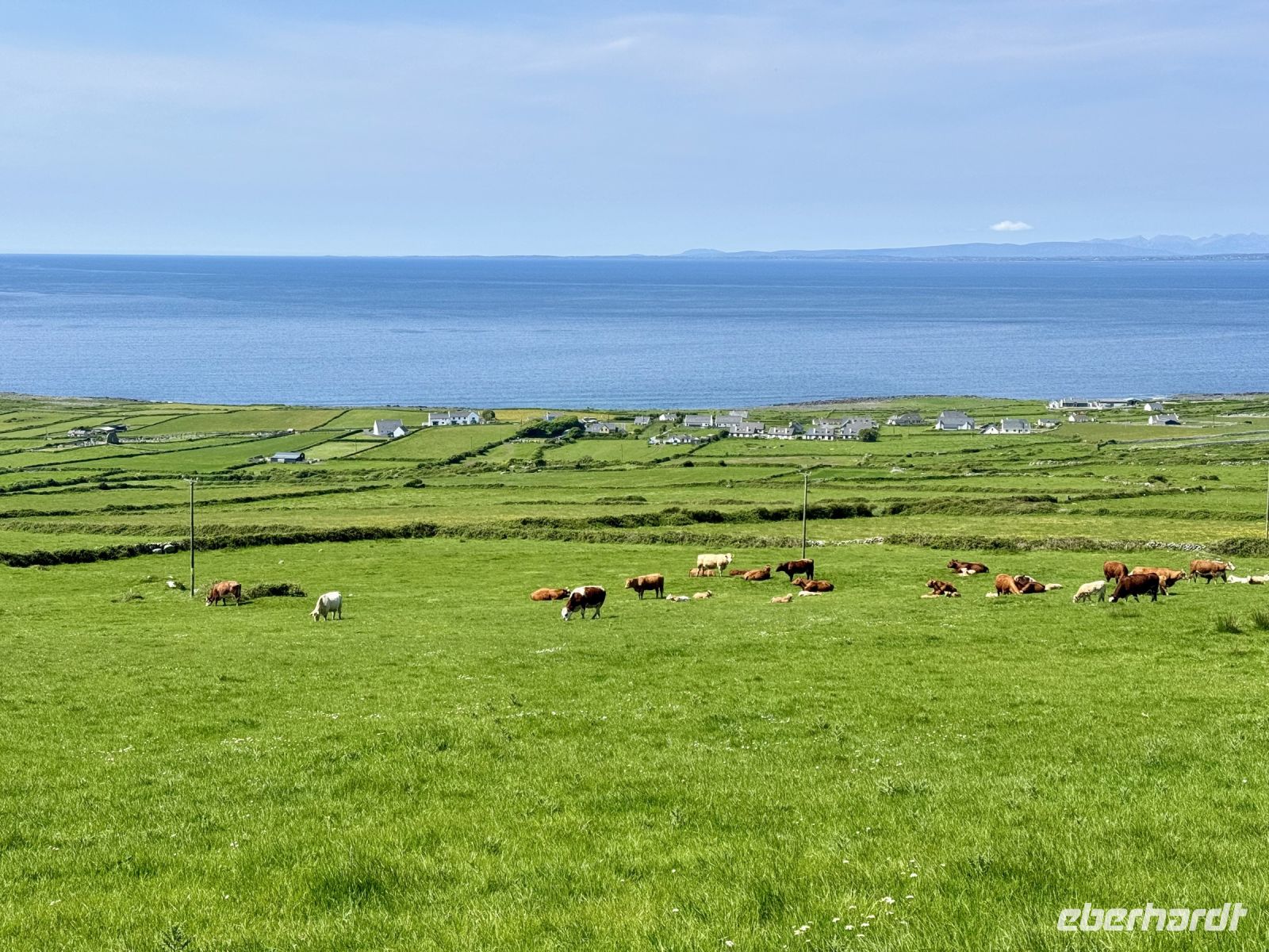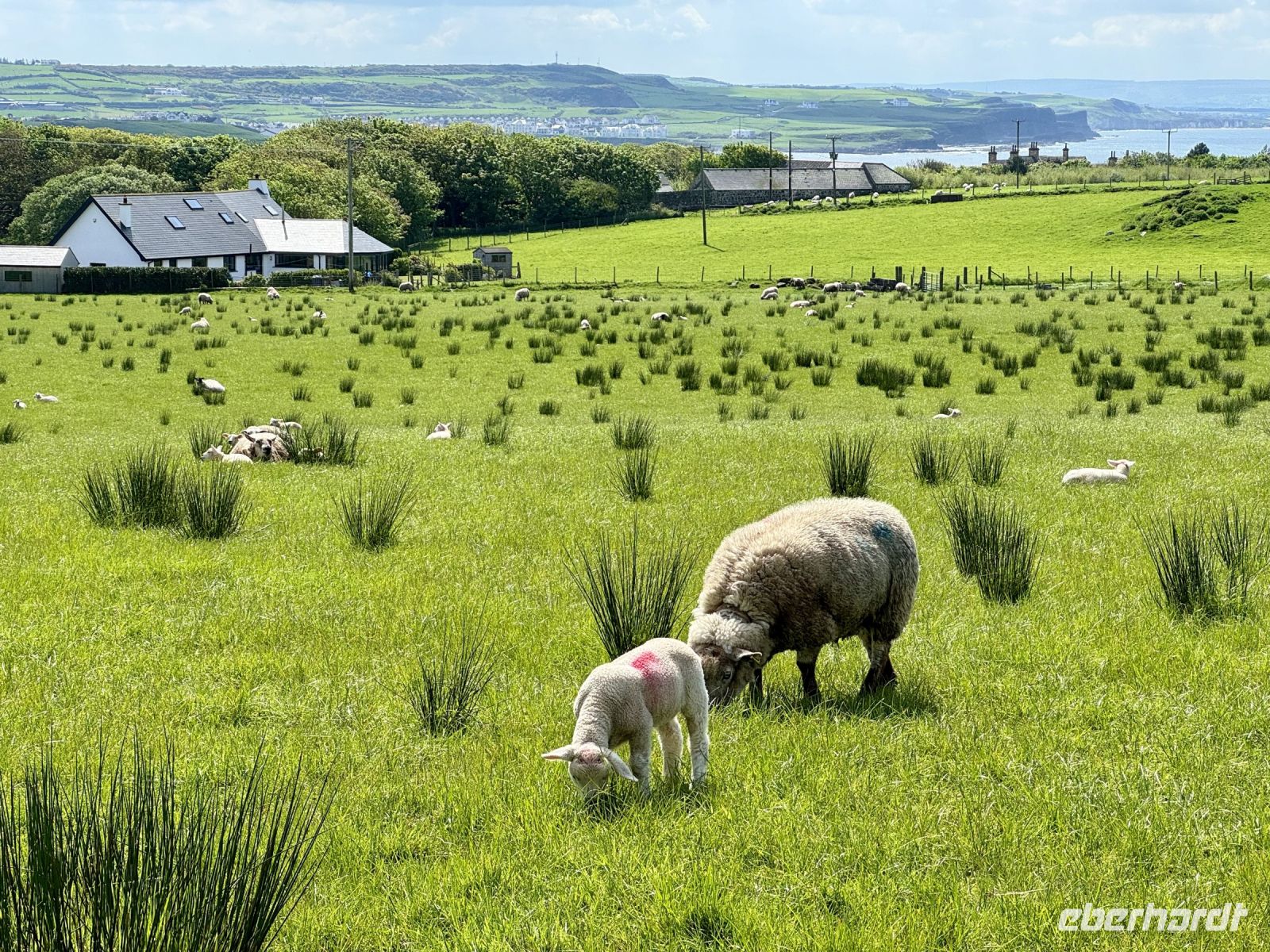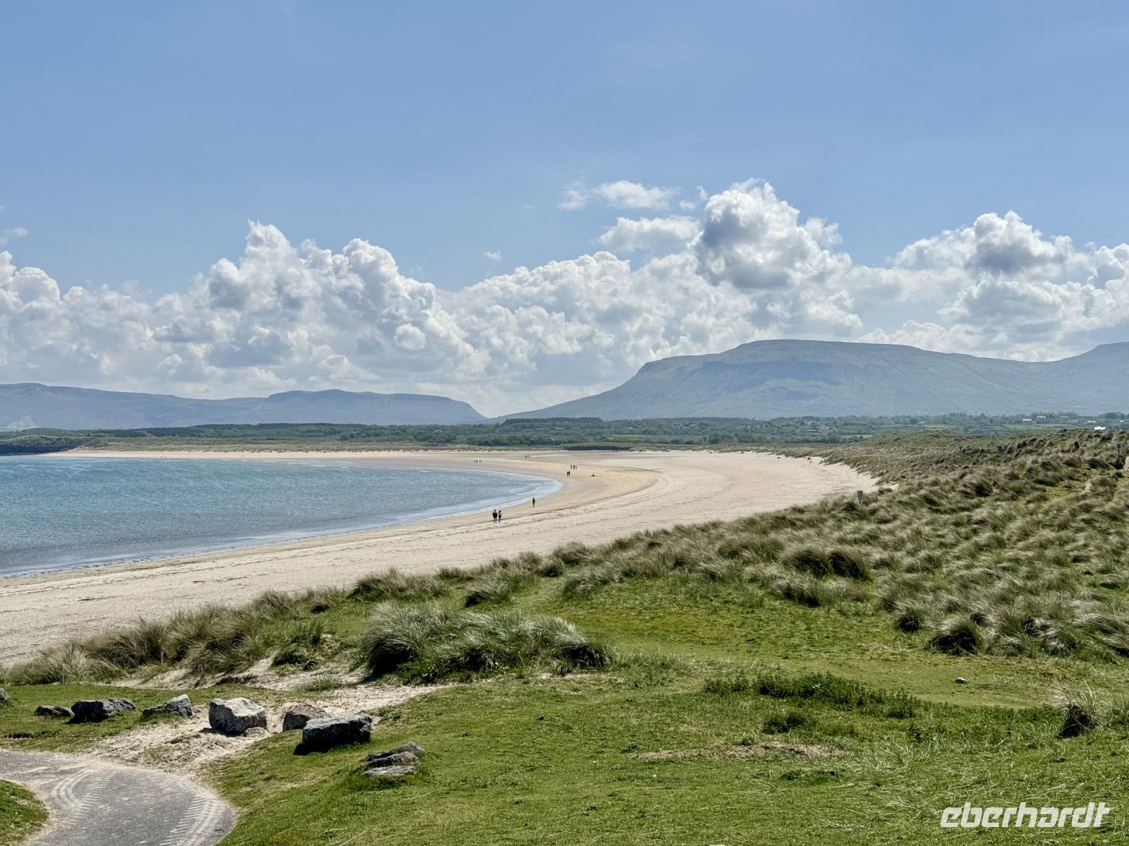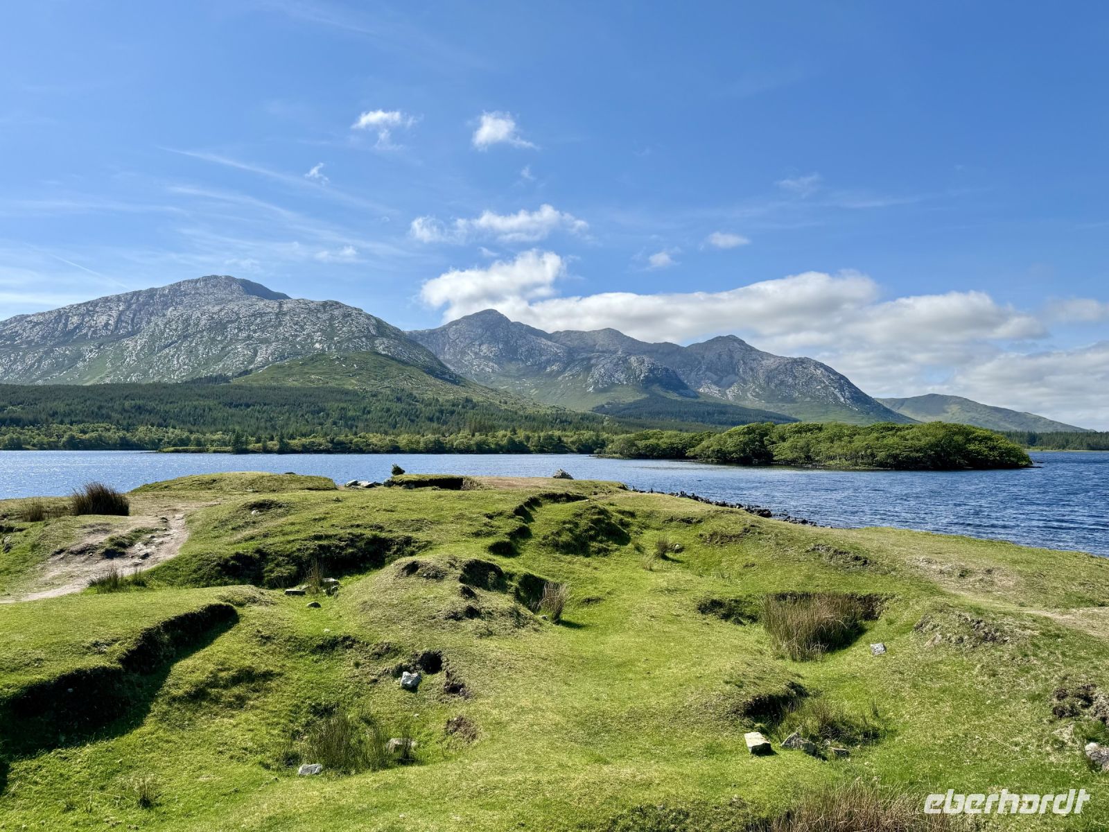 Nach einer Stunde Fahrt erreichen wir Donegal, die „Hauptstadt“ der gleichnamigen Grafschaft, und müssen feststellen, dass mein Lieblingscafé ausgerechnet jetzt eine Woche Betriebsferien hat. Wie soll ich den Tag nur ohne den besten Brownie der Welt überstehen? Dann muss wohl das fantastische Wetter den Tag für uns retten. Wir machen uns trotzdem eine schöne Zeit in Donegal, fotografieren das Castle und kaufen uns Verpflegung für die nachfolgende Wanderung um die Halbinsel Mullaghmore. Die dauert aufgrund des schönen Wetters länger als sonst, weil wir einfach an jeder Biegung stehen bleiben müssen, um die herrliche Landschaft zu fotografieren: die raue Küste, den blühenden Klee, das in allen Blautönen schimmernde Meer, die Klippen von Slieve League am Horizont, das Classiebawn Castle vor dem Ben Bulben als Hintergrund. Zurück am Hafen von Mullaghmore machen wir unsere Picknickpause und genießen noch einmal die Aussicht. Meine Postkarten, die ich als mögliche Beweismittel auf jeder Irlandreise mit mir führe, brauche ich heute nicht. So schön klar und deutlich habe ich den irischen Tafelberg und auch den Knocknarea bei Sligo mit dem Grab der Kriegerkönigin Maeve von Connacht noch nie gesehen. Auch der Croagh Patrick zeigt sich uns in seiner ganzen Pracht und Herrlichkeit, als wir uns am Nachmittag dem hübschen Städtchen Westport nähern. Auch wenn es uns „an arm and a leg“ kostet — wir gönnen uns heute einfach mal ein leckeres Eis, denn schließlich sind wir ja im Urlaub! Vom Aussichtspunkt am Heiligen Berg bewundern wir später in Murrisk die malerische Clew Bay mit ihren vielen kleinen Inseln und statten auch dem National Famine Monument einen kurzen Besuch ab. Zu unserem Hotel am Fjord in Leenane gelangen wir über einen Umweg durch das dramatische Doolough Valley samt zusätzlichem Fotostopp. Der Killary Harbour und die umliegenden Berge sind meine Lieblingsregion in Irland, und die vielen schwarzköpfigen Schafe am Straßenrand stimmen mir da stoisch kauend unwidersprochen zu. Es mag auch am vorzüglichen Essen liegen, das uns im Leenane Hotel erwartet.