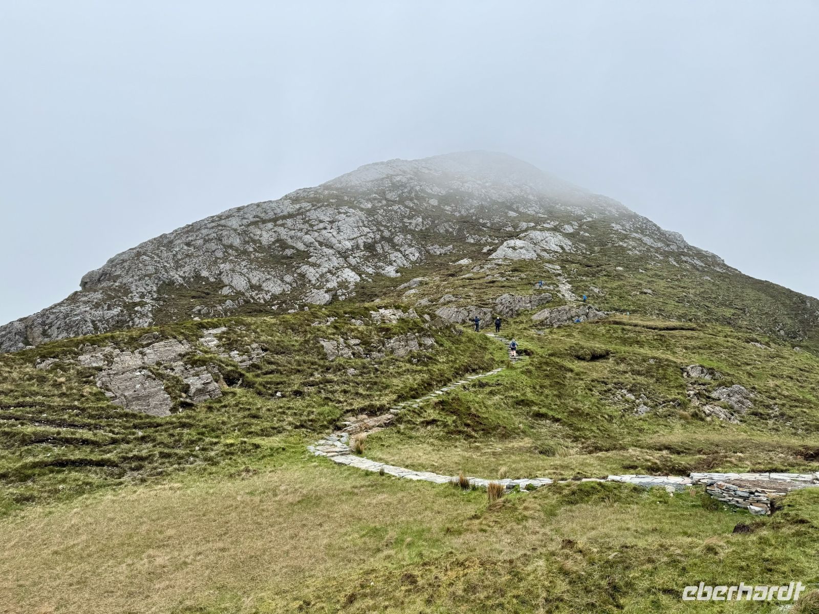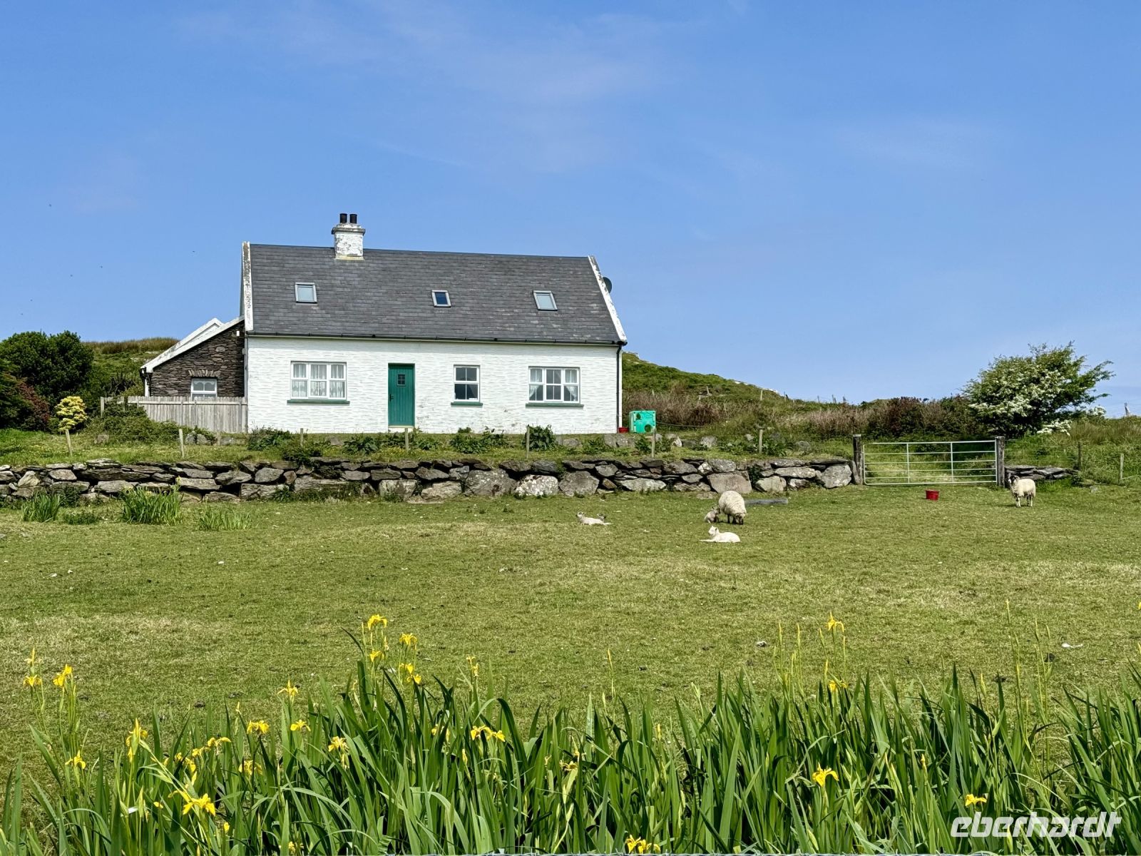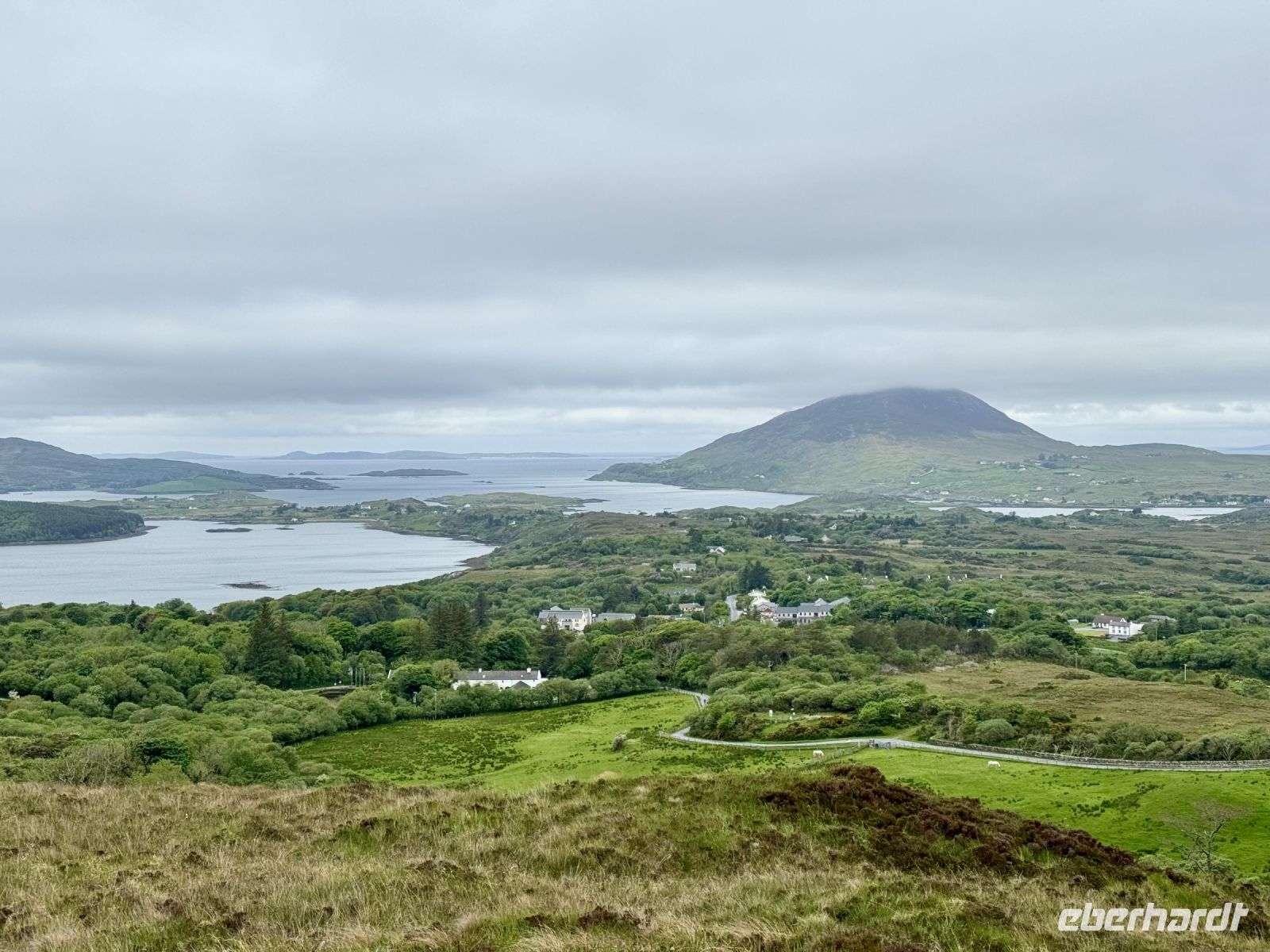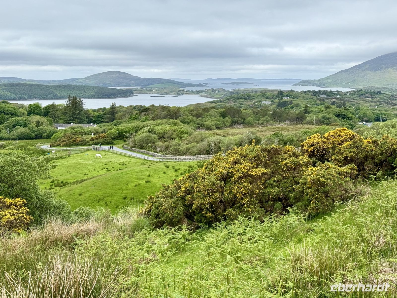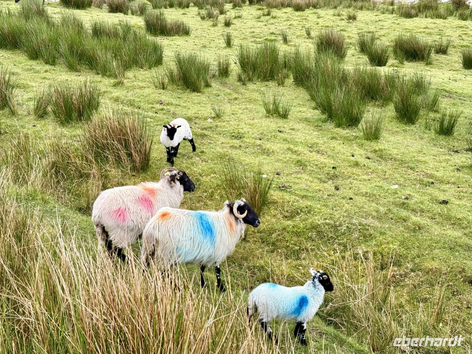 Nach einer Stunde Fahrt erreichen wir Donegal, die „Hauptstadt“ der gleichnamigen Grafschaft, und müssen feststellen, dass mein Lieblingscafé ausgerechnet jetzt eine Woche Betriebsferien hat. Wie soll ich den Tag nur ohne den besten Brownie der Welt überstehen? Dann muss wohl das fantastische Wetter den Tag für uns retten. Wir machen uns trotzdem eine schöne Zeit in Donegal, fotografieren das Castle und kaufen uns Verpflegung für die nachfolgende Wanderung um die Halbinsel Mullaghmore. Die dauert aufgrund des schönen Wetters länger als sonst, weil wir einfach an jeder Biegung stehen bleiben müssen, um die herrliche Landschaft zu fotografieren: die raue Küste, den blühenden Klee, das in allen Blautönen schimmernde Meer, die Klippen von Slieve League am Horizont, das Classiebawn Castle vor dem Ben Bulben als Hintergrund. Zurück am Hafen von Mullaghmore machen wir unsere Picknickpause und genießen noch einmal die Aussicht. Meine Postkarten, die ich als mögliche Beweismittel auf jeder Irlandreise mit mir führe, brauche ich heute nicht. So schön klar und deutlich habe ich den irischen Tafelberg und auch den Knocknarea bei Sligo mit dem Grab der Kriegerkönigin Maeve von Connacht noch nie gesehen. Auch der Croagh Patrick zeigt sich uns in seiner ganzen Pracht und Herrlichkeit, als wir uns am Nachmittag dem hübschen Städtchen Westport nähern. Auch wenn es uns „an arm and a leg“ kostet — wir gönnen uns heute einfach mal ein leckeres Eis, denn schließlich sind wir ja im Urlaub! Vom Aussichtspunkt am Heiligen Berg bewundern wir später in Murrisk die malerische Clew Bay mit ihren vielen kleinen Inseln und statten auch dem National Famine Monument einen kurzen Besuch ab. Zu unserem Hotel am Fjord in Leenane gelangen wir über einen Umweg durch das dramatische Doolough Valley samt zusätzlichem Fotostopp. Der Killary Harbour und die umliegenden Berge sind meine Lieblingsregion in Irland, und die vielen schwarzköpfigen Schafe am Straßenrand stimmen mir da stoisch kauend unwidersprochen zu. Es mag auch am vorzüglichen Essen liegen, das uns im Leenane Hotel erwartet.