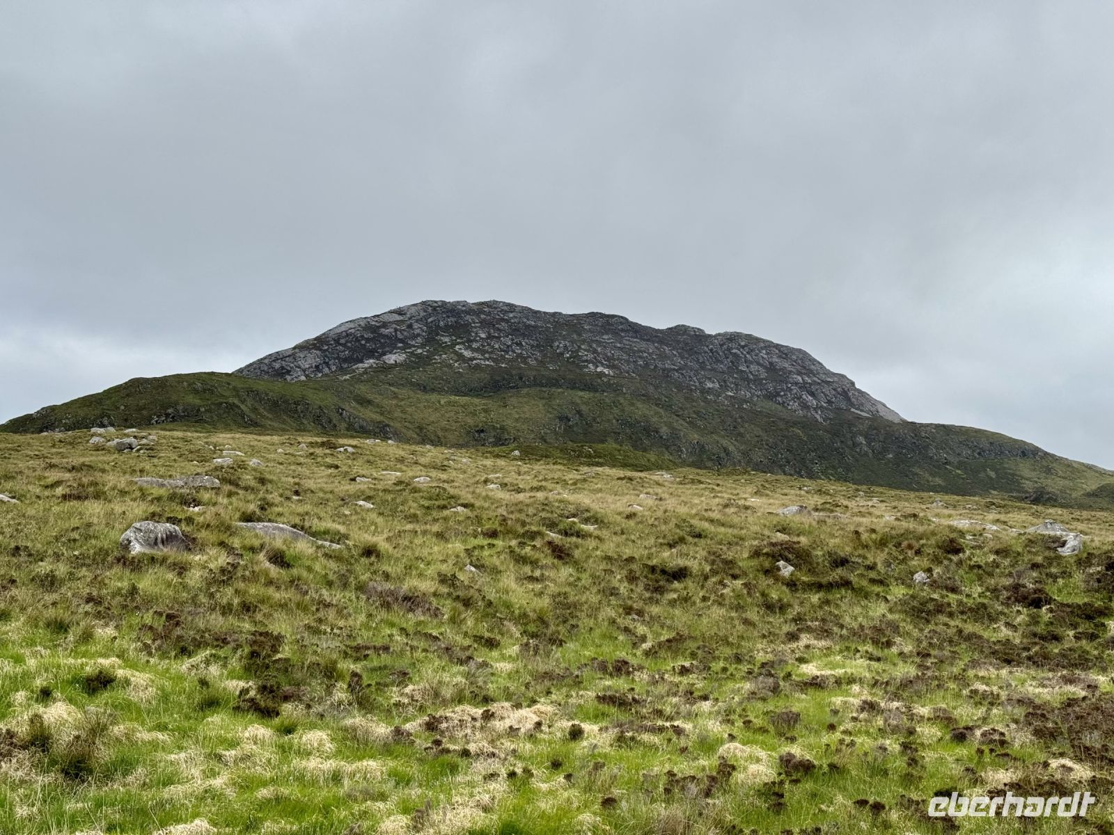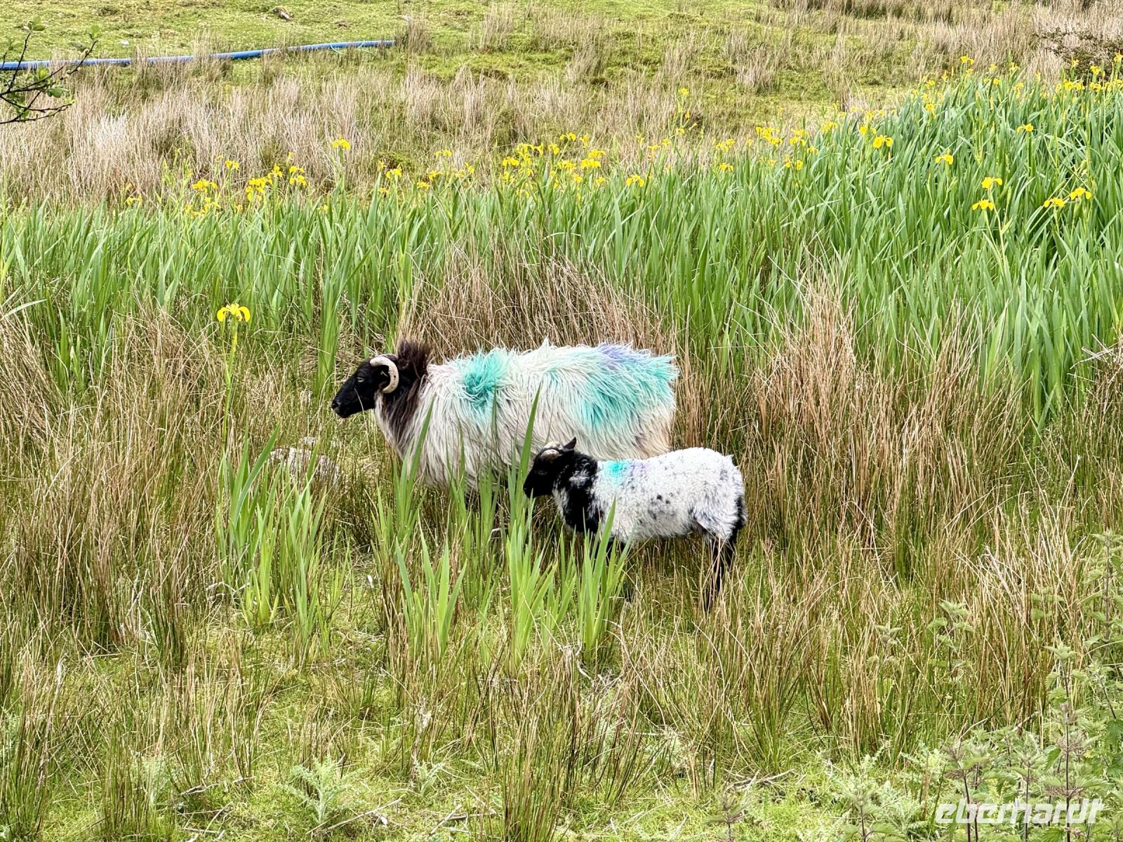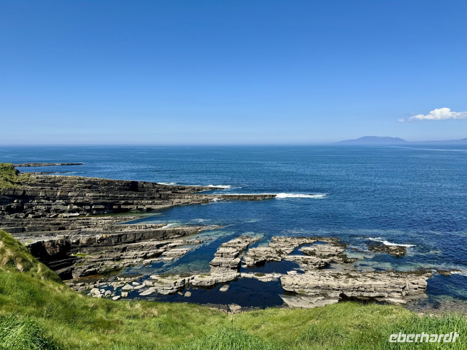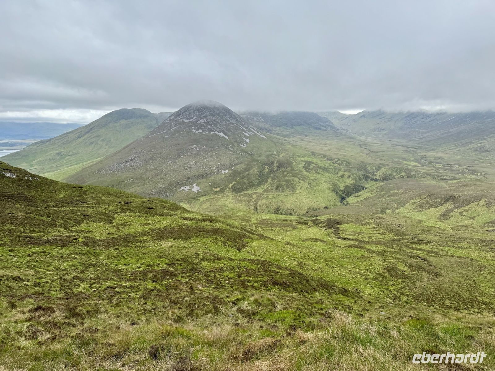 Nach einer Stunde Fahrt erreichen wir Donegal, die „Hauptstadt“ der gleichnamigen Grafschaft, und müssen feststellen, dass mein Lieblingscafé ausgerechnet jetzt eine Woche Betriebsferien hat. Wie soll ich den Tag nur ohne den besten Brownie der Welt überstehen? Dann muss wohl das fantastische Wetter den Tag für uns retten. Wir machen uns trotzdem eine schöne Zeit in Donegal, fotografieren das Castle und kaufen uns Verpflegung für die nachfolgende Wanderung um die Halbinsel Mullaghmore. Die dauert aufgrund des schönen Wetters länger als sonst, weil wir einfach an jeder Biegung stehen bleiben müssen, um die herrliche Landschaft zu fotografieren: die raue Küste, den blühenden Klee, das in allen Blautönen schimmernde Meer, die Klippen von Slieve League am Horizont, das Classiebawn Castle vor dem Ben Bulben als Hintergrund. Zurück am Hafen von Mullaghmore machen wir unsere Picknickpause und genießen noch einmal die Aussicht. Meine Postkarten, die ich als mögliche Beweismittel auf jeder Irlandreise mit mir führe, brauche ich heute nicht. So schön klar und deutlich habe ich den irischen Tafelberg und auch den Knocknarea bei Sligo mit dem Grab der Kriegerkönigin Maeve von Connacht noch nie gesehen. Auch der Croagh Patrick zeigt sich uns in seiner ganzen Pracht und Herrlichkeit, als wir uns am Nachmittag dem hübschen Städtchen Westport nähern. Auch wenn es uns „an arm and a leg“ kostet — wir gönnen uns heute einfach mal ein leckeres Eis, denn schließlich sind wir ja im Urlaub! Vom Aussichtspunkt am Heiligen Berg bewundern wir später in Murrisk die malerische Clew Bay mit ihren vielen kleinen Inseln und statten auch dem National Famine Monument einen kurzen Besuch ab. Zu unserem Hotel am Fjord in Leenane gelangen wir über einen Umweg durch das dramatische Doolough Valley samt zusätzlichem Fotostopp. Der Killary Harbour und die umliegenden Berge sind meine Lieblingsregion in Irland, und die vielen schwarzköpfigen Schafe am Straßenrand stimmen mir da stoisch kauend unwidersprochen zu. Es mag auch am vorzüglichen Essen liegen, das uns im Leenane Hotel erwartet.