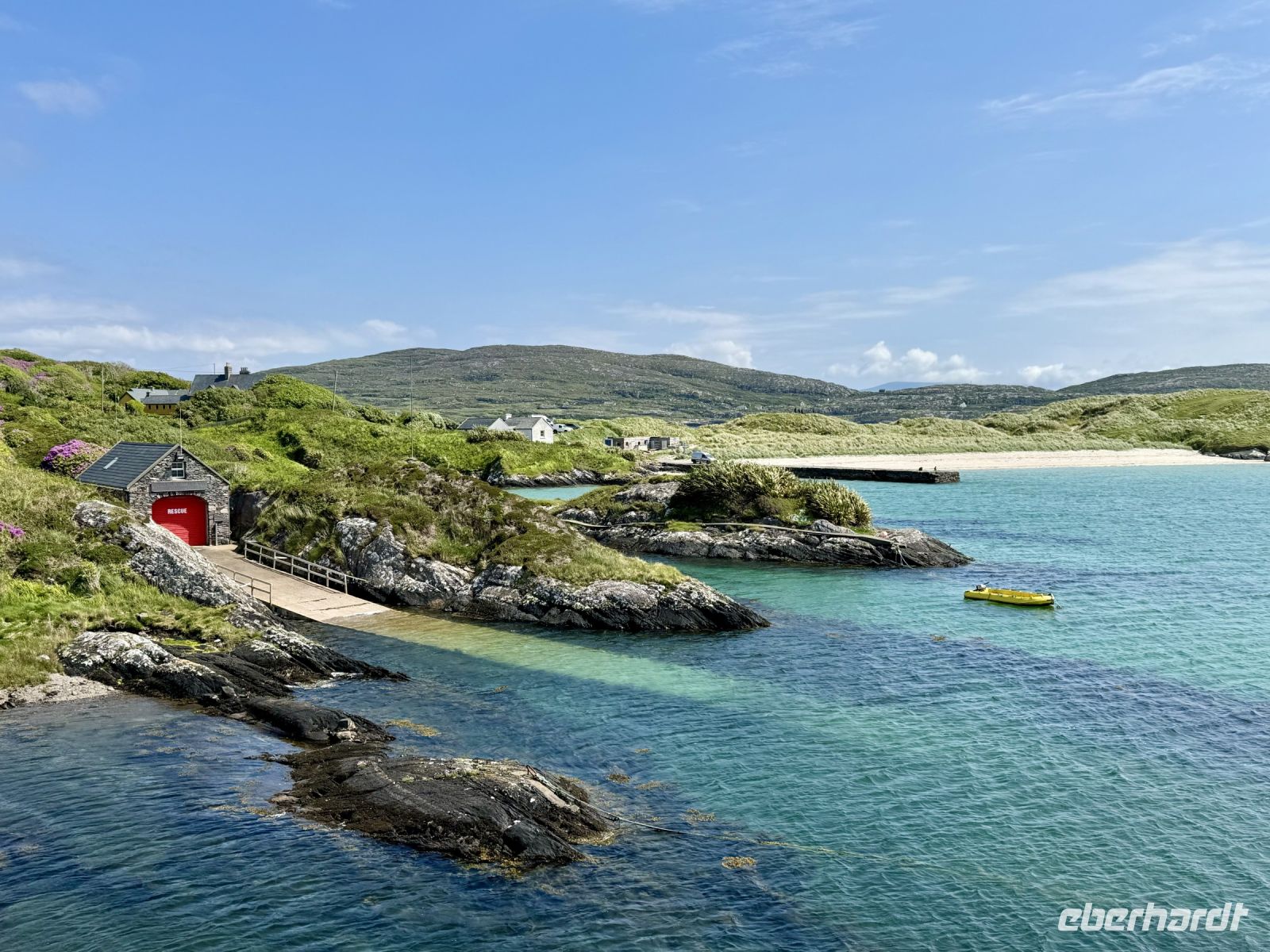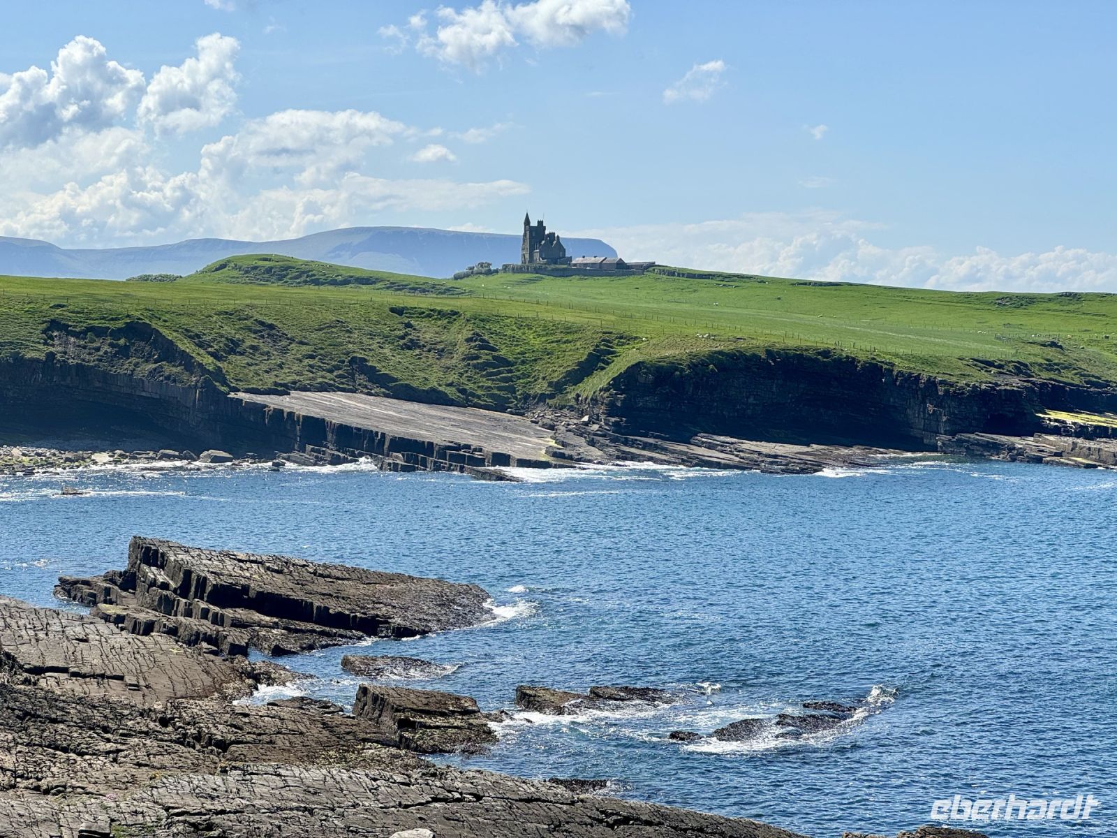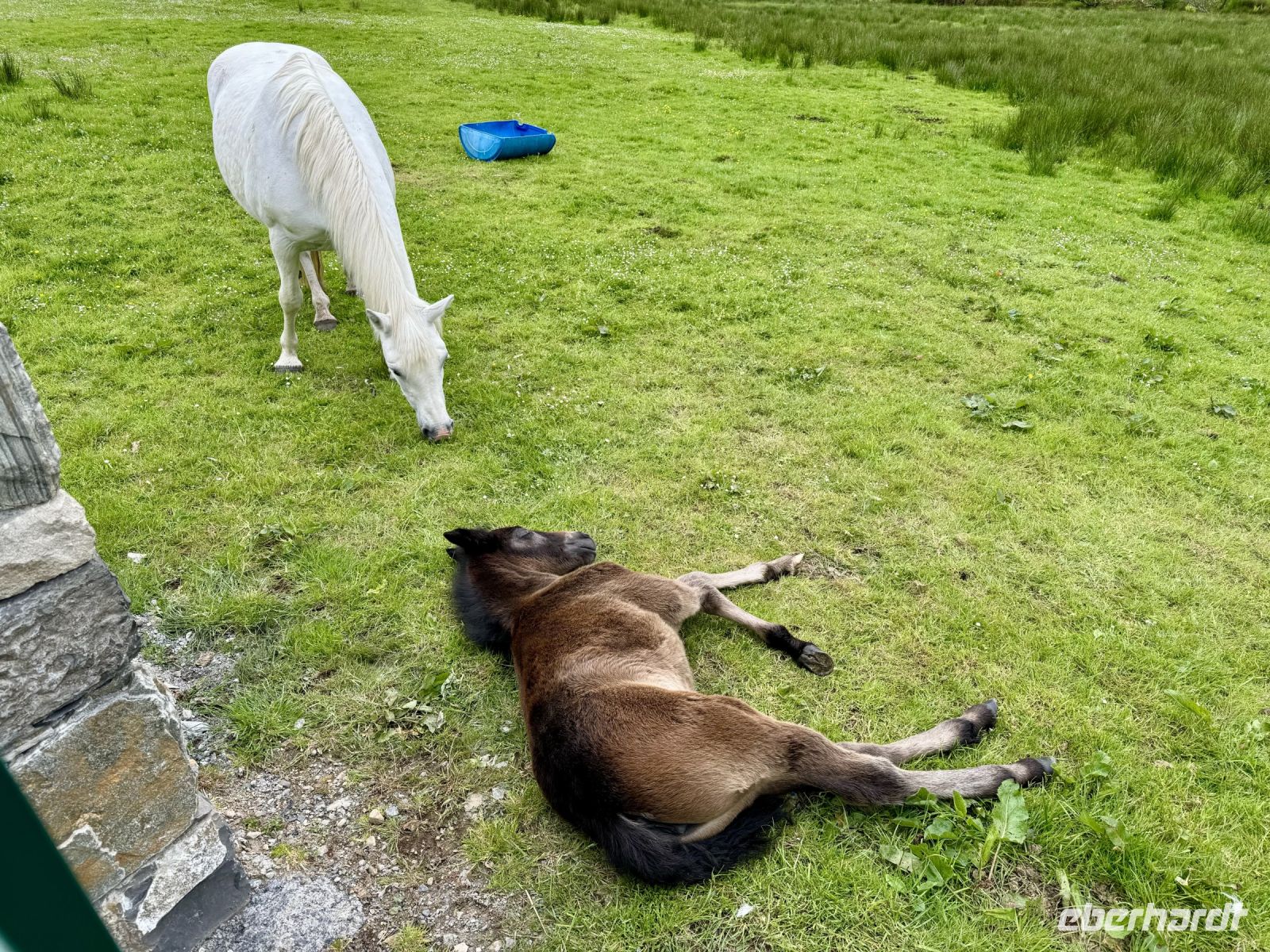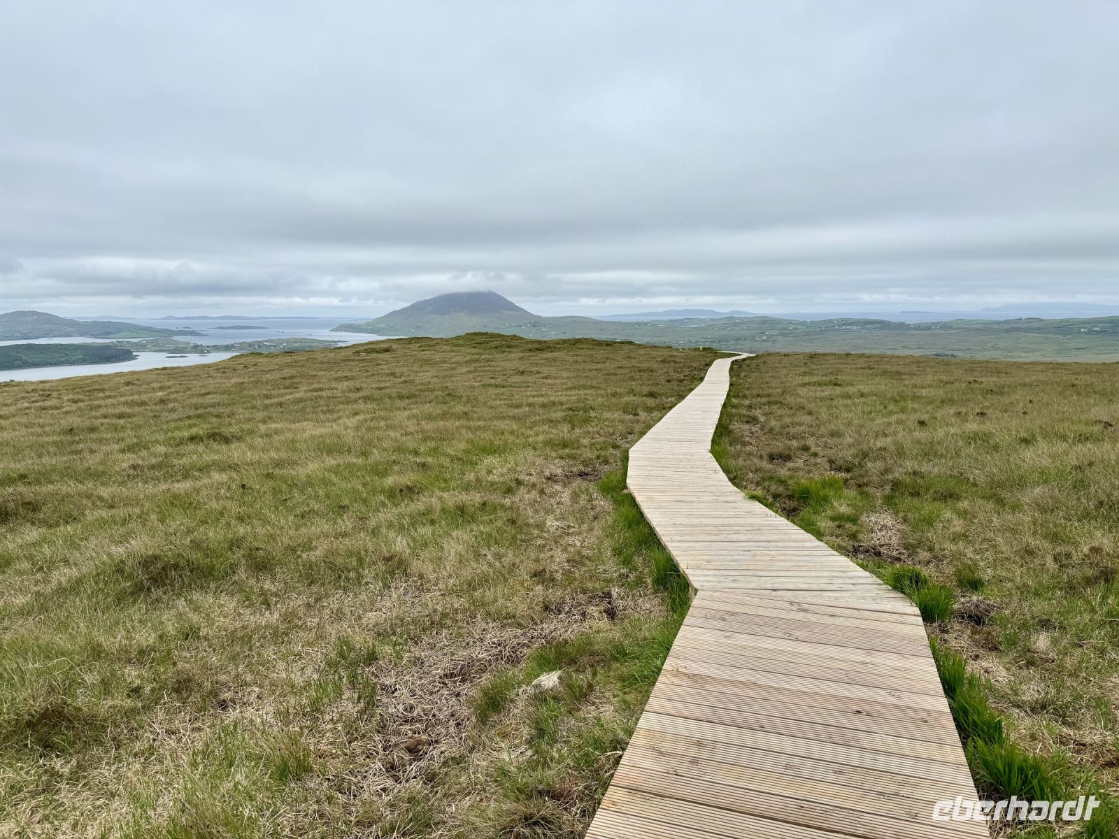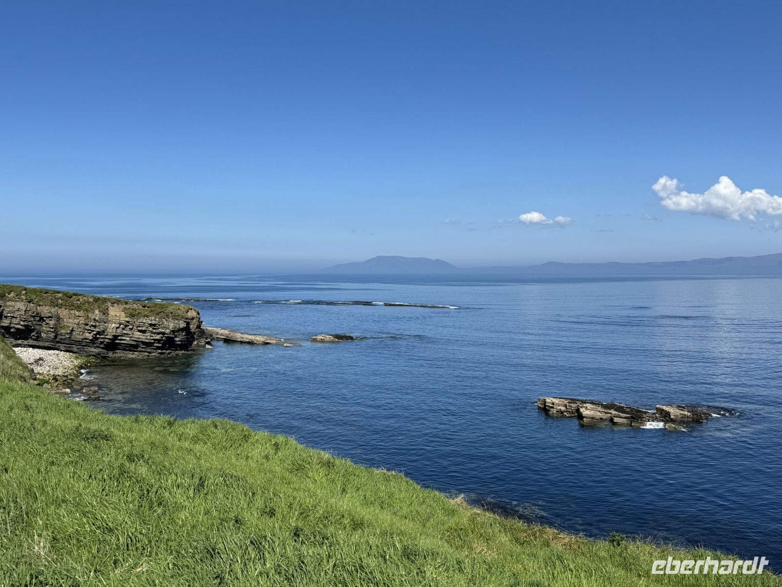 Nach einer Stunde Fahrt erreichen wir Donegal, die „Hauptstadt“ der gleichnamigen Grafschaft, und müssen feststellen, dass mein Lieblingscafé ausgerechnet jetzt eine Woche Betriebsferien hat. Wie soll ich den Tag nur ohne den besten Brownie der Welt überstehen? Dann muss wohl das fantastische Wetter den Tag für uns retten. Wir machen uns trotzdem eine schöne Zeit in Donegal, fotografieren das Castle und kaufen uns Verpflegung für die nachfolgende Wanderung um die Halbinsel Mullaghmore. Die dauert aufgrund des schönen Wetters länger als sonst, weil wir einfach an jeder Biegung stehen bleiben müssen, um die herrliche Landschaft zu fotografieren: die raue Küste, den blühenden Klee, das in allen Blautönen schimmernde Meer, die Klippen von Slieve League am Horizont, das Classiebawn Castle vor dem Ben Bulben als Hintergrund. Zurück am Hafen von Mullaghmore machen wir unsere Picknickpause und genießen noch einmal die Aussicht. Meine Postkarten, die ich als mögliche Beweismittel auf jeder Irlandreise mit mir führe, brauche ich heute nicht. So schön klar und deutlich habe ich den irischen Tafelberg und auch den Knocknarea bei Sligo mit dem Grab der Kriegerkönigin Maeve von Connacht noch nie gesehen. Auch der Croagh Patrick zeigt sich uns in seiner ganzen Pracht und Herrlichkeit, als wir uns am Nachmittag dem hübschen Städtchen Westport nähern. Auch wenn es uns „an arm and a leg“ kostet — wir gönnen uns heute einfach mal ein leckeres Eis, denn schließlich sind wir ja im Urlaub! Vom Aussichtspunkt am Heiligen Berg bewundern wir später in Murrisk die malerische Clew Bay mit ihren vielen kleinen Inseln und statten auch dem National Famine Monument einen kurzen Besuch ab. Zu unserem Hotel am Fjord in Leenane gelangen wir über einen Umweg durch das dramatische Doolough Valley samt zusätzlichem Fotostopp. Der Killary Harbour und die umliegenden Berge sind meine Lieblingsregion in Irland, und die vielen schwarzköpfigen Schafe am Straßenrand stimmen mir da stoisch kauend unwidersprochen zu. Es mag auch am vorzüglichen Essen liegen, das uns im Leenane Hotel erwartet.