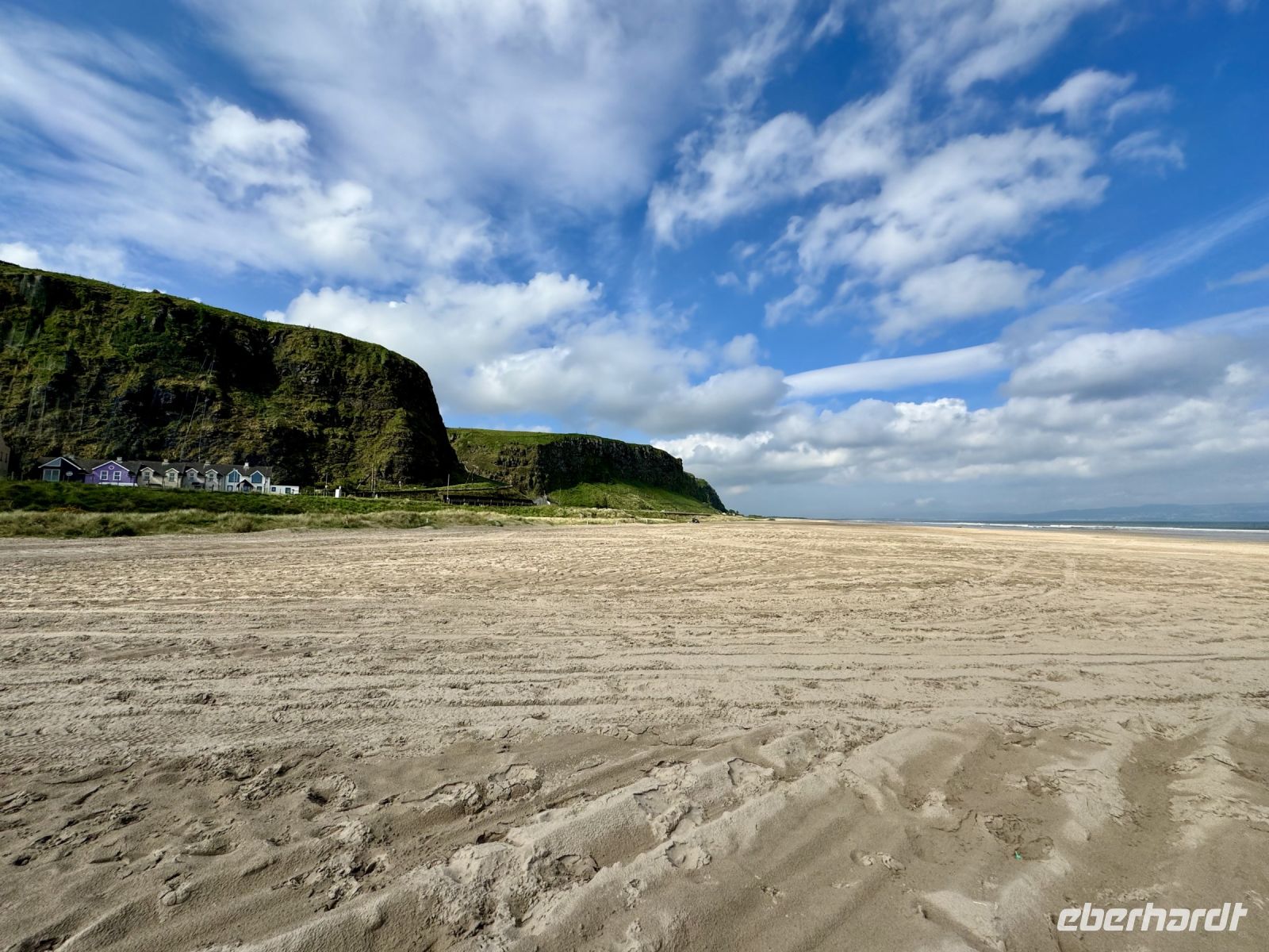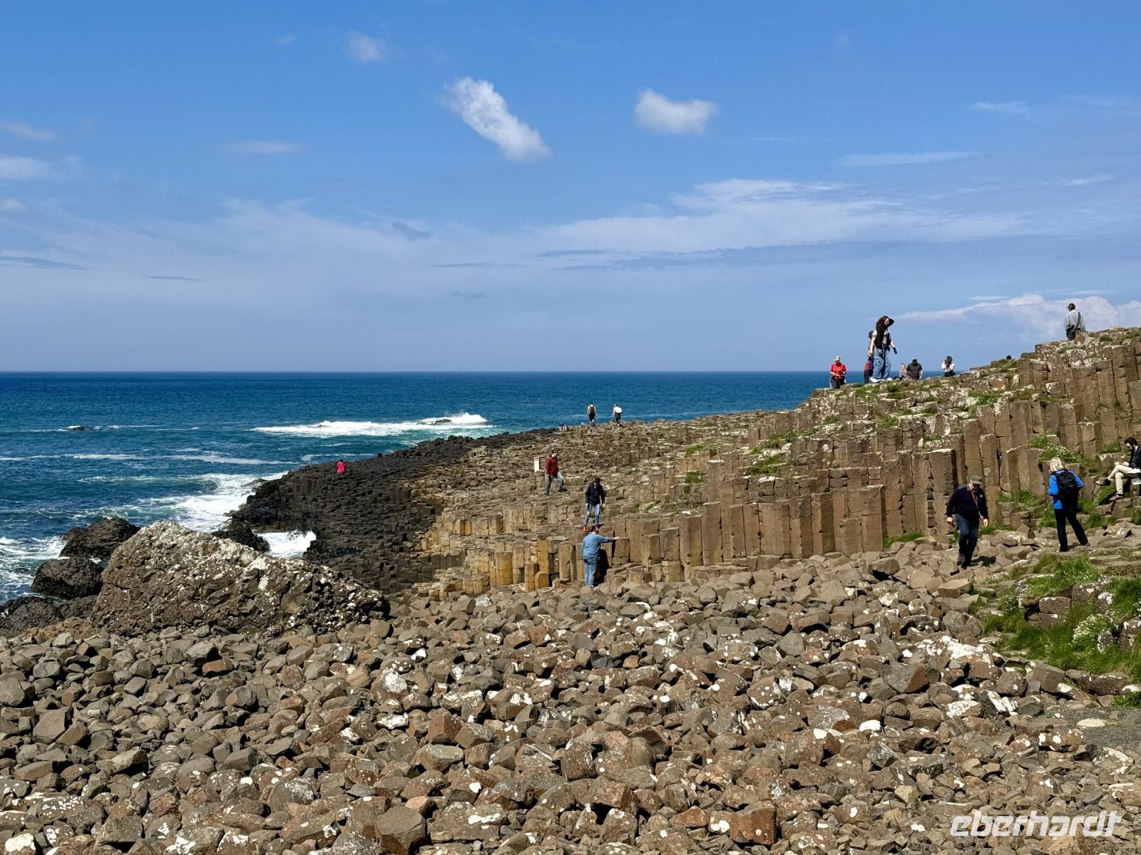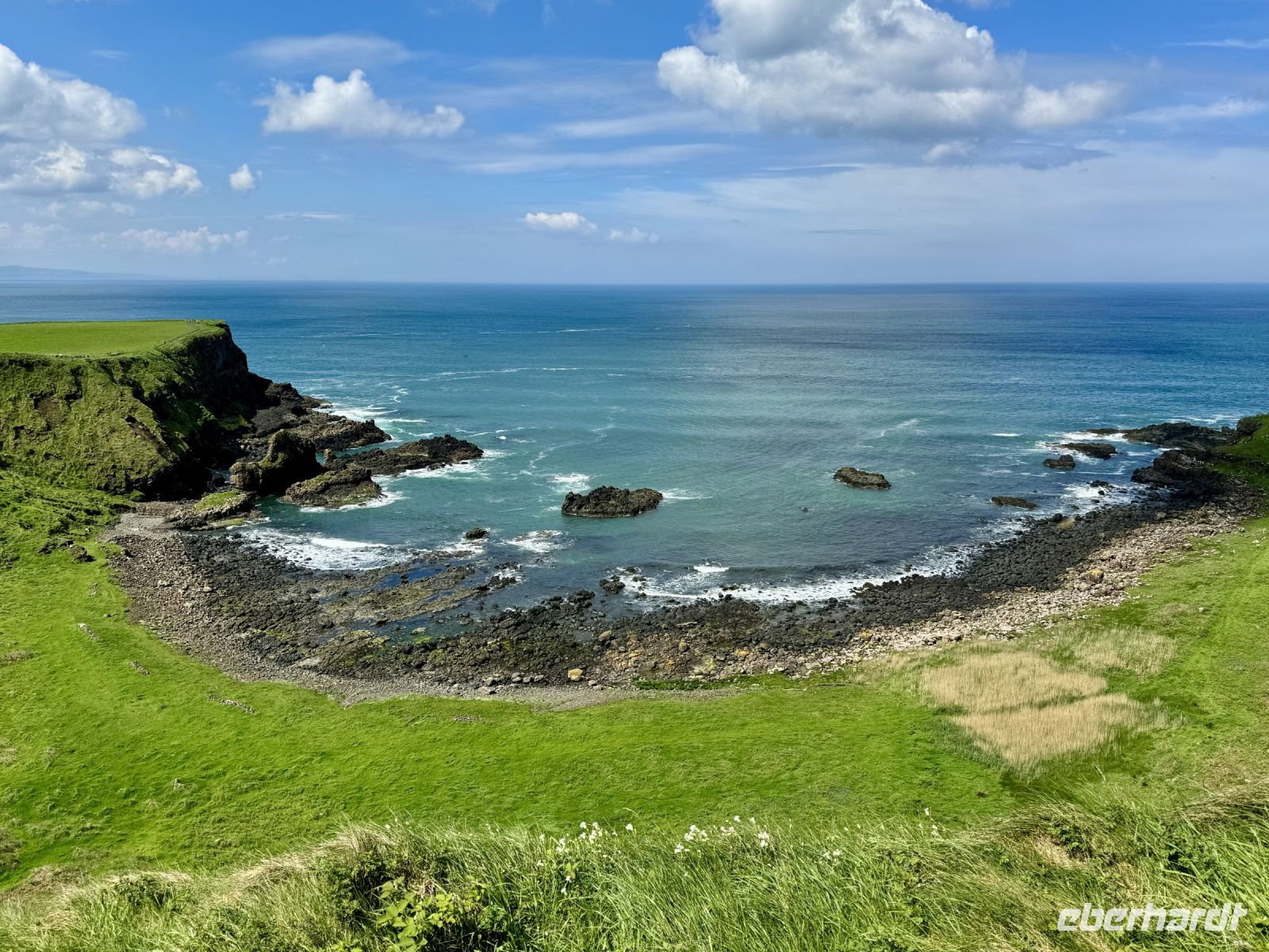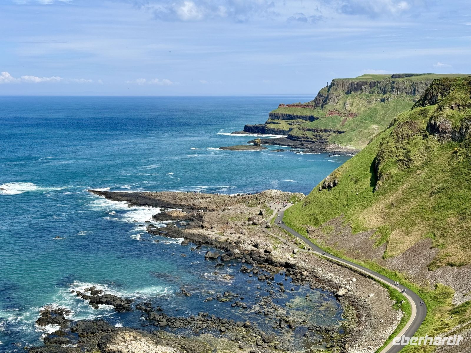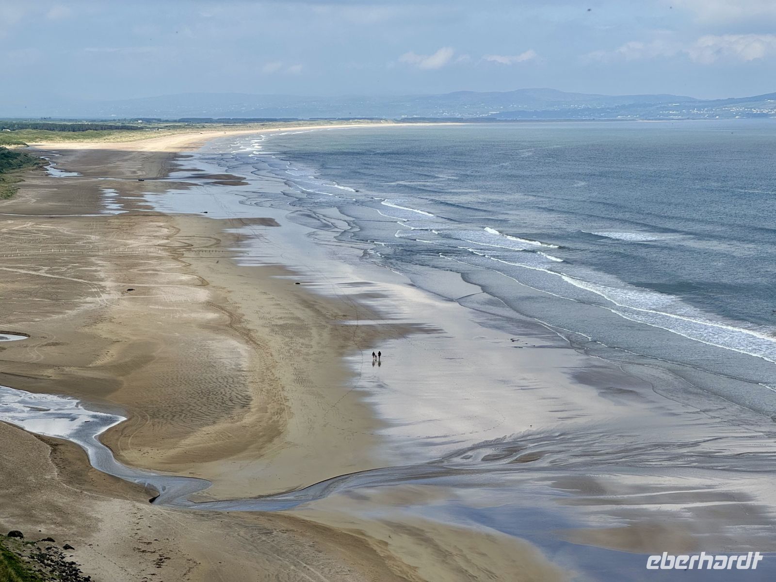 Für einen Tagesausflug fahren wir noch einmal nach Nordirland. Wir wollen bis zum Giant’s Causeway und zurück und uns unterwegs noch den Mussenden Temple anschauen und einen Spaziergang auf der Stadtmauer von Derry/Londonderry machen. Auch für den heutigen Tag habe ich mir ein paar zusätzliche Fotostopps überlegt, bei denen uns der Kleinbus in die Hände spielt. Den ersten machen wir noch im County Donegal am Manorcunningham Viewpoint mit Blick über die breite Mündung des River Swilly in den Atlantik. Zum ersten Mal kann ich auch mit einer Gruppe in Downhill anhalten und zum breiten und ewig langen Strand laufen. Hinter uns die Klippen, vor uns der Atlantik — einfach nur wunderschön! Und der Mussenden Temple thront oben auf den Klippen und spiegelt sich in den glatten Wasserflächen, die jetzt bei Ebbe zurückgeblieben sind. Viel, viel zu viele Fotos werde ich heute wieder machen, das weiß ich jetzt schon, während wir über das ehemalige Anwesen des Bischofs von Derry zum Tempel schlendern. Entlang der Küste fährt uns Donal über Coleraine und Portrush nach Bushmills. Am Dunluce Castle halten wir unterwegs erneut für einen Fotostopp, und auch der Old Bushmills Distillery statten wir einen Besuch ab (einige Gäste probieren auf meine Empfehlung den 12-jährigen Single Malt, meinen Lieblingswhiskey aus Bushmills). Für unseren Aufenthalt am Giant’s Causeway hätten wir uns kaum besseres Wetter wünschen können. Wir steigen gleich hinauf auf die Klippen und sehen uns die Basaltsäulen quasi aus der Vogelperspektive an — inklusive der Menschen, die klein wie Ameisen auf den Steinen herumwuseln. Über eine Treppe mit 162 Stufen gelangen auch wir dann hinunter und nähern uns dem Damm des Riesen von hinten, aus Richtung der Behausung von Finn MacCool. Der irische Sagenheld und mächtige Krieger hat sich schon ein ganz besonderes Fleckchen Erde als Heimat ausgesucht. Und weil das Wetter so schön ist, schließen wir gleich nach dem Giant’s Causeway noch eine kleine Zusatzwanderung zum Runkerry Beach an, wo Donal den Bus am Golfplatz geparkt hat. Am späten Nachmittag wird es dann thematisch ernster, denn wir widmen uns beim Spaziergang auf der Stadtmauer von Derry dem Nordirlandkonflikt, der natürlich unweigerlich dazugehört. Auch heute noch leben Protestanten und Katholiken weitestgehend räumlich getrennt auf verschiedenen Seiten der Stadt. Irgendwie traurig, befremdlich und definitiv Stoff zum Nachdenken für unsere Rückfahrt nach Letterkenny (teilweise auch traumatisch für Donal, der zeitweise als Soldat an der Grenze stationiert war). Zur Aufheiterung lese ich ein Märchen über vier tapfere Helden aus der Schar von Finn MacCool vor — und dann sind wir auch schon fast wieder am Hotel.