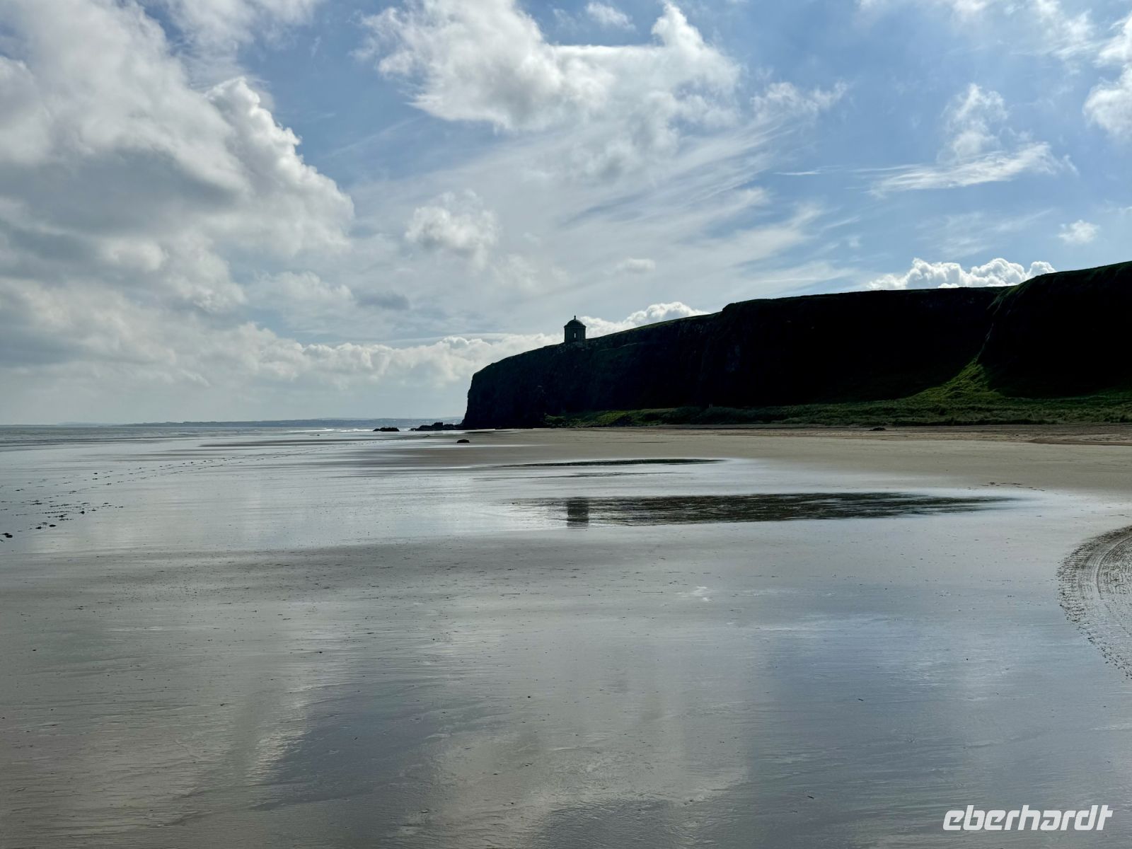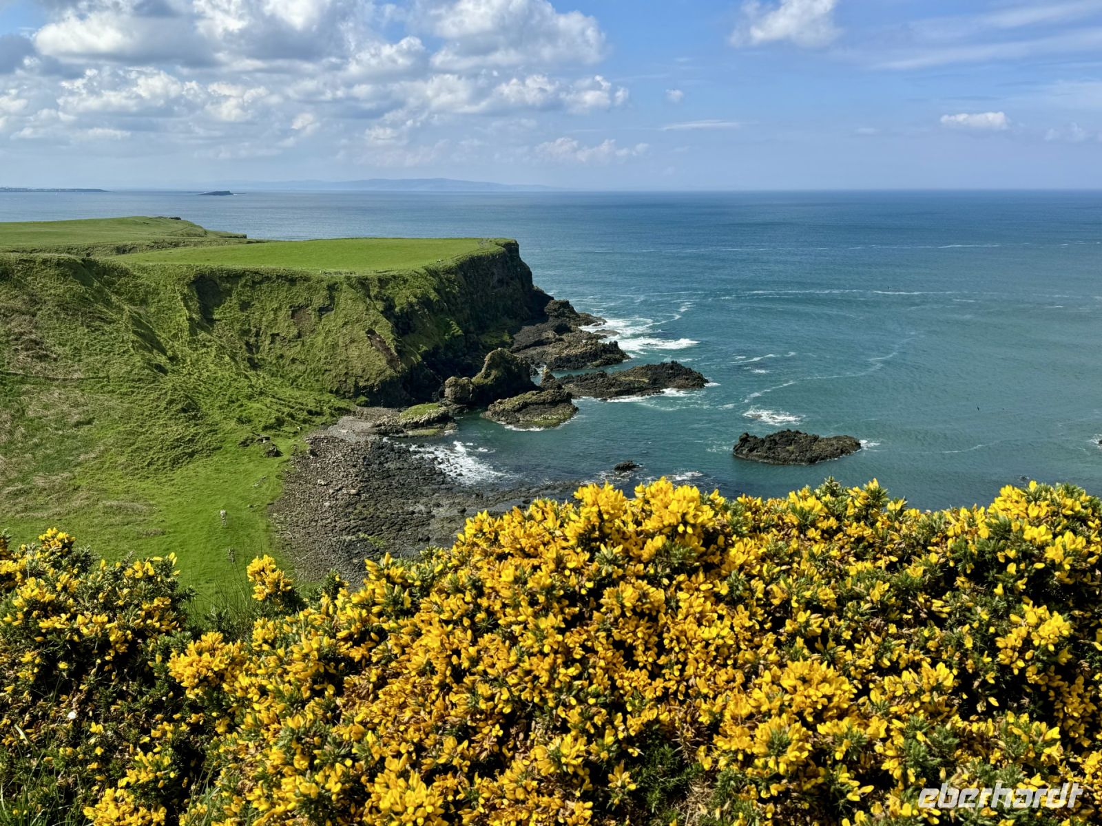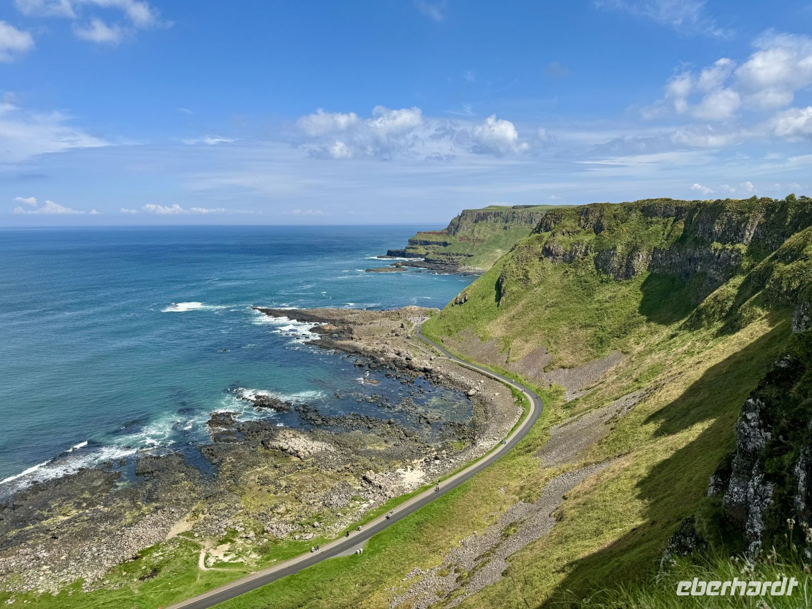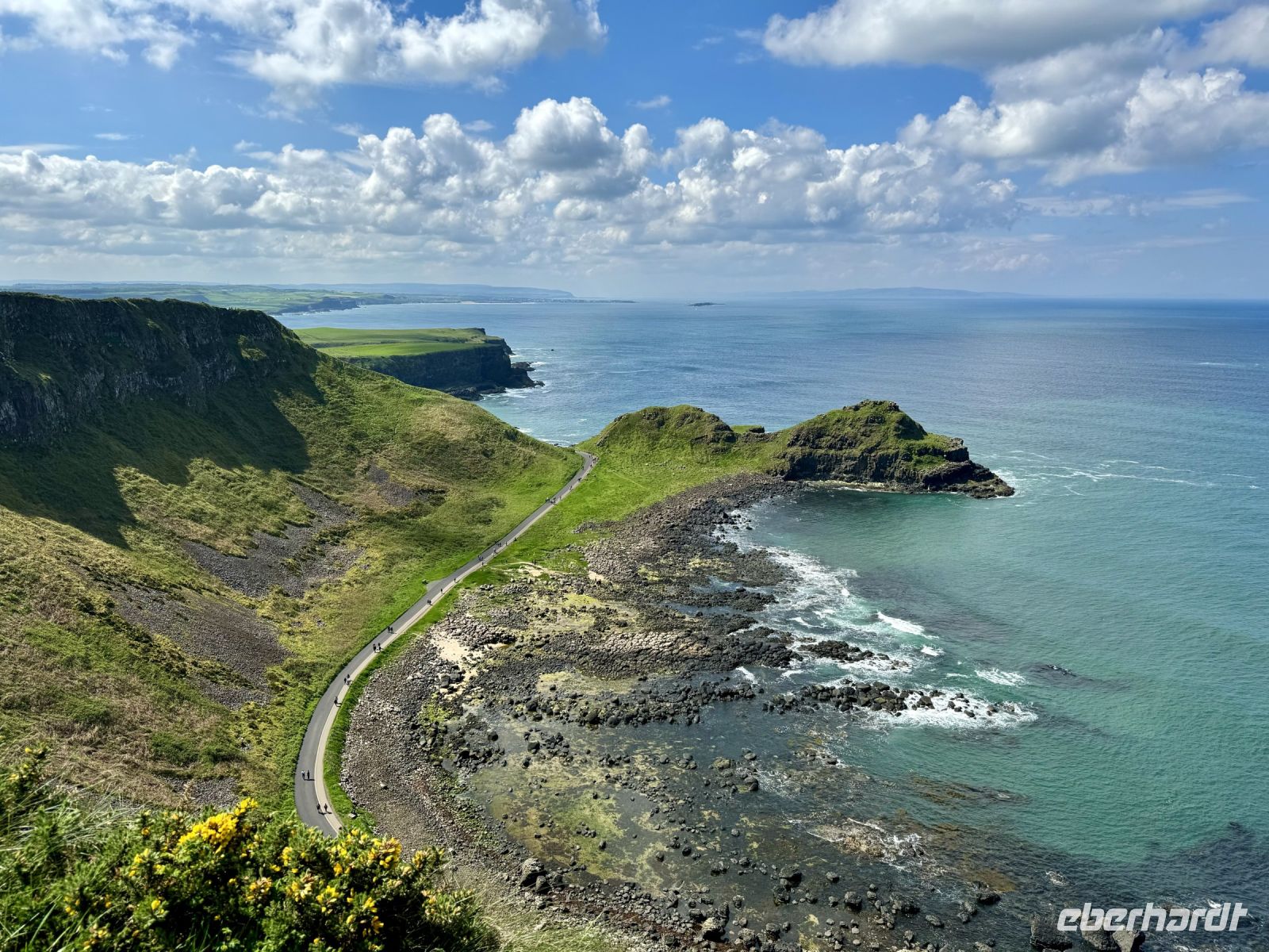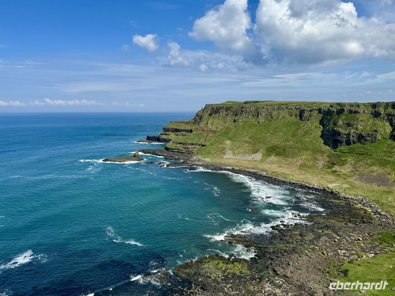 Für einen Tagesausflug fahren wir noch einmal nach Nordirland. Wir wollen bis zum Giant’s Causeway und zurück und uns unterwegs noch den Mussenden Temple anschauen und einen Spaziergang auf der Stadtmauer von Derry/Londonderry machen. Auch für den heutigen Tag habe ich mir ein paar zusätzliche Fotostopps überlegt, bei denen uns der Kleinbus in die Hände spielt. Den ersten machen wir noch im County Donegal am Manorcunningham Viewpoint mit Blick über die breite Mündung des River Swilly in den Atlantik. Zum ersten Mal kann ich auch mit einer Gruppe in Downhill anhalten und zum breiten und ewig langen Strand laufen. Hinter uns die Klippen, vor uns der Atlantik — einfach nur wunderschön! Und der Mussenden Temple thront oben auf den Klippen und spiegelt sich in den glatten Wasserflächen, die jetzt bei Ebbe zurückgeblieben sind. Viel, viel zu viele Fotos werde ich heute wieder machen, das weiß ich jetzt schon, während wir über das ehemalige Anwesen des Bischofs von Derry zum Tempel schlendern. Entlang der Küste fährt uns Donal über Coleraine und Portrush nach Bushmills. Am Dunluce Castle halten wir unterwegs erneut für einen Fotostopp, und auch der Old Bushmills Distillery statten wir einen Besuch ab (einige Gäste probieren auf meine Empfehlung den 12-jährigen Single Malt, meinen Lieblingswhiskey aus Bushmills). Für unseren Aufenthalt am Giant’s Causeway hätten wir uns kaum besseres Wetter wünschen können. Wir steigen gleich hinauf auf die Klippen und sehen uns die Basaltsäulen quasi aus der Vogelperspektive an — inklusive der Menschen, die klein wie Ameisen auf den Steinen herumwuseln. Über eine Treppe mit 162 Stufen gelangen auch wir dann hinunter und nähern uns dem Damm des Riesen von hinten, aus Richtung der Behausung von Finn MacCool. Der irische Sagenheld und mächtige Krieger hat sich schon ein ganz besonderes Fleckchen Erde als Heimat ausgesucht. Und weil das Wetter so schön ist, schließen wir gleich nach dem Giant’s Causeway noch eine kleine Zusatzwanderung zum Runkerry Beach an, wo Donal den Bus am Golfplatz geparkt hat. Am späten Nachmittag wird es dann thematisch ernster, denn wir widmen uns beim Spaziergang auf der Stadtmauer von Derry dem Nordirlandkonflikt, der natürlich unweigerlich dazugehört. Auch heute noch leben Protestanten und Katholiken weitestgehend räumlich getrennt auf verschiedenen Seiten der Stadt. Irgendwie traurig, befremdlich und definitiv Stoff zum Nachdenken für unsere Rückfahrt nach Letterkenny (teilweise auch traumatisch für Donal, der zeitweise als Soldat an der Grenze stationiert war). Zur Aufheiterung lese ich ein Märchen über vier tapfere Helden aus der Schar von Finn MacCool vor — und dann sind wir auch schon fast wieder am Hotel.