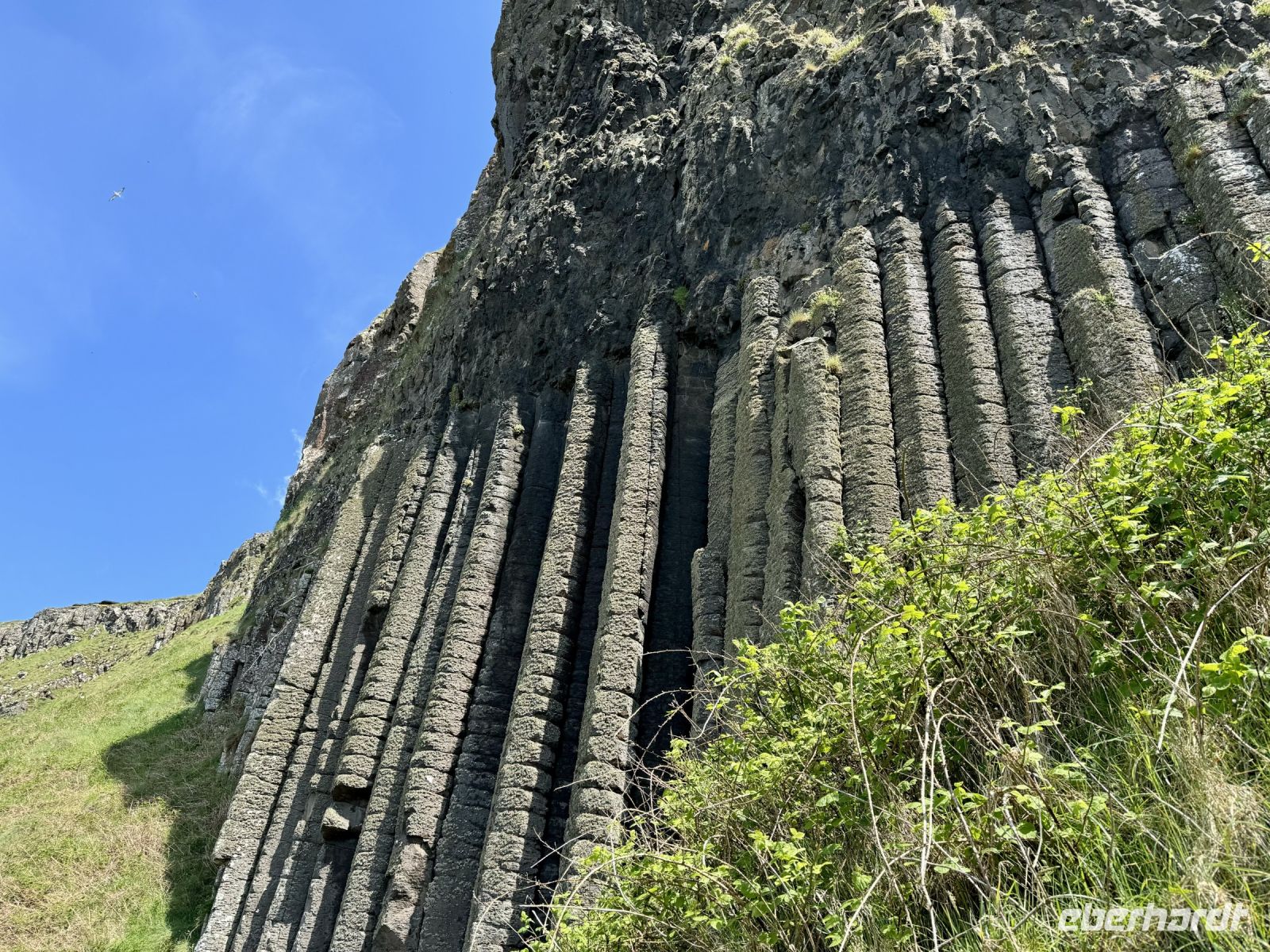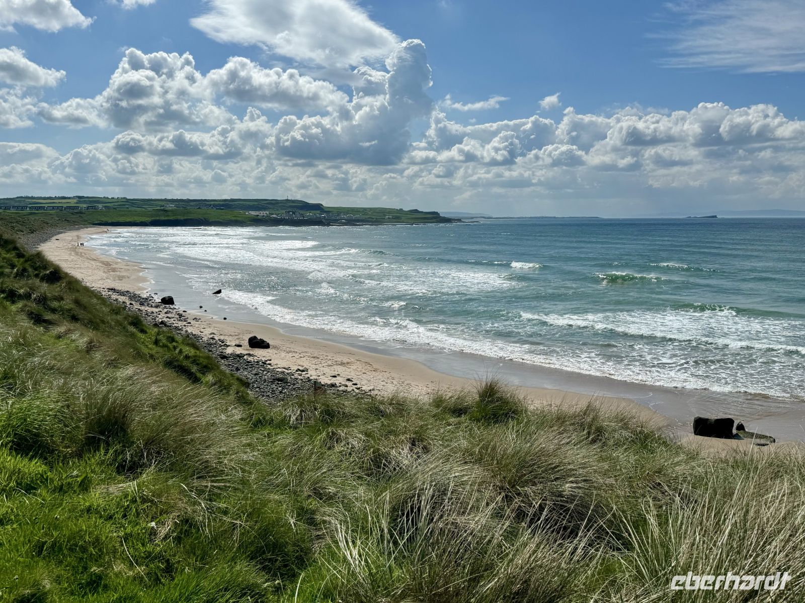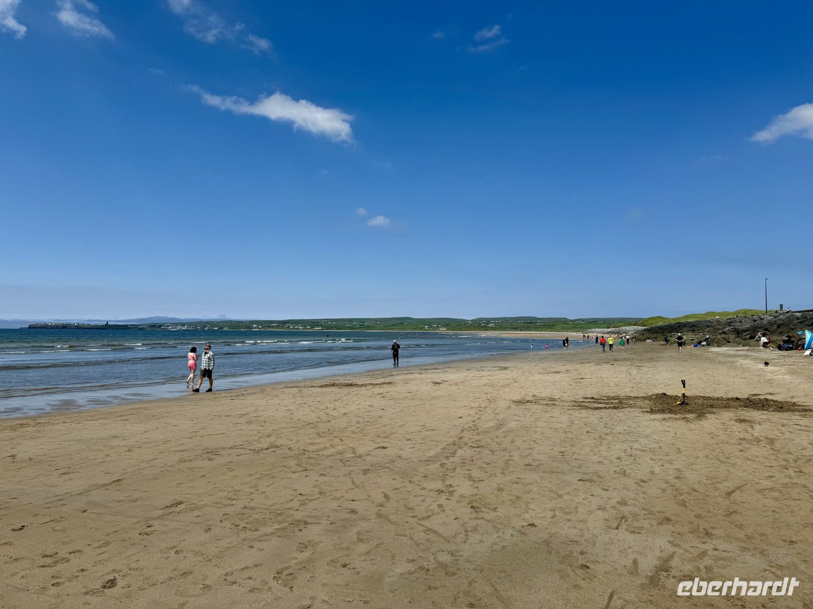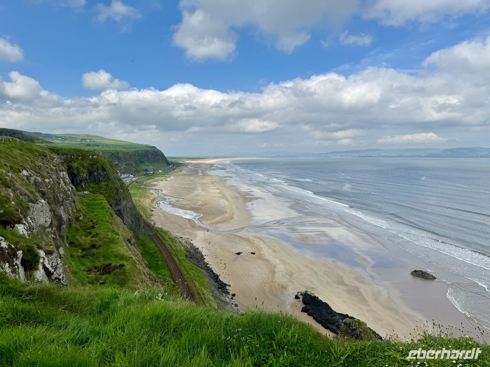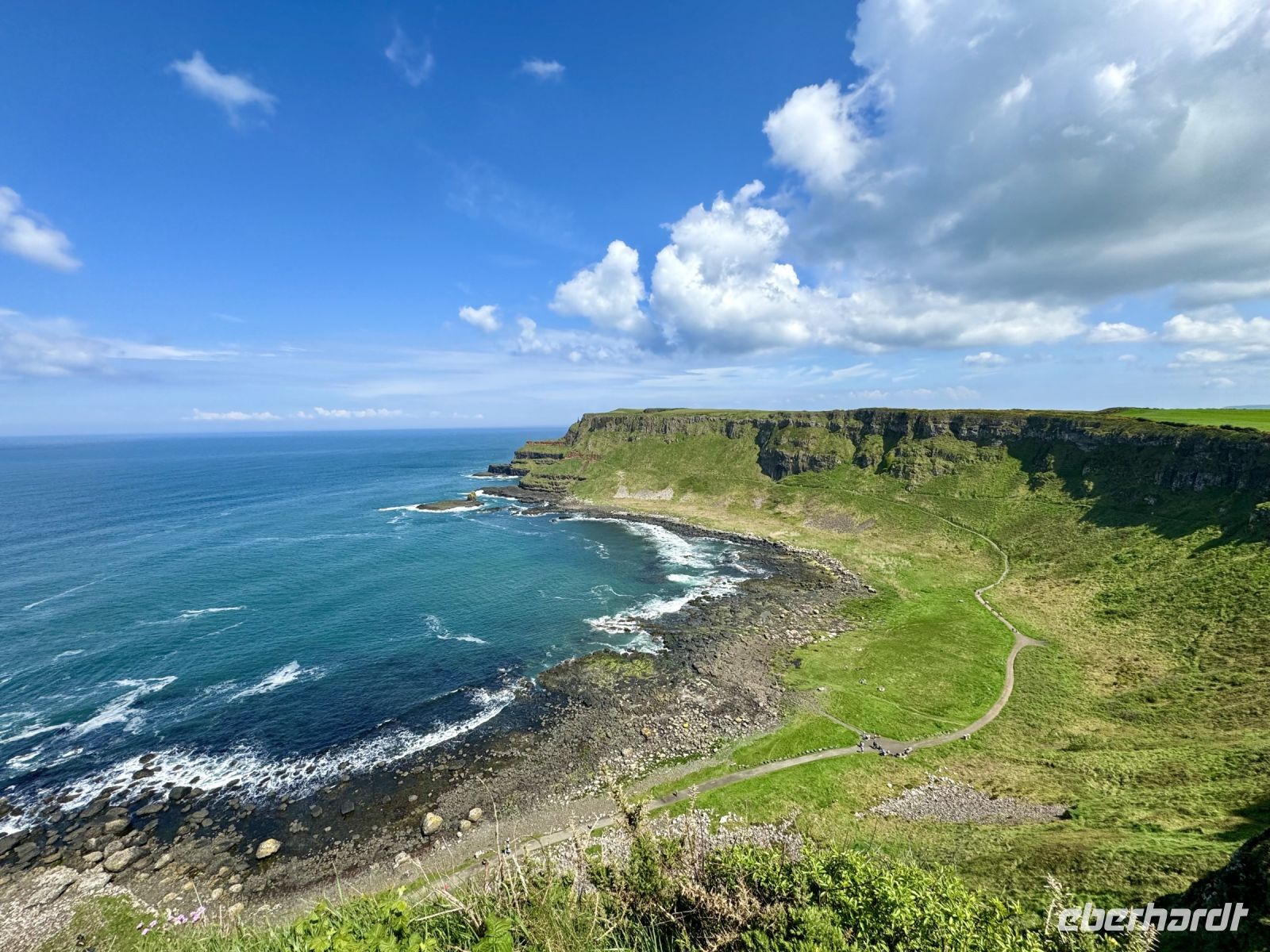 Für einen Tagesausflug fahren wir noch einmal nach Nordirland. Wir wollen bis zum Giant’s Causeway und zurück und uns unterwegs noch den Mussenden Temple anschauen und einen Spaziergang auf der Stadtmauer von Derry/Londonderry machen. Auch für den heutigen Tag habe ich mir ein paar zusätzliche Fotostopps überlegt, bei denen uns der Kleinbus in die Hände spielt. Den ersten machen wir noch im County Donegal am Manorcunningham Viewpoint mit Blick über die breite Mündung des River Swilly in den Atlantik. Zum ersten Mal kann ich auch mit einer Gruppe in Downhill anhalten und zum breiten und ewig langen Strand laufen. Hinter uns die Klippen, vor uns der Atlantik — einfach nur wunderschön! Und der Mussenden Temple thront oben auf den Klippen und spiegelt sich in den glatten Wasserflächen, die jetzt bei Ebbe zurückgeblieben sind. Viel, viel zu viele Fotos werde ich heute wieder machen, das weiß ich jetzt schon, während wir über das ehemalige Anwesen des Bischofs von Derry zum Tempel schlendern. Entlang der Küste fährt uns Donal über Coleraine und Portrush nach Bushmills. Am Dunluce Castle halten wir unterwegs erneut für einen Fotostopp, und auch der Old Bushmills Distillery statten wir einen Besuch ab (einige Gäste probieren auf meine Empfehlung den 12-jährigen Single Malt, meinen Lieblingswhiskey aus Bushmills). Für unseren Aufenthalt am Giant’s Causeway hätten wir uns kaum besseres Wetter wünschen können. Wir steigen gleich hinauf auf die Klippen und sehen uns die Basaltsäulen quasi aus der Vogelperspektive an — inklusive der Menschen, die klein wie Ameisen auf den Steinen herumwuseln. Über eine Treppe mit 162 Stufen gelangen auch wir dann hinunter und nähern uns dem Damm des Riesen von hinten, aus Richtung der Behausung von Finn MacCool. Der irische Sagenheld und mächtige Krieger hat sich schon ein ganz besonderes Fleckchen Erde als Heimat ausgesucht. Und weil das Wetter so schön ist, schließen wir gleich nach dem Giant’s Causeway noch eine kleine Zusatzwanderung zum Runkerry Beach an, wo Donal den Bus am Golfplatz geparkt hat. Am späten Nachmittag wird es dann thematisch ernster, denn wir widmen uns beim Spaziergang auf der Stadtmauer von Derry dem Nordirlandkonflikt, der natürlich unweigerlich dazugehört. Auch heute noch leben Protestanten und Katholiken weitestgehend räumlich getrennt auf verschiedenen Seiten der Stadt. Irgendwie traurig, befremdlich und definitiv Stoff zum Nachdenken für unsere Rückfahrt nach Letterkenny (teilweise auch traumatisch für Donal, der zeitweise als Soldat an der Grenze stationiert war). Zur Aufheiterung lese ich ein Märchen über vier tapfere Helden aus der Schar von Finn MacCool vor — und dann sind wir auch schon fast wieder am Hotel.