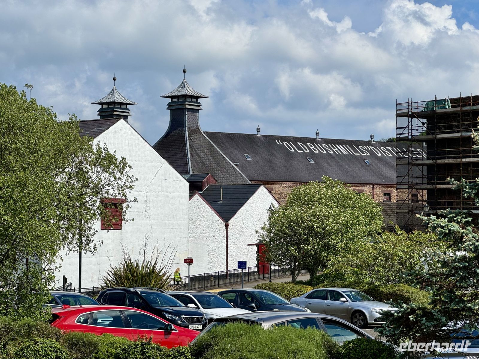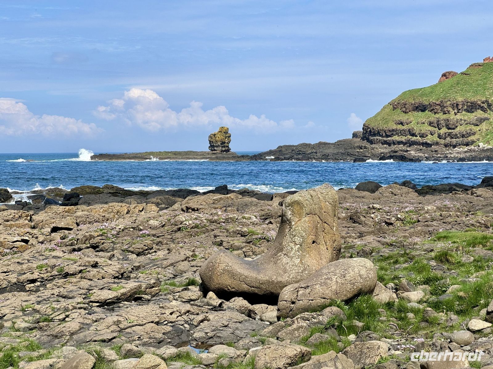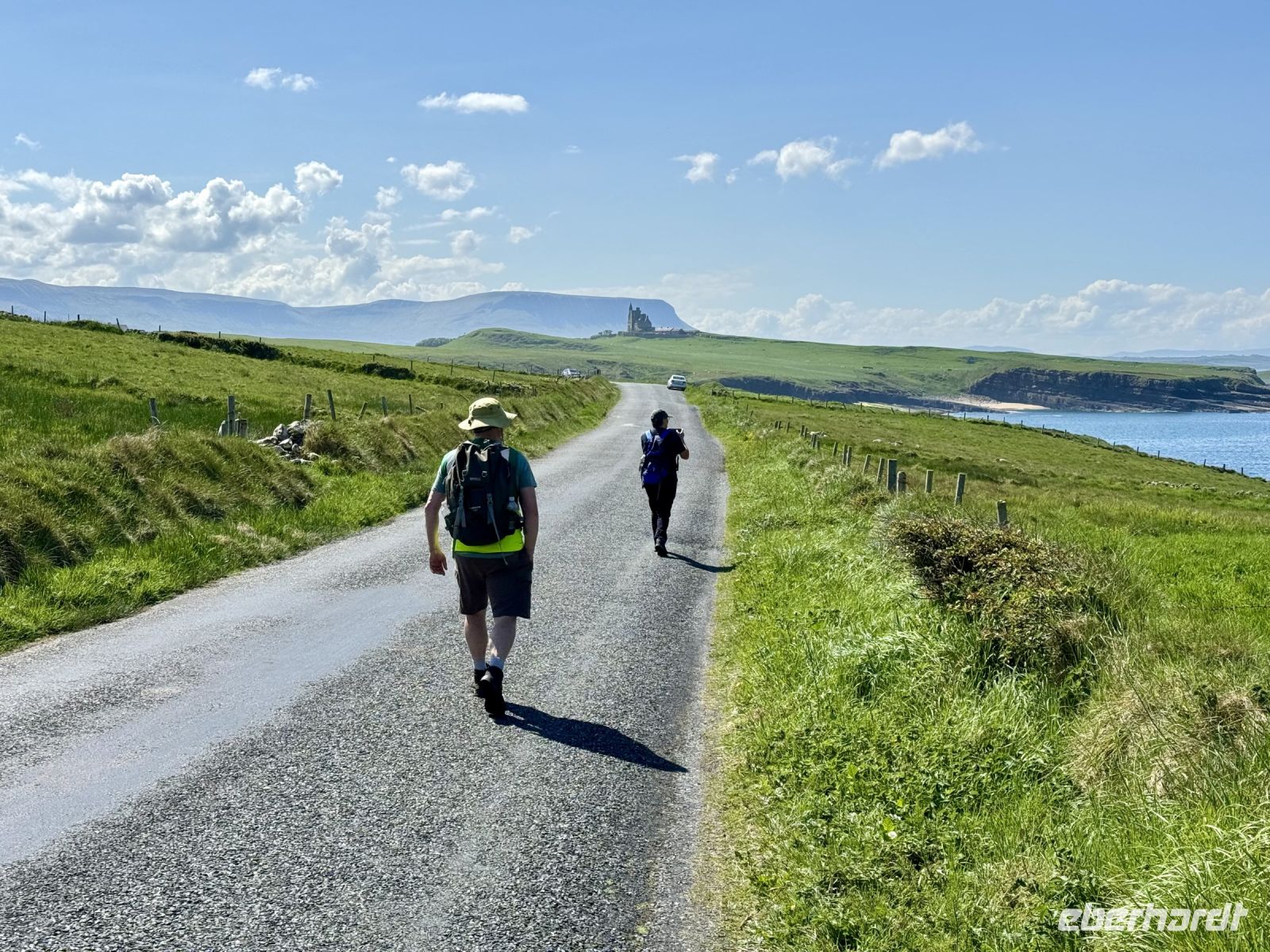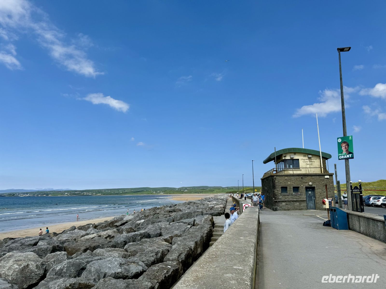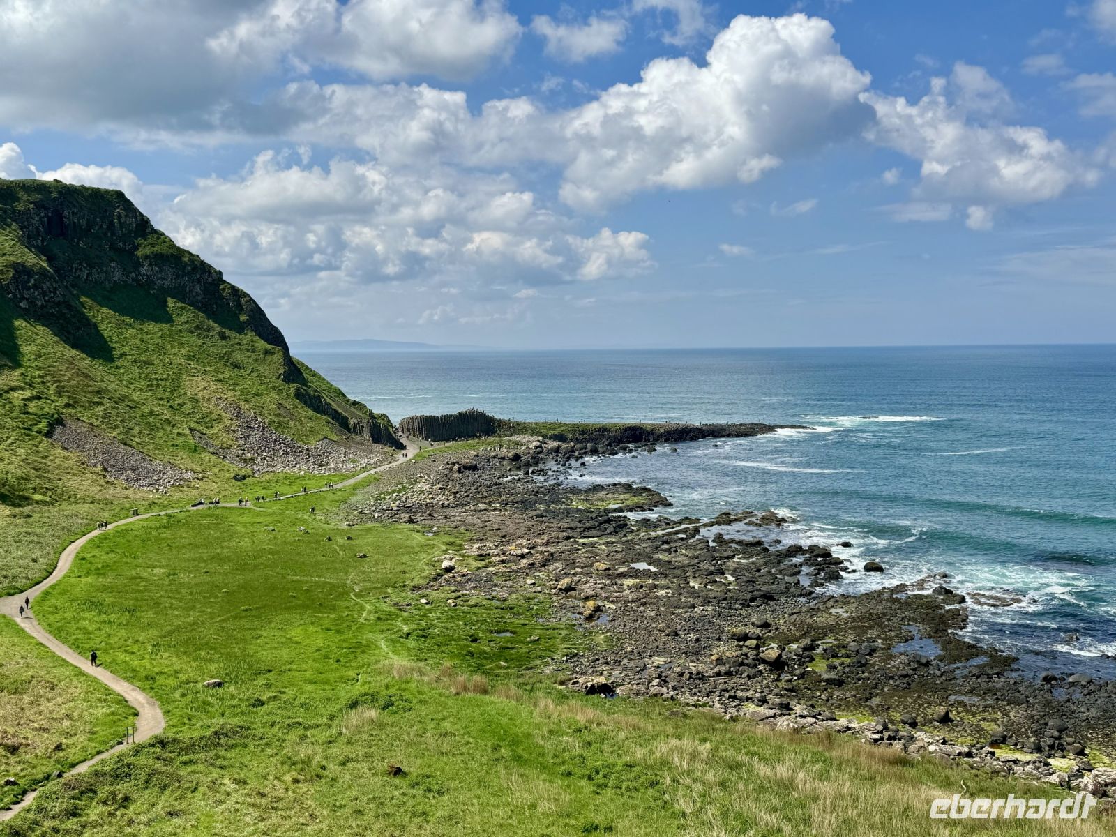 Für einen Tagesausflug fahren wir noch einmal nach Nordirland. Wir wollen bis zum Giant’s Causeway und zurück und uns unterwegs noch den Mussenden Temple anschauen und einen Spaziergang auf der Stadtmauer von Derry/Londonderry machen. Auch für den heutigen Tag habe ich mir ein paar zusätzliche Fotostopps überlegt, bei denen uns der Kleinbus in die Hände spielt. Den ersten machen wir noch im County Donegal am Manorcunningham Viewpoint mit Blick über die breite Mündung des River Swilly in den Atlantik. Zum ersten Mal kann ich auch mit einer Gruppe in Downhill anhalten und zum breiten und ewig langen Strand laufen. Hinter uns die Klippen, vor uns der Atlantik — einfach nur wunderschön! Und der Mussenden Temple thront oben auf den Klippen und spiegelt sich in den glatten Wasserflächen, die jetzt bei Ebbe zurückgeblieben sind. Viel, viel zu viele Fotos werde ich heute wieder machen, das weiß ich jetzt schon, während wir über das ehemalige Anwesen des Bischofs von Derry zum Tempel schlendern. Entlang der Küste fährt uns Donal über Coleraine und Portrush nach Bushmills. Am Dunluce Castle halten wir unterwegs erneut für einen Fotostopp, und auch der Old Bushmills Distillery statten wir einen Besuch ab (einige Gäste probieren auf meine Empfehlung den 12-jährigen Single Malt, meinen Lieblingswhiskey aus Bushmills). Für unseren Aufenthalt am Giant’s Causeway hätten wir uns kaum besseres Wetter wünschen können. Wir steigen gleich hinauf auf die Klippen und sehen uns die Basaltsäulen quasi aus der Vogelperspektive an — inklusive der Menschen, die klein wie Ameisen auf den Steinen herumwuseln. Über eine Treppe mit 162 Stufen gelangen auch wir dann hinunter und nähern uns dem Damm des Riesen von hinten, aus Richtung der Behausung von Finn MacCool. Der irische Sagenheld und mächtige Krieger hat sich schon ein ganz besonderes Fleckchen Erde als Heimat ausgesucht. Und weil das Wetter so schön ist, schließen wir gleich nach dem Giant’s Causeway noch eine kleine Zusatzwanderung zum Runkerry Beach an, wo Donal den Bus am Golfplatz geparkt hat. Am späten Nachmittag wird es dann thematisch ernster, denn wir widmen uns beim Spaziergang auf der Stadtmauer von Derry dem Nordirlandkonflikt, der natürlich unweigerlich dazugehört. Auch heute noch leben Protestanten und Katholiken weitestgehend räumlich getrennt auf verschiedenen Seiten der Stadt. Irgendwie traurig, befremdlich und definitiv Stoff zum Nachdenken für unsere Rückfahrt nach Letterkenny (teilweise auch traumatisch für Donal, der zeitweise als Soldat an der Grenze stationiert war). Zur Aufheiterung lese ich ein Märchen über vier tapfere Helden aus der Schar von Finn MacCool vor — und dann sind wir auch schon fast wieder am Hotel.