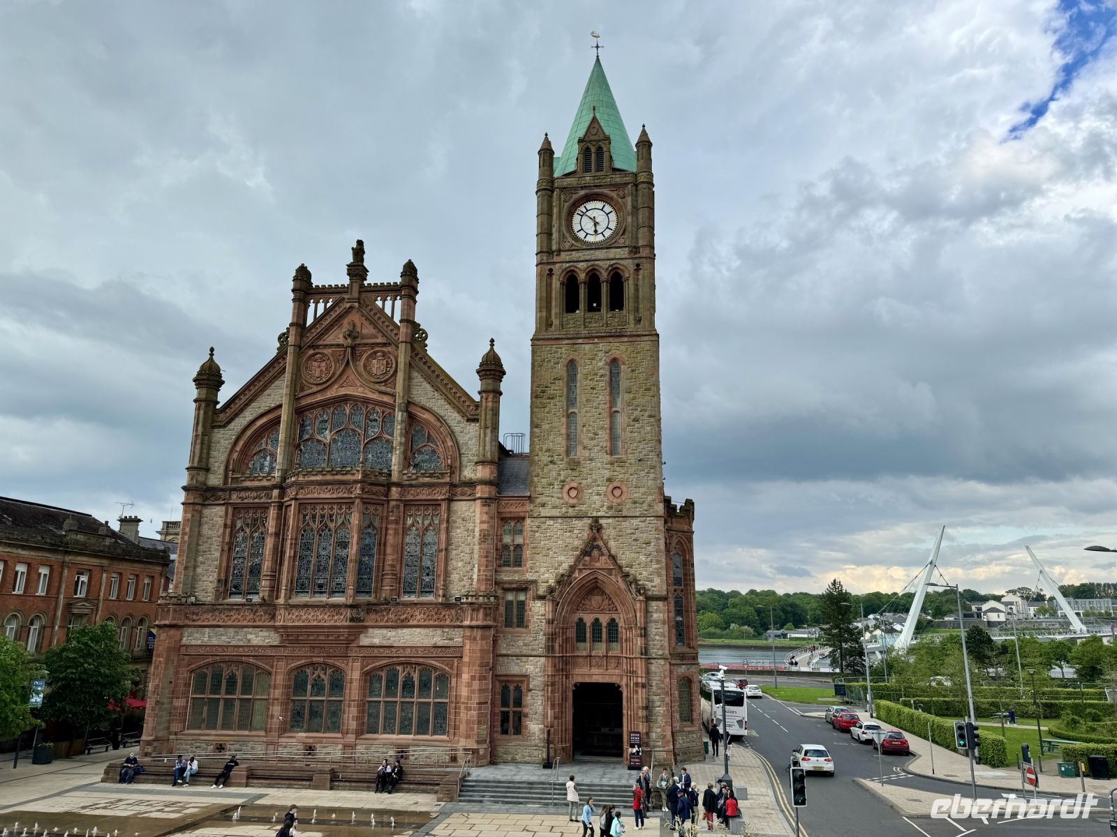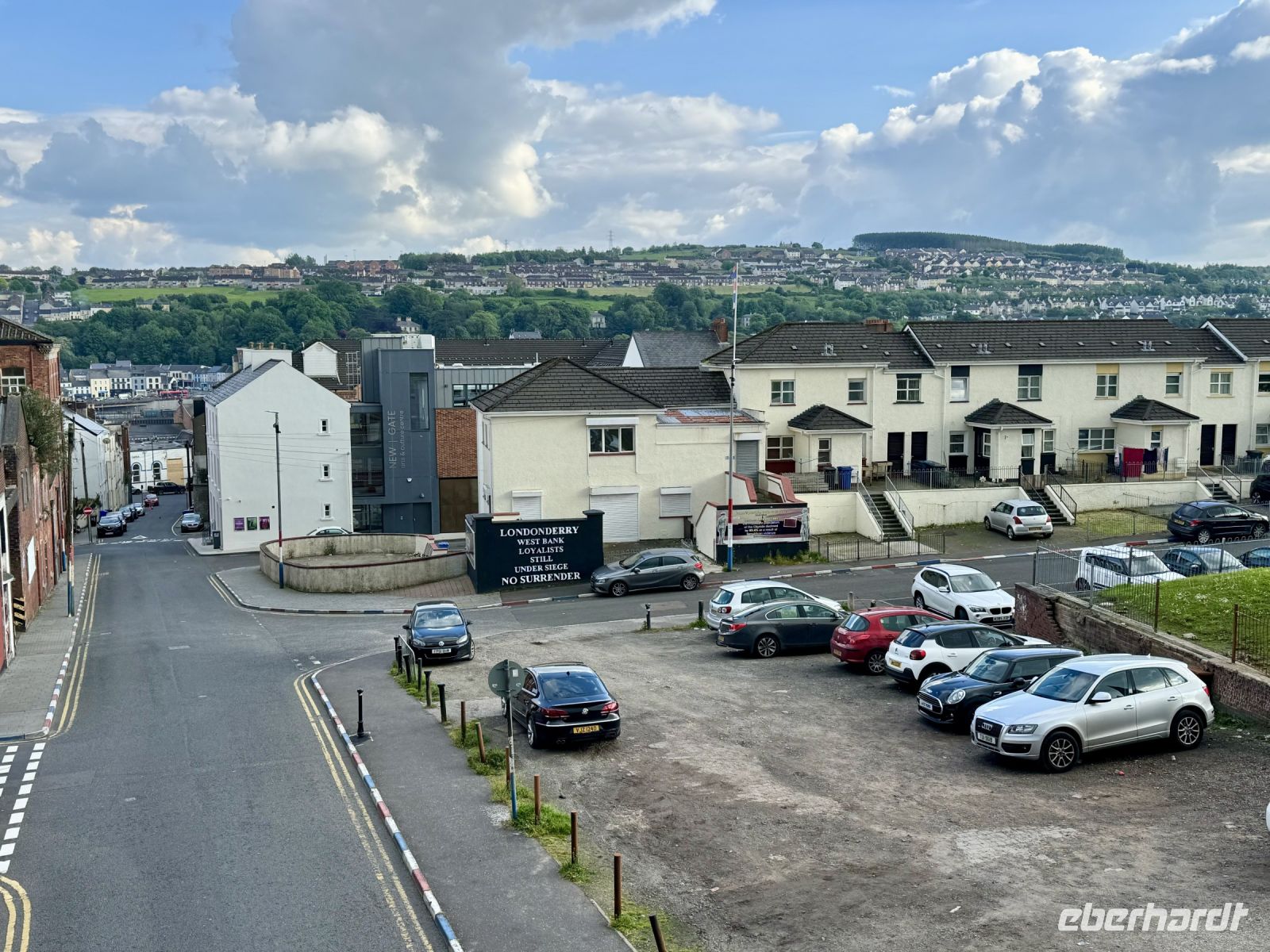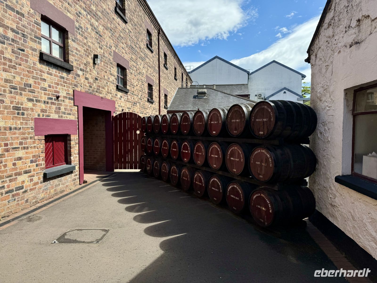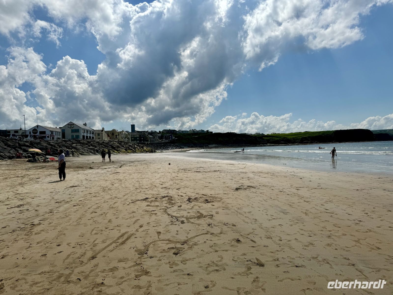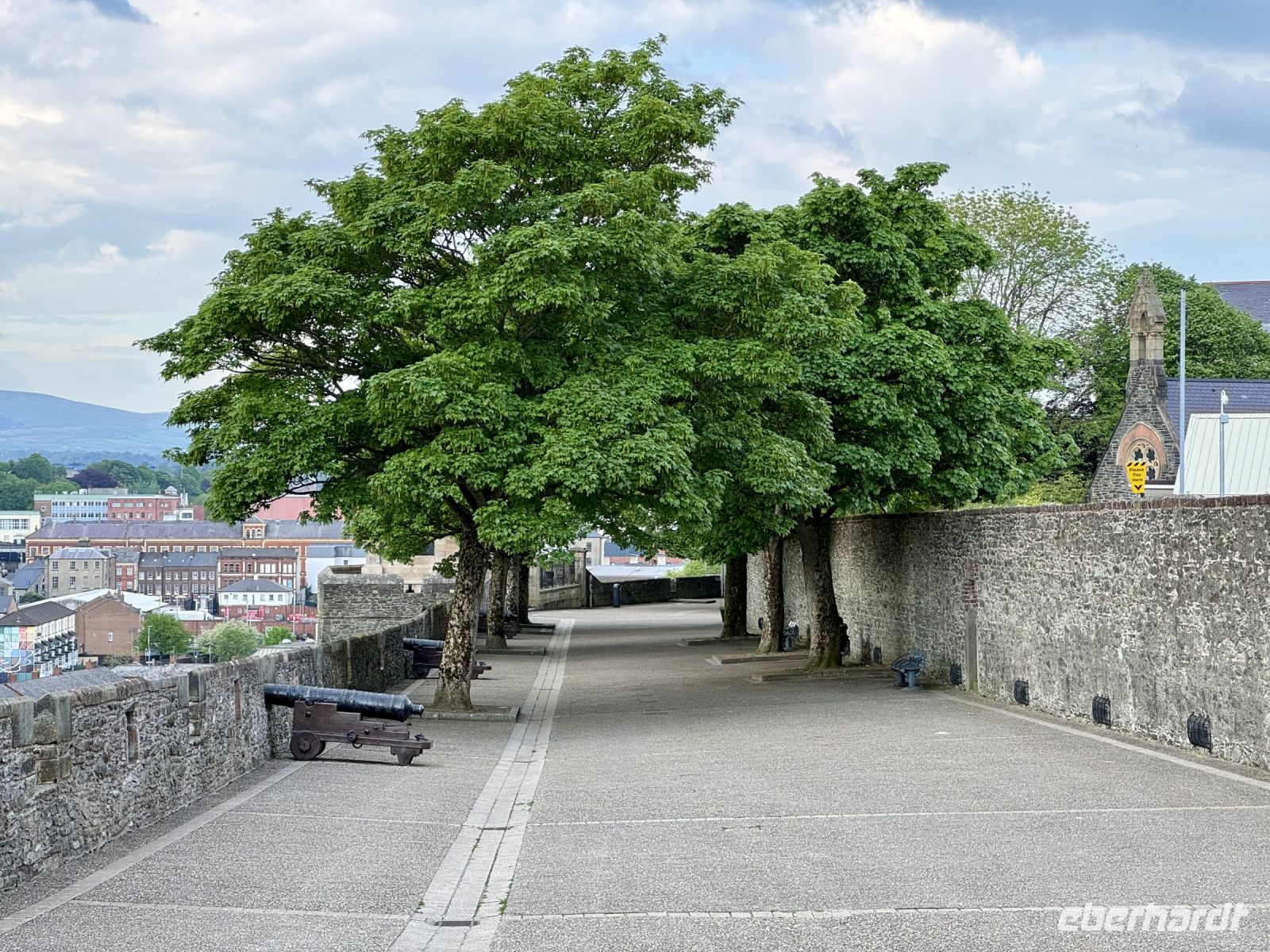 Für einen Tagesausflug fahren wir noch einmal nach Nordirland. Wir wollen bis zum Giant’s Causeway und zurück und uns unterwegs noch den Mussenden Temple anschauen und einen Spaziergang auf der Stadtmauer von Derry/Londonderry machen. Auch für den heutigen Tag habe ich mir ein paar zusätzliche Fotostopps überlegt, bei denen uns der Kleinbus in die Hände spielt. Den ersten machen wir noch im County Donegal am Manorcunningham Viewpoint mit Blick über die breite Mündung des River Swilly in den Atlantik. Zum ersten Mal kann ich auch mit einer Gruppe in Downhill anhalten und zum breiten und ewig langen Strand laufen. Hinter uns die Klippen, vor uns der Atlantik — einfach nur wunderschön! Und der Mussenden Temple thront oben auf den Klippen und spiegelt sich in den glatten Wasserflächen, die jetzt bei Ebbe zurückgeblieben sind. Viel, viel zu viele Fotos werde ich heute wieder machen, das weiß ich jetzt schon, während wir über das ehemalige Anwesen des Bischofs von Derry zum Tempel schlendern. Entlang der Küste fährt uns Donal über Coleraine und Portrush nach Bushmills. Am Dunluce Castle halten wir unterwegs erneut für einen Fotostopp, und auch der Old Bushmills Distillery statten wir einen Besuch ab (einige Gäste probieren auf meine Empfehlung den 12-jährigen Single Malt, meinen Lieblingswhiskey aus Bushmills). Für unseren Aufenthalt am Giant’s Causeway hätten wir uns kaum besseres Wetter wünschen können. Wir steigen gleich hinauf auf die Klippen und sehen uns die Basaltsäulen quasi aus der Vogelperspektive an — inklusive der Menschen, die klein wie Ameisen auf den Steinen herumwuseln. Über eine Treppe mit 162 Stufen gelangen auch wir dann hinunter und nähern uns dem Damm des Riesen von hinten, aus Richtung der Behausung von Finn MacCool. Der irische Sagenheld und mächtige Krieger hat sich schon ein ganz besonderes Fleckchen Erde als Heimat ausgesucht. Und weil das Wetter so schön ist, schließen wir gleich nach dem Giant’s Causeway noch eine kleine Zusatzwanderung zum Runkerry Beach an, wo Donal den Bus am Golfplatz geparkt hat. Am späten Nachmittag wird es dann thematisch ernster, denn wir widmen uns beim Spaziergang auf der Stadtmauer von Derry dem Nordirlandkonflikt, der natürlich unweigerlich dazugehört. Auch heute noch leben Protestanten und Katholiken weitestgehend räumlich getrennt auf verschiedenen Seiten der Stadt. Irgendwie traurig, befremdlich und definitiv Stoff zum Nachdenken für unsere Rückfahrt nach Letterkenny (teilweise auch traumatisch für Donal, der zeitweise als Soldat an der Grenze stationiert war). Zur Aufheiterung lese ich ein Märchen über vier tapfere Helden aus der Schar von Finn MacCool vor — und dann sind wir auch schon fast wieder am Hotel.