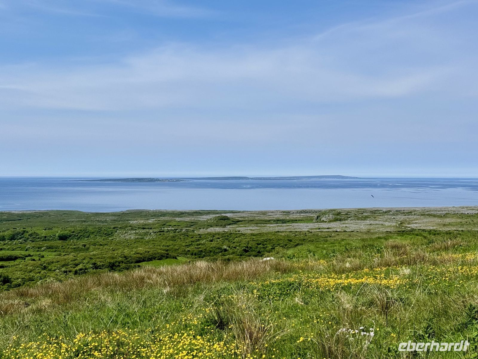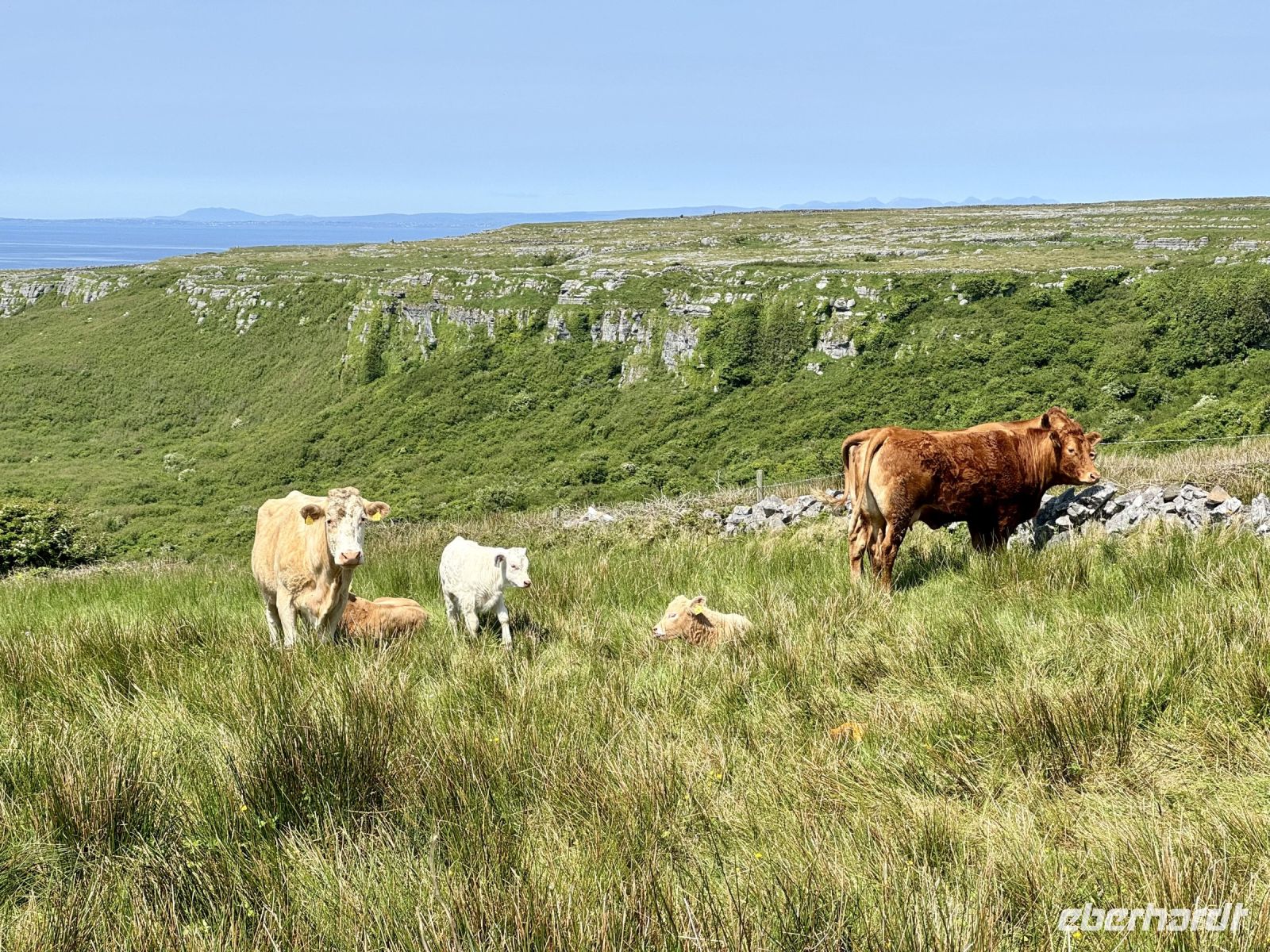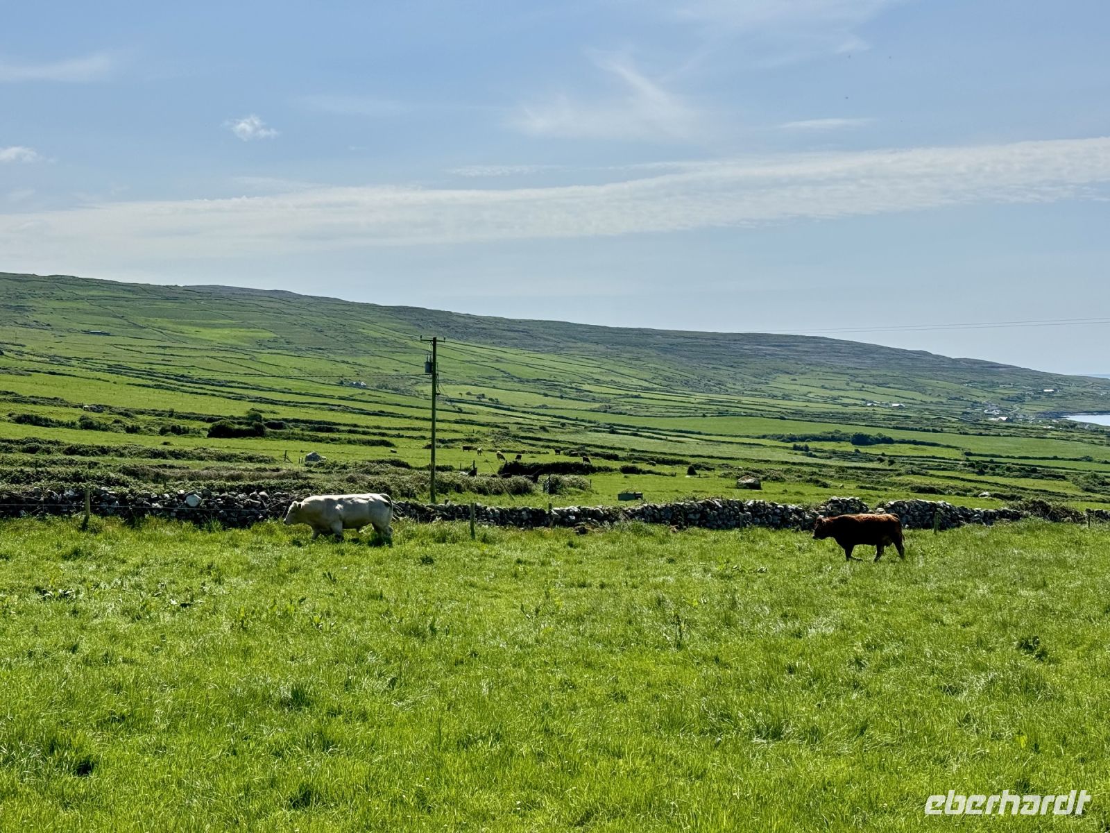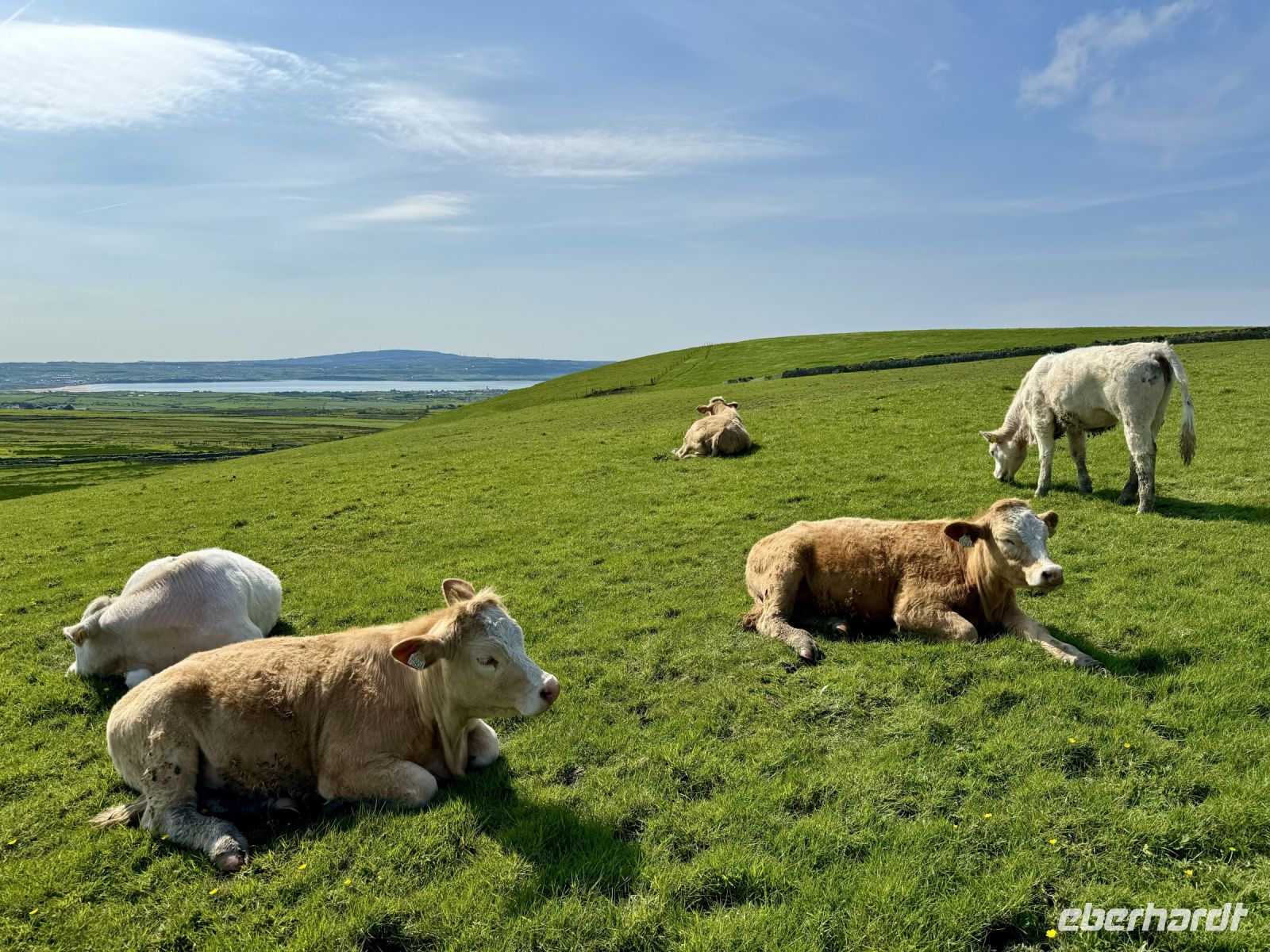 Als ich am Morgen die Vorhänge zurückziehe, werde ich von der Sonne regelrecht geblendet. Es verspricht ein schöner Tag zu werden! Gefahren werden wir heute von Tom, denn Donal muss einen Tag Pause machen, begleitet uns jedoch trotzdem in den Burren. Nach einem kurzen Einkaufsstopp am Supermarkt fährt uns Tom zunächst zur Kilmacduagh Abbey, einer Klosterruine, zu der auch der „Schiefe Turm“ von Irland gehört. Zum Glück weit weniger überlaufen als sein Pendant in Pisa: Wir sind die einzigen Besucher. Für die weltberühmten Cliffs of Moher trifft dies hingegen nicht mehr zu. Da wir mit Tom einen guten Chauffeur erwischt haben, erreichen wir die Klippen nach einer kleinen Rundfahrt durch den östlichen Teil des Burren früher als geplant, sodass es noch nicht allzu voll ist. Das Wetter ist ein Traum. Ich muss meinen Gästen sogar gestehen, dass ich noch nie so perfekte Bedingungen hatte wie heute. Ein guter Tag, um neue Katalogfotos zu machen. Wir können auch sehr schön die Aran Islands am Horizont erkennen. Sie begleiten uns auf unserer anschließenden Wanderung auf dem Burren Way stets auf unserer linken Seite. Die Wanderung wird auch durch die vielen Tierbegegnungen unterwegs bereichert: Wir hören einen Kuckuck, sehen eine Stute mit ihrem noch ganz jungen Fohlen sowie viele kräftige, wohlgenährte Kühe samt kleinen Kälbern. Am Ende der Strecke wartet der Pub in Fanore auf uns. Fish & Chips und Irish Coffee habe ich meinen Gästen groß angepriesen; nun will das Versprechen eingelöst werden. Zum Glück können Essen und Getränke auch diesmal überzeugen. Entlang der Küste begeben wir uns auf den Rückweg nach Gort und sehen dabei nochmals sehr deutlich die Steinwüsten des Burren. Auch heute gibt es mit einem Besuch der Hazel Mountain Chocolate Factory inklusive eines kleinen Vortrags eine Überraschung für meine Gäste. Natürlich können wir die leckere Schokolade auch probieren. Nur den riesengroßen Schokoblock muss ich leider wieder abgeben … Tom fährt uns zurück zum Hotel und ist sicher auch ein bisschen erleichtert, dass er die engen Straßen samt Gegenverkehr nun hinter sich gebracht hat. Insgesamt war es ein weiterer wunderschöner Tag in Irland — und auch für morgen ist wieder sonnig-warmes Wetter angesagt.