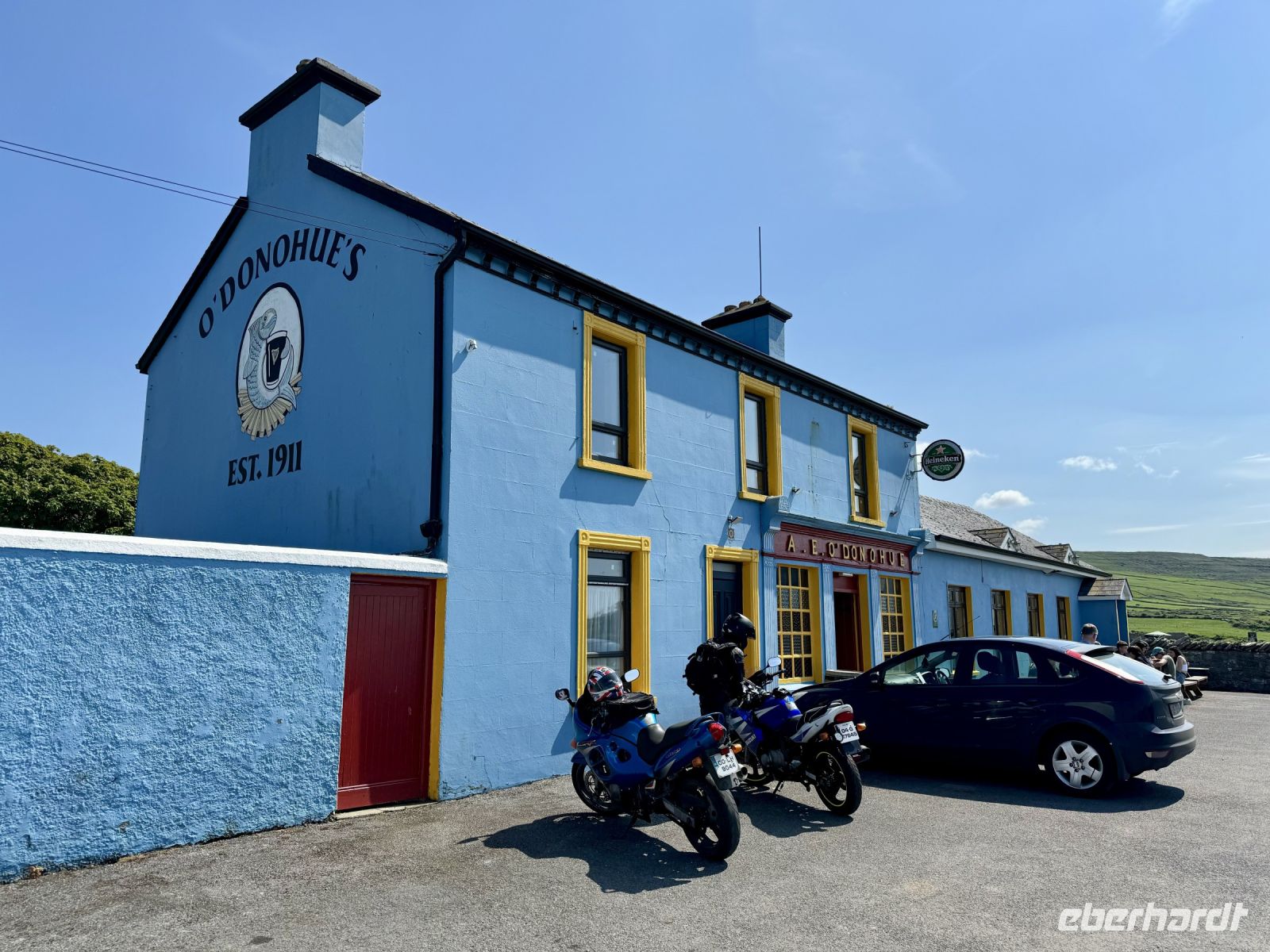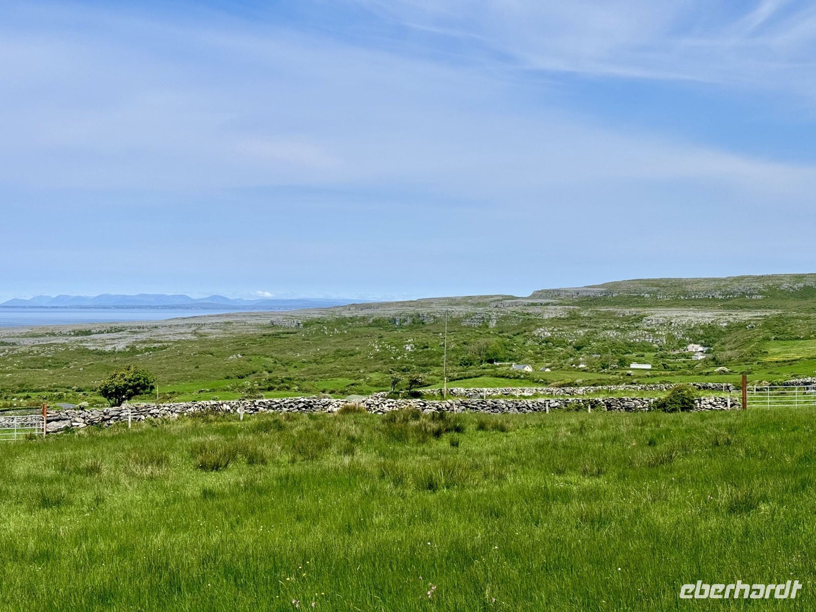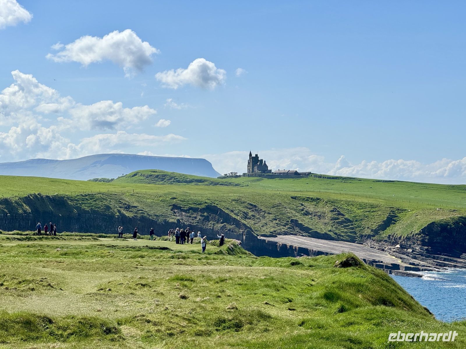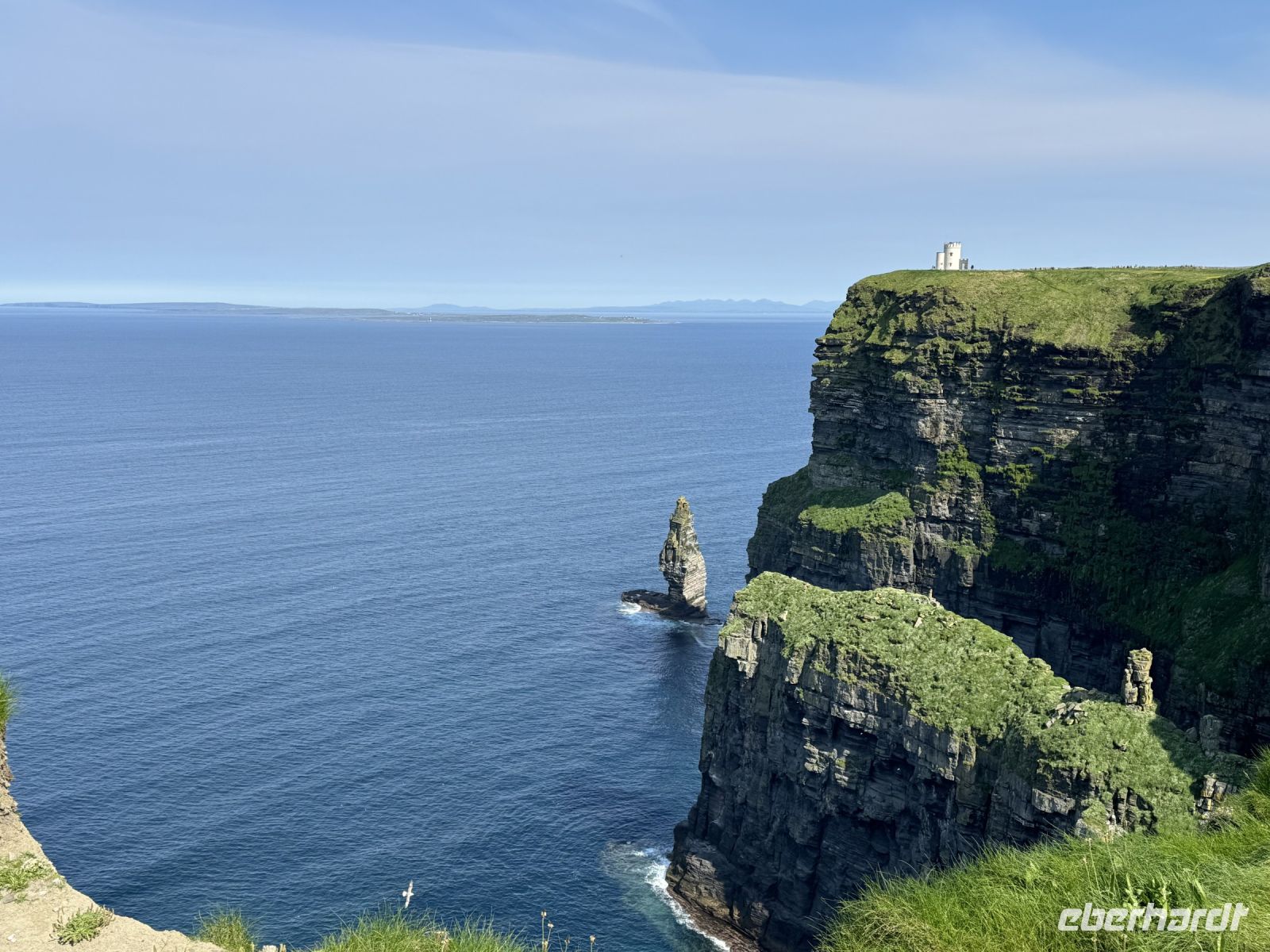 Als ich am Morgen die Vorhänge zurückziehe, werde ich von der Sonne regelrecht geblendet. Es verspricht ein schöner Tag zu werden! Gefahren werden wir heute von Tom, denn Donal muss einen Tag Pause machen, begleitet uns jedoch trotzdem in den Burren. Nach einem kurzen Einkaufsstopp am Supermarkt fährt uns Tom zunächst zur Kilmacduagh Abbey, einer Klosterruine, zu der auch der „Schiefe Turm“ von Irland gehört. Zum Glück weit weniger überlaufen als sein Pendant in Pisa: Wir sind die einzigen Besucher. Für die weltberühmten Cliffs of Moher trifft dies hingegen nicht mehr zu. Da wir mit Tom einen guten Chauffeur erwischt haben, erreichen wir die Klippen nach einer kleinen Rundfahrt durch den östlichen Teil des Burren früher als geplant, sodass es noch nicht allzu voll ist. Das Wetter ist ein Traum. Ich muss meinen Gästen sogar gestehen, dass ich noch nie so perfekte Bedingungen hatte wie heute. Ein guter Tag, um neue Katalogfotos zu machen. Wir können auch sehr schön die Aran Islands am Horizont erkennen. Sie begleiten uns auf unserer anschließenden Wanderung auf dem Burren Way stets auf unserer linken Seite. Die Wanderung wird auch durch die vielen Tierbegegnungen unterwegs bereichert: Wir hören einen Kuckuck, sehen eine Stute mit ihrem noch ganz jungen Fohlen sowie viele kräftige, wohlgenährte Kühe samt kleinen Kälbern. Am Ende der Strecke wartet der Pub in Fanore auf uns. Fish & Chips und Irish Coffee habe ich meinen Gästen groß angepriesen; nun will das Versprechen eingelöst werden. Zum Glück können Essen und Getränke auch diesmal überzeugen. Entlang der Küste begeben wir uns auf den Rückweg nach Gort und sehen dabei nochmals sehr deutlich die Steinwüsten des Burren. Auch heute gibt es mit einem Besuch der Hazel Mountain Chocolate Factory inklusive eines kleinen Vortrags eine Überraschung für meine Gäste. Natürlich können wir die leckere Schokolade auch probieren. Nur den riesengroßen Schokoblock muss ich leider wieder abgeben … Tom fährt uns zurück zum Hotel und ist sicher auch ein bisschen erleichtert, dass er die engen Straßen samt Gegenverkehr nun hinter sich gebracht hat. Insgesamt war es ein weiterer wunderschöner Tag in Irland — und auch für morgen ist wieder sonnig-warmes Wetter angesagt.