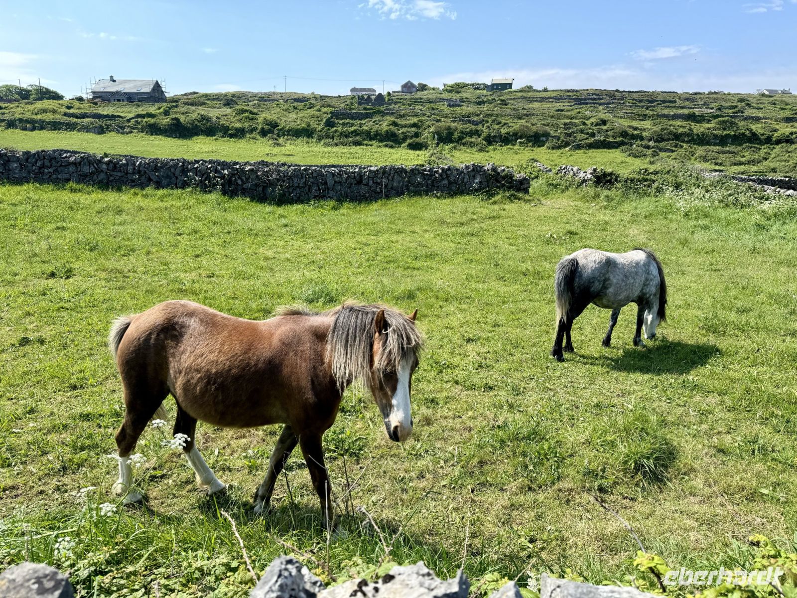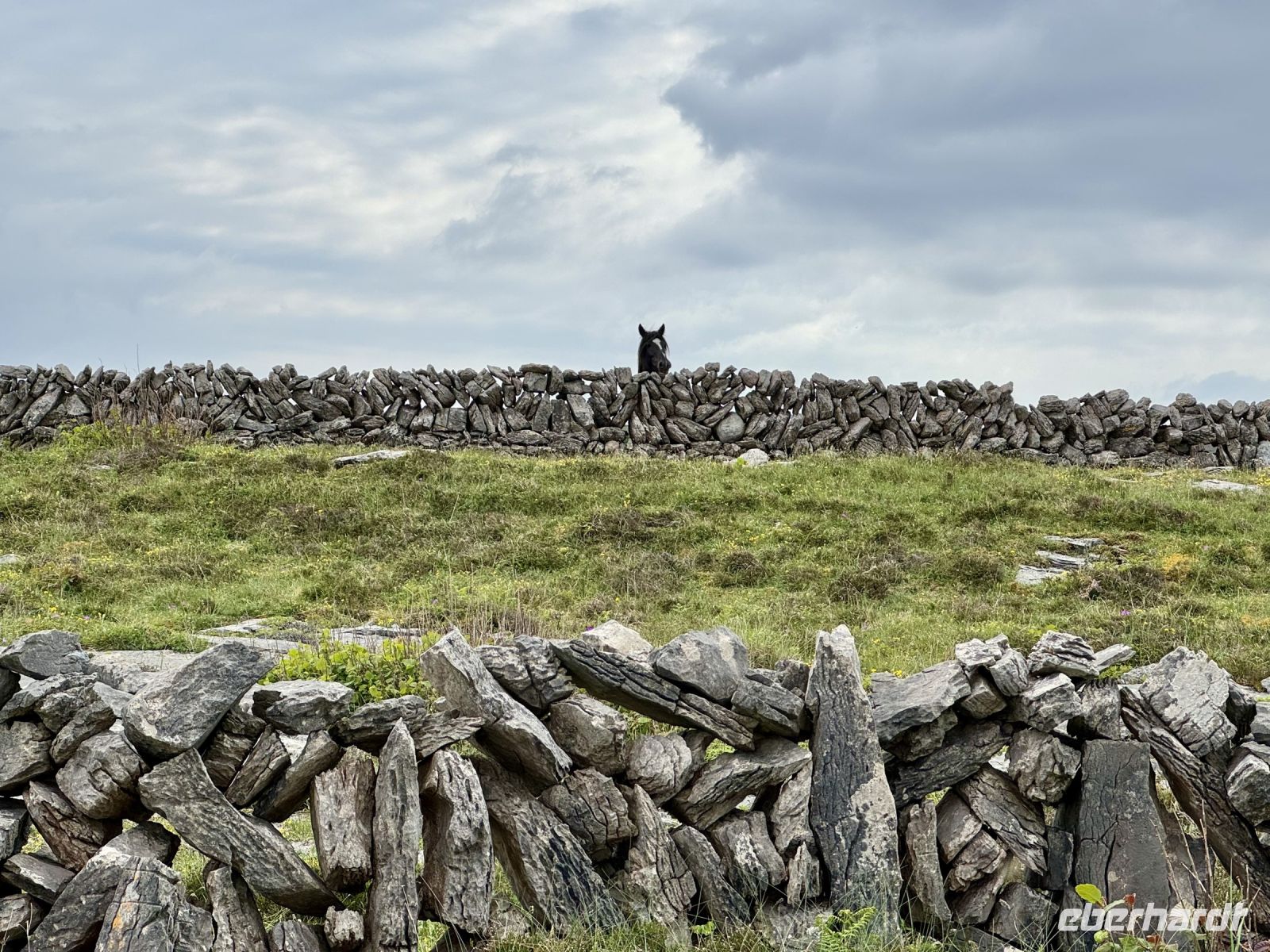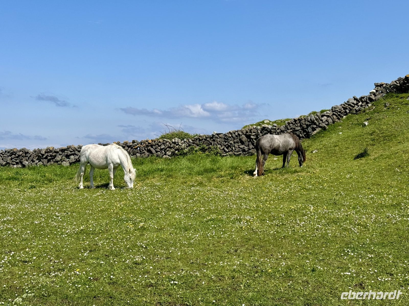 Als wir am Morgen zu unserem Tagesausflug auf die Aran Islands aufbrechen, hängen Wolken im Killary Harbour und es regnet leicht. Normalzustand im Fjord, der als regenreichste Gegend Irlands gilt. Viel mehr beunruhigen mich die angekündigten Windböen bis zum Mittag, vor allem hinsichtlich unserer Überfahrt mit der Fähre. Es bliebt jedoch sehr ruhig und wir kommen wohlbehalten und gut gelaunt auf der größten Insel Inishmor an. Wir beginnen auch gleich mit unserer Wanderung auf der Küstenstraße, immer entlang der Trockensteinmauern. Noch weht ein kräftiges Lüftchen; im Tagesverlauf nimmt der Wind aber immer weiter ab. Sonne und Wolken wechseln sich munter ab, weshalb wir ebenfalls munter wechseln zwischen Jacke, keine Jacke, Sonnenbrille, keine Sonnenbrille. Die vielen Wiesen, die in voller Blüte stehen, erfreuen unser Herz, ebenso die vielen Tierbegegnungen mit Pferden und Kühen, darunter auch jungen Kälbern. Und plötzlich ragt da eine Kegelrobbe aus dem Wasser, räkelt sich auf einem Felsen hin und her, ein bisschen wie beim Yoga-Unterricht. Wir haben also die Robbenkolonie und damit den Platz für unsere Mittagspause erreicht. Die Sandwiches und das gestern gekaufte Obst werden ausgepackt. Ab und zu schaut neugierig ein weiterer Robbenkopf aus dem Wasser. Das steigt derweil immer weiter an — die Flut kehrt zurück — und auch unsere Yoga-Robbe wird gezwungen, ihren Platz zu räumen und abzutauchen. Für uns das Zeichen, wieder aufzubrechen. Bis zum Steinfort Dun Aengus liegen noch ein paar Kilometer vor uns. Wir verlassen alsbald die Küstenstraße und weichen auf den Pfad aus, der parallel dazu etwas oberhalb verläuft. Neugierig guckt ein Pferdekopf über die Mauer und begutachtet die Neuankömmlinge. Woher mögen diese Wandersleute stammen? Und haben sie vielleicht Futter für mich dabei? Eine Doppelreihe Trockensteinmauer verhindert allerdings ein näheres Kennenlernen und wir ziehen in Richtung Steinfort weiter, kommen am schönen Inselstrand vorbei (niemand ist heute allerdings „mad enough to go in“), erreichen dann schließlich die rettende Eisdiele und das Café. Halt, es fehlt noch der letzte Aufstieg nach Dun Aengus, das hoch oben auf den Klippen thront. Doch auch das letzte Wegstück schaffen wir mit Bravour! Steil geht es nach unten am Rand der Klippen. Wir wahren lieber einen entsprechenden Sicherheitsabstand, denn kein Zaun, keine Mauer verhindert hier den möglichen Sturz in die Tiefe. Eine französische Schulklasse strömt aus der inneren Einfriedung heraus, wir danach hinein und dann haben wir das Innere der uralten Festung fast für uns. Das Café am kleinen Inselmarktplatz stellt sich nach dem Abstieg schnell als favorisierter Anlaufpunkt für die ganze Gruppe heraus. Zu gut klingt jetzt ein Cappuccino, vielleicht gepaart mit einem riesigen Stück Kuchen? Bloß nicht zu viel essen, denn schließlich wartet im Leenane Hotel noch einmal ein sehr leckeres Abendmenü mit großen Portionen auf uns. Der Insulaner Owen fährt uns mit seinem Shuttlebus zurück zum Hafen von Kilronan und sorgt mit seinem Streckenkommentar für heiteres Gelächter. Nachdem wir den Financial District der Aran Islands durchquert haben (die einzige Bank), steigen wir in der „Metropolis“ aus. „Until next year!“, werden wir verabschiedet. Warum eigentlich nicht? Mit der Fähre geht es zurück nach Rossaveal. Donal holt unseren Bus vom Parkplatz ab und fährt uns in rund 45 Minuten zurück zum Leenane Hotel. Wir tauchen derweil in die keltische Sagenwelt ab und gelangen dabei in das Reich der Elfen und Feen …