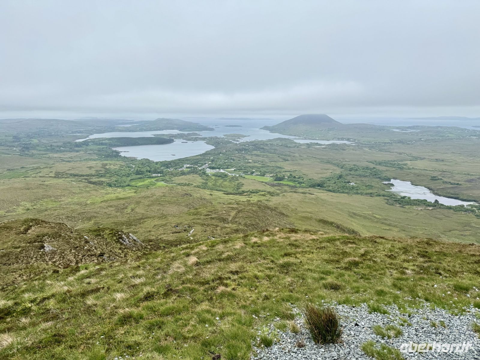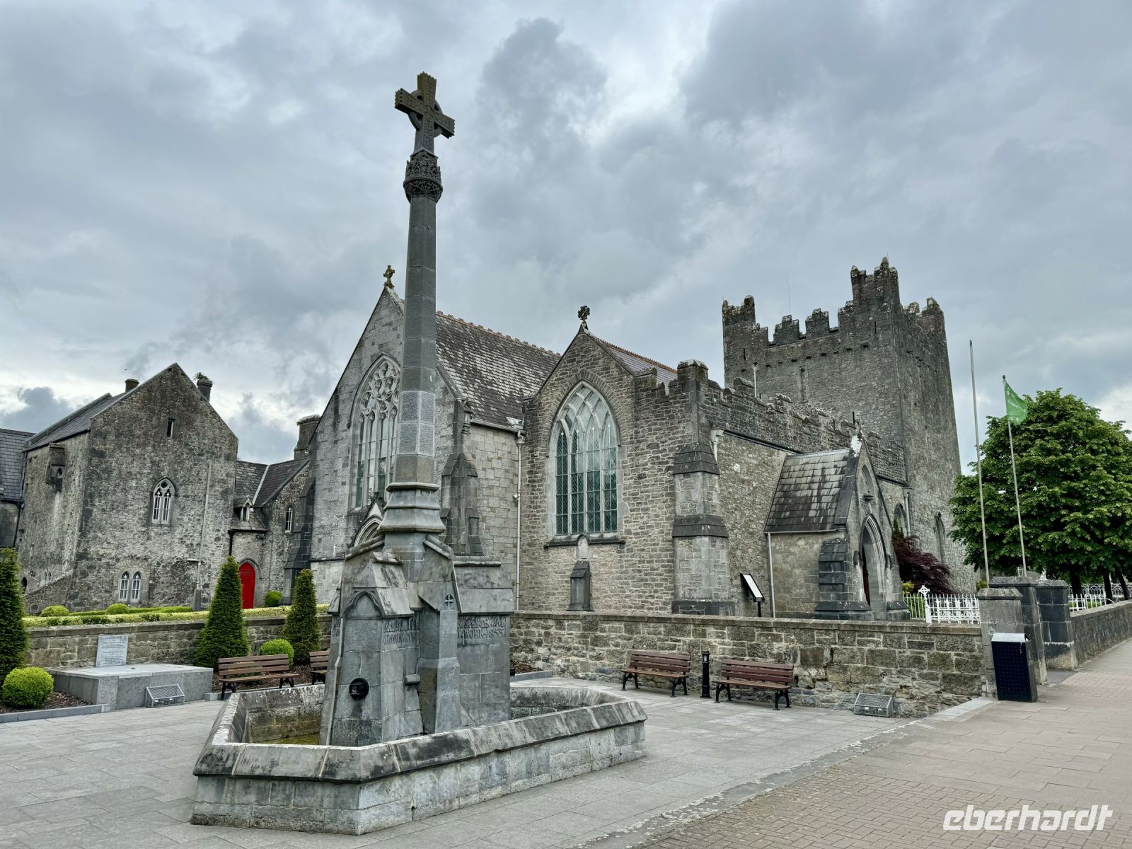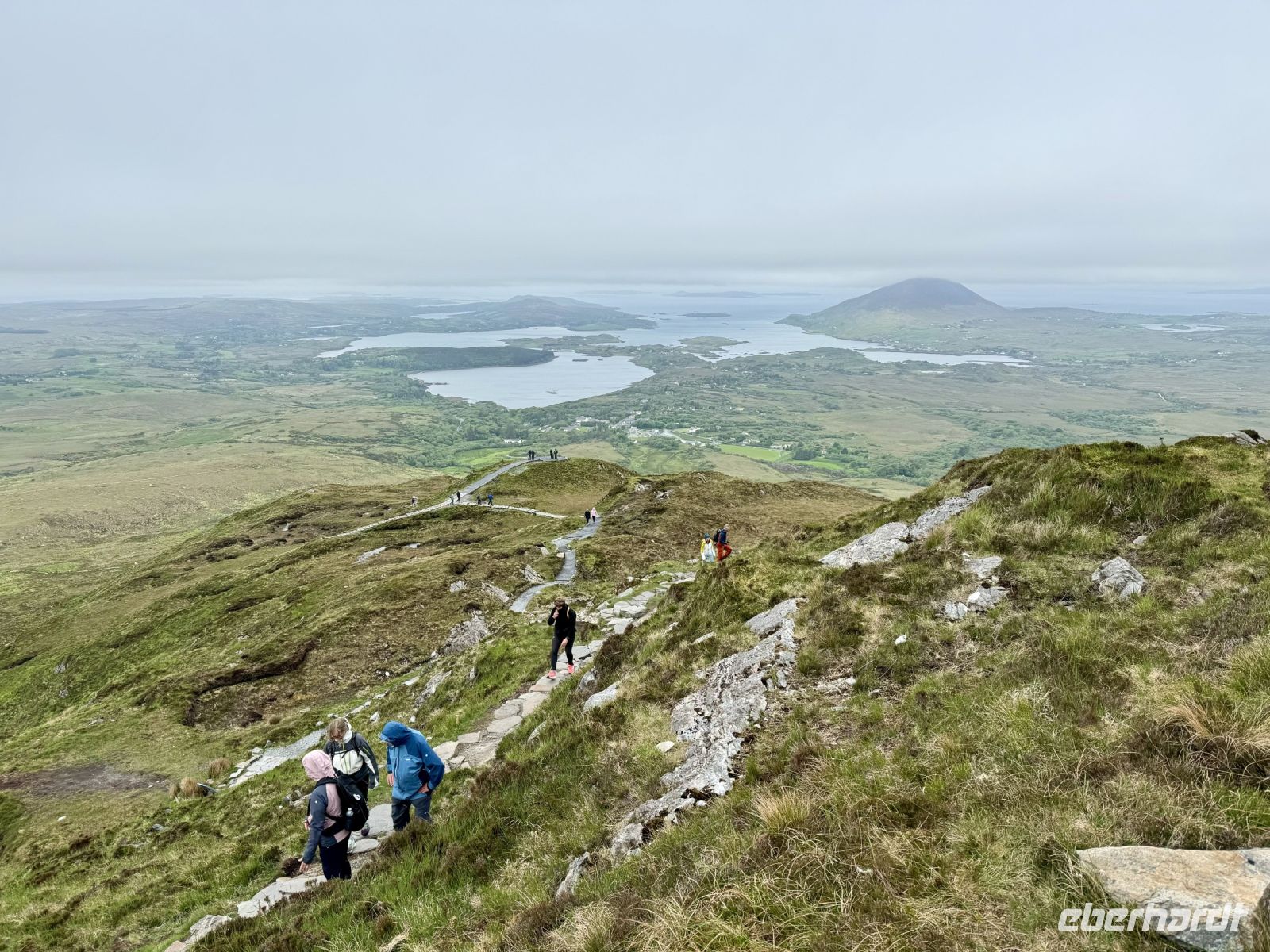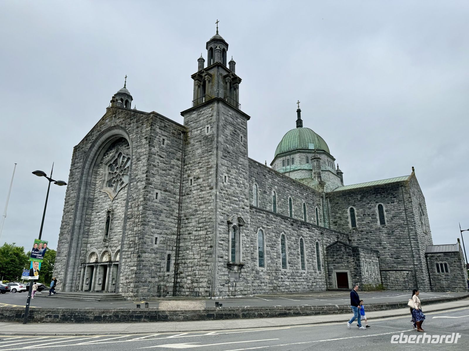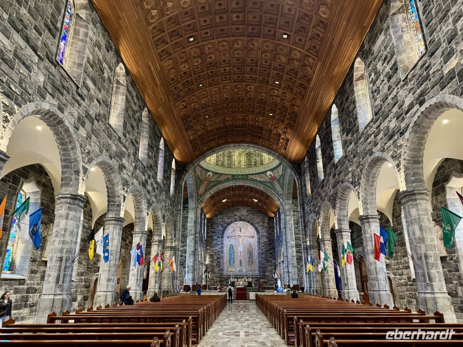 Koffer haben wir eingepackt, Schlüssel abgegeben … nur den Koch haben wir wieder vergessen! Dabei wollten wir ihn doch für den Rest der Reise mitnehmen! So bleibt uns nur die Erinnerung an unsere Festmahle im Leenane Hotel. Eine schöne Erinnerung sollen die beiden Fotostopps werden, die ich am Morgen geplant habe. Eigentlich dachte ich, dass meine Gäste ganz begeistert sind von den blühenden Rhododendrensträuchern beim Aussichtspunkt am Killary Harbour. Doch die Aufmerksamkeit richtet sich schnell auf die Schafe und Lämmer auf der anderen Straßenseite. Auch am Rosroe Pier hören wir das Blöken der Schafe und Lämmer um uns herum, als wir ein Stück den Hügel hinaufsteigen, um noch einmal eine gute Sicht über den Fjord und seine Mündung in den Atlantik zu bekommen. Der Wind tost uns derweil vom Atlantik kommend heftig um die Ohren. Auf dem Weg hierher haben wir im Vorbeifahren die „heilige Dreifaltigkeit“ der Fotomotive gesehen: blühender Rhododendron, blühender Ginster und flauschige Schwarzkopfschafe. Also legen wir auf dem Rückweg auch hier einen kleinen zusätzlichen Fotostopp ein, bevor wir zu unserer Wanderung im Connemara-Nationalpark weiterfahren. Vielleicht haben wir die richtigen Töne getroffen, vielleicht riechen wir einfach sehr lecker … wie auch immer, die Schafe samt Lämmchen kommen jedenfalls ganz dicht an den Zaun heran und nehmen uns in Augenschein. Hätten sie ein Handy, hätten sie wahrscheinlich auch von uns ein Foto gemacht. Reiseleiter Andreas erklärt das Thema „Schafe“ nun vorerst für abgearbeitet, denn schließlich haben wir heute noch ein herausforderndes Programm zu absolvieren. Das Wetter ist (noch) nicht perfekt, aber gut genug (trocken, kein Regen), um den Aufstieg auf den Diamond Hill zu wagen, zumal er weitestgehend auf der windabgewandten Seite erfolgt. Der Großteil meiner Gäste kommt mit hinauf, teils aus sportlichem Ehrgeiz, teils als persönliche Herausforderung, jede/r in ihrem/seinem eigenen Tempo. Der Gipfelgrat hängt dann leider noch in den Wolken — auch mal ein Erlebnis! Auf dem Abstieg erhaschen wir dann doch einen Blick auf die Kylemore Abbey unten im Tal und kriegen somit das ersehnte Fotomotiv vor die Linse. Am Bus warte ich dann mit einer Flasche Irish Mist auf meine Gäste, denn jetzt können wir im doppelten Sinne unser Bergfest feiern! Bis zur Kylemore Abbey mit ihrem rekonstruierten Walled Garten ist es nur eine kurze Fahrt von wenigen Minuten. Nun kommt auch die Sonne raus, wodurch Herrenhaus und See im Glanz erstrahlen und noch viel schöner aussehen. Meine Gäste können die weitläufige Parklandschaft auf eigene Faust erkunden, bevor wir meine Lieblingsregion Connemara leider verlassen und nach Gort weiterziehen müssen. In Galway machen wir unterwegs einen Stopp an der Sankt-Nikolaus-Kathedrale und bewundern den Connemara-Marmor und die prunkvolle Deckenvertäfelung.