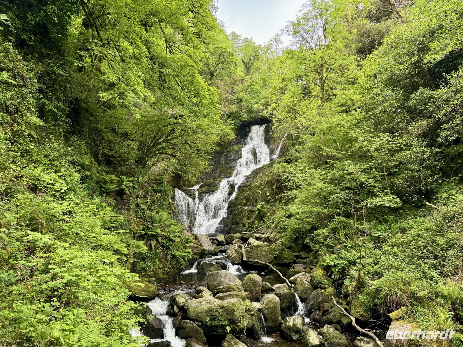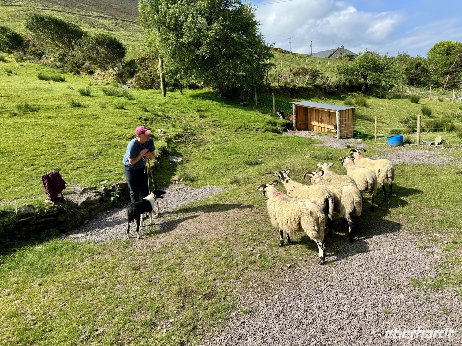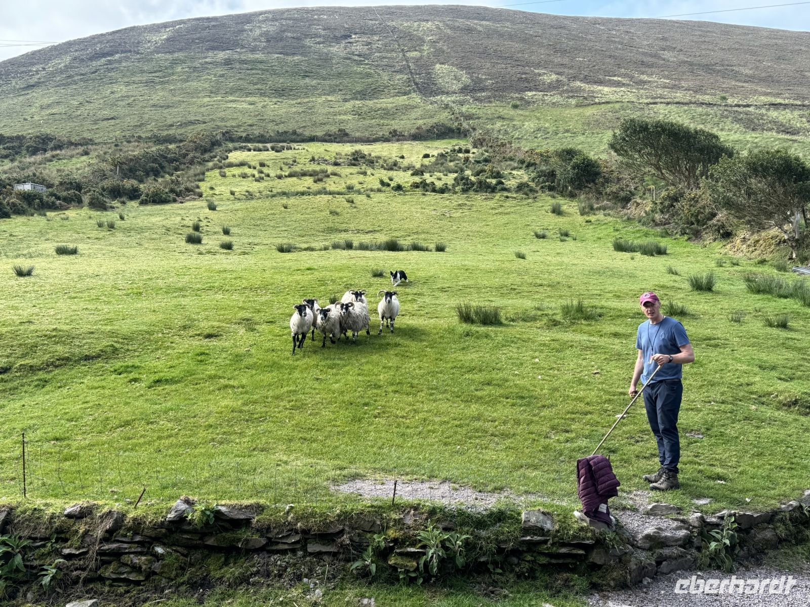 Ja, es hat ihnen gestern Abend bei Celtic Steps gefallen, sehr gut sogar! Da bin ich wieder einmal beruhigt und freue mich nun auf Waterville, den Coomakista Pass und den Killarney-Nationalpark. Sehr viele Reisegruppen besuchen den Ring of Kerry, aber wir machen ihn ein wenig anders, nämlich mit mehr Bewegung! Bewegung ist auch das perfekte Stichwort für die Border Collies von Schäfer Tom in Kells, den wir als Erstes besuchen. Wenn wir Menschen auch alle so motiviert in den Tag starten würden … Die Hunde sorgen dafür, dass auch die Schafe ihren Frühsport bekommen — und wir einen Einblick in die Arbeit eines Schäfers draußen auf der Weide. Am Steinfort Cahergall hinter Cahersiveen können wir auf den Mauern herumklettern und richtig schöne Irlandfotos mit Schafen, Kühen und toller Landschaft machen. Für die Mittagspause finden wir uns in Waterville ein, dem Lieblingsferienort von Charlie Chaplin an der wunderschönen Ballinskellig Bay. Im Supermarkt können wir uns frisch belegte Baguettes und Sandwiches kaufen und diese an der Uferpromenade mit Blick auf den Atlantik verzehren. Nun beginnt der für mich schönste Abschnitt auf dem Ring of Kerry. Beim Fotostopp am Coomakista Pass kommen wir dank des wieder einmal perfekten Wetters in den Genuss einer spektakulären Aussicht. Und wir können eine zusätzliche Wanderung hinunter zum Derrynane Beach absolvieren, vielleicht sogar die schönste Wanderung auf dieser Reise. Dafür sorgen der wilde Rhododendron in seiner ganzen Blütenpracht, das herrliche Wasser und die Aussicht auf die Skellig Islands. Wir sind ganz glücklich und von der Landschaft gebannt, da springt plötzlich Donal aus dem Gebüsch, der uns vom Busparkplatz am Derrynane House aus entgegengelaufen ist. Gemeinsam bewältigen wir auch die letzte Etappe und können am Strand die Füße ins Wasser tauchen und/oder uns mit einem Eis belohnen. Doch unser Tagesprogramm ist damit noch nicht vorbei! Mit einem Fotostopp am Ladies’ View läuten wir unseren Besuch im Killarney-Nationalpark ein. Zufällig habe ich noch die halb volle Flasche Irish Mist dabei und wir können auf den ereignisreichen Tag anstoßen. Nun wartet noch ein kleiner Spaziergang vom Torc Waterfall zum Muckross House auf meine Gäste, bei dem wir auch den Muckross Lake und den prächtigen Garten des herrschaftlichen Anwesens mit seinen riesigen Rhododendren streifen. Ungefähr 40 Minuten dauert die Rückfahrt bis nach Tralee. Schnell umgezogen und zum Abendessen ins Restaurant, denn wir wollen das zweite Festmahl im Grand Hotel auf keinen Fall verpassen!