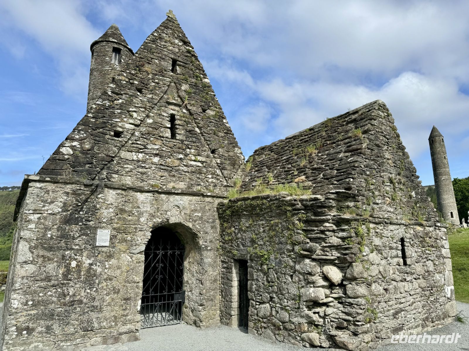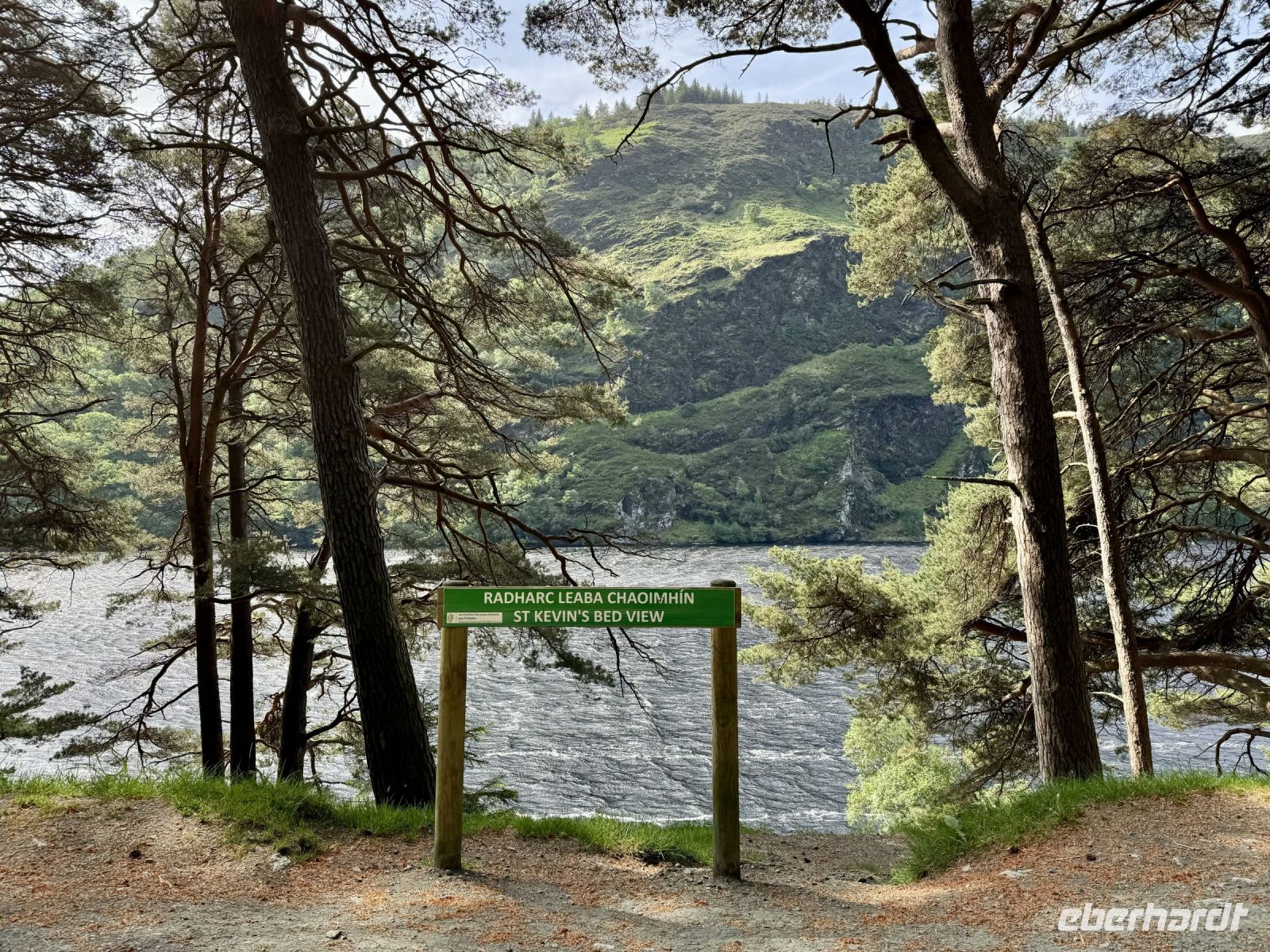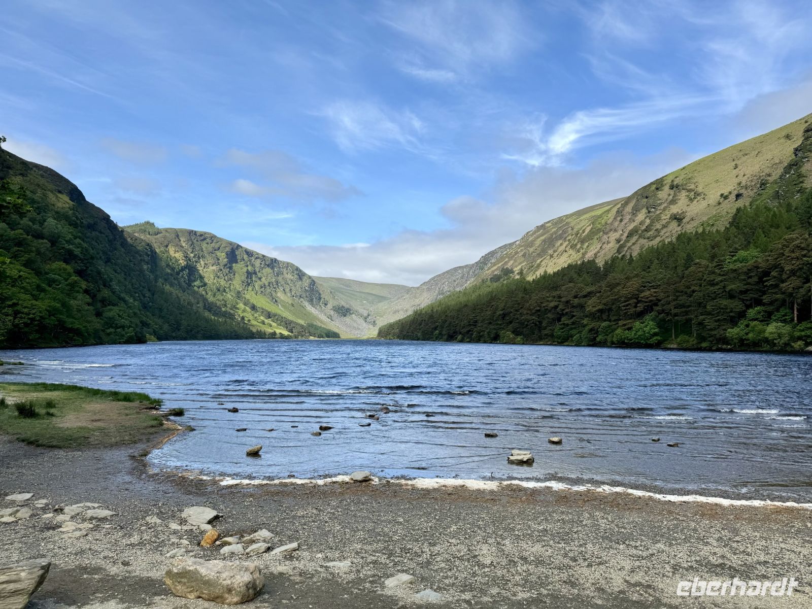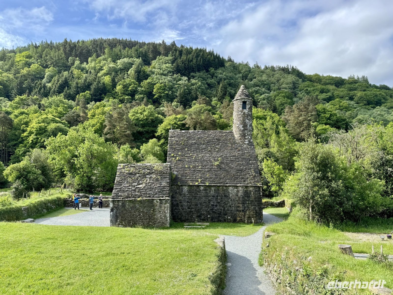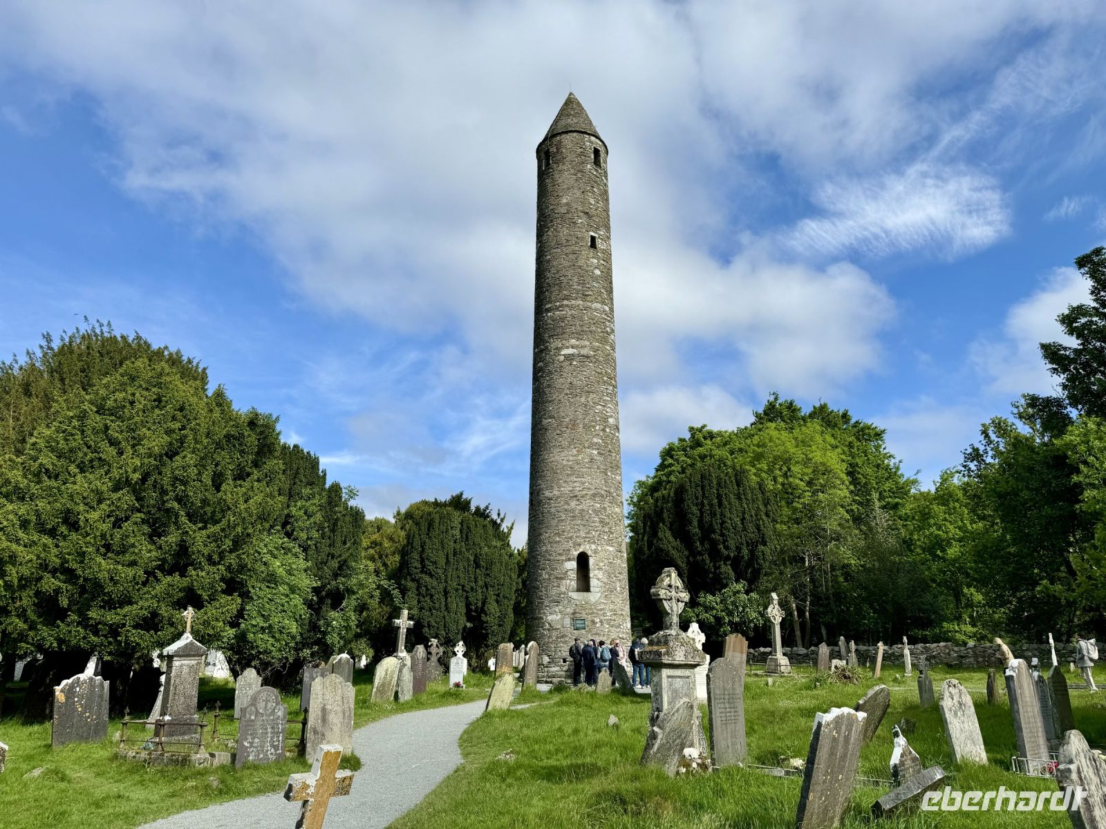 Auch heute ist das Wetter wieder besser als vorhergesagt und erwartet. Warum schaue ich überhaupt noch auf den Wetterbericht? Nur der angekündigte kräftige Wind bewahrheitet sich, vor allem bei unserer letzten Wanderung in Glendalough zum Miners’ Village, den Ruinen einer Bleimine aus dem 19. Jahrhundert. Doch zuerst erkunden wir die Ruinen der Klostersiedlung in Glendalough mit Rundturm, Kathedrale und „St Kevin’s Kitchen“. Zum Test der guten Akustik in der kleinen Kirche stimmen zwei Gäste sogar ein Lied an. Toll! Wir wandern durch den Wald und an zwei noch schlafenden Entlein vorbei bis zum Ufer des Upper Lake, wo Reiseleiter Andreas zur Veranschaulichung den Heiligen Kevin imitiert, seine Arme ausbreitet … aber dann lieber doch nicht so lange stehen bleibt, bis die Vögel auf ihm Nester bauen. Da würde er ja vielleicht die Whiskey-Verkostung am Nachmittag verpassen! Der letzte kurze Abschnitt zwischen Wald und den Ruinen des Miners’ Village wird eine stürmische Angelegenheit. Wir kämpfen uns tapfer gegen den Wind voran, der von den Berghängen hinunterweht, und erreichen schließlich unser Ziel. Auf dem Rückweg hingegen treibt uns der Wind voran, immer dem Besucherzentrum entgegen. Die Filmvorführung, die uns dort erwartet, bildet gleichermaßen den Abschluss unseres Besuchs in Glendalough wie auch eine sehr schöne und stimmungsvolle Zusammenfassung unserer Rundreise. Im Powerscourt House wird gerade für einen Netflix-Film gedreht — na da sind wir ja mal gespannt! Unser Besuch der wunderschönen und weitläufigen Gartenanlage wird dadurch aber nicht beeinträchtigt. Es gibt einen Italienischen Garten, einen Japanischen Garten, leckeren Kuchen in der Cafeteria … Oh, da bin ich gerade abgeschweift! Aber wir brauchen ja auch eine Grundlage für die Whiskey-Verkostung, oder? Nun habe ich sie schon zwei Mal erwähnt, und nach fast 12 Tagen langen Wartens und der informativen, kurzweiligen Führung durch die Produktions- und Lagerhallen der Powerscourt Distillery ist es schließlich so weit: Wir dürfen im hübsch gestalteten Verkostungsraum in bequemen Sesseln Platz nehmen, vor uns drei Gläser mit Variationen des irischen Lebenswassers. Unsere Geruchs- und Geschmackssinne werden nun auf die Probe gestellt: Vanille sollen wir riechen, evtl. Honig, Apfel, Birne, dann dunkle Schokolade … Jede/r hat am Ende ihren/seinen Favoriten. Über Geschmack lässt sich nicht streiten. Heiter verstreicht die Rückfahrt mit Gesangseinlagen, Limericks und lieben Dankesworten. Nun ist es wirklich unser letztes gemeinsames Abendessen, zu dem wir uns später einfinden. Die Bordkarten sind ausgedruckt, die Koffer schon fast fertig gepackt. Müssen wir morgen wirklich nach Hause? Urlaub ist jene schöne, erholsame Zeit, die immer viel zu schnell vorbei ist.