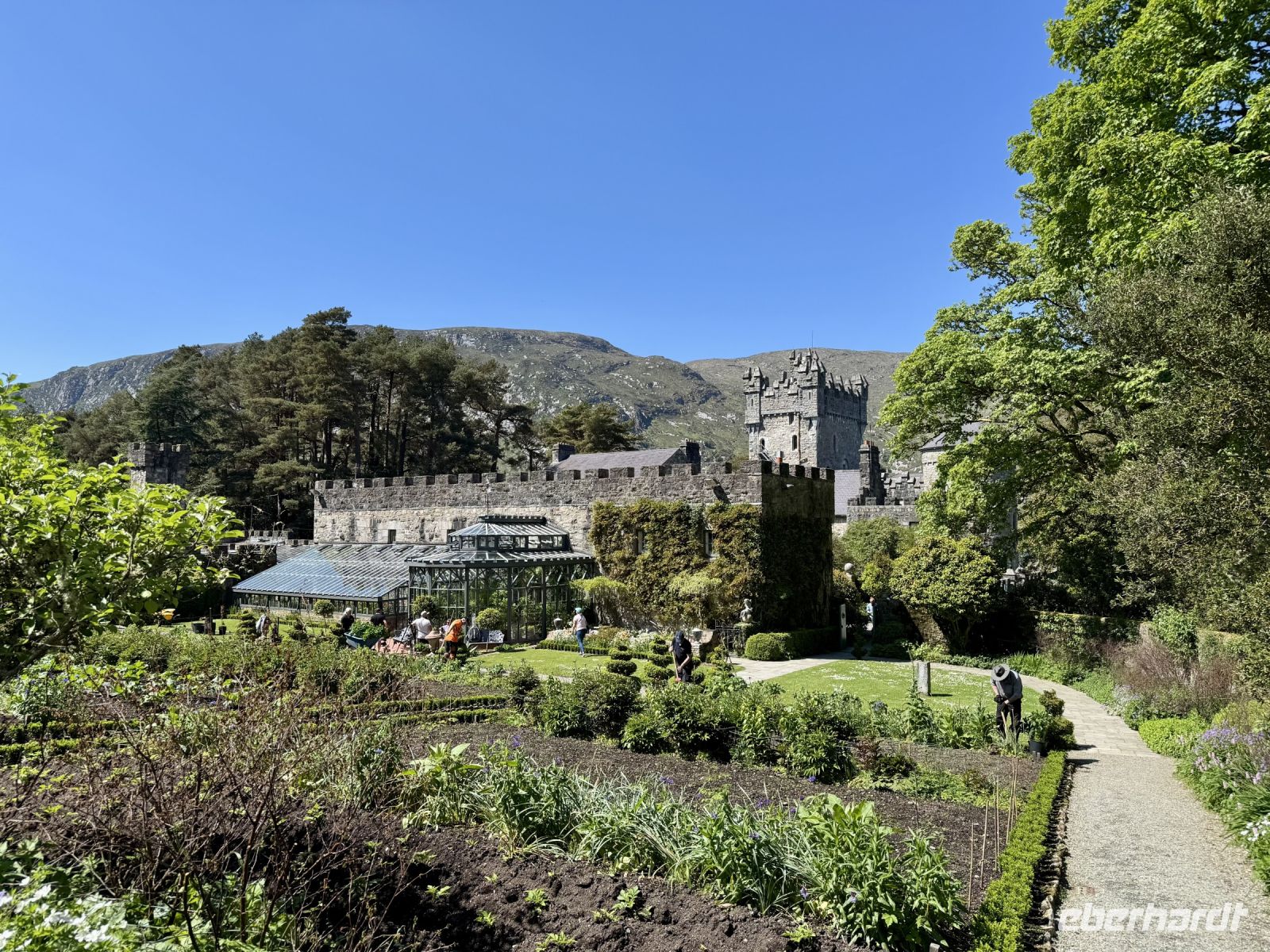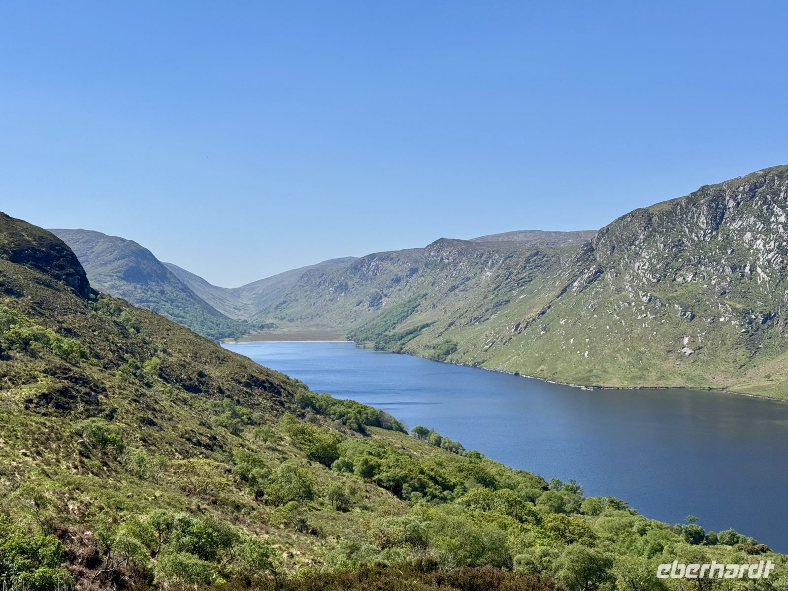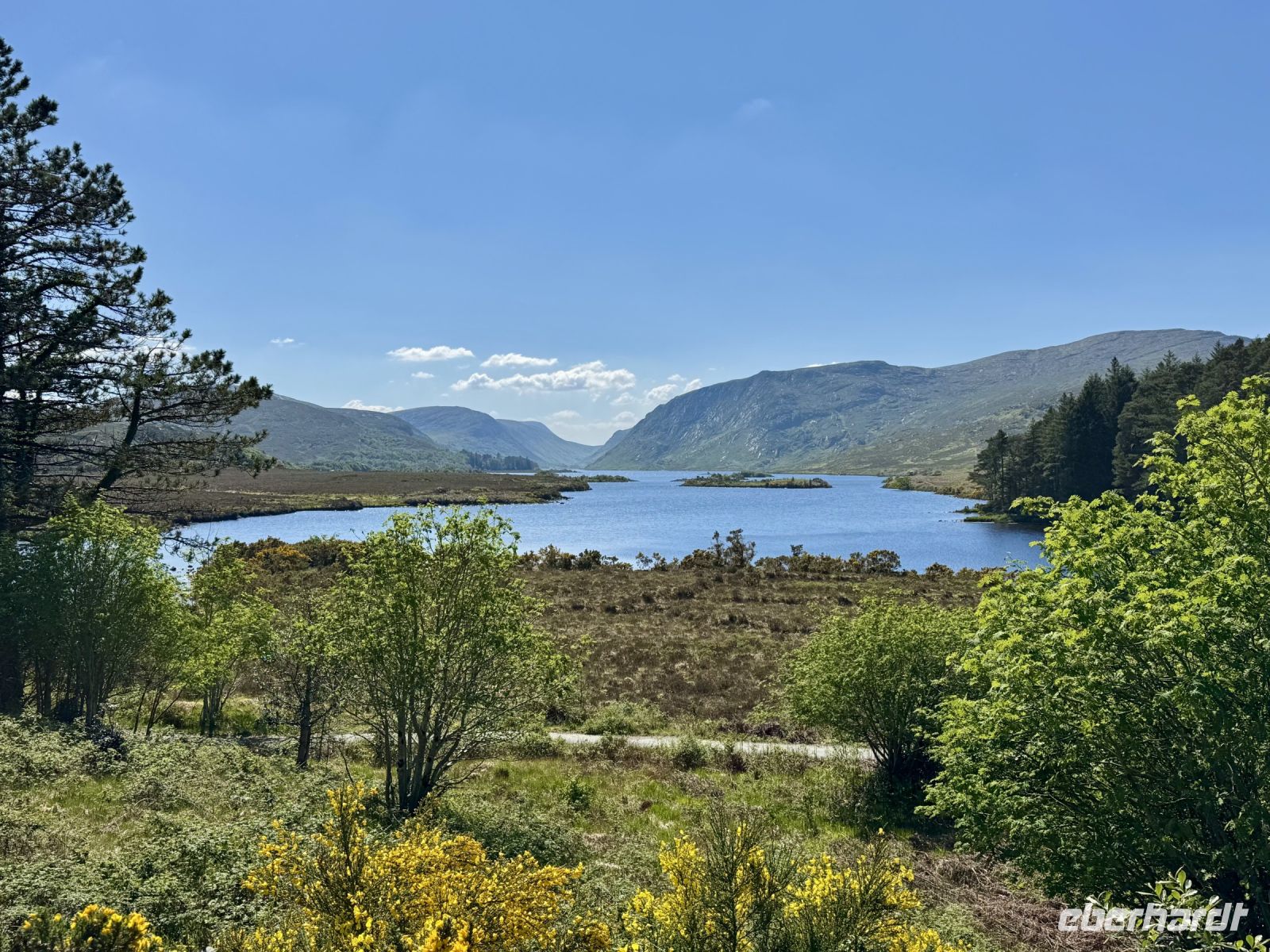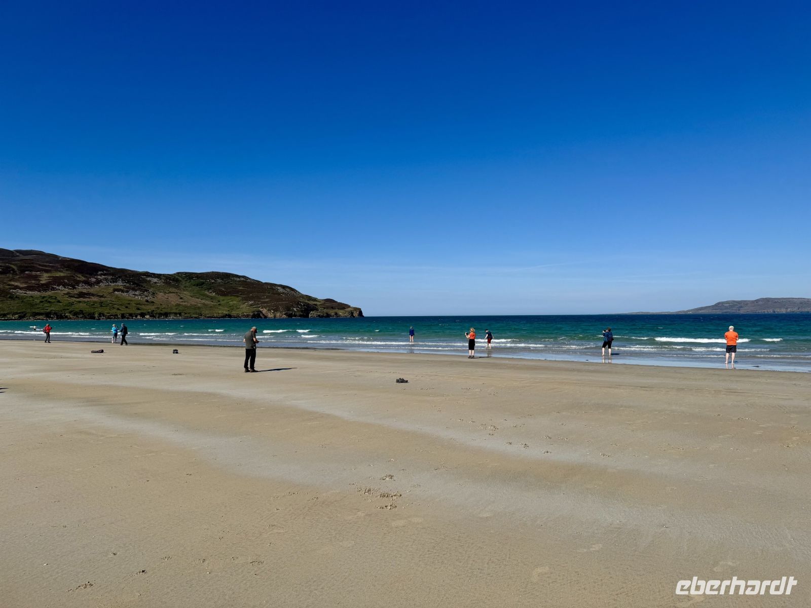 Pünktlich zur ersten Wanderung haben wir perfektes Urlaubswetter. Wobei, eigentlich ist es schon fast zu warm. Wir glauben uns eher in Italien, als wir den Glenveagh-Nationalpark am Morgen bei fast schon 20 Grad und Sonnenschein und wolkenlosem blauen Himmel erreichen. Ein sehr schön gemachter kurzer Film stimmt uns auf unseren Besuch dieses herrlichen Kleinods inmitten der Derryveagh Mountains ein. Mit dem Shuttlebus fahren wir zum Schloss und nehmen die ersten Eindrücke in uns auf. Unsere Wanderung führt uns immer am Lough Veagh entlang durch ein kleines Wäldchen. An der ehemaligen Jagdhütte machen wir eine kurze Pause und genießen die Ruhe und die dramatische Landschaft. Auf dem Parkplatz standen zwar noch andere Busse, doch bis zum Ende des Sees verirren sich nur wenige andere Touristen. Es herrscht eine wohltuende Stille, nur unterbrochen vom Gezwitscher der Vögel. Fast alle kommen mit zum Aussichtspunkt hinauf und werden mit einer tollen Sicht auf Tal und Schloss für den steilen Aufstieg belohnt. Ein perfekter Platz für Erinnerungsfotos. Nun steigen wir hinab in die Gartenanlagen. Über die Italienische Terrasse und den Belgischen Spazierweg gelangen wir in den ummauerten Garten und damit zurück zum Schloss. Einen Tee oder Kaffee in der Teestube und einen kleinen Happen zu essen haben wir uns jetzt redlich verdient. Nach ihrer Freizeit für den Besuch der Parkanlage und des viktorianischen ummauerten Gartens stehen meine Gäste vor der Entscheidung: nochmal vier Kilometer laufen oder doch lieber den Shuttlebus zurück zum Besucherzentrum nehmen? Erfreulich viele meiner Gäste entscheiden sich für den zusätzlichen Spaziergang im Sonnenschein. Im Anschluss an unseren Aufenthalt im Nationalpark unternehmen wir noch eine kleine Rundfahrt durch den nördlichen Teil von Donegal. Bei einem Fotostopp oberhalb eines verwunschenen Tals kommen meine Gäste ins Staunen. Und auch dem Mount Errigal, dem höchsten Berg der Grafschaft, widmen wir einen eigenen Fotostopp. Schließlich präsentiert er sich heute von seiner besten Seite! Überall blüht der Stechginster, kleine Lämmer hüpfen über die Wiese und mit meinem Herzen um die Wette — hach, wie schön ist Irland! Ein Abstecher zum herrlichen Sandstrand von Dunfanaghy rundet unseren traumhaften Tag ab. Die Luft ist wunderbar sauber, das Rauschen der Wellen macht glücklich, die Sandkristalle glitzern in der Sonne. Zum Baden im Nordatlantik ist es jedoch noch etwas frisch. Nur die Füße dürfen rein. Bis Letterkenny fahren wir dann noch eine halbe Stunde und freuen uns schon auf unser zweites Abendessen im Hotel — natürlich mit einer riesengroßen Portion Kartoffelbrei!
