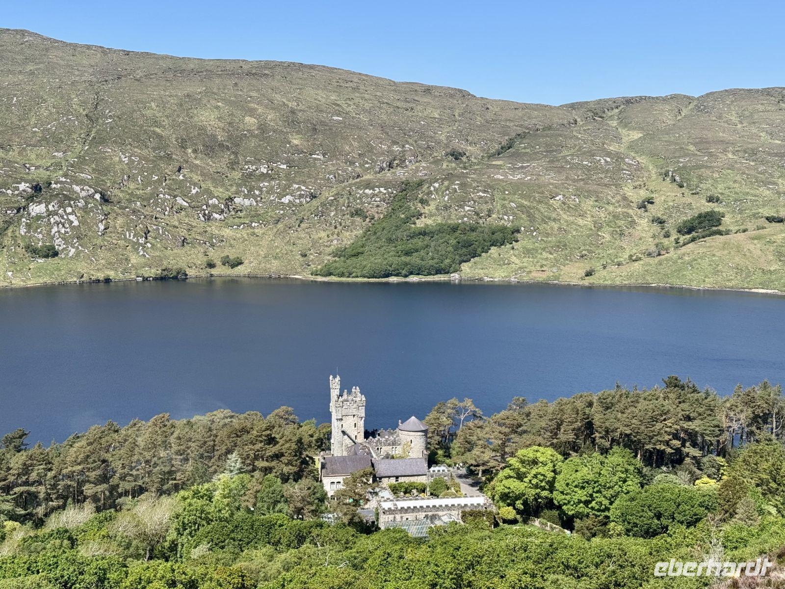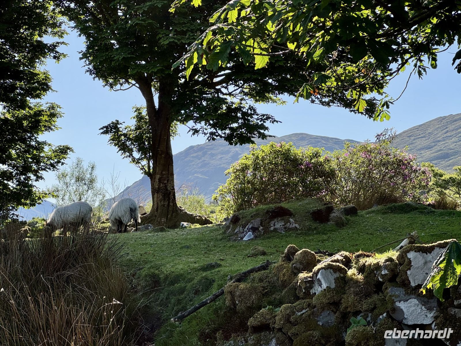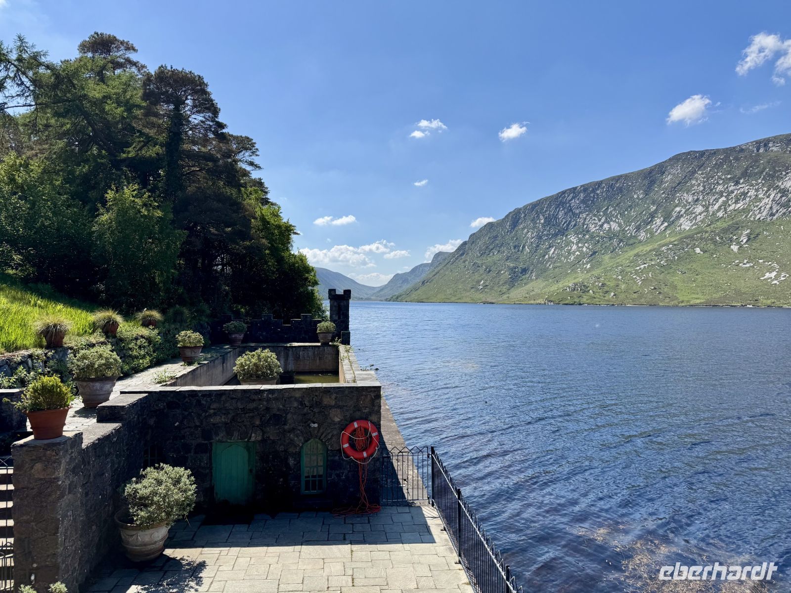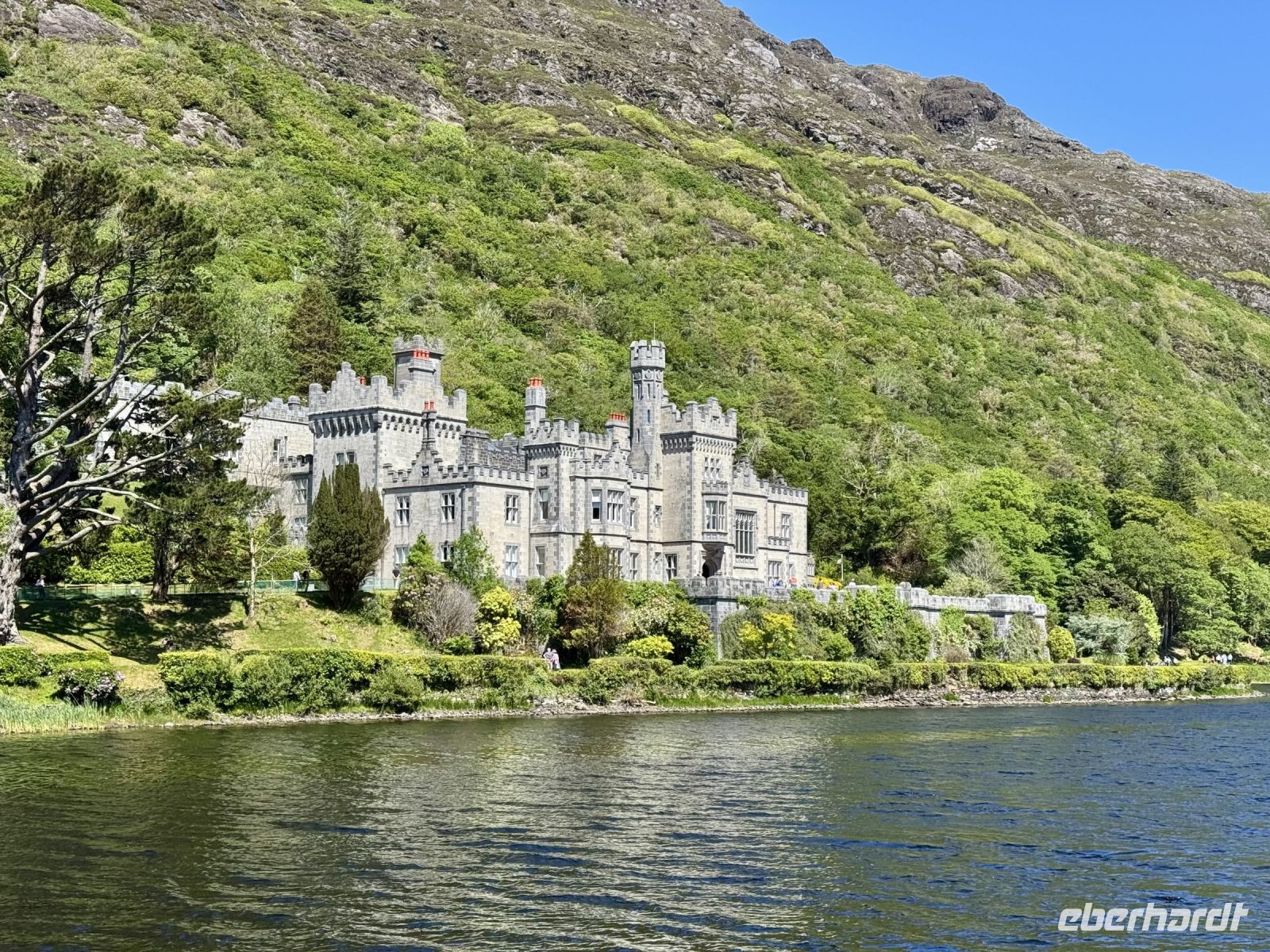 Ein weiterer wunderschöner Morgen am Killary Harbour! Kaum zu glauben, dass Leenaun der regenreichste Ort in Irland sein soll. Die Sonne lässt das Wasser glitzern und die Mweelrea Mountains in den herrlichsten Grüntönen erstrahlen. Nur ungern verlassen wir unser Hotel am Fjord. Unser erster Fotostopp am Killary Harbour lässt den Abschied nur noch schwerer fallen. Wunderschön blüht hier der Rhododendron. In dieser Hinsicht ist der Mai wirklich mein Lieblingsmonat. Beim nächsten Fotostopp am Rosroe Pier wandeln wir auf den Spuren von Ludwig Wittgenstein und genießen die Einsamkeit und Stille zwischen den Bergen, nur unterbrochen vom gelegentlichen Blöken der Schafe. Donal und ich nutzen diese Gruppe als Versuchskaninchen für eine andere Route nach Letterfrack, die entlang der Küste verläuft und sich als überaus reizvoll entpuppt. Die anschließende Wanderung im Connemara-Nationalpark auf den Diamond Hill ist durchaus eine Kraftanstrengung und die schwierigste auf der ganzen Reise, aber jede Mühe wert! Gerade mit dieser glücklichen Sonnenschein-Reisegruppe muss man das schöne Wetter nutzen. Uns erwartet eine fantastische Aussicht auf die Kylemore Abbey und ihre Gärten sowie in Richtung Küste. An schlechtem Wetter ist eine Flasche „Irish Mist“ (irischer Nebel) leider alles, was ich zum anschließenden Bergfest im Bus anbieten kann. Der edle Tropfen scheint zu schmecken, denn es gehen gleich Bestellungen ein. Die historische Kylemore Abbey wurde vor wenigen Jahren restauriert und erstrahlt in neuem Glanz. Auch die neue Abtei ist inzwischen fertig. Es scheint den Nonnen an diesem paradiesischen Fleckchen Erde ganz gut zu gehen. Mir selbst würde ja das Gärtnerhäuschen im Walled Garden völlig reichen. Ein Fotostopp im Inagh Valley bildet den Abschluss unseres Aufenthalts im wunderschönen Connemara. Durch Galway — mit einer Pause an der Sankt-Nikolaus-Kathedrale — fahren wir zu unserem nächsten Hotel in Ennis, das als Ausgangspunkt für unsere Erkundung des Burren dienen soll.
