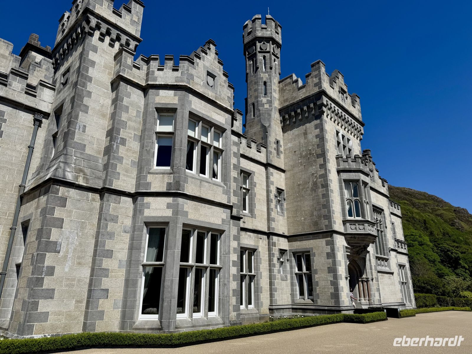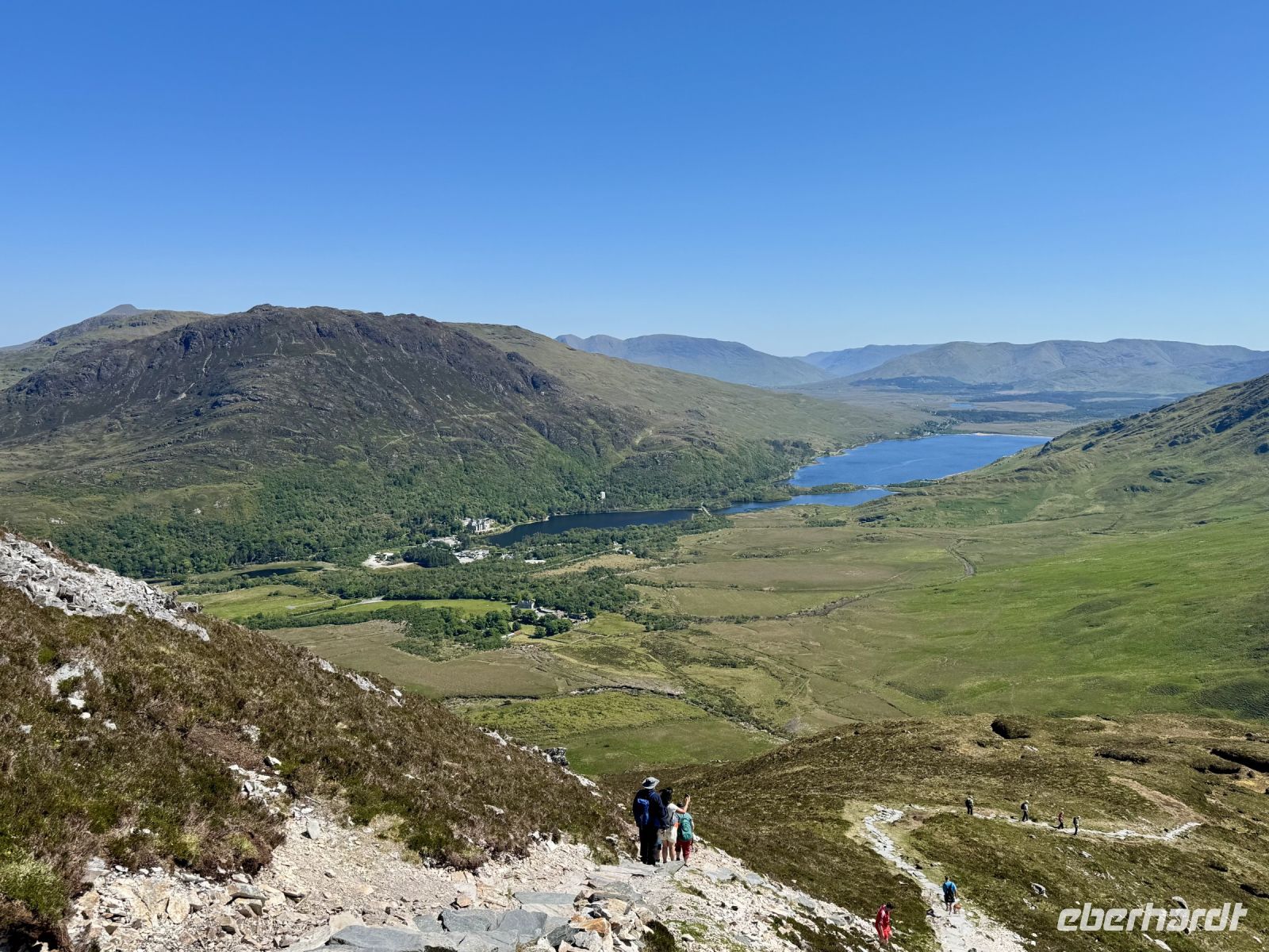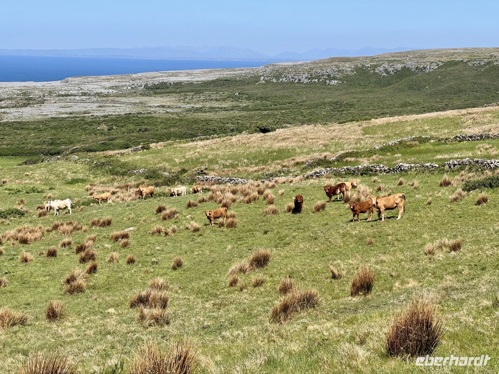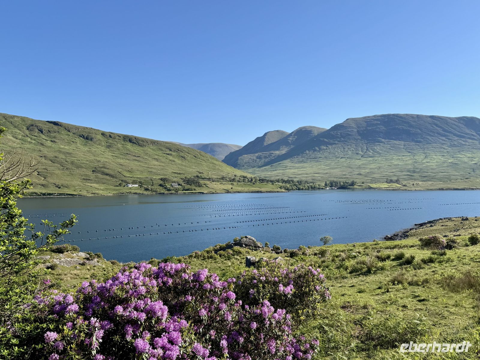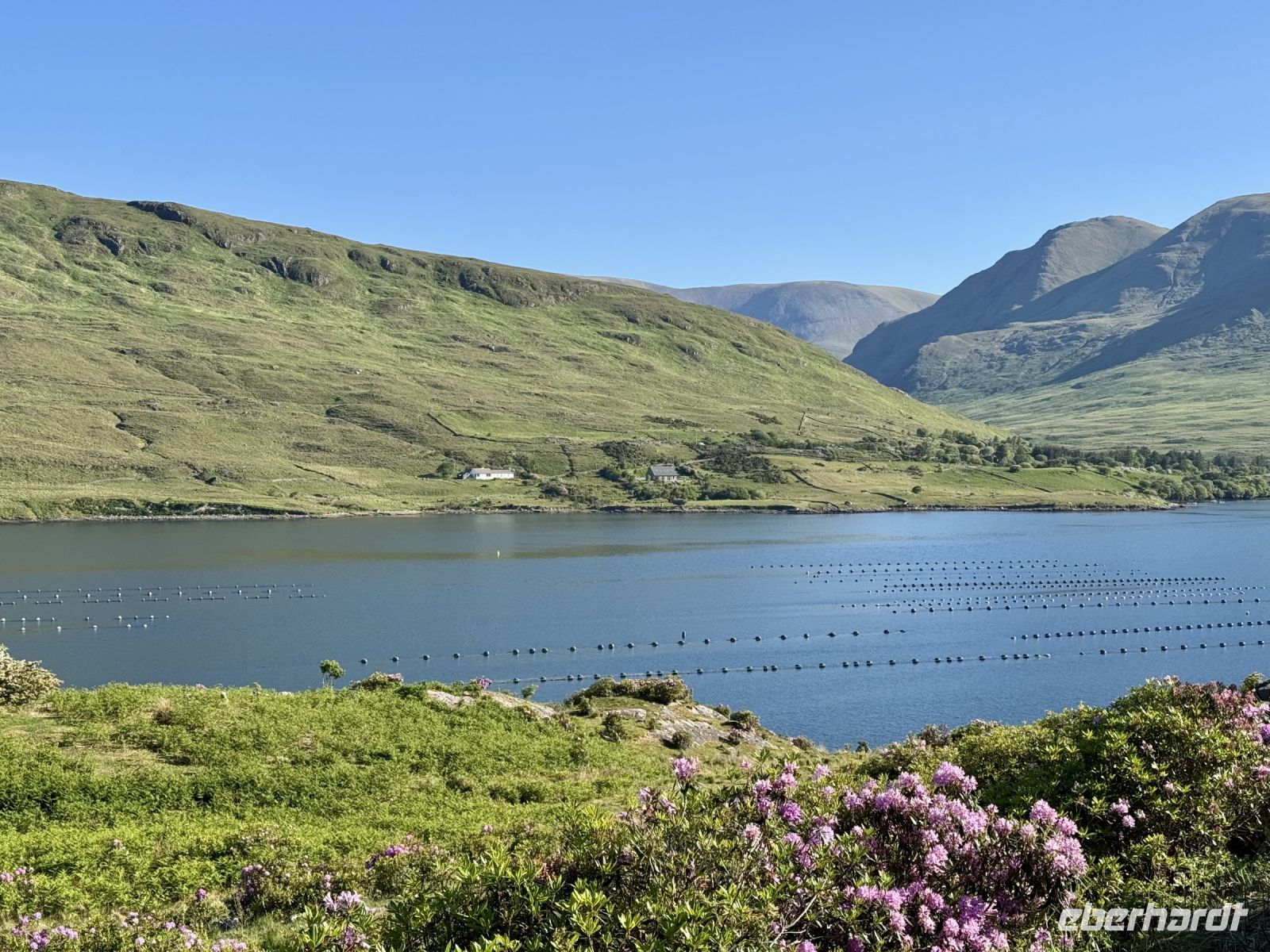 Ein weiterer wunderschöner Morgen am Killary Harbour! Kaum zu glauben, dass Leenaun der regenreichste Ort in Irland sein soll. Die Sonne lässt das Wasser glitzern und die Mweelrea Mountains in den herrlichsten Grüntönen erstrahlen. Nur ungern verlassen wir unser Hotel am Fjord. Unser erster Fotostopp am Killary Harbour lässt den Abschied nur noch schwerer fallen. Wunderschön blüht hier der Rhododendron. In dieser Hinsicht ist der Mai wirklich mein Lieblingsmonat. Beim nächsten Fotostopp am Rosroe Pier wandeln wir auf den Spuren von Ludwig Wittgenstein und genießen die Einsamkeit und Stille zwischen den Bergen, nur unterbrochen vom gelegentlichen Blöken der Schafe. Donal und ich nutzen diese Gruppe als Versuchskaninchen für eine andere Route nach Letterfrack, die entlang der Küste verläuft und sich als überaus reizvoll entpuppt. Die anschließende Wanderung im Connemara-Nationalpark auf den Diamond Hill ist durchaus eine Kraftanstrengung und die schwierigste auf der ganzen Reise, aber jede Mühe wert! Gerade mit dieser glücklichen Sonnenschein-Reisegruppe muss man das schöne Wetter nutzen. Uns erwartet eine fantastische Aussicht auf die Kylemore Abbey und ihre Gärten sowie in Richtung Küste. An schlechtem Wetter ist eine Flasche „Irish Mist“ (irischer Nebel) leider alles, was ich zum anschließenden Bergfest im Bus anbieten kann. Der edle Tropfen scheint zu schmecken, denn es gehen gleich Bestellungen ein. Die historische Kylemore Abbey wurde vor wenigen Jahren restauriert und erstrahlt in neuem Glanz. Auch die neue Abtei ist inzwischen fertig. Es scheint den Nonnen an diesem paradiesischen Fleckchen Erde ganz gut zu gehen. Mir selbst würde ja das Gärtnerhäuschen im Walled Garden völlig reichen. Ein Fotostopp im Inagh Valley bildet den Abschluss unseres Aufenthalts im wunderschönen Connemara. Durch Galway — mit einer Pause an der Sankt-Nikolaus-Kathedrale — fahren wir zu unserem nächsten Hotel in Ennis, das als Ausgangspunkt für unsere Erkundung des Burren dienen soll.
