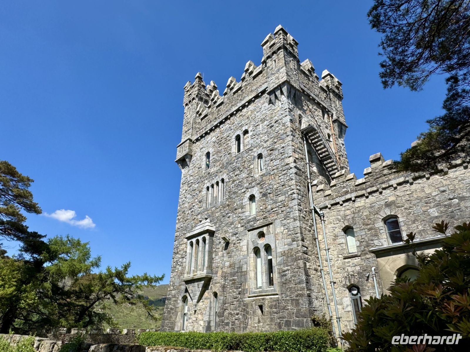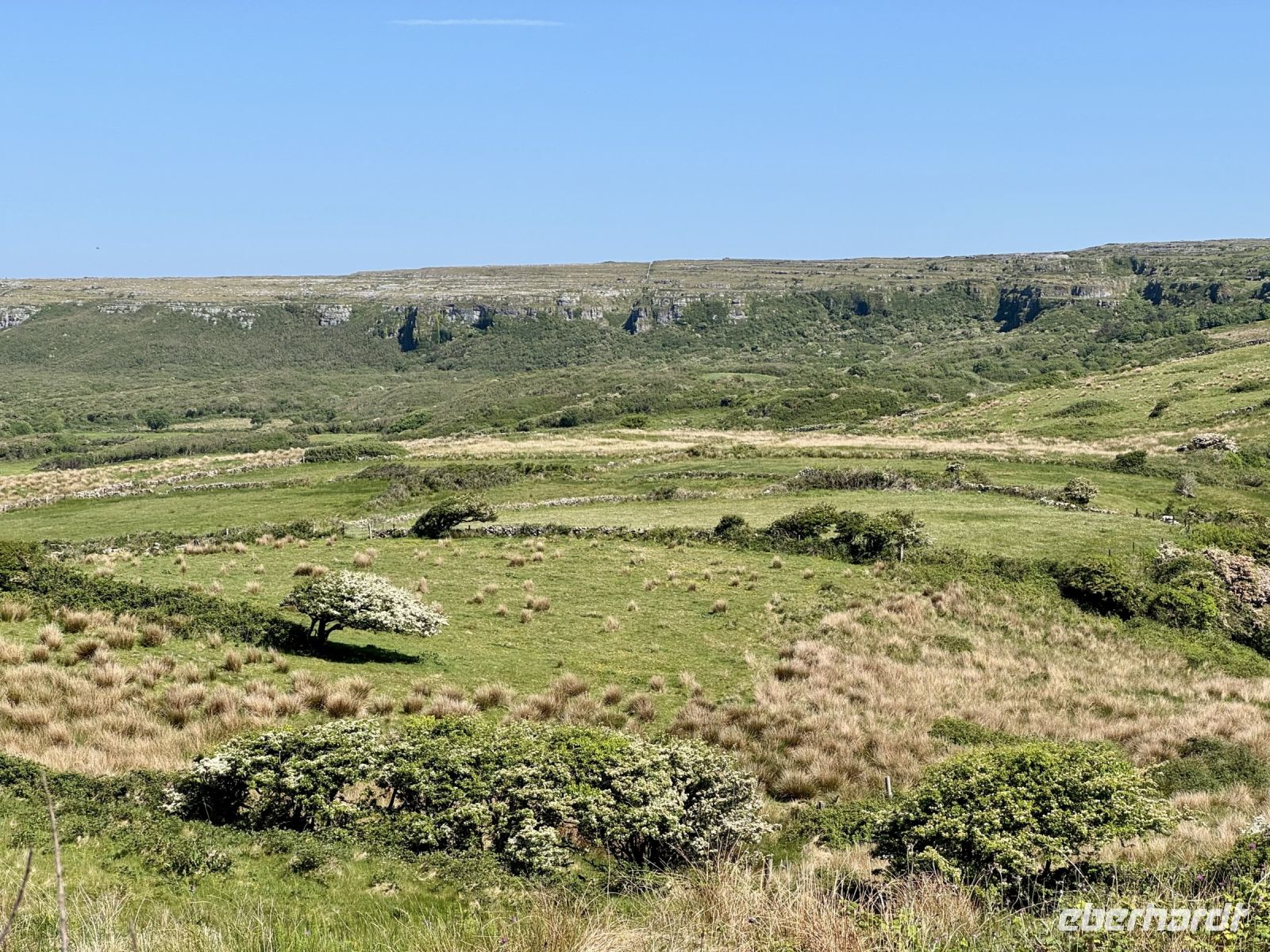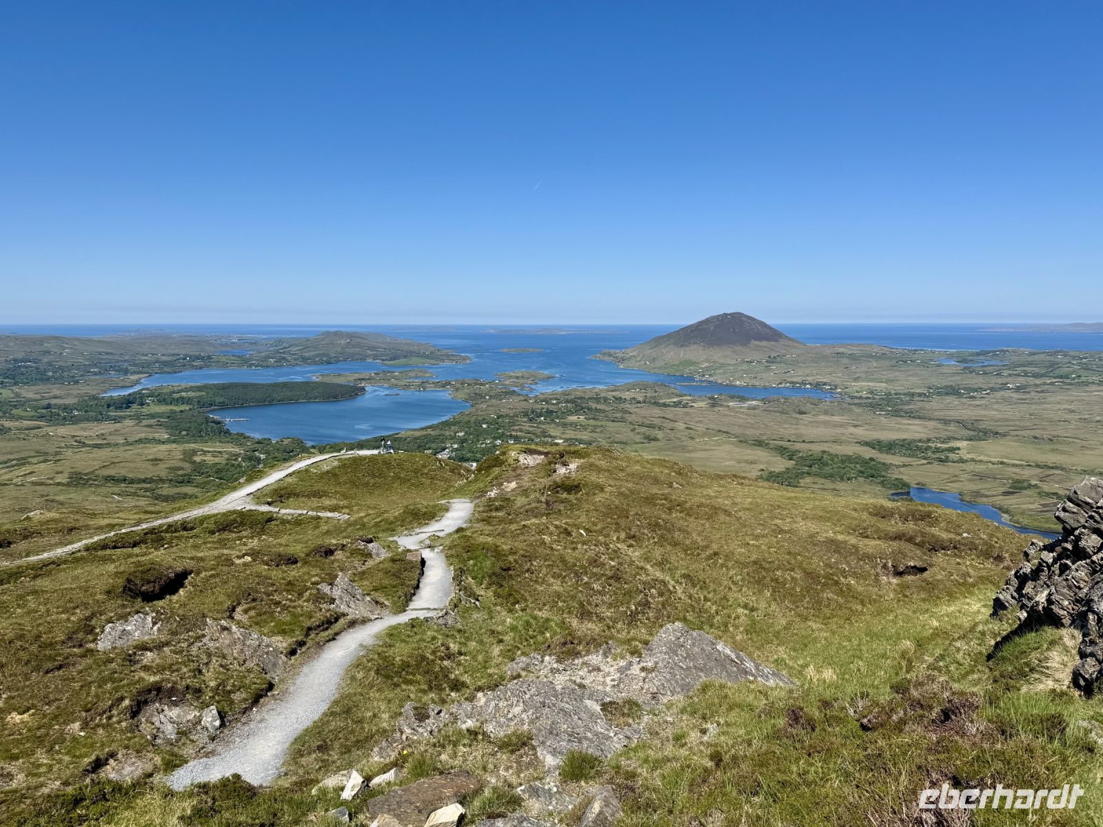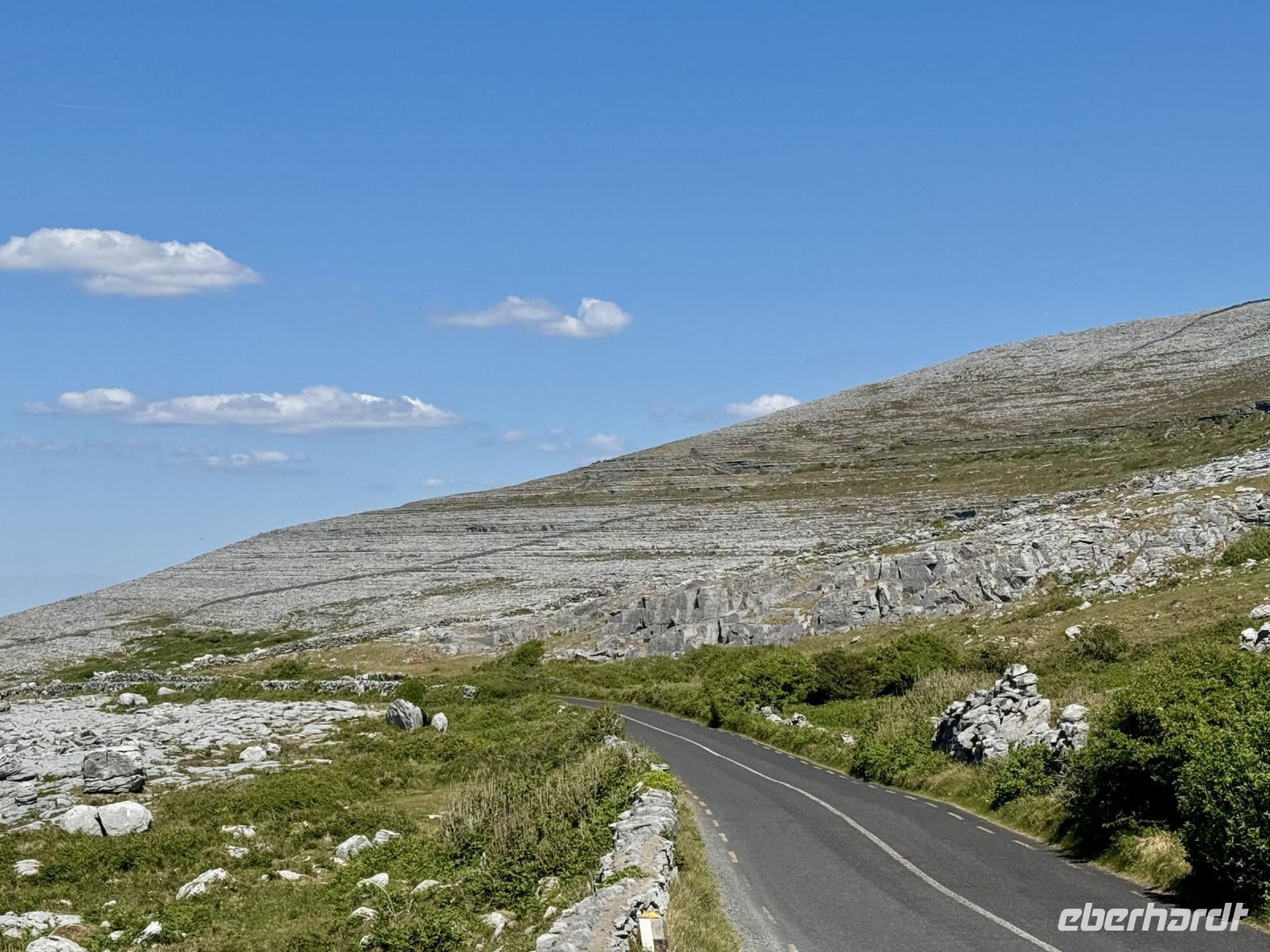 Ein weiterer wunderschöner Morgen am Killary Harbour! Kaum zu glauben, dass Leenaun der regenreichste Ort in Irland sein soll. Die Sonne lässt das Wasser glitzern und die Mweelrea Mountains in den herrlichsten Grüntönen erstrahlen. Nur ungern verlassen wir unser Hotel am Fjord. Unser erster Fotostopp am Killary Harbour lässt den Abschied nur noch schwerer fallen. Wunderschön blüht hier der Rhododendron. In dieser Hinsicht ist der Mai wirklich mein Lieblingsmonat. Beim nächsten Fotostopp am Rosroe Pier wandeln wir auf den Spuren von Ludwig Wittgenstein und genießen die Einsamkeit und Stille zwischen den Bergen, nur unterbrochen vom gelegentlichen Blöken der Schafe. Donal und ich nutzen diese Gruppe als Versuchskaninchen für eine andere Route nach Letterfrack, die entlang der Küste verläuft und sich als überaus reizvoll entpuppt. Die anschließende Wanderung im Connemara-Nationalpark auf den Diamond Hill ist durchaus eine Kraftanstrengung und die schwierigste auf der ganzen Reise, aber jede Mühe wert! Gerade mit dieser glücklichen Sonnenschein-Reisegruppe muss man das schöne Wetter nutzen. Uns erwartet eine fantastische Aussicht auf die Kylemore Abbey und ihre Gärten sowie in Richtung Küste. An schlechtem Wetter ist eine Flasche „Irish Mist“ (irischer Nebel) leider alles, was ich zum anschließenden Bergfest im Bus anbieten kann. Der edle Tropfen scheint zu schmecken, denn es gehen gleich Bestellungen ein. Die historische Kylemore Abbey wurde vor wenigen Jahren restauriert und erstrahlt in neuem Glanz. Auch die neue Abtei ist inzwischen fertig. Es scheint den Nonnen an diesem paradiesischen Fleckchen Erde ganz gut zu gehen. Mir selbst würde ja das Gärtnerhäuschen im Walled Garden völlig reichen. Ein Fotostopp im Inagh Valley bildet den Abschluss unseres Aufenthalts im wunderschönen Connemara. Durch Galway — mit einer Pause an der Sankt-Nikolaus-Kathedrale — fahren wir zu unserem nächsten Hotel in Ennis, das als Ausgangspunkt für unsere Erkundung des Burren dienen soll.