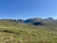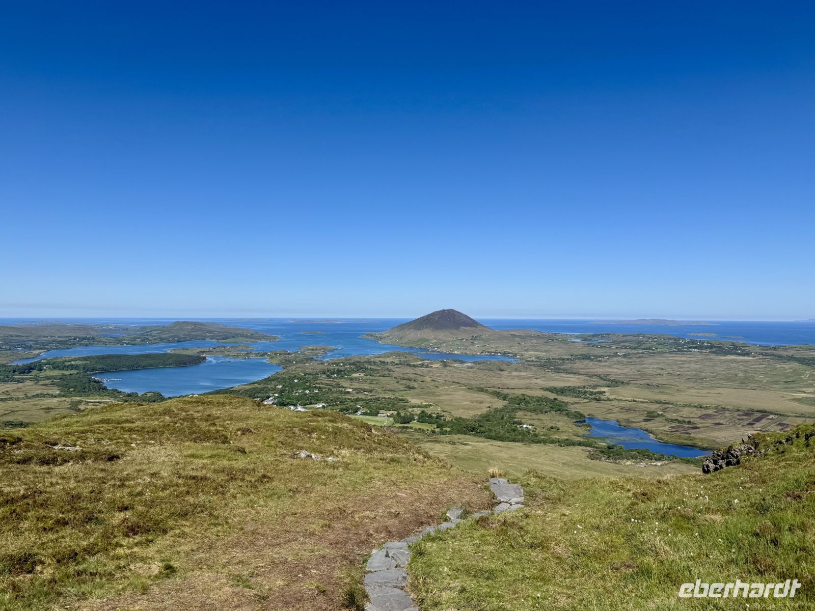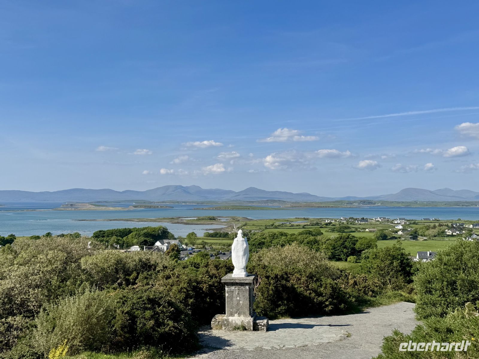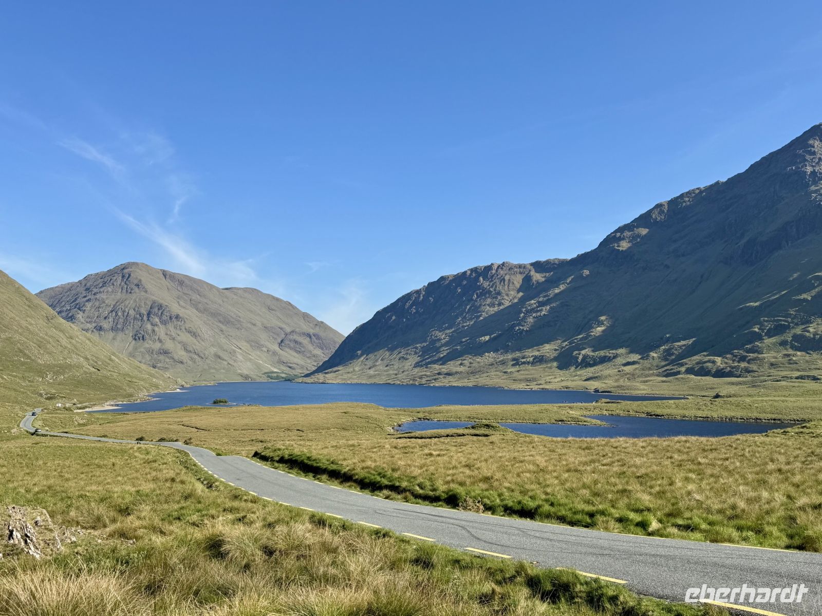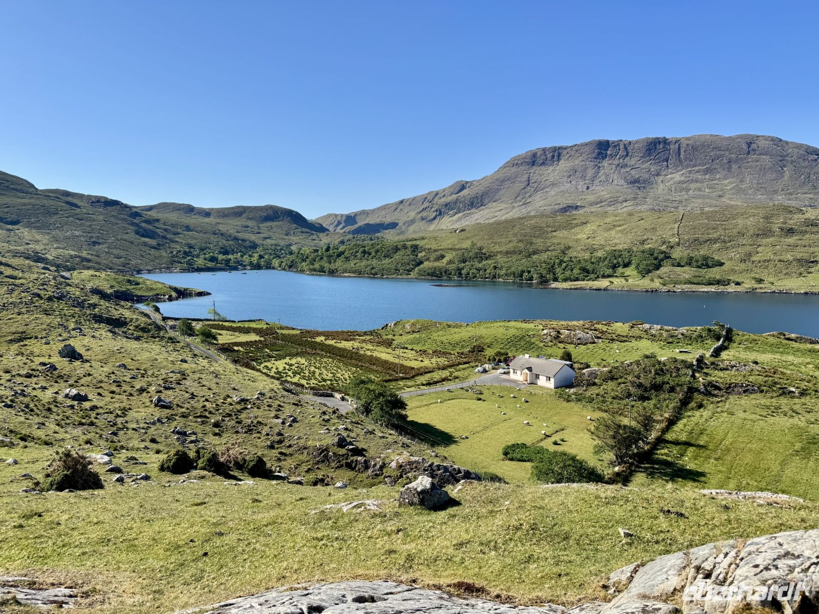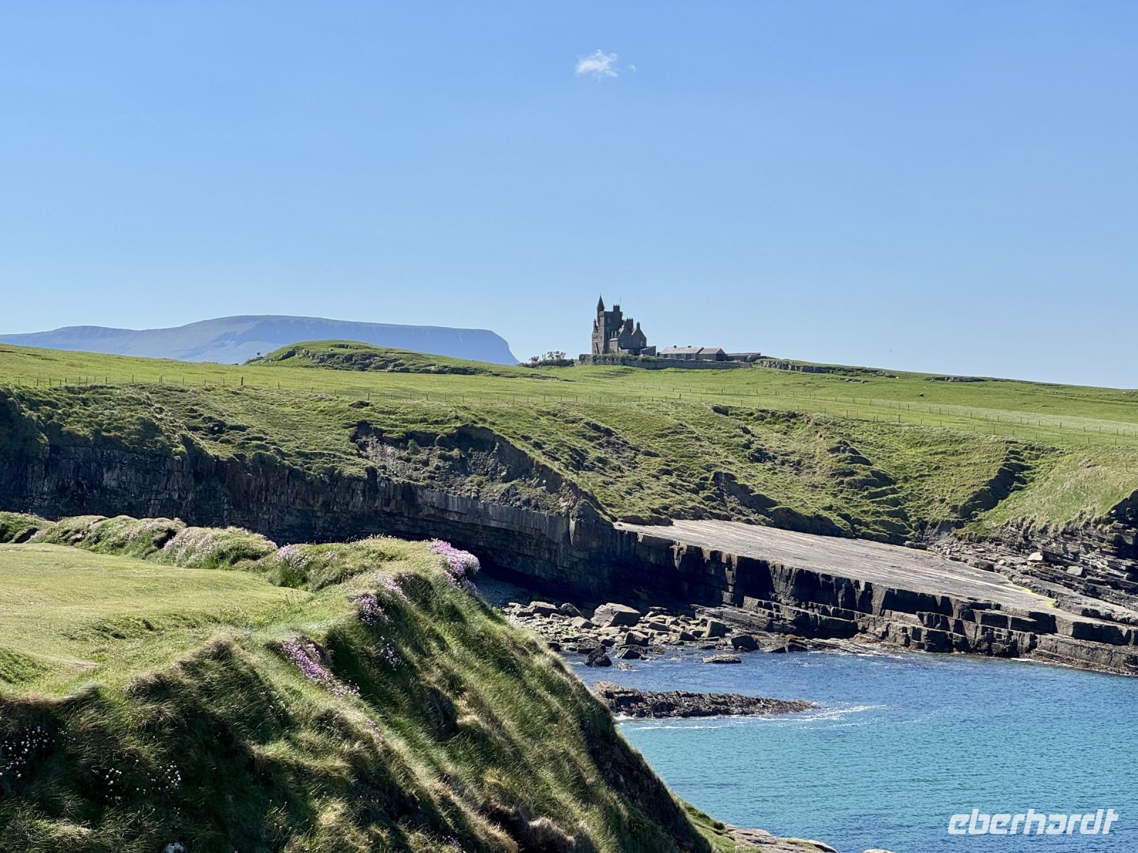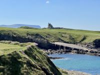 Nach drei erholsamen Nächten in Letterkenny und zwei schönen Tagesausflügen müssen wir unsere Zelte leider abbrechen und weiterziehen. Damit beginnt unsere lange Fahrt in den Süden entlang der Westküste, die uns bis zum Ring of Kerry führen soll. Heute wollen wir jedoch nur bis nach Leenaun, aber auch das sind schon ein paar Stunden Fahrt für unseren Busfahrer Donal. Wir wollen sie uns jedoch durch mehrere Zwischenstopps gut aufteilen. Den ersten machen wir in der Stadt Donegal, etwa eine Stunde südlich von Letterkenny. Im wärmenden Licht dieser seltenen glänzenden Kugel am Himmel gehen wir durch das hübsche Örtchen spazieren, machen Fotos vom Hafen, vom Castle und dem Obelisken, erledigen unseren Einkauf für das spätere Picknick und haben sogar noch Zeit für Tee und Kuchen in einem der schönen kleinen Cafés. Wahrlich, so gutes Wetter und so gute Sicht hatte ich selten auf einer Irlandreise! Bei der Wanderung um die Halbinsel Mullaghmore können wir bis zu den Klippen von Slieve League blicken und sehen glasklar vor uns das wunderschöne Classiebawn Castle vor dem ikonischen Tafelberg Ben Bulben. Derweil blühen die Grasnelken am Wegesrand und die Wellen des Atlantiks schlagen gegen die Felsen. Ach, und ein paar kleine Lämmer sehen wir gegen Ende der Wanderung auch! Beim Picknick am Hafen von Mullaghmore genießen wir den Wind und das Landschaftspanorama, bevor wir über Sligo nach Westport weiterfahren. Auch hier bleibt uns die gute Fernsicht erhalten, denn wir können bereits bei der Anfahrt auf Westport nicht nur den Croagh Patrick, sondern auch die kleine Kapelle auf dessen Gipfel sehen! Eine echte Seltenheit! Im trubeligen kleinen Örtchen Westport warten wieder viele nette kleine Geschäfte, Cafés und Eisdielen auf meine Gäste. (Kleiner Tipp: Der Ort kommt auch im etwas schrägen Netflix-Liebesfilm Irish Wish vor.) Zum Hotel am Fjord nehmen wir nun die herrliche Panoramastrecke über den Croagh Patrick und das Doolough Valley, wo wir auch jeweils Fotostopps machen. Das Leenane Hotel empfängt uns am Abend einerseits mit sehr leckerem Essen, andererseits mit Live-Musik im gemütlichen Grünen Salon. Die Darbietung der drei Musiker versetzt uns in Begeisterung, denn sie haben es wirklich drauf, egal ob sie Irischen Dudelsack, Flöte, Banjo oder Gitarre spielen! Wunderbar!