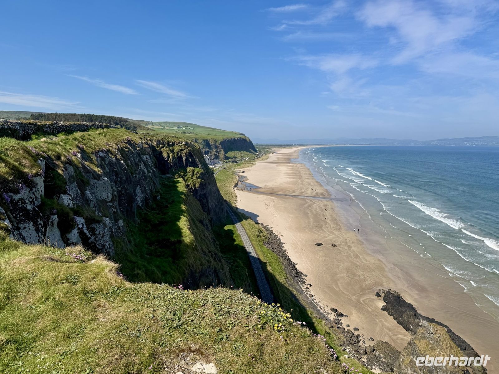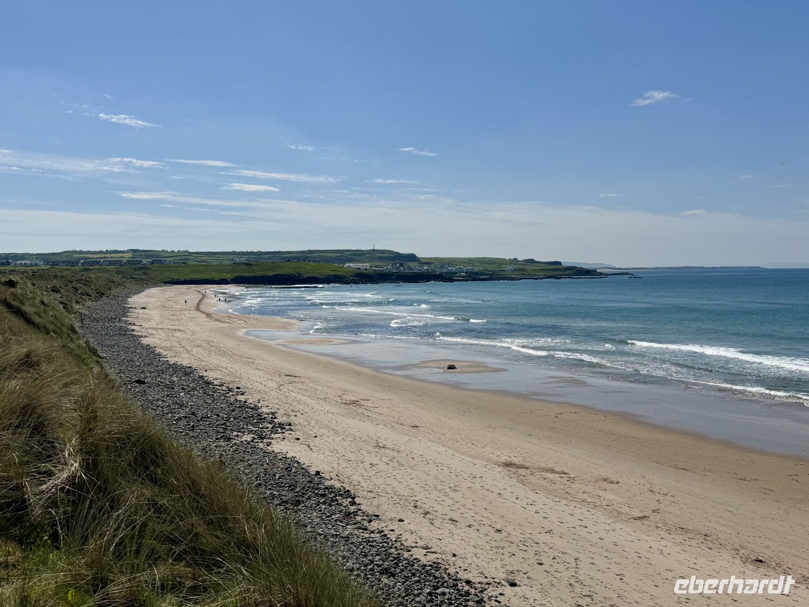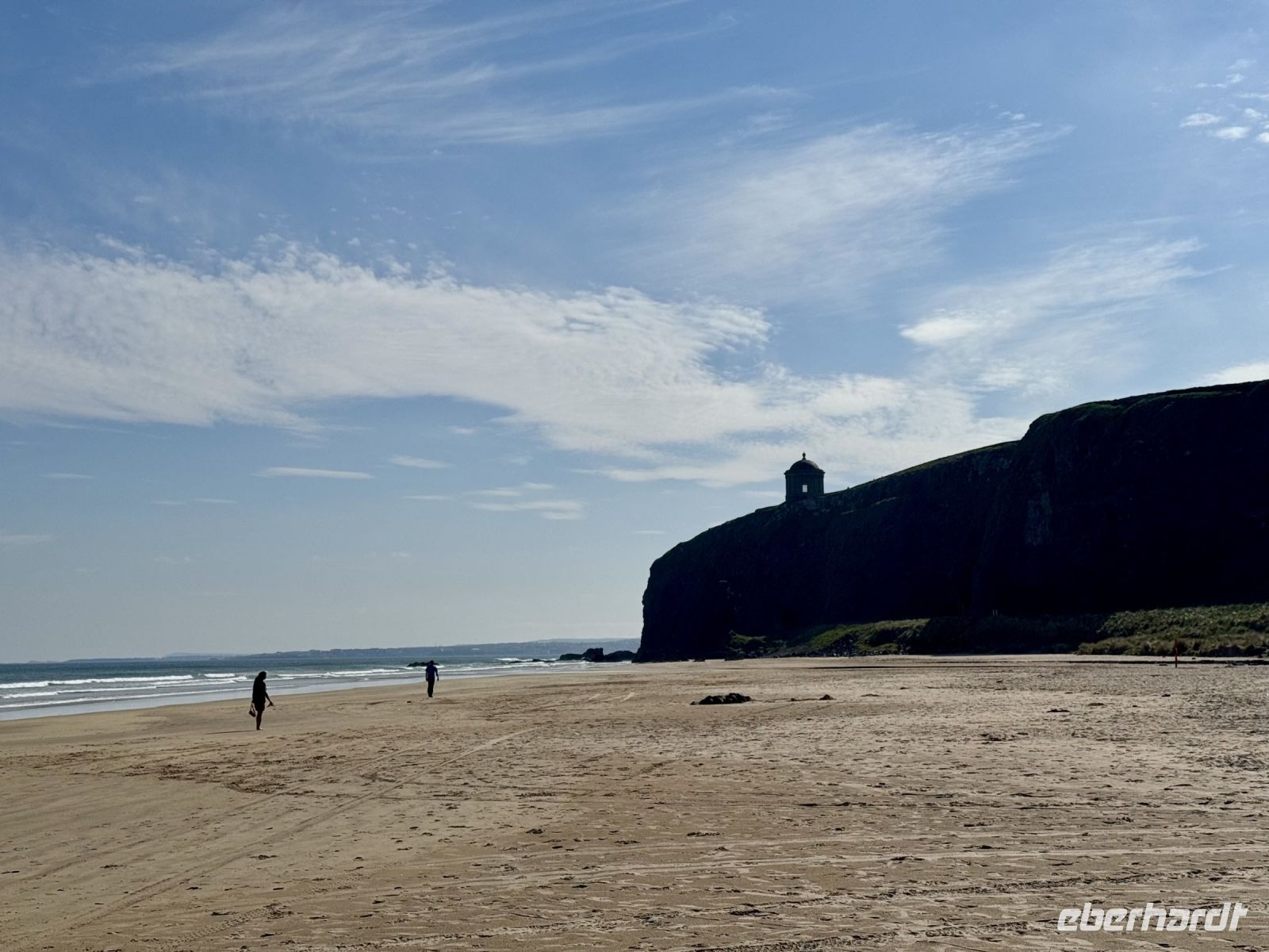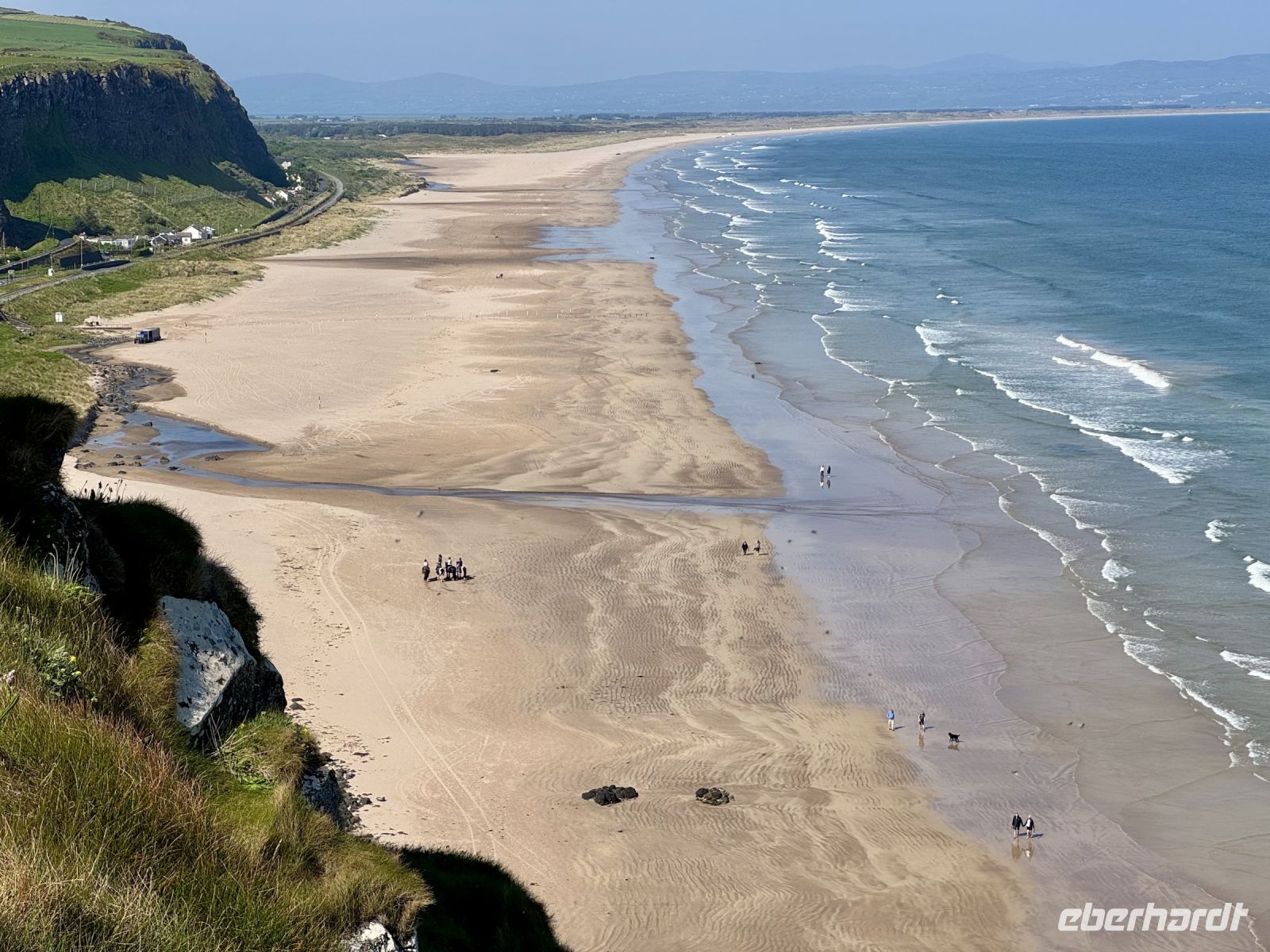 Auch für unseren heutigen Tagesausflug nach Nordirland scheint uns das Wetter hold zu sein. Vielleicht können wir ja am Nachmittag sogar eine zusätzliche kleine Wanderung machen? Schon auf der Hinfahrt zum Mussenden-Tempel bzw. Giant's Causeway nehmen wir einige Extras mit: den Manorcunningham Viewpoint mit Blick auf die breite Mündung des River Swilly und einen weiteren Strandbesuch, diesmal in Downhill direkt unterhalb des Tempels. Das Beeindruckendste am Mussenden-Tempel ist eigentlich die Lage direkt am Rand der Klippen, was natürlich für eine spektakuläre Aussicht sorgt. Eine ähnliche Lage wurde hingegen dem Dunluce Castle zum Verhängnis: Nach dem Absturz des Küchentrakts ins Meer wurde die Burg aufgegeben und gilt nun als schönste Ruine Nordirlands. Wenige Fahrminuten später haben wir den Giant’s Causeway erreicht und gehen schon wieder hinauf auf die Klippen. Zum einen ist es hier ruhiger, zum anderen genießen wir dadurch einen tollen Blick aus der Vogelperspektive auf die Basaltsäulen und die winzigen Menschlein unter uns. Eine Treppe bringt uns hinunter ans Wasser und zum versteinerten Stiefel des Riesen Finn MacCool. Nun sind wir die winzigen Menschlein und klettern auf den Steinen herum. Nach diesem Erlebnis schließen wir wie erhofft eine kurze Zusatzwanderung zum Golfplatz an. Das tolle Wetter müssen wir einfach nutzen! Und außerdem muss ich einen kontrollierenden Blick auf mein riesiges Anwesen am Runkerry Beach werfen. Die viele Bewegung an der Sonne macht durstig, weshalb wir nun die Bushmills Distillery ansteuern und unsere trockenen Kehlen spontan mit dem feinsten Tropfen Lebenswasser benetzen, das die Brennerei zu bieten hat: dem 12-jährigen Single Malt der Marke Distillery Reserve. Auf der Rückfahrt halten wir noch in Londonderry/Derry und machen einen Spaziergang auf der historischen Stadtmauer. Dabei widmen wir uns auch dem schwierigen Thema Nordirlandkonflikt, einem dunklen und traurigen Kapitel der europäischen Geschichte. Heute ist es hingegen sehr warm, freundlich und im Schatten der Bäume auf der Grand Parade geradezu idyllisch. Doch in den Köpfen der Menschen toben die Kämpfe weiter, ist das „Wir gegen die“ immer noch präsent. Eine halbe Stunde Fahrt trennen uns nun noch vom Abendessen in unserem Hotel in Letterkenny, wo wir uns bei Kartoffelbrei und rubinrotem Guinness aufheitern und mit Vorfreude und Spannung auf unsere weiteren Abenteuer blicken.