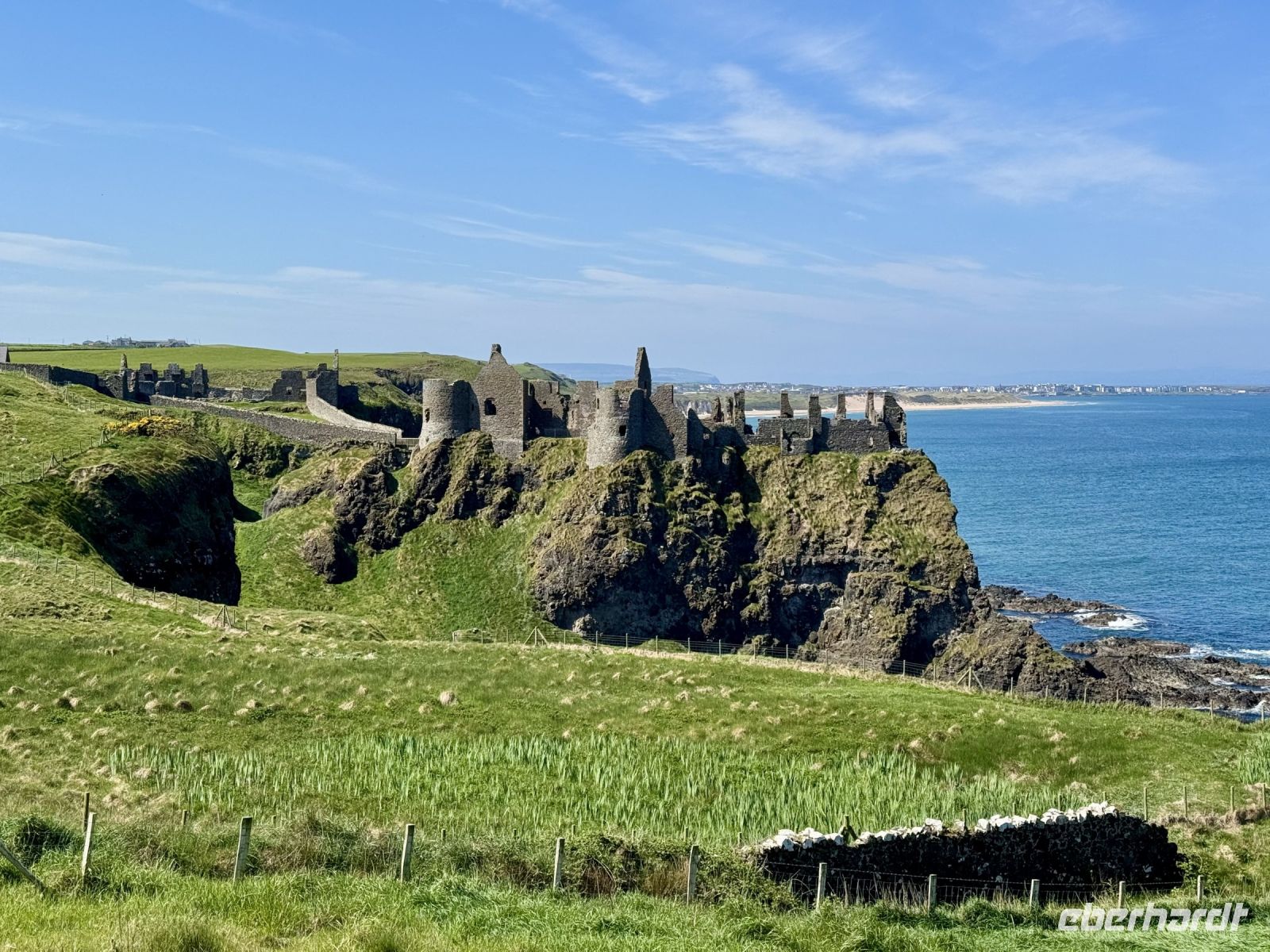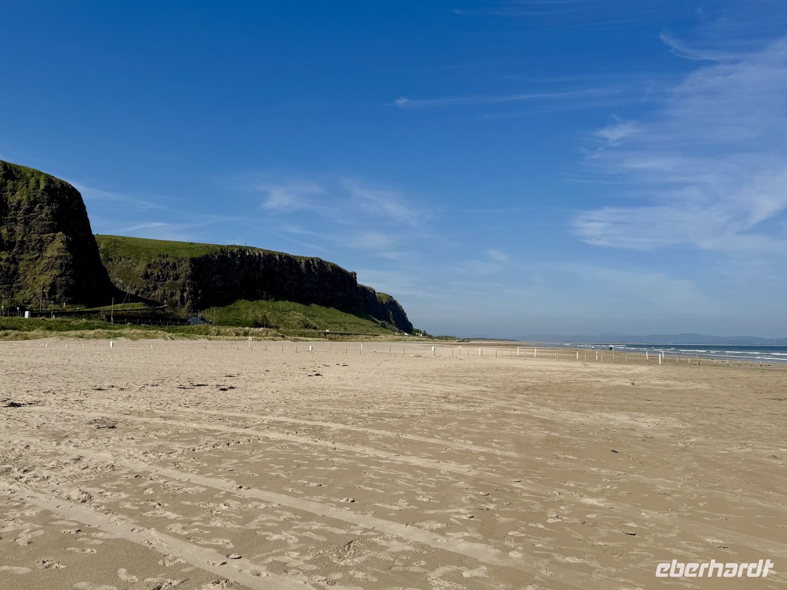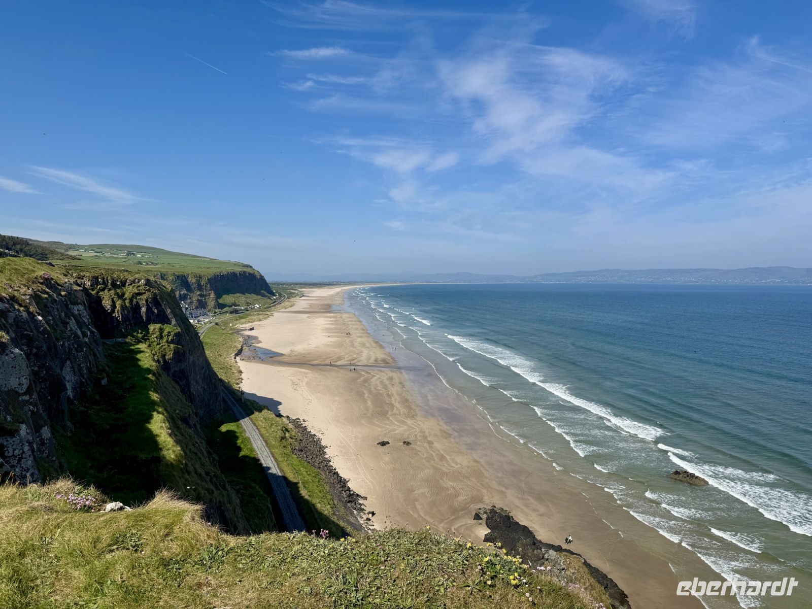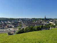 Auch für unseren heutigen Tagesausflug nach Nordirland scheint uns das Wetter hold zu sein. Vielleicht können wir ja am Nachmittag sogar eine zusätzliche kleine Wanderung machen? Schon auf der Hinfahrt zum Mussenden-Tempel bzw. Giant's Causeway nehmen wir einige Extras mit: den Manorcunningham Viewpoint mit Blick auf die breite Mündung des River Swilly und einen weiteren Strandbesuch, diesmal in Downhill direkt unterhalb des Tempels. Das Beeindruckendste am Mussenden-Tempel ist eigentlich die Lage direkt am Rand der Klippen, was natürlich für eine spektakuläre Aussicht sorgt. Eine ähnliche Lage wurde hingegen dem Dunluce Castle zum Verhängnis: Nach dem Absturz des Küchentrakts ins Meer wurde die Burg aufgegeben und gilt nun als schönste Ruine Nordirlands. Wenige Fahrminuten später haben wir den Giant’s Causeway erreicht und gehen schon wieder hinauf auf die Klippen. Zum einen ist es hier ruhiger, zum anderen genießen wir dadurch einen tollen Blick aus der Vogelperspektive auf die Basaltsäulen und die winzigen Menschlein unter uns. Eine Treppe bringt uns hinunter ans Wasser und zum versteinerten Stiefel des Riesen Finn MacCool. Nun sind wir die winzigen Menschlein und klettern auf den Steinen herum. Nach diesem Erlebnis schließen wir wie erhofft eine kurze Zusatzwanderung zum Golfplatz an. Das tolle Wetter müssen wir einfach nutzen! Und außerdem muss ich einen kontrollierenden Blick auf mein riesiges Anwesen am Runkerry Beach werfen. Die viele Bewegung an der Sonne macht durstig, weshalb wir nun die Bushmills Distillery ansteuern und unsere trockenen Kehlen spontan mit dem feinsten Tropfen Lebenswasser benetzen, das die Brennerei zu bieten hat: dem 12-jährigen Single Malt der Marke Distillery Reserve. Auf der Rückfahrt halten wir noch in Londonderry/Derry und machen einen Spaziergang auf der historischen Stadtmauer. Dabei widmen wir uns auch dem schwierigen Thema Nordirlandkonflikt, einem dunklen und traurigen Kapitel der europäischen Geschichte. Heute ist es hingegen sehr warm, freundlich und im Schatten der Bäume auf der Grand Parade geradezu idyllisch. Doch in den Köpfen der Menschen toben die Kämpfe weiter, ist das „Wir gegen die“ immer noch präsent. Eine halbe Stunde Fahrt trennen uns nun noch vom Abendessen in unserem Hotel in Letterkenny, wo wir uns bei Kartoffelbrei und rubinrotem Guinness aufheitern und mit Vorfreude und Spannung auf unsere weiteren Abenteuer blicken.