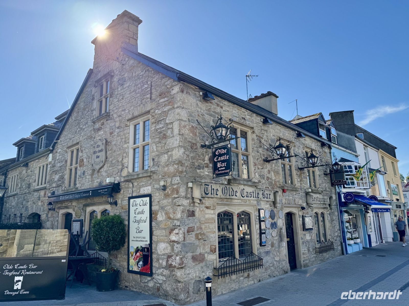 Es wird ein langer Kampf der Sonne gegen die Regenwolken. Am Morgen sieht es noch sehr düster aus, als wir Dublin in Richtung Norden verlassen. Auch der Regen setzt bis zum Nachmittag immer mal wieder ein, wenn auch nur leicht. Die Wolken ziehen nach Norden ab — in unsere Fahrtrichtung. Als wir Monasterboice erreichen, fahren zwei andere Gruppen gerade ab, sodass wir die Ruinen der Klosteranlage ganz für uns haben. Es herrscht eine mystische Atmosphäre, vielleicht auch gerade wegen der Wolken? Falls der Heilige Patrick um die Ecke kommen würde — uns würde es nicht wundern. Immerhin hat er ja einst auf dem nahegelegenen Hill of Slane, unserem nächsten Zwischenziel, das allererste Osterfeuer auf der Insel entzündet. An einer Raststätte machen wir eine zeitige Mittagspause und überqueren dann die (unscheinbare) Grenze nach Nordirland. Bei Armagh prallen immer noch zwei Religionen, zwei völlig unterschiedliche Kulturen aufeinander: das Christentum durch Patrick und der heidnische Glaube der Kelten. Am Navan Fort reisen wir weiter in die Vergangenheit und gelangen in einer keltischen Ansiedlung mitten in eine Auseinandersetzung zwischen Mutter und Sohn über die weitere Familienplanung, denn der Junior findet einfach keine Frau, trotz seines angesehenen Berufs als Schmied! Ob es daran liegt, dass der Gürtel schon vor der Hochzeit ziemlich weit ist? Wir haben jedenfalls unseren Spaß daran und werden mit Nesseltee und Haferkeksen auch gut bewirtet. Oder zumindest meine Gäste, denn ich werde ganz schön hart rangenommen und zum Krieger ausgebildet. Zurück in der Gegenwart unternehmen wir einen Spaziergang zum eigentlichen „Navan Fort“ bzw. keltischen Tempel. Der irische Wettergott spendiert uns einen lieblichen Nachmittag und hat in der Zwischenzeit die Wolken vertrieben. So zieht auch auf der Weiterfahrt nach Letterkenny viel freundliche Landschaft mit Schafen und Kühen sowie Weiden, Hecken und sanft geschwungenen Hügeln vorbei. In unserem Hotel in Letterkenny quartieren wir uns gleich für die nächsten drei Nächte ein. Es liegt direkt an der Hauptstraße des Ortes (die Zimmer gehen aber nach hinten raus) — mit mehreren Pubs mit Live-Musik in Laufnähe.