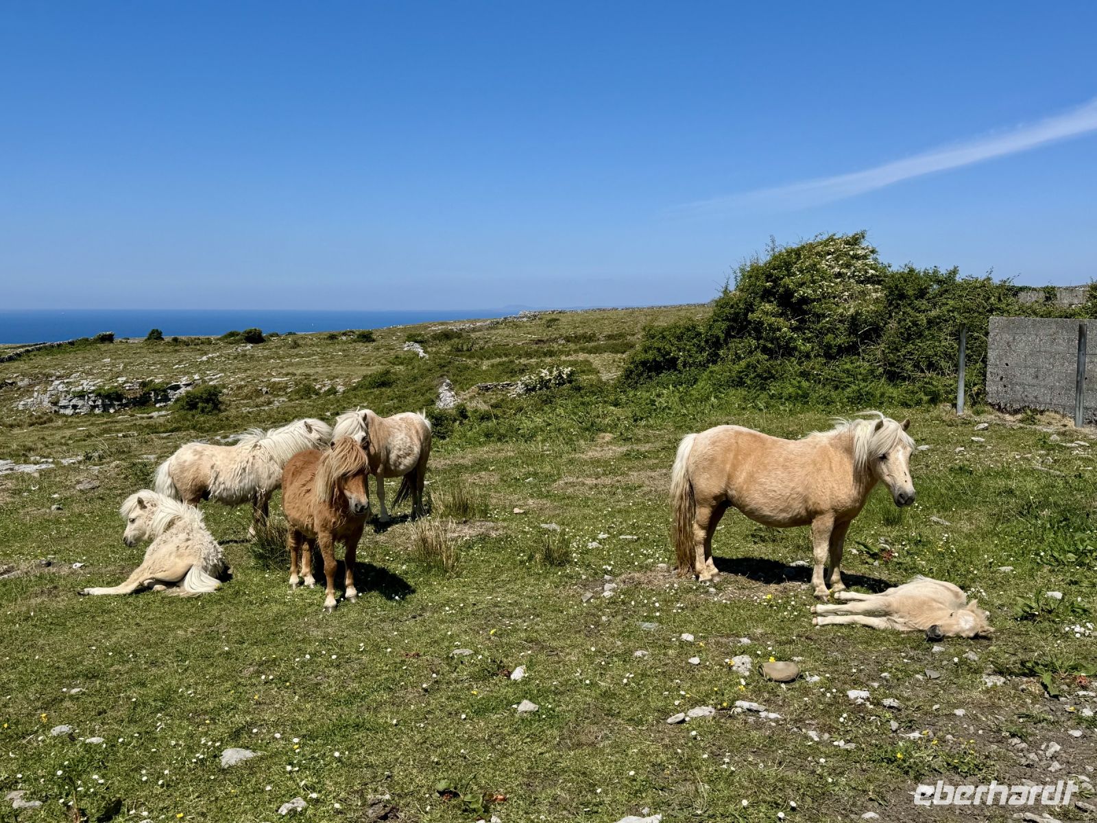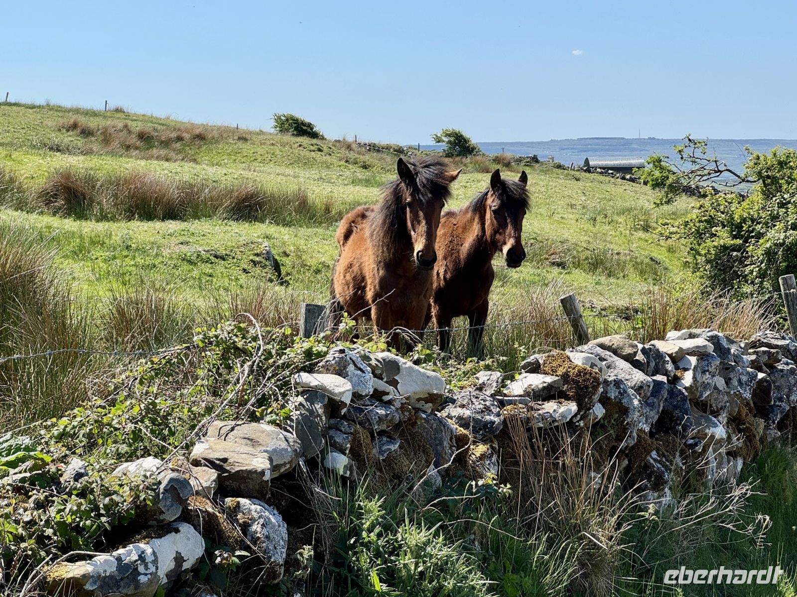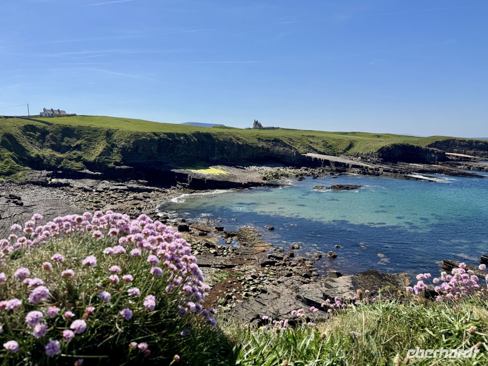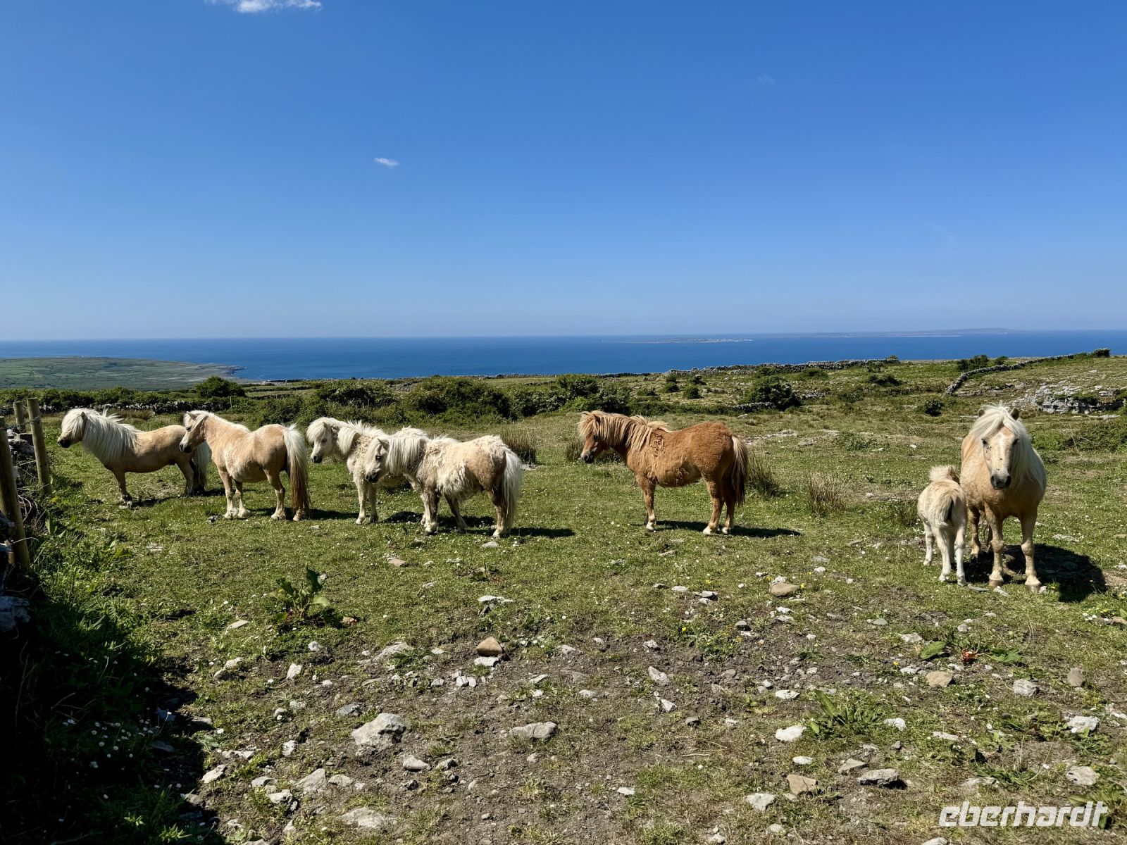 Mit einem Aufenthalt an der Strandpromenade von Lahinch beginnt unser heutiges Tagesprogramm. Da gerade Flut herrscht, ist vom schönen Sandstrand nicht viel zu sehen; das Wasser reicht bis an die aufgestapelten Felsbrocken heran. Besonders warm scheint das Meer auch noch nicht zu sein. Ein junges Pärchen schafft es nur mit viel Überwindung ins Wasser. Wenn aber der irische Sommer dieses Jahr schon in den Mai fällt, bleibt manchmal nur ein beherzter Sprung in die eiskalten Wellen, um den Badeurlaub abzuhaken. An den berühmten Cliffs of Moher herrscht am zeitigen Vormittag noch vergleichsweise wenig Betrieb. So gibt es wenig Gedränge an den besten Foto-/Selfie-Plätzen. Wieder ahnen meine Gäste nichts von ihrem Wetterglück, denn so eine gute Fernsicht wie heute hatte ich wahrscheinlich noch nie. Wir können bis zu den Klippen am Steinfort Dun Aengus auf den Aran Islands blicken und können sogar den Leuchtturm in der Mitte der Insel Inishmore sehen! Die tolle Aussicht bleibt uns bei unserer anschließenden Wanderung auf dem Burren Way erhalten und wird ergänzt durch Tierbegegnungen mit Pferden und Ponys — tolle Sturmfrisuren inklusive. Ziel unserer Wanderung ist O’Donohue’s Pub in Fanore. Nach dem kürzlichen Betreiberwechsel bin ich gespannt auf die Fish & Chips und den Irish Coffee. Ob es weiterhin schmeckt? Das neue Farbkonzept im Innenraum ist in jedem Fall eine Aufwertung. Gut gestärkt setzen wir unsere Erkundung des Burren fort. Am Black Head ist die Erosion besonders extrem, sodass fast nur noch der nackte Kalkstein zu sehen ist. Einen kurzen Mittagsschlaf später wecke ich meine Gäste wieder auf, denn ich habe mir so gedacht, dass ihnen ein Besuch der Hazel Mountain Chocolate Factory samt kleiner Führung durchaus gefallen könnte. Schon beim Betreten der Räumlichkeiten liegt ein betörender Schokoladenduft in der Luft. Leider darf ich meinen großen Schokoladenblock nicht behalten und eine Übernachtung scheint auch ausgeschlossen. So bleibt nur die Rückfahrt nach Ennis, wobei wir noch einen Fotostopp am Dunguaire Castle einlegen.