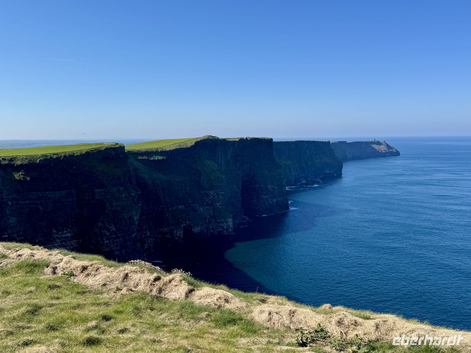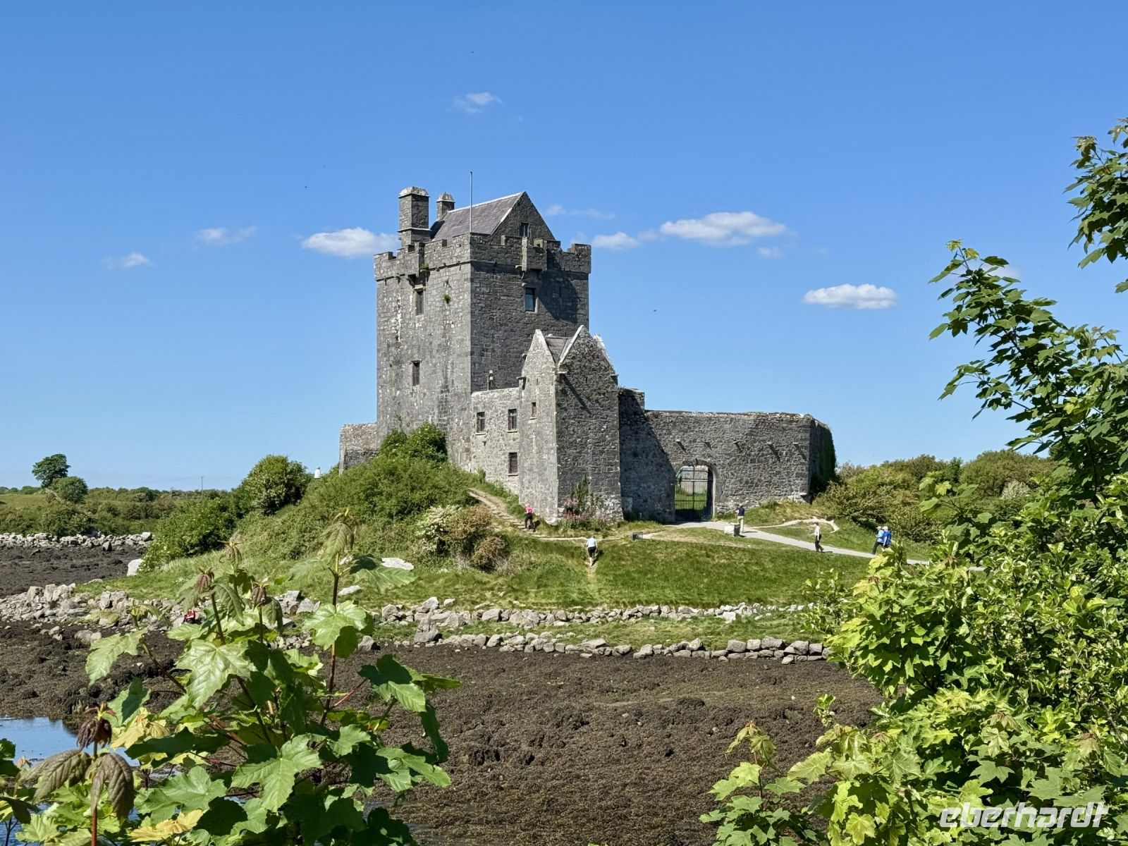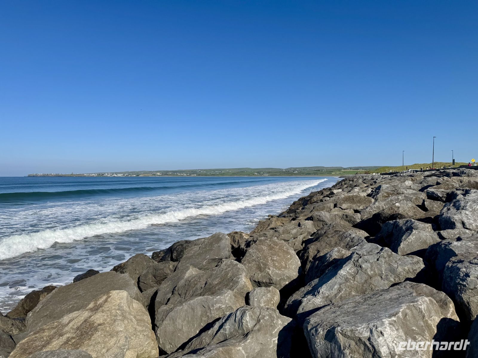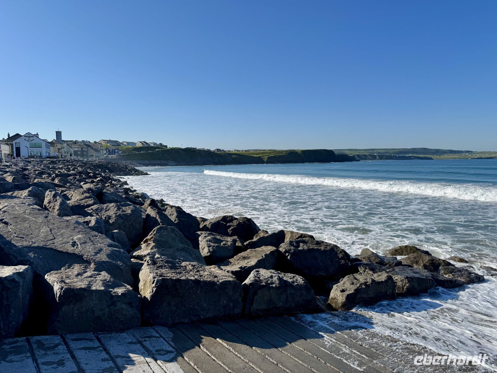 Mit einem Aufenthalt an der Strandpromenade von Lahinch beginnt unser heutiges Tagesprogramm. Da gerade Flut herrscht, ist vom schönen Sandstrand nicht viel zu sehen; das Wasser reicht bis an die aufgestapelten Felsbrocken heran. Besonders warm scheint das Meer auch noch nicht zu sein. Ein junges Pärchen schafft es nur mit viel Überwindung ins Wasser. Wenn aber der irische Sommer dieses Jahr schon in den Mai fällt, bleibt manchmal nur ein beherzter Sprung in die eiskalten Wellen, um den Badeurlaub abzuhaken. An den berühmten Cliffs of Moher herrscht am zeitigen Vormittag noch vergleichsweise wenig Betrieb. So gibt es wenig Gedränge an den besten Foto-/Selfie-Plätzen. Wieder ahnen meine Gäste nichts von ihrem Wetterglück, denn so eine gute Fernsicht wie heute hatte ich wahrscheinlich noch nie. Wir können bis zu den Klippen am Steinfort Dun Aengus auf den Aran Islands blicken und können sogar den Leuchtturm in der Mitte der Insel Inishmore sehen! Die tolle Aussicht bleibt uns bei unserer anschließenden Wanderung auf dem Burren Way erhalten und wird ergänzt durch Tierbegegnungen mit Pferden und Ponys — tolle Sturmfrisuren inklusive. Ziel unserer Wanderung ist O’Donohue’s Pub in Fanore. Nach dem kürzlichen Betreiberwechsel bin ich gespannt auf die Fish & Chips und den Irish Coffee. Ob es weiterhin schmeckt? Das neue Farbkonzept im Innenraum ist in jedem Fall eine Aufwertung. Gut gestärkt setzen wir unsere Erkundung des Burren fort. Am Black Head ist die Erosion besonders extrem, sodass fast nur noch der nackte Kalkstein zu sehen ist. Einen kurzen Mittagsschlaf später wecke ich meine Gäste wieder auf, denn ich habe mir so gedacht, dass ihnen ein Besuch der Hazel Mountain Chocolate Factory samt kleiner Führung durchaus gefallen könnte. Schon beim Betreten der Räumlichkeiten liegt ein betörender Schokoladenduft in der Luft. Leider darf ich meinen großen Schokoladenblock nicht behalten und eine Übernachtung scheint auch ausgeschlossen. So bleibt nur die Rückfahrt nach Ennis, wobei wir noch einen Fotostopp am Dunguaire Castle einlegen.