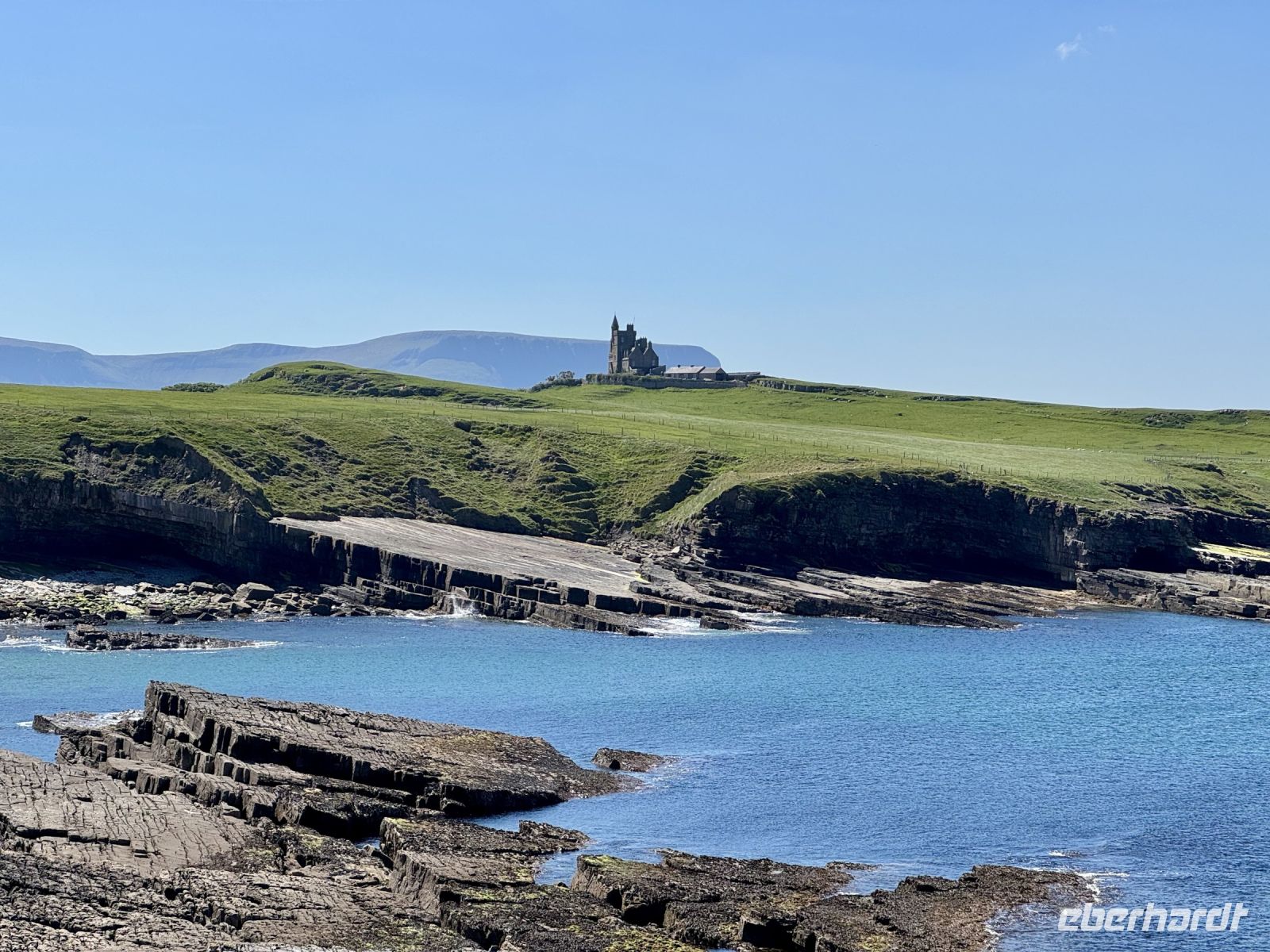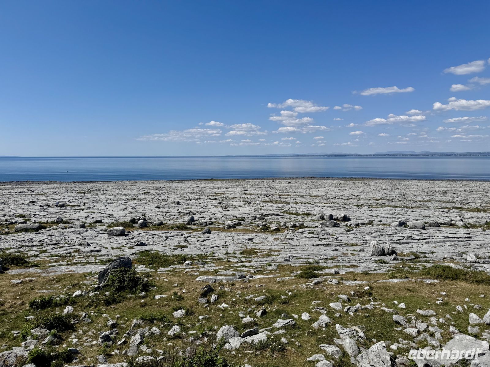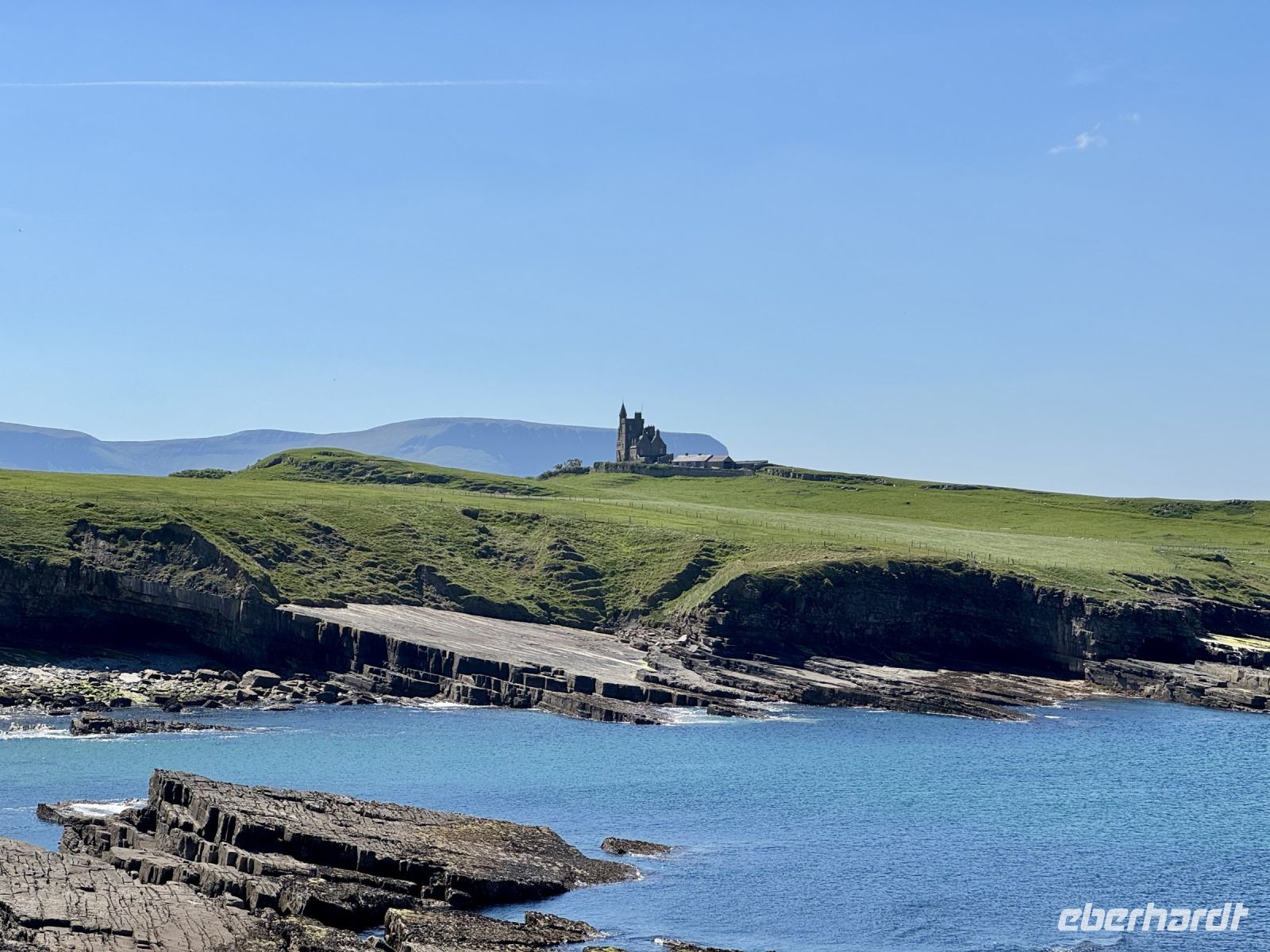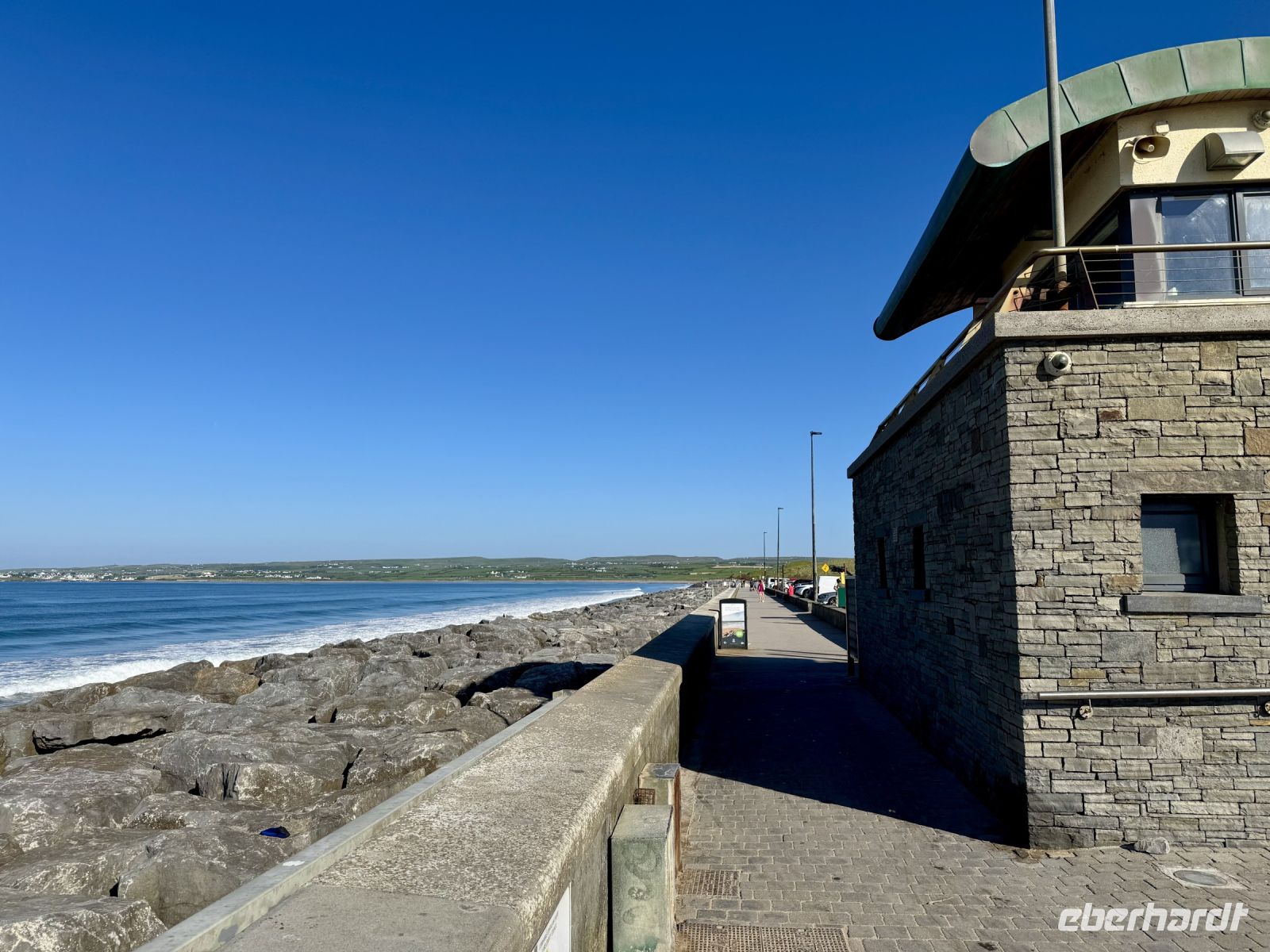 Mit einem Aufenthalt an der Strandpromenade von Lahinch beginnt unser heutiges Tagesprogramm. Da gerade Flut herrscht, ist vom schönen Sandstrand nicht viel zu sehen; das Wasser reicht bis an die aufgestapelten Felsbrocken heran. Besonders warm scheint das Meer auch noch nicht zu sein. Ein junges Pärchen schafft es nur mit viel Überwindung ins Wasser. Wenn aber der irische Sommer dieses Jahr schon in den Mai fällt, bleibt manchmal nur ein beherzter Sprung in die eiskalten Wellen, um den Badeurlaub abzuhaken. An den berühmten Cliffs of Moher herrscht am zeitigen Vormittag noch vergleichsweise wenig Betrieb. So gibt es wenig Gedränge an den besten Foto-/Selfie-Plätzen. Wieder ahnen meine Gäste nichts von ihrem Wetterglück, denn so eine gute Fernsicht wie heute hatte ich wahrscheinlich noch nie. Wir können bis zu den Klippen am Steinfort Dun Aengus auf den Aran Islands blicken und können sogar den Leuchtturm in der Mitte der Insel Inishmore sehen! Die tolle Aussicht bleibt uns bei unserer anschließenden Wanderung auf dem Burren Way erhalten und wird ergänzt durch Tierbegegnungen mit Pferden und Ponys — tolle Sturmfrisuren inklusive. Ziel unserer Wanderung ist O’Donohue’s Pub in Fanore. Nach dem kürzlichen Betreiberwechsel bin ich gespannt auf die Fish & Chips und den Irish Coffee. Ob es weiterhin schmeckt? Das neue Farbkonzept im Innenraum ist in jedem Fall eine Aufwertung. Gut gestärkt setzen wir unsere Erkundung des Burren fort. Am Black Head ist die Erosion besonders extrem, sodass fast nur noch der nackte Kalkstein zu sehen ist. Einen kurzen Mittagsschlaf später wecke ich meine Gäste wieder auf, denn ich habe mir so gedacht, dass ihnen ein Besuch der Hazel Mountain Chocolate Factory samt kleiner Führung durchaus gefallen könnte. Schon beim Betreten der Räumlichkeiten liegt ein betörender Schokoladenduft in der Luft. Leider darf ich meinen großen Schokoladenblock nicht behalten und eine Übernachtung scheint auch ausgeschlossen. So bleibt nur die Rückfahrt nach Ennis, wobei wir noch einen Fotostopp am Dunguaire Castle einlegen.