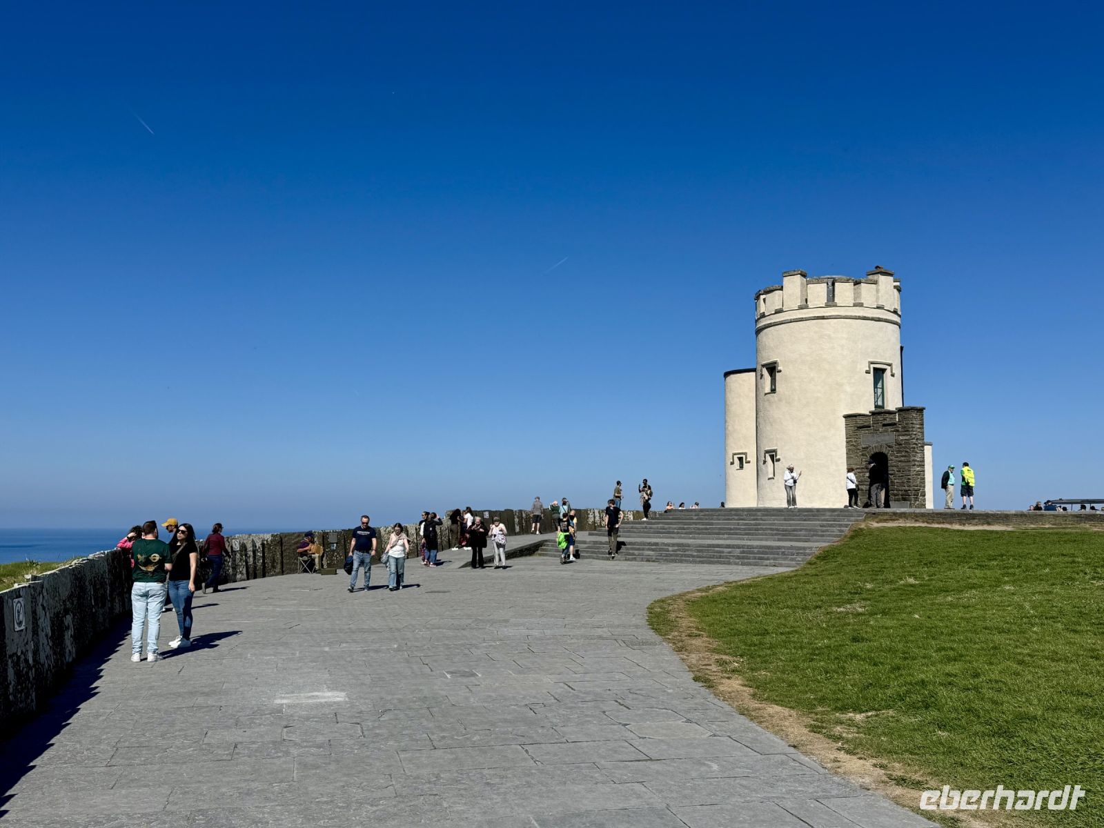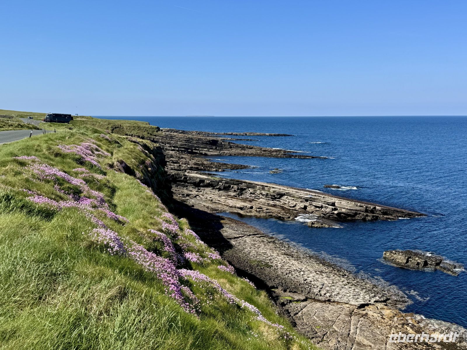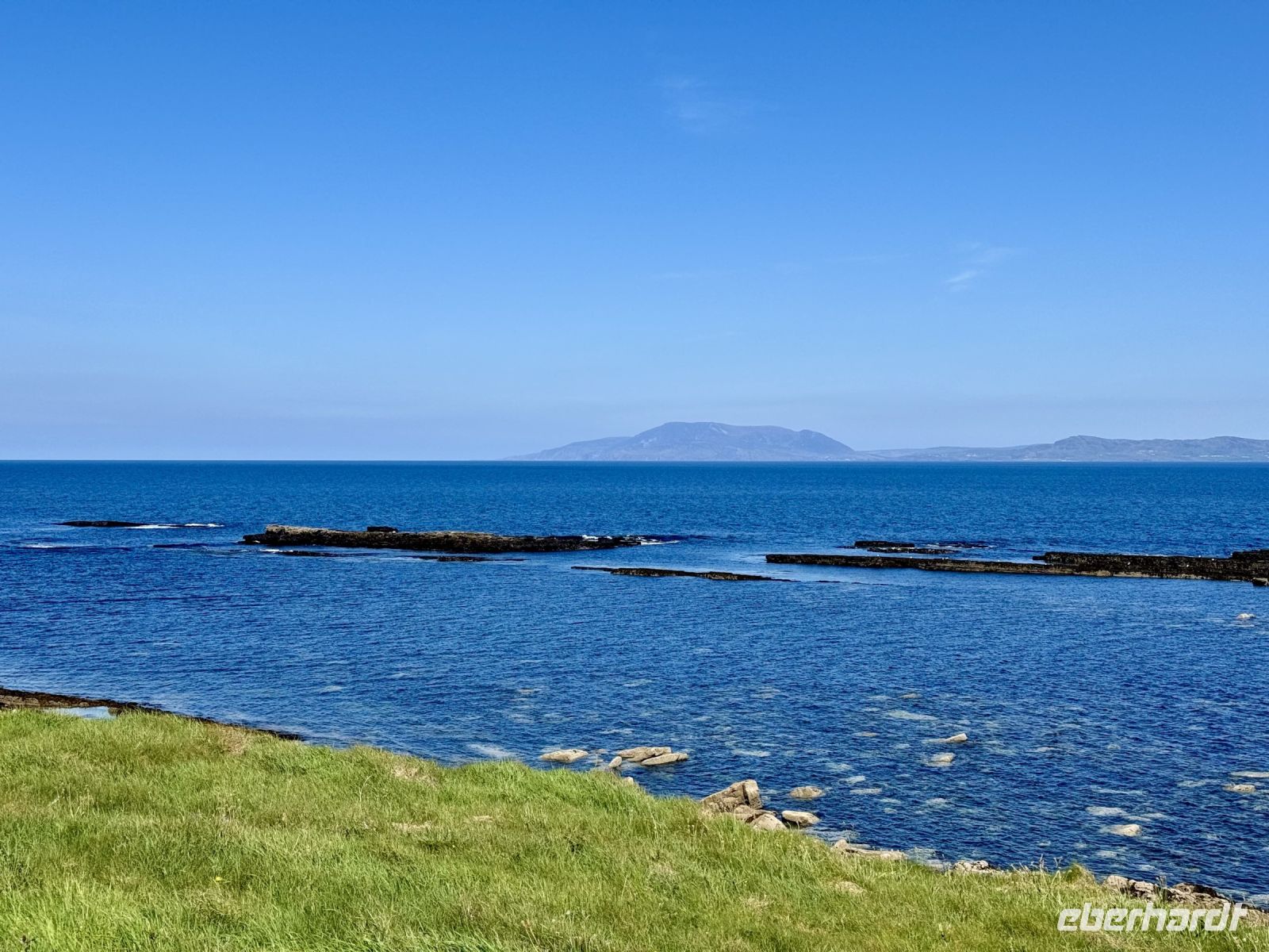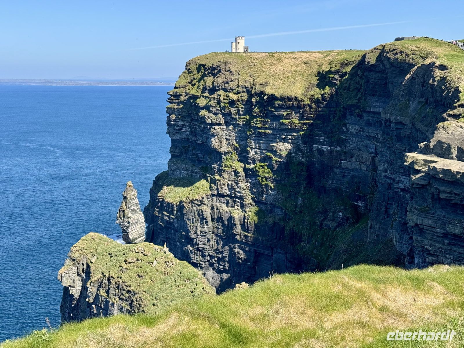 Mit einem Aufenthalt an der Strandpromenade von Lahinch beginnt unser heutiges Tagesprogramm. Da gerade Flut herrscht, ist vom schönen Sandstrand nicht viel zu sehen; das Wasser reicht bis an die aufgestapelten Felsbrocken heran. Besonders warm scheint das Meer auch noch nicht zu sein. Ein junges Pärchen schafft es nur mit viel Überwindung ins Wasser. Wenn aber der irische Sommer dieses Jahr schon in den Mai fällt, bleibt manchmal nur ein beherzter Sprung in die eiskalten Wellen, um den Badeurlaub abzuhaken. An den berühmten Cliffs of Moher herrscht am zeitigen Vormittag noch vergleichsweise wenig Betrieb. So gibt es wenig Gedränge an den besten Foto-/Selfie-Plätzen. Wieder ahnen meine Gäste nichts von ihrem Wetterglück, denn so eine gute Fernsicht wie heute hatte ich wahrscheinlich noch nie. Wir können bis zu den Klippen am Steinfort Dun Aengus auf den Aran Islands blicken und können sogar den Leuchtturm in der Mitte der Insel Inishmore sehen! Die tolle Aussicht bleibt uns bei unserer anschließenden Wanderung auf dem Burren Way erhalten und wird ergänzt durch Tierbegegnungen mit Pferden und Ponys — tolle Sturmfrisuren inklusive. Ziel unserer Wanderung ist O’Donohue’s Pub in Fanore. Nach dem kürzlichen Betreiberwechsel bin ich gespannt auf die Fish & Chips und den Irish Coffee. Ob es weiterhin schmeckt? Das neue Farbkonzept im Innenraum ist in jedem Fall eine Aufwertung. Gut gestärkt setzen wir unsere Erkundung des Burren fort. Am Black Head ist die Erosion besonders extrem, sodass fast nur noch der nackte Kalkstein zu sehen ist. Einen kurzen Mittagsschlaf später wecke ich meine Gäste wieder auf, denn ich habe mir so gedacht, dass ihnen ein Besuch der Hazel Mountain Chocolate Factory samt kleiner Führung durchaus gefallen könnte. Schon beim Betreten der Räumlichkeiten liegt ein betörender Schokoladenduft in der Luft. Leider darf ich meinen großen Schokoladenblock nicht behalten und eine Übernachtung scheint auch ausgeschlossen. So bleibt nur die Rückfahrt nach Ennis, wobei wir noch einen Fotostopp am Dunguaire Castle einlegen.