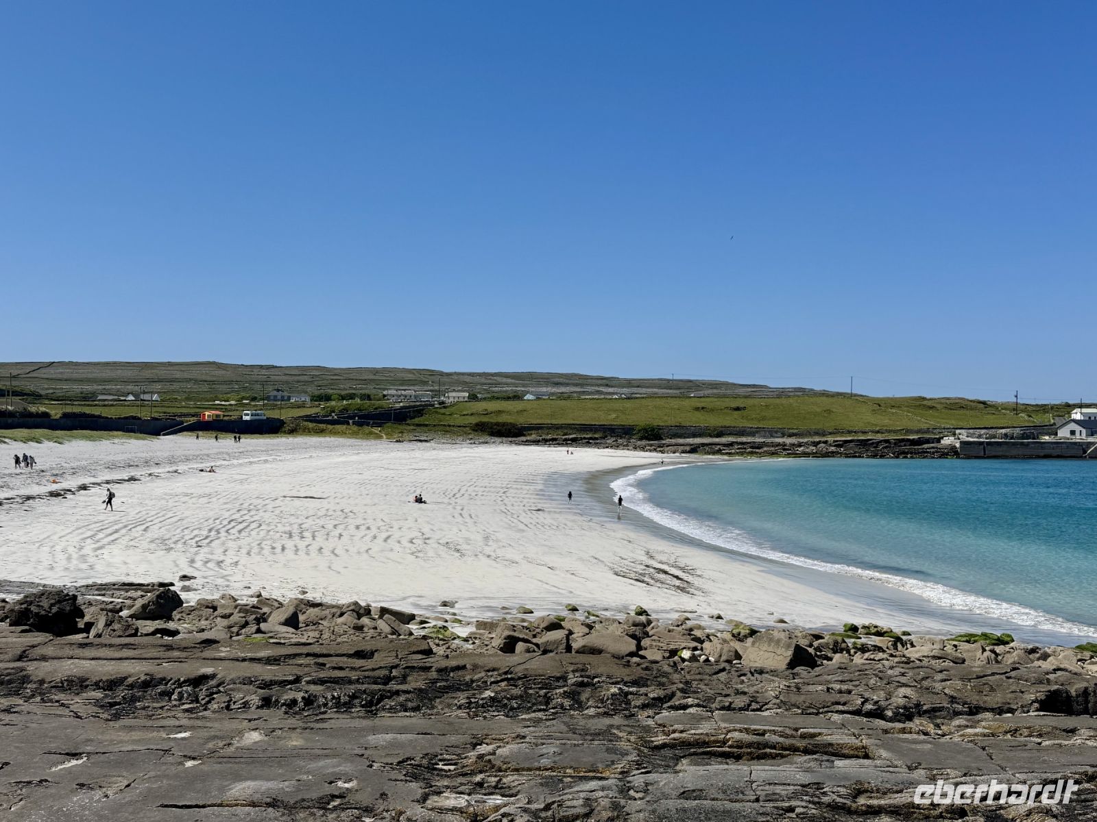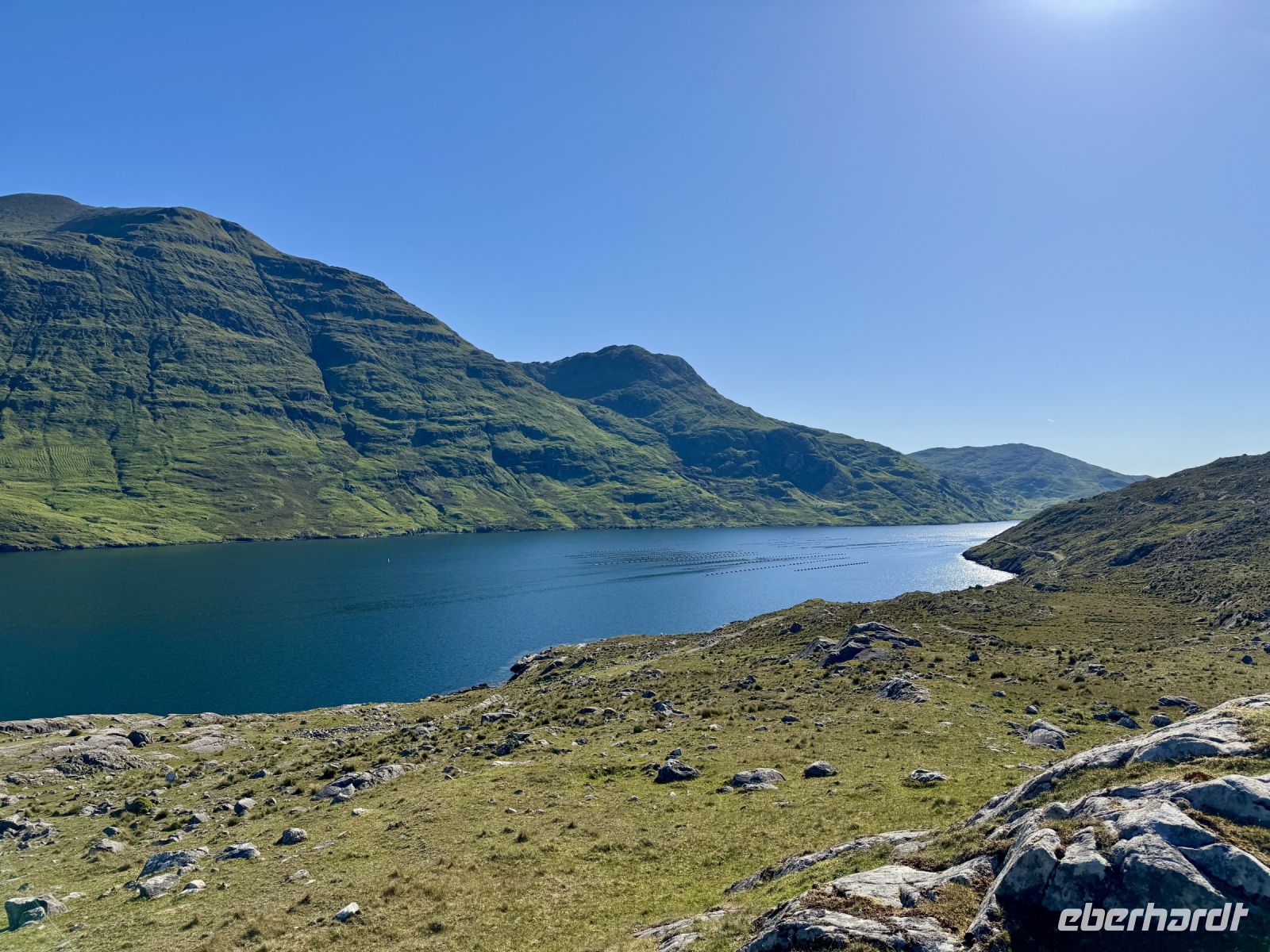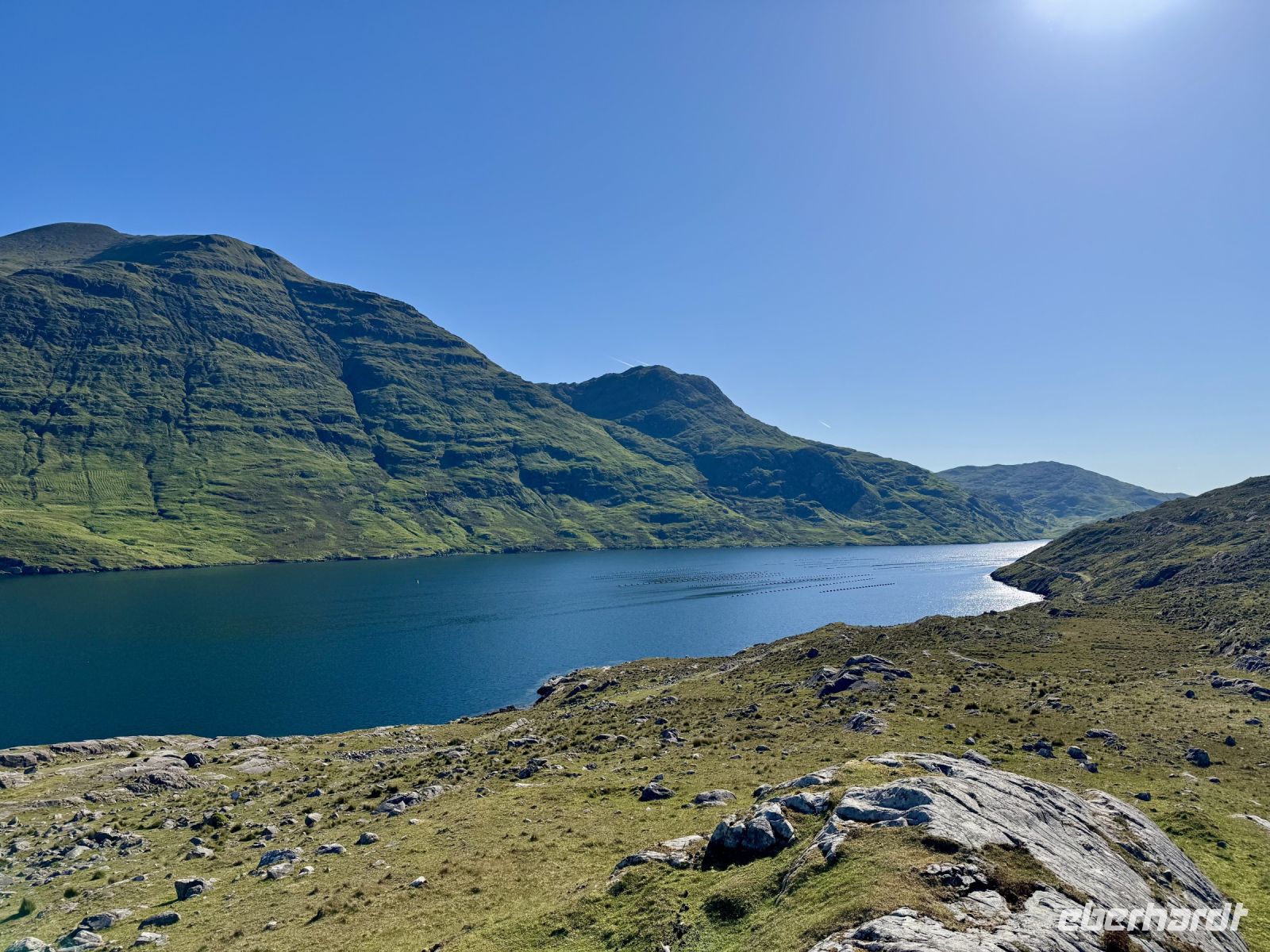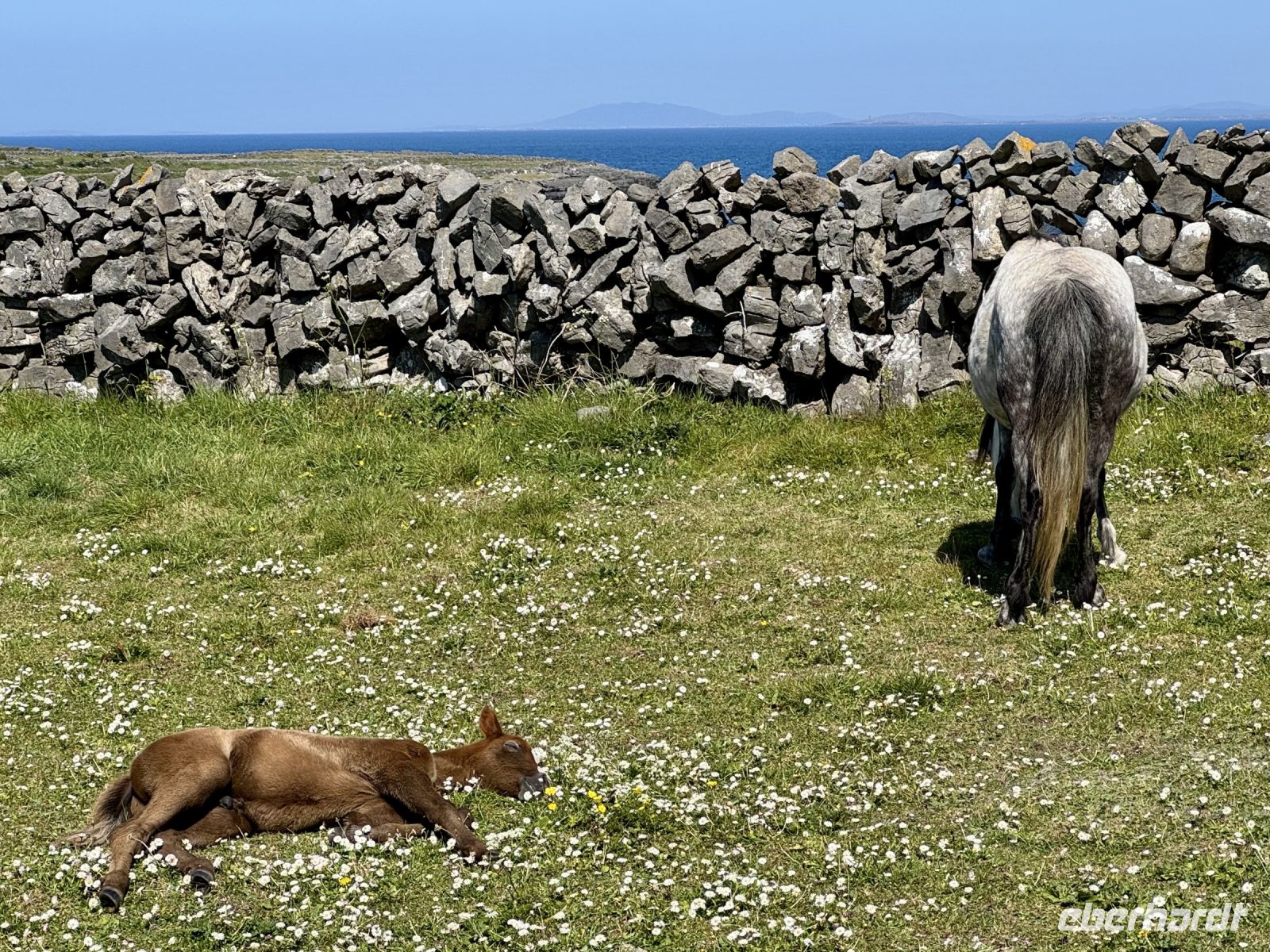 Der Tag beginnt mit einem tollen Sonnenaufgang über dem Fjord, gefolgt von einem tollen Frühstück im Leenane Hotel mit einem großen Teller Porridge für mich. Für meine Gäste gibt es wahlweise auch Rührei mit Lachs oder ein klassisches Full Irish Breakfast. Das Wetter bleibt wie die letzten Tage auch sehr schön und sonnig — meine Gäste sollen für den heutigen Ausflug auf die Aran Islands ruhig die Badesachen mitnehmen. Donal fährt uns quer durch die Berglandschaft Connemaras zum Fährhafen von Rossaveel. Die Überfahrt nach Kilronan auf der größten Aran-Insel Inishmore verläuft heute weitestgehend ruhig — von einigen kleinen Rumplern abgesehen. An der Nordküste wandern wir entlang der Trockensteinmauer gemütlich bis Cill Mhuirbhigh. Tierbegegnungen sind auf den Aran Islands immer inklusive. Diesmal begegnen wir Ponys samt einem ganz jungen Fohlen, einer süßen kleinen Katze, vielen Kühen und zwei Irischen Langhalsschafen (auch bekannt als Lamas). Während unserer Mittagspause geben uns zudem die Kegelrobben ein kleines Konzert, wobei mir die Musik gestern Abend im Hotel dann aber doch besser gefallen hat. Der Robbengesang klingt eher wie ein Klagelied. Ob es ihnen für den Mai einfach zu warm ist? Zum Glück für uns weht eine erfrischende Brise und macht die Sonne erträglich. Kurz vor dem Ziel sehen wir schon den herrlichen Sandstrand, der heute gut besucht scheint. Das gute Wetter lockt die Iren natürlich ins Wasser. Wer weiß denn schließlich, was die nächsten Wochen an Regenwetter bringen werden? Lieber vorbaden, bevor der Sommer ins Wasser fällt. Für uns empfiehlt es sich jedoch, jetzt die letzten Kraftreserven zu aktivieren und sogleich den Aufstieg zum Steinfort Dun Aengus zu wagen. Etwa 15 Minuten dauert der Aufstieg zur Steinzeitfestung am Rande der Klippen. Keine Absperrung, kein Seil schützt uns vor dem Absturz. Wer keine Höhenangst hat, kann sich auf den Bauch legen und seine Nasenspitze über den Rand schieben. Die Eisdiele und das hübsche Café in Cill Mhuirbhigh sowie der bereits erwähnte Strand buhlen nun um unsere Aufmerksamkeit, bis uns der freundliche Insulaner Owen mit seinem Kleinbus abholt und zurück nach Kilronan fährt. Dank vieler lustiger Anekdoten gestaltet sich die Fahrt sehr kurzweilig. Die Fähre bringt uns zurück nach Rossaveel, wo Donal bereits mit dem Bus auf uns wartet. Er ist extra strammen Schrittes zum Hafen zurückmarschiert, um eine Fähre eher zu nehmen, nur damit er uns gleich mit dem Bus in Empfang nehmen kann. Auf der Rückfahrt nach Leenaun machen wir spontan einen Fotostopp an einer Kirche und erfreuen uns an der Aussicht auf das Tal und die Maumturk Mountains. In unserem Hotel am Fjord erwartet uns wieder ein leckeres Abendessen, bevor wir in unsere Betten sinken und von Sonne, Sand und türkisblauem Wasser träumen.