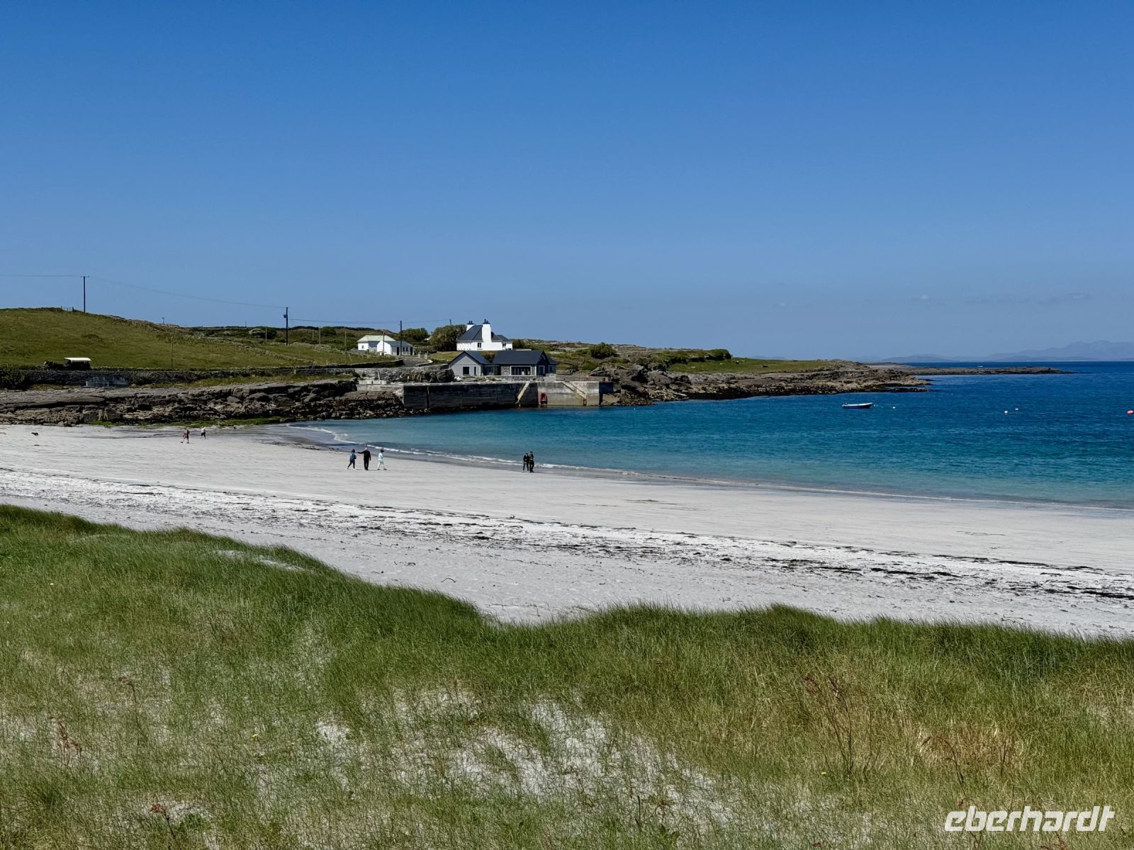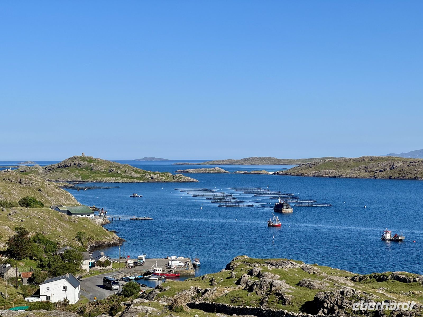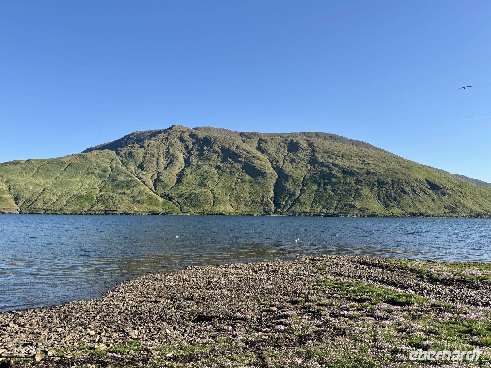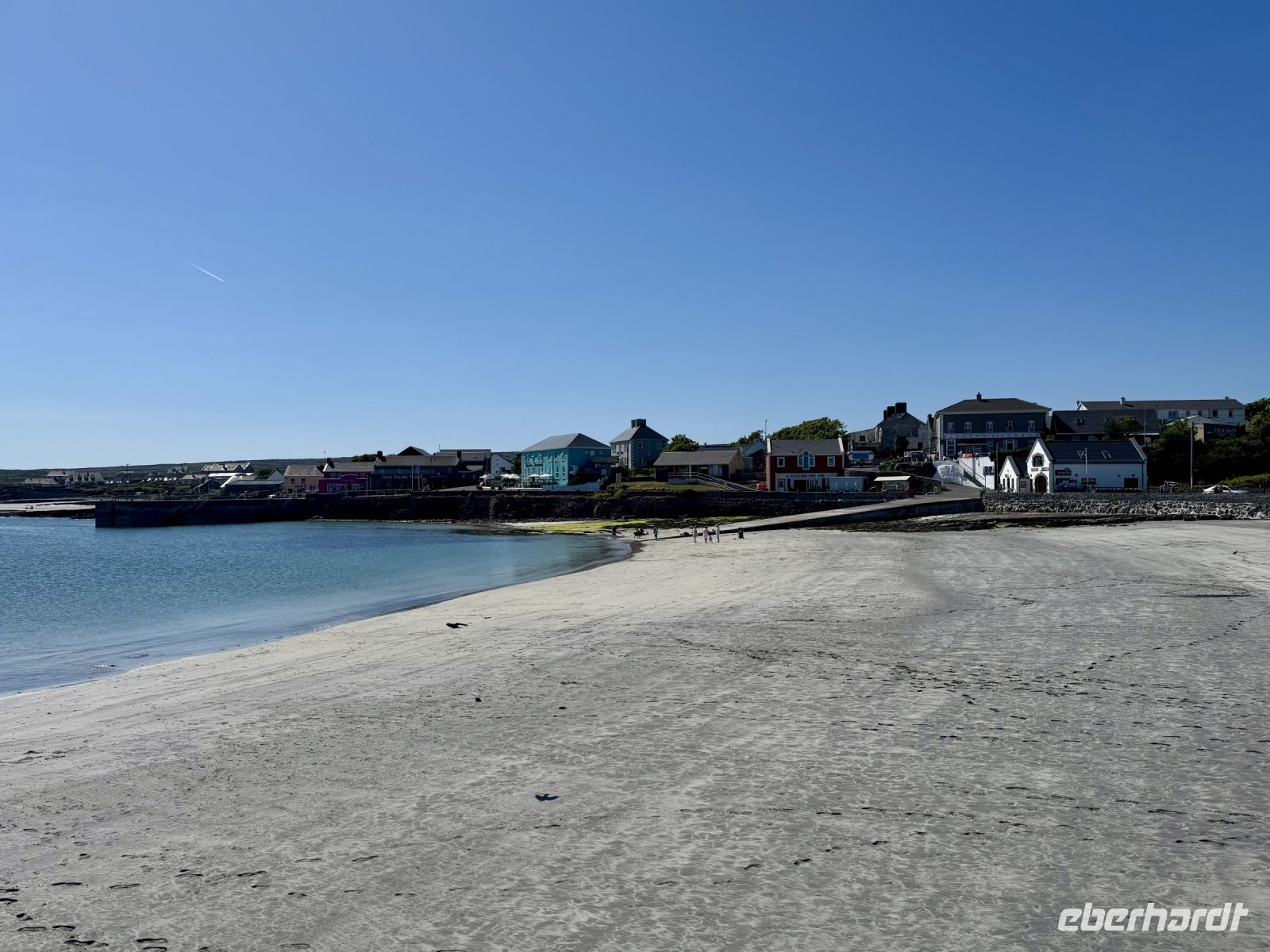 Der Tag beginnt mit einem tollen Sonnenaufgang über dem Fjord, gefolgt von einem tollen Frühstück im Leenane Hotel mit einem großen Teller Porridge für mich. Für meine Gäste gibt es wahlweise auch Rührei mit Lachs oder ein klassisches Full Irish Breakfast. Das Wetter bleibt wie die letzten Tage auch sehr schön und sonnig — meine Gäste sollen für den heutigen Ausflug auf die Aran Islands ruhig die Badesachen mitnehmen. Donal fährt uns quer durch die Berglandschaft Connemaras zum Fährhafen von Rossaveel. Die Überfahrt nach Kilronan auf der größten Aran-Insel Inishmore verläuft heute weitestgehend ruhig — von einigen kleinen Rumplern abgesehen. An der Nordküste wandern wir entlang der Trockensteinmauer gemütlich bis Cill Mhuirbhigh. Tierbegegnungen sind auf den Aran Islands immer inklusive. Diesmal begegnen wir Ponys samt einem ganz jungen Fohlen, einer süßen kleinen Katze, vielen Kühen und zwei Irischen Langhalsschafen (auch bekannt als Lamas). Während unserer Mittagspause geben uns zudem die Kegelrobben ein kleines Konzert, wobei mir die Musik gestern Abend im Hotel dann aber doch besser gefallen hat. Der Robbengesang klingt eher wie ein Klagelied. Ob es ihnen für den Mai einfach zu warm ist? Zum Glück für uns weht eine erfrischende Brise und macht die Sonne erträglich. Kurz vor dem Ziel sehen wir schon den herrlichen Sandstrand, der heute gut besucht scheint. Das gute Wetter lockt die Iren natürlich ins Wasser. Wer weiß denn schließlich, was die nächsten Wochen an Regenwetter bringen werden? Lieber vorbaden, bevor der Sommer ins Wasser fällt. Für uns empfiehlt es sich jedoch, jetzt die letzten Kraftreserven zu aktivieren und sogleich den Aufstieg zum Steinfort Dun Aengus zu wagen. Etwa 15 Minuten dauert der Aufstieg zur Steinzeitfestung am Rande der Klippen. Keine Absperrung, kein Seil schützt uns vor dem Absturz. Wer keine Höhenangst hat, kann sich auf den Bauch legen und seine Nasenspitze über den Rand schieben. Die Eisdiele und das hübsche Café in Cill Mhuirbhigh sowie der bereits erwähnte Strand buhlen nun um unsere Aufmerksamkeit, bis uns der freundliche Insulaner Owen mit seinem Kleinbus abholt und zurück nach Kilronan fährt. Dank vieler lustiger Anekdoten gestaltet sich die Fahrt sehr kurzweilig. Die Fähre bringt uns zurück nach Rossaveel, wo Donal bereits mit dem Bus auf uns wartet. Er ist extra strammen Schrittes zum Hafen zurückmarschiert, um eine Fähre eher zu nehmen, nur damit er uns gleich mit dem Bus in Empfang nehmen kann. Auf der Rückfahrt nach Leenaun machen wir spontan einen Fotostopp an einer Kirche und erfreuen uns an der Aussicht auf das Tal und die Maumturk Mountains. In unserem Hotel am Fjord erwartet uns wieder ein leckeres Abendessen, bevor wir in unsere Betten sinken und von Sonne, Sand und türkisblauem Wasser träumen.