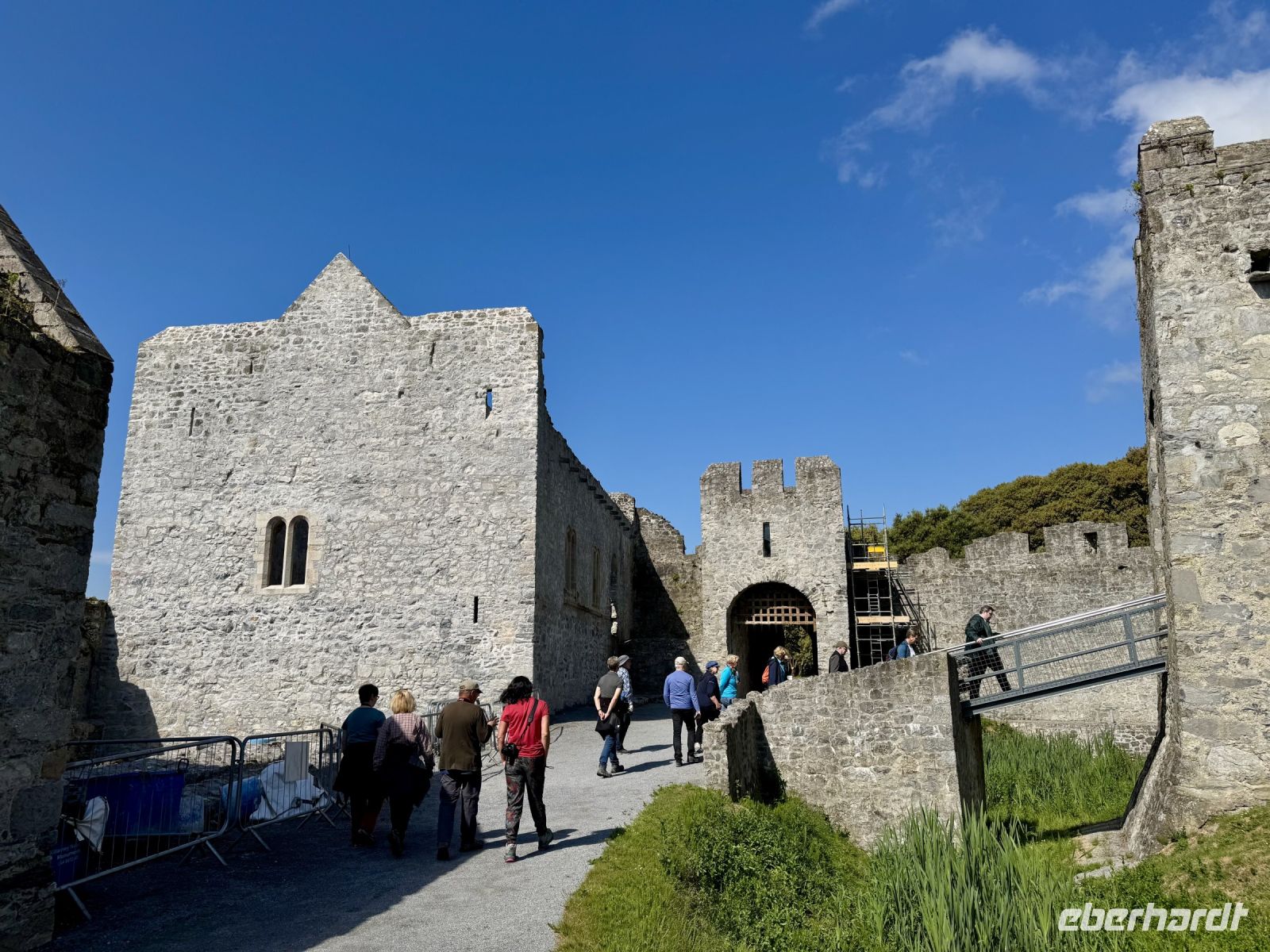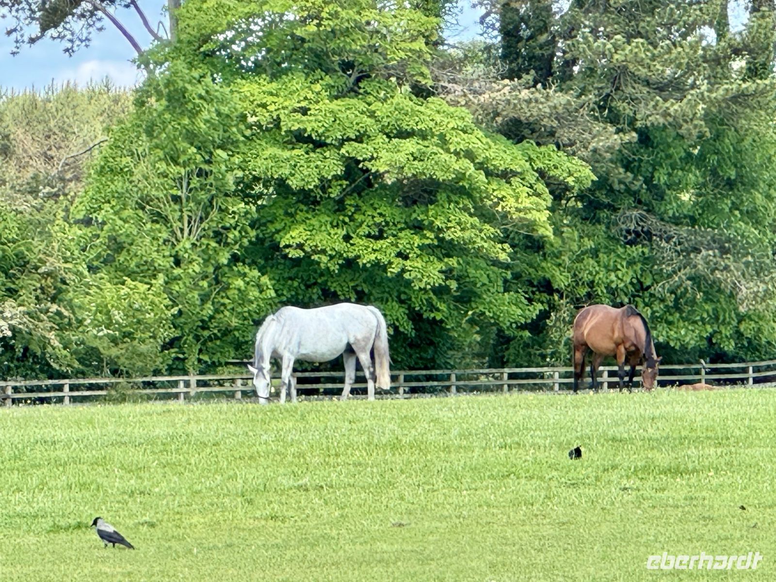 Mit dem nunmehr dritten Bus (Donal hat ihn gestern Abend noch abholen müssen) verabschieden wir uns von Tralee und der irischen Westküste. Über Adare und Kildare wollen wir zurück in Richtung Dublin fahren, aber kurz vorher in die Wicklow Mountains abbiegen. Nach einem Crashkurs in Sachen Normannen und irische Geschichte sind meine Gäste für das Tagesprogramm gerüstet. Das schöne Wetter kommt nun auch gleich mit Macht zurück. Während unserer Führung durch das Desmond Castle entpuppt sich ein schattiges Plätzchen als rares Gut. Mit unserem Tour Guide Mark erkunden wir die Ruinen der Burganlage und wollen anschließend fast schon unsere eigene kleine Festung bauen — samt Weinkeller, Verlies und Garderobe. Doch auch der kleine Ort Adare hat mit seinen historischen Gebäuden, drei Klöstern und den strohgedeckten Cottages einiges zu bieten. Deshalb machen wir hier gleich eine lange Mittagspause, bevor wir nach Kildare weiterfahren. Auf dem Irischen Nationalgestüt erwartet uns ebenfalls eine Führung — und darüber hinaus die Aussicht auf die Begegnung mit vielen süßen kleinen Fohlen. Unser Guide Ross wird mir durch sein unheimliches Faktenwissen und durch seine Eigenheit, immer rückwärts zu laufen, im Gedächtnis bleiben. Nachdem wir alle Details hinsichtlich bestimmter technischer Abläufe in einem bestimmten Gebäude geklärt haben, möchten wir jetzt aber wirklich bitte die süßen kleinen Fohlen sehen! Ross zeigt uns deshalb das neueste Mitglied der Gestütsfamilie: ein kleines Fohlen, gerade einen Monat alt, und dessen Mutter. Die schon etwas älteren Neuzugänge sind bereits draußen auf den Koppeln — jeweils fünf bis sechs Fohlen mit ihren Müttern. Ein herzerwärmender Anblick. Die meisten dösen in der Sonne. So viel wachsen und lernen in so kurzer Zeit macht richtig müde. Bei den Legenden des irischen Pferderennsports beenden wir die Tour und erkunden nun den Japanischen Garten, das Café und den Gift Shop auf eigene Faust. Oder wir gehen nochmal zurück zu den süßen kleinen Fohlen … Über die Autobahn gelangen wir dann am späten Nachmittag/frühen Abend in die Wicklow Mountains. In Newtownmountkennedy befindet sich unser letztes Hotel — und das macht uns jetzt schon etwas wehmütig. Deshalb beschließen wir, den morgigen Tag in Glendalough und Enniskerry ganz besonders zu genießen!