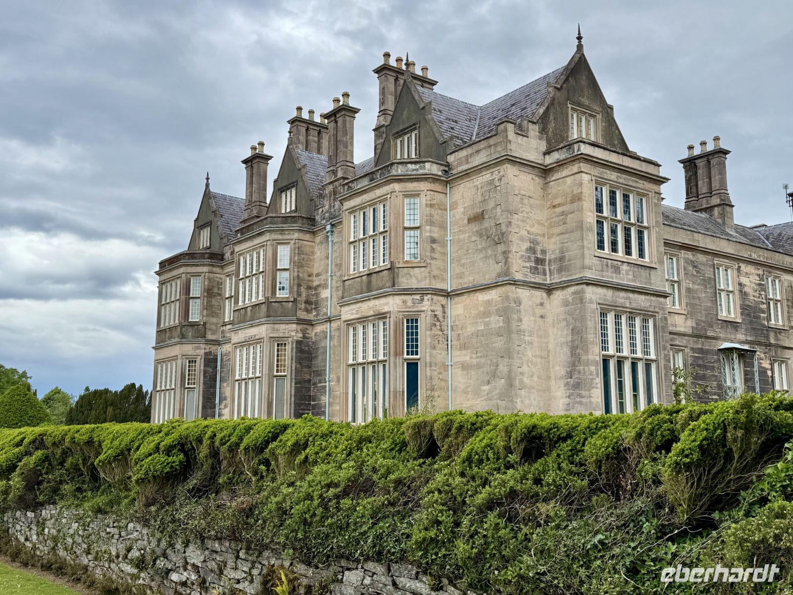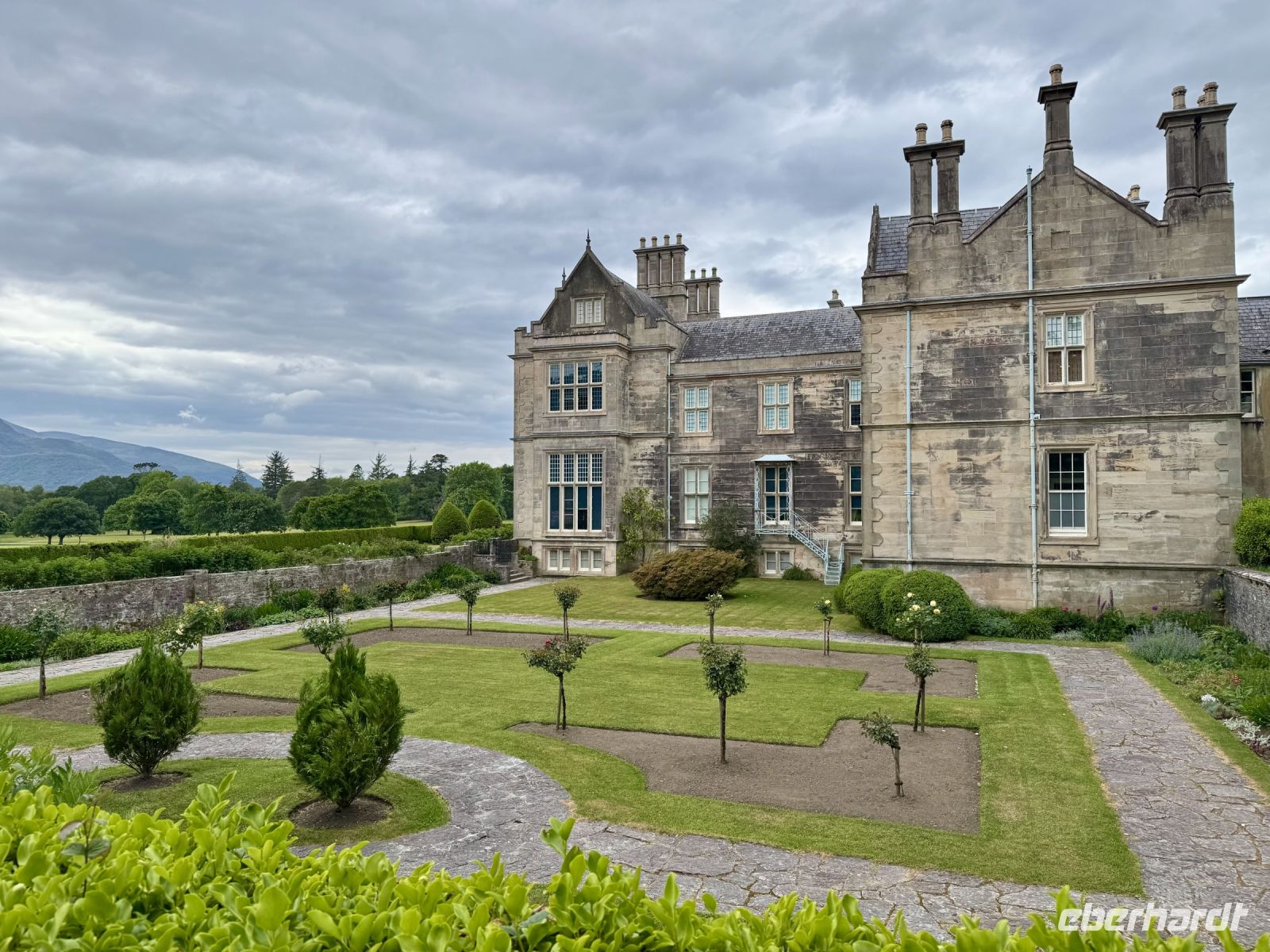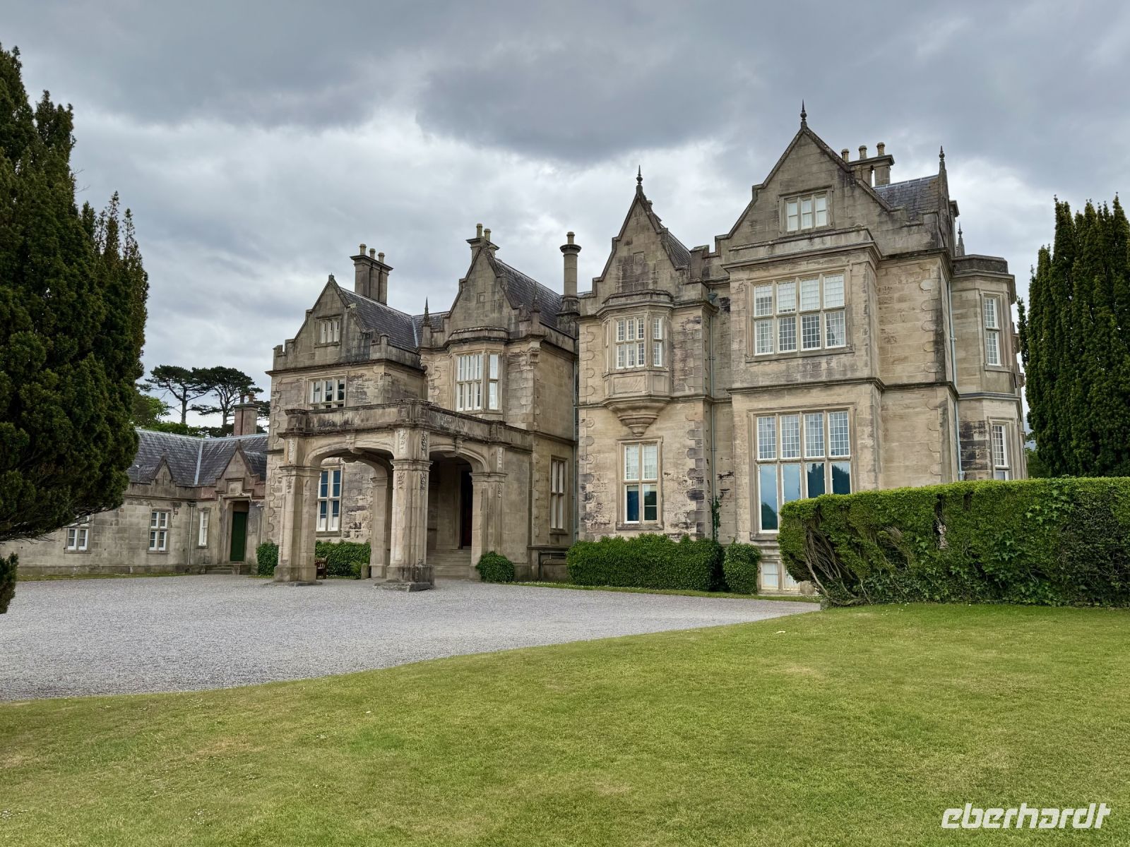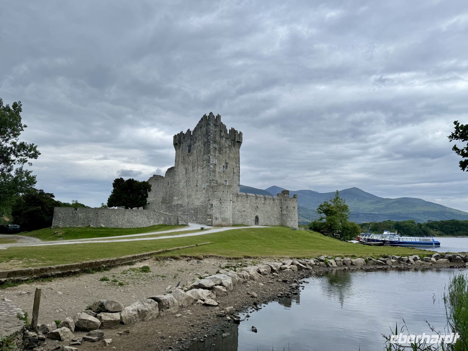 Ja, einige Gäste hatten sich zur Abwechslung mal typisch irisches Wetter gewünscht. Aber muss es denn ausgerechnet heute auf dem Ring of Kerry sein? Na ja, die höchsten Berge Irlands sehen auch von Wolken umhüllt sehr dramatisch aus, also werden wir so oder so in den Genuss beeindruckender Landschaft kommen. Unser erster Stopp ist jedoch erstmal der Supermarkt in Killorglin, wo wir uns Baguettes und Sandwiches für die Mittagspause kaufen. Dann folgt schon die erste Überraschung des Tages: ein Besuch beim Schäfer Tom und seinen drei Collie-Damen. Sie brennen förmlich darauf, uns einen Einblick in ihren Arbeitsalltag zu vermitteln, und lassen sich kaum bremsen. Anschließend noch kurz den Shop durchstöbern und ein Foto von der Halbinsel Dingle machen, dann setzen wir die Panoramafahrt fort. Was macht Donal denn jetzt? Wieso biegt er hinter Cahersiveen vom Ring of Kerry auf eine kleine Nebenstraße in Richtung Küste ab? Ich bin verwirrt und neugierig zugleich. Nach wenigen Minuten scheinen wir schon am Ziel zu sein. Ist das etwa … Nein … Oder doch? Ja, es ist (noch) eine Schokoladenfabrik! Hach, nach so vielen Jahren kennt mich Donal einfach zu gut! Als ob wir verheiratet wären! Mir tropft gleich der Zahn … und wir dürfen sogar fünf (!) Sorten Schokolade verkosten! Wozu haben wir uns eigentlich Verpflegung für die Mittagspause gekauft? Trotzdem machen wir an der Skelligs Chocolate Factory gleich unsere Mittagspause und genießen dabei wie schon auf der Fahrt die Aussicht auf die Skellig Islands vor der Küste. In Waterville haben wir eine Verabredung mit Charlie Chaplin, der jetzt ganzjährig seine Ferien hier verbringt, bevor es hinaufgeht zum Coomakista Pass. Ich traue mich heute kaum auszusteigen ohne Bleigürtel, denn ich habe etwas Angst davor, weggewedelt zu werden. Aber die Aussicht ist dann doch einfach zu verlockend. Trotz dunkler Wolken, die im Anmarsch sind, wagen wir einen Abstecher zum Derrynane Beach. Am ehemaligen Landsitz von Daniel O'Connell gibt es einen sehr schönen Strand, eine sehenswerte Gartenanlage — und Kaffee, Kuchen und Eis. Gegen Ende unserer Runde um die Iveragh-Halbinsel erreichen wir den Killarney-Nationalpark. Am Aussichtspunkt Ladies' View entschlüpft uns beim Anblick der drei Seen im Tal wie einst Queen Victoria und ihren Hofdamen ein leises, staunendes „Ah!“ und „Oh!“ Der Torc Waterfall hat auch schon mehr Wasser geführt. Doch der grüne Märchenwald und der blühende Rhododendron um uns herum sind ein Traum. Wir schlendern gemütlich zum Muckross House, wo Donal den Bus geparkt hat und uns nun auf halber Strecke entgegengestürmt kommt. Da wir gut in der Zeit liegen, können wir in Killarney außerdem noch einen spontanen Abstecher zum Ross Castle machen. Mit etwas Luft zum Abendessen sind wir zurück im Hotel in Tralee und freuen uns auf die heutigen Kreationen des Küchenchefs.
