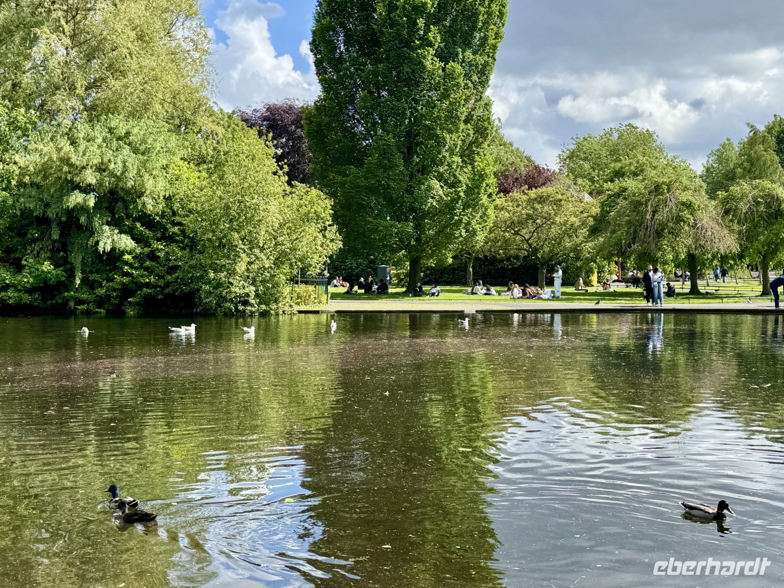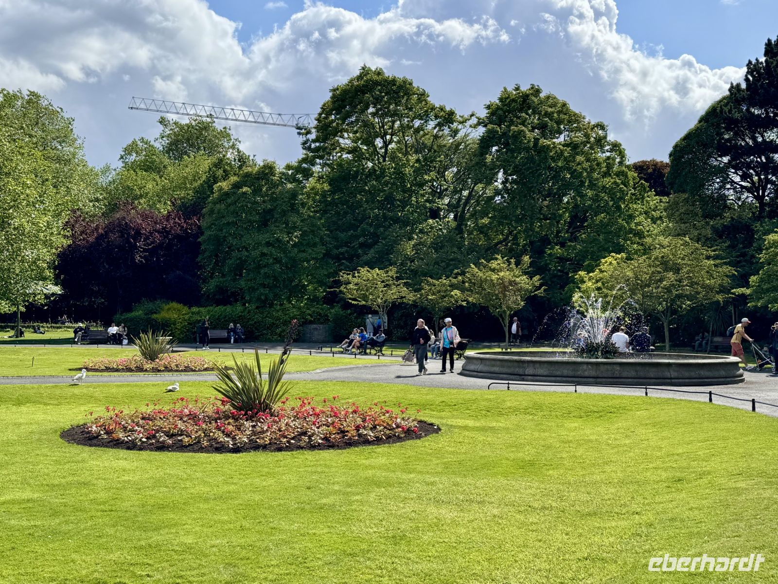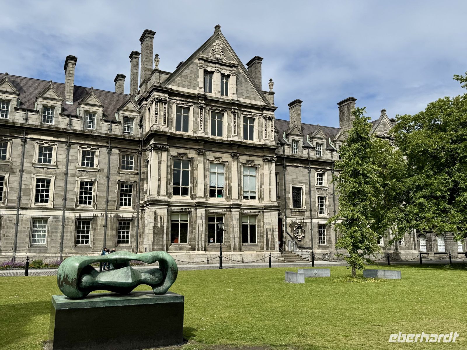 Nach einer Woche Pause geht es für mich wieder nach Irland zurück. Wie wird diesmal das Wetter werden? Wie wird meine Gruppe? Welche Überraschungen hat die Grüne Insel diesmal für uns parat? Die wichtigste Frage für heute allerdings: Werden alle Gäste heil in Dublin ankommen? Meine 19 Gäste reisen nämlich verteilt auf fünf Routen mit der Lufthansa bzw. Aer Lingus aus Frankfurt, Hamburg (über Frankfurt), Berlin, Düsseldorf und München an. Aber es geht alles gut, nur minimale Verspätung! Als sich alle auf dem Flughafen von Dublin um mich herum versammelt haben, darunter auch vier bekannte Gesichter, plumpst mir ein großer Stein vom Herzen. Auch unser Bus wartet schon auf dem Parkplatz auf uns, sodass es gleich losgehen kann! Das Wetter ist zunächst besser als erwartet — ich muss sogar meine Sonnenbrille rausholen. Durch den Tunnel gelangen wir an den River Liffey, fahren durch die Docks und schließlich auf der O'Connell Street bis zum Parnell Square, wo wir unseren Stadtführer John Brick aufsammeln. Er ist eigentlich Anwalt und möchte auf diese Weise gern sein Deutsch trainieren. Er hat sich einen schönen Plan überlegt: Wir fahren erst mit dem Bus bis zum Trinity College und gehen von dort aus zu Fuß zum Hotel. Der irische Wettergott sorgt für einen kleinen Schreckmoment, indem er einen plötzlichen kräftigen Schauer auf den Bus niederprasseln lässt. Als wir am Trinity College aussteigen, scheint jedoch wieder die Sonne. Willkommen in Irland! Inmitten der hektischen Großstadt erscheint uns das prächtige Universitätsgelände wie eine Oase der Ruhe. Am Merrion Square liegt Oscar Wilde lässig auf seinem Stein, als hätte er nur auf uns gewartet. Schelmisch blickt er in Richtung seines Elternhauses. Wegen eines Mini-Marathons ist die Innenstadt für den Verkehr gesperrt, weshalb wir sehr gemütlich durch die Straßen schlendern und rechts und links die schönen Gebäude betrachten können, wie z. B. die Georgianischen Stadthäuser mit den berühmten Doors of Dublin oder den Amtssitz des Premierministers. Später durchqueren wir den größten Stadtpark St Stephen's Green und erfreuen uns an Eichhörnchen, Schwänen und süßen Entenküken. Etwa 15 Minuten später verabschieden wir uns in Sichtweite der berühmten St Patrick's Cathedral von John, laufen um die Ecke zum Hotel und beziehen unsere Zimmer. Bis zum Abendessen haben meine Gäste noch etwas Zeit, um z. B. die Kathedrale zu besichtigen oder bis zum Vergnügungsviertel Temple Bar zu spazieren. Ein schöner erster Tag in Irland neigt sich nach einem reichhaltigen Dinner dem Ende zu. Einige zieht es noch in einen Pub — warum auch nicht, der Abend ist noch lang, die Sonne scheint und es bleibt sogar länger hell als bei uns in Deutschland!