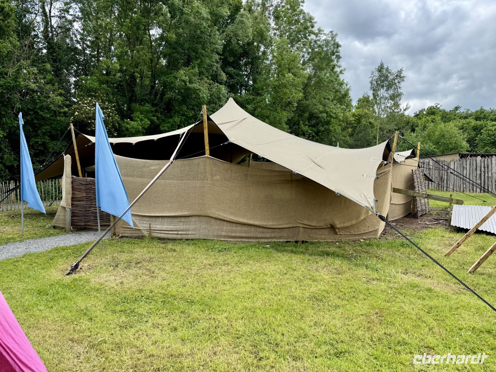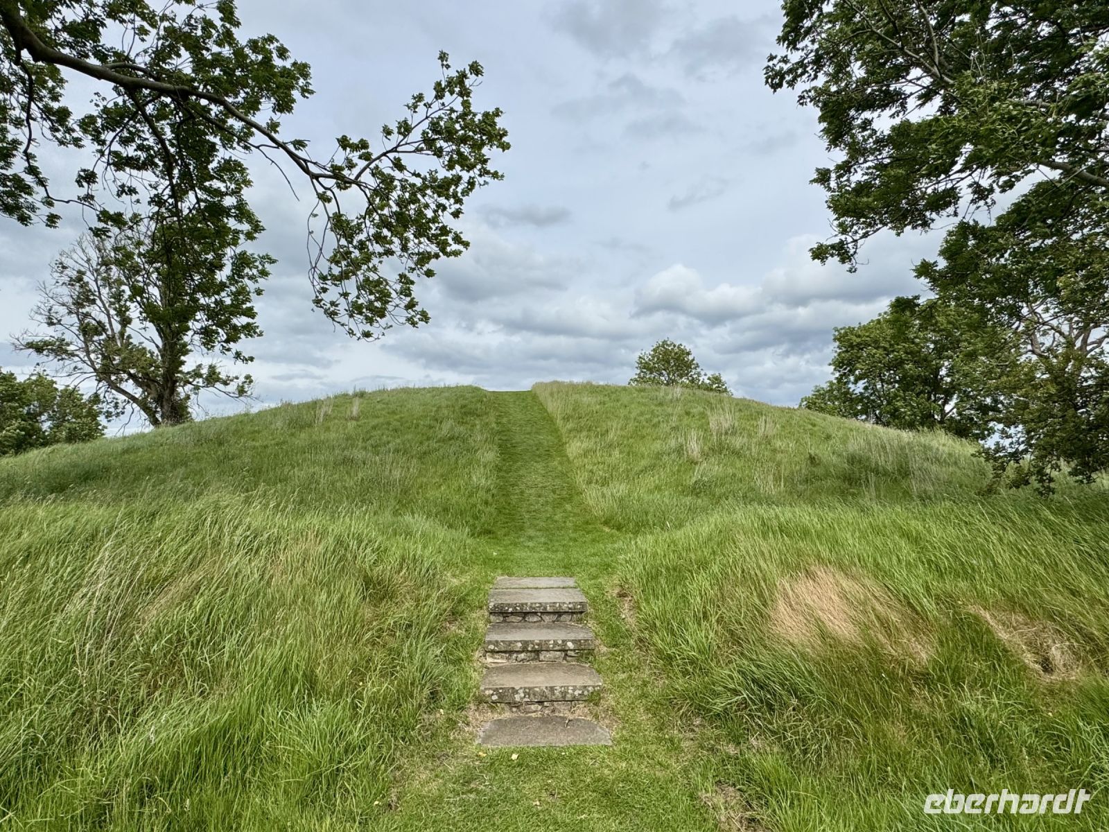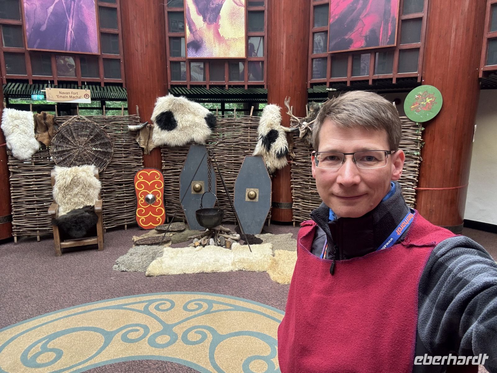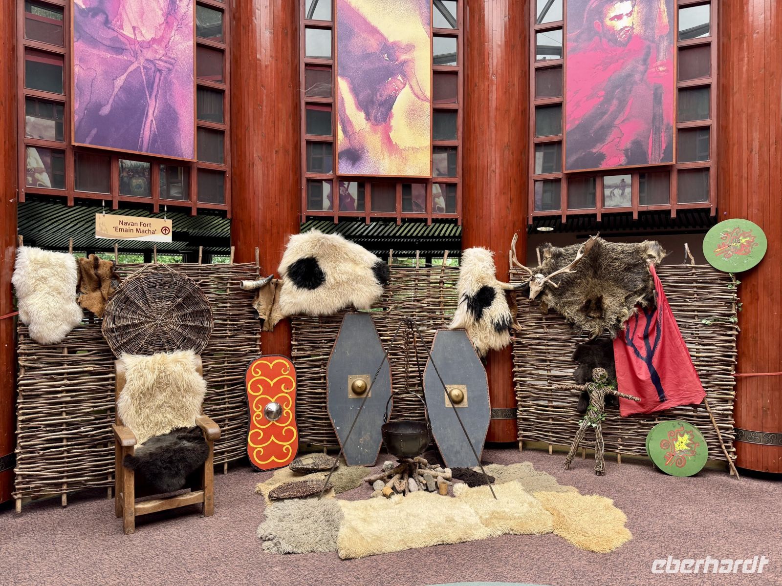 So richtig beginnt unsere Rundreise aber erst am zweiten Tag mit dem Kennenlernen unseres Fahrers Donal und ab dem Moment, in dem wir die Hauptstadt hinter uns lassen. Dublin ist Dublin, der Rest Irlands ist ganz anders, von der Architektur her, von den Menschen her, von der Landschaft her. Wir verlassen also Dublin gen Norden und machen uns vom Hill of Slane einen ersten Eindruck von der Insel aus einer erhöhten Perspektive. Noch ist es schön hell und sonnig, blauer Himmel und weiße Wolken wechseln sich über unseren Köpfen ab. Der Heilige Patrick bestimmt heute unseren Reisepfad, hat er doch hier auf dem Hügel einst das erste Osterfeuer entzündet. Von einem weiteren Heiligen wurde im 5. Jahrhundert Monasterboice gegründet, das mit den Überresten eines Rundturms und mehrerer Kirchen sowie gleich drei Hochkreuzen alle Merkmale eines typischen irischen frühchristlichen Klosters vereint — und unser nächstes Ziel auf unserer Zeit- und inoffiziellen Pilgerreise darstellt. Nach einer frühen Mittagspause an einer Raststätte überqueren wir die Grenze nach Nordirland und steuern Armagh an. Dort sind dem Heiligen Patrick gleich zwei Kathedralen geweiht, da er an diesem Ort die erste dauerhafte Kirche in Irland errichten ließ. Unser Fokus verschiebt sich nun aber von den Missionaren zu den missionierten Kelten und deren Religion. Die steht im Zentrum unseres Besuchs beim Navan Fort. Im Kino erhalten wir quasi einen Crashkurs in Bezug auf die keltische Sagenwelt, bevor wir auf echte Kelten losgelassen werden, die uns vorsichtig mit Speeren im Anschlag in Empfang nehmen. Schnell übernimmt jedoch die Neugier auf beiden Seiten und wir werden mit Tee und Keksen freundlich bewirtet. Der Schmied ist immer noch auf Brautsuche, doch alle Vermittlungsversuche scheitern erneut. Trotzdem unterweist er uns im Kampf mit Speer, Schild und Schwert. So sind wir gut vorbereitet auf eventuelle Wegelagerer, die uns auf der Weiterfahrt nach Letterkenny aufzulauern versuchen. Unser Besuch beim Navan Fort ist jedoch noch nicht zu Ende. Entlang mehrerer Stationen erklimmen wir den namensgebenden Hügel, der aber nie ein Fort, sondern von Anfang an ein geheimnisumwobener Tempel gewesen ist. Unser Ruf als Furcht einflößende Kriegerinnen und Krieger scheint uns vorauszueilen, denn die weitere Fahrt in den Norden verläuft ohne Probleme. Allein die Wolken und der Regen holen uns von Süden kommend am Station House Hotel schließlich ein. Für heute kein Problem, denn wir wünschen uns jetzt nur noch ein leckeres Abendessen mit viel Kartoffelbrei und dazu ein Pint Guinness!