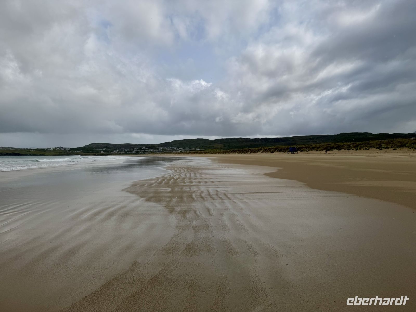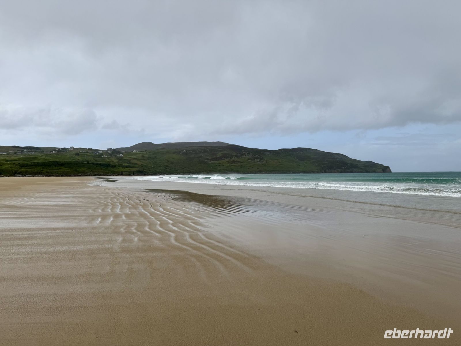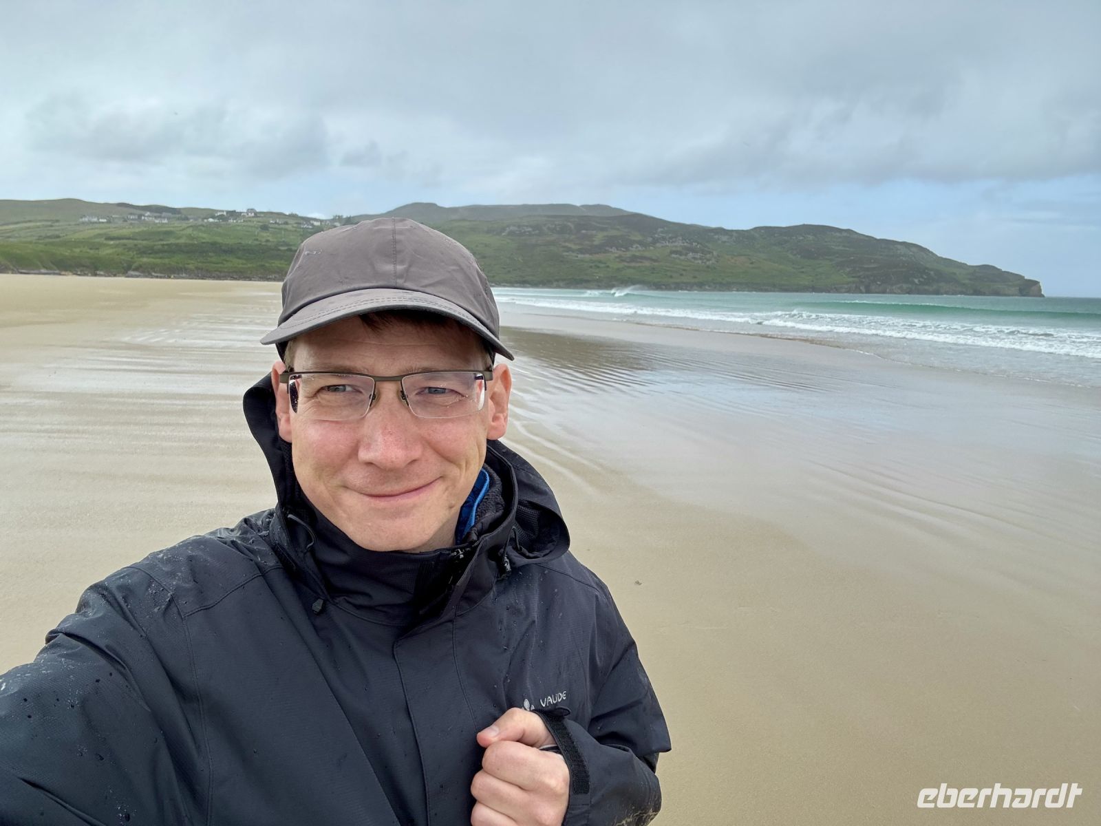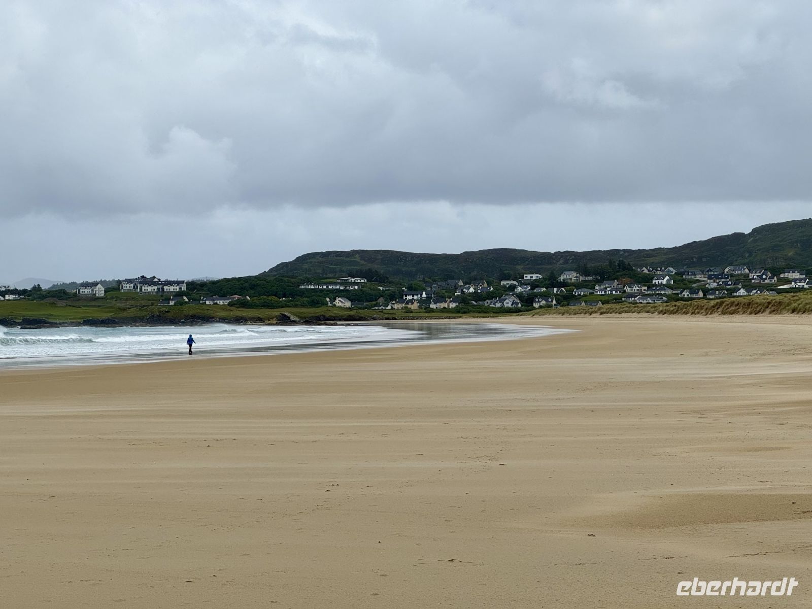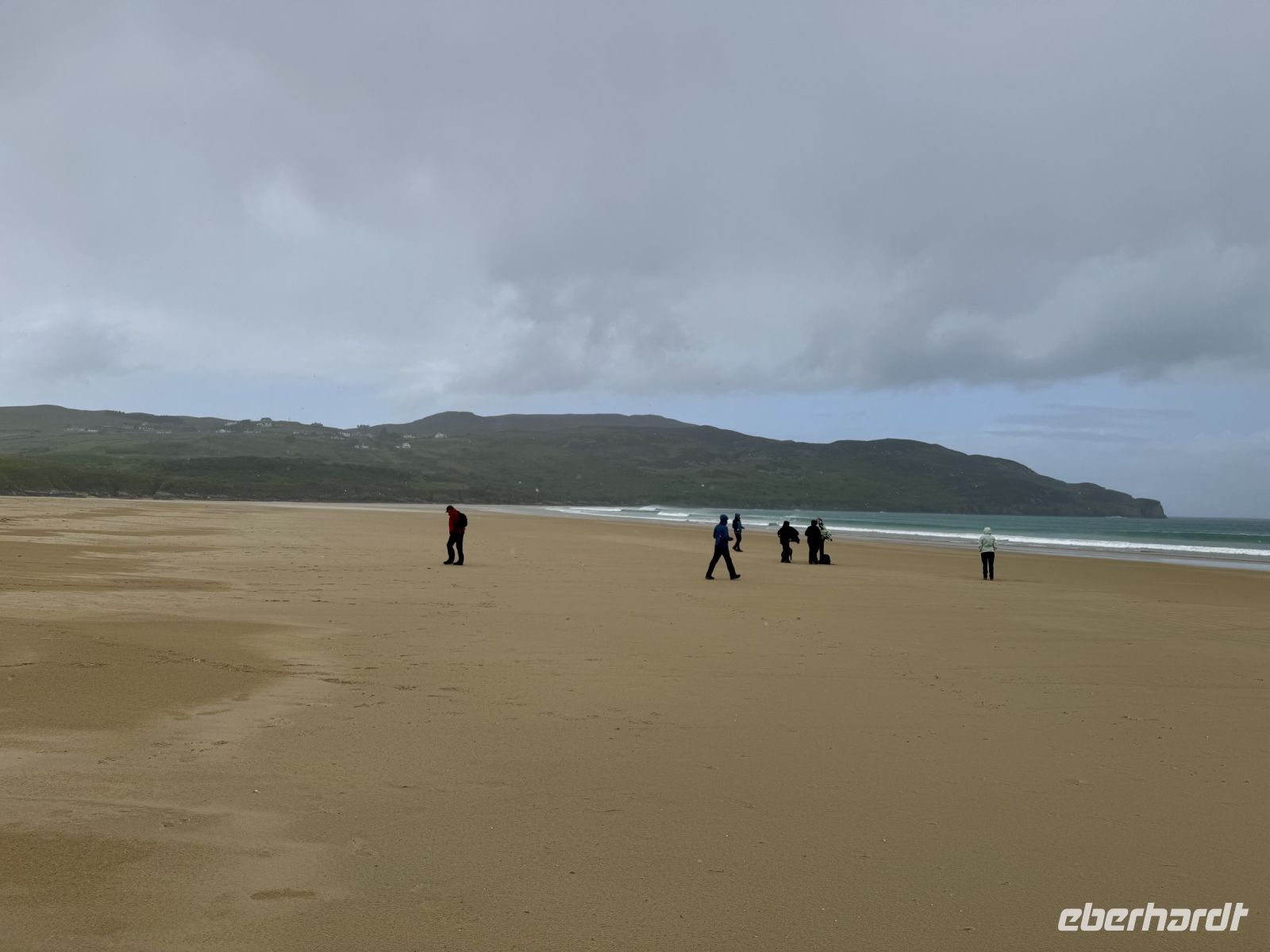 Bewölkt, aber kein Regen für den Tag — so lautet beim Frühstück Donals Prognose nach einem Blick auf sein Telefon. Nun, er ist zu seinem Glück (ein sehr guter) Busfahrer und kein Meteorologe, sonst hätte ich heute wohl Donald Trump zitieren müssen: „You're fired!“ Im Glenveagh-Nationalpark können wir nach der Filmvorführung im Besucherzentrum nämlich nicht direkt zu unserer Wanderung aufbrechen, sondern müssen uns am Castle erstmal einen Unterschlupf suchen. Um es positiv zu formulieren: perfekte Testbedingungen für meine neue Regenhose! Geduld ist in Irland wettertechnisch immer hilfreich, denn die nächste Jahreszeit ist meistens schon im Anmarsch. So können auch wir am Lough Veagh entlang tatsächlich eine sehr schöne und trockene Wanderung absolvieren. Wer hätte das vor zehn Minuten gedacht? Am Umkehrpunkt nehmen wir aber doch lieber im Inneren des kleinen Cottages Platz und nutzen die Pause gleich für eine Vorstellungsrunde. Von Schleswig-Holstein bis Bayern sind diesmal viele Bundesländer vertreten. Nachdem wir wieder zurück am Castle sind, können meine Gäste mit Donal noch hinauf zum Aussichtspunkt laufen. (Aufgrund meiner Bronchitis setze ich hier diesmal aus.) Von oben hat man einen tollen Blick über das ganze Tal. Schnell ein paar Fotos knipsen, denn die nächste Regenwolke ist schon im Anmarsch! Es bleibt noch ausreichend Freizeit für einen Bummel durch die Parkanlagen und den viktorianischen Walled Garden, einen Besuch im Schlosscafé oder auch im neuen Restaurant im Besucherzentrum. Im weiteren Verlauf des Nachmittags machen wir noch eine kleine Spritztour durch den Norden von Donegal, bei der wir auch den höchsten Berg der Grafschaft sehen, den Mount Errigal. Am Strand von Dunfanaghy sorgen heftiger Wind und Regen für nasse Rückenpartien, was ein ganz mutiges Exemplar der Gattung Reisegast jedoch nicht von einem Gang ins Meer abhält. Mit der Abfahrt wird es wieder schön — na ja, nicht immer kommt das bestellte Wetterpaket zum gewünschten Zeitpunkt, was jeder DHL- und Amazon-Kunde gewiss nachvollziehen kann. Etwa eine halbe Stunde später fahren wir auf der von vielen Pubs gesäumten Main Street durch Letterkenny und erreichen alsbald das Station House Hotel. Donal darf nun noch den Sand aus dem Bus kehren, dann hat auch er seinen wohlverdienten Feierabend.