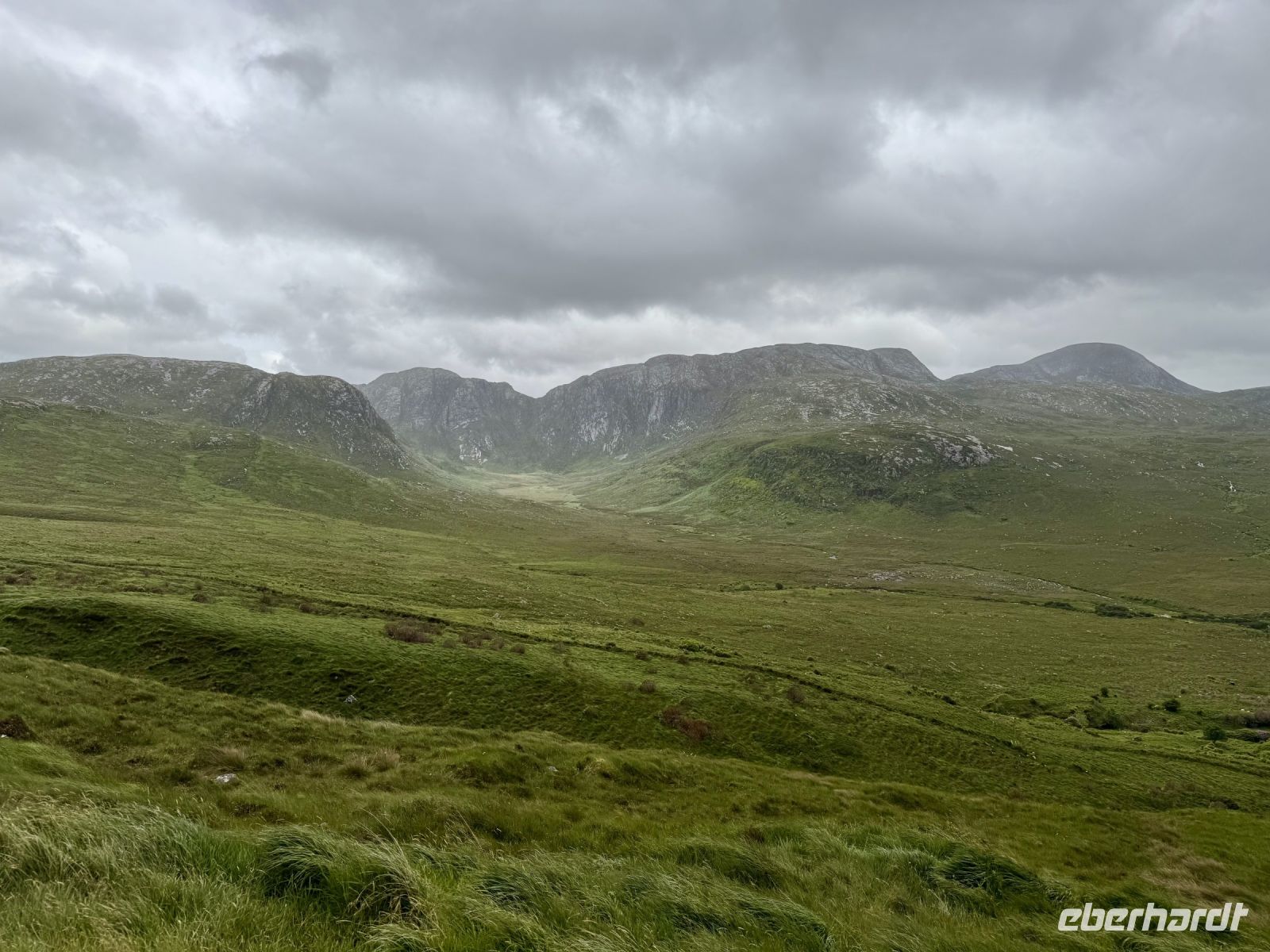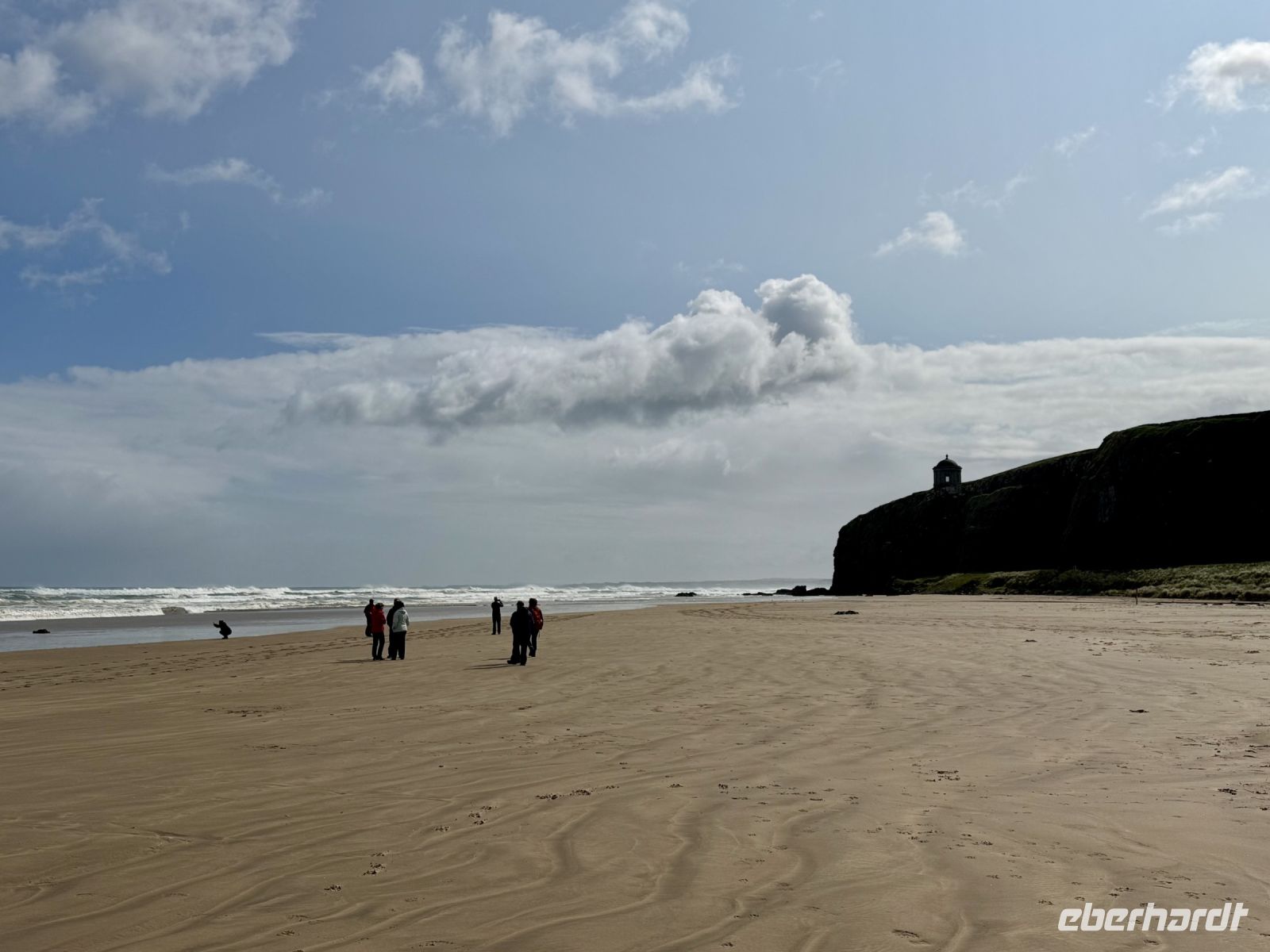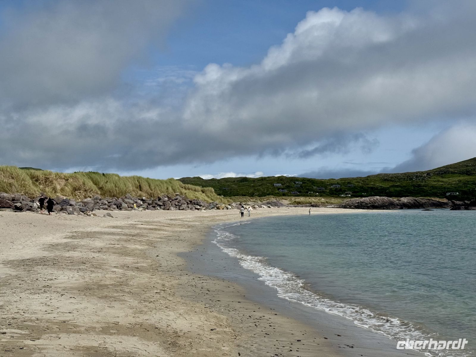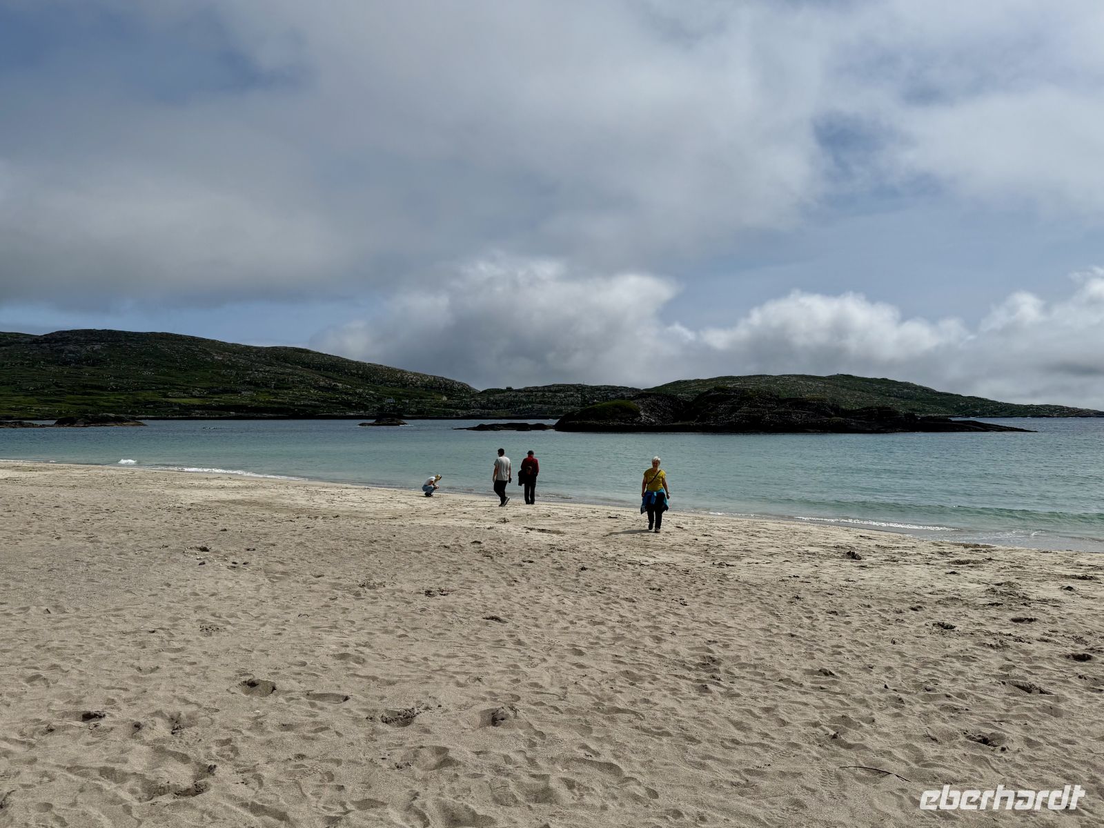 Bewölkt, aber kein Regen für den Tag — so lautet beim Frühstück Donals Prognose nach einem Blick auf sein Telefon. Nun, er ist zu seinem Glück (ein sehr guter) Busfahrer und kein Meteorologe, sonst hätte ich heute wohl Donald Trump zitieren müssen: „You're fired!“ Im Glenveagh-Nationalpark können wir nach der Filmvorführung im Besucherzentrum nämlich nicht direkt zu unserer Wanderung aufbrechen, sondern müssen uns am Castle erstmal einen Unterschlupf suchen. Um es positiv zu formulieren: perfekte Testbedingungen für meine neue Regenhose! Geduld ist in Irland wettertechnisch immer hilfreich, denn die nächste Jahreszeit ist meistens schon im Anmarsch. So können auch wir am Lough Veagh entlang tatsächlich eine sehr schöne und trockene Wanderung absolvieren. Wer hätte das vor zehn Minuten gedacht? Am Umkehrpunkt nehmen wir aber doch lieber im Inneren des kleinen Cottages Platz und nutzen die Pause gleich für eine Vorstellungsrunde. Von Schleswig-Holstein bis Bayern sind diesmal viele Bundesländer vertreten. Nachdem wir wieder zurück am Castle sind, können meine Gäste mit Donal noch hinauf zum Aussichtspunkt laufen. (Aufgrund meiner Bronchitis setze ich hier diesmal aus.) Von oben hat man einen tollen Blick über das ganze Tal. Schnell ein paar Fotos knipsen, denn die nächste Regenwolke ist schon im Anmarsch! Es bleibt noch ausreichend Freizeit für einen Bummel durch die Parkanlagen und den viktorianischen Walled Garden, einen Besuch im Schlosscafé oder auch im neuen Restaurant im Besucherzentrum. Im weiteren Verlauf des Nachmittags machen wir noch eine kleine Spritztour durch den Norden von Donegal, bei der wir auch den höchsten Berg der Grafschaft sehen, den Mount Errigal. Am Strand von Dunfanaghy sorgen heftiger Wind und Regen für nasse Rückenpartien, was ein ganz mutiges Exemplar der Gattung Reisegast jedoch nicht von einem Gang ins Meer abhält. Mit der Abfahrt wird es wieder schön — na ja, nicht immer kommt das bestellte Wetterpaket zum gewünschten Zeitpunkt, was jeder DHL- und Amazon-Kunde gewiss nachvollziehen kann. Etwa eine halbe Stunde später fahren wir auf der von vielen Pubs gesäumten Main Street durch Letterkenny und erreichen alsbald das Station House Hotel. Donal darf nun noch den Sand aus dem Bus kehren, dann hat auch er seinen wohlverdienten Feierabend.