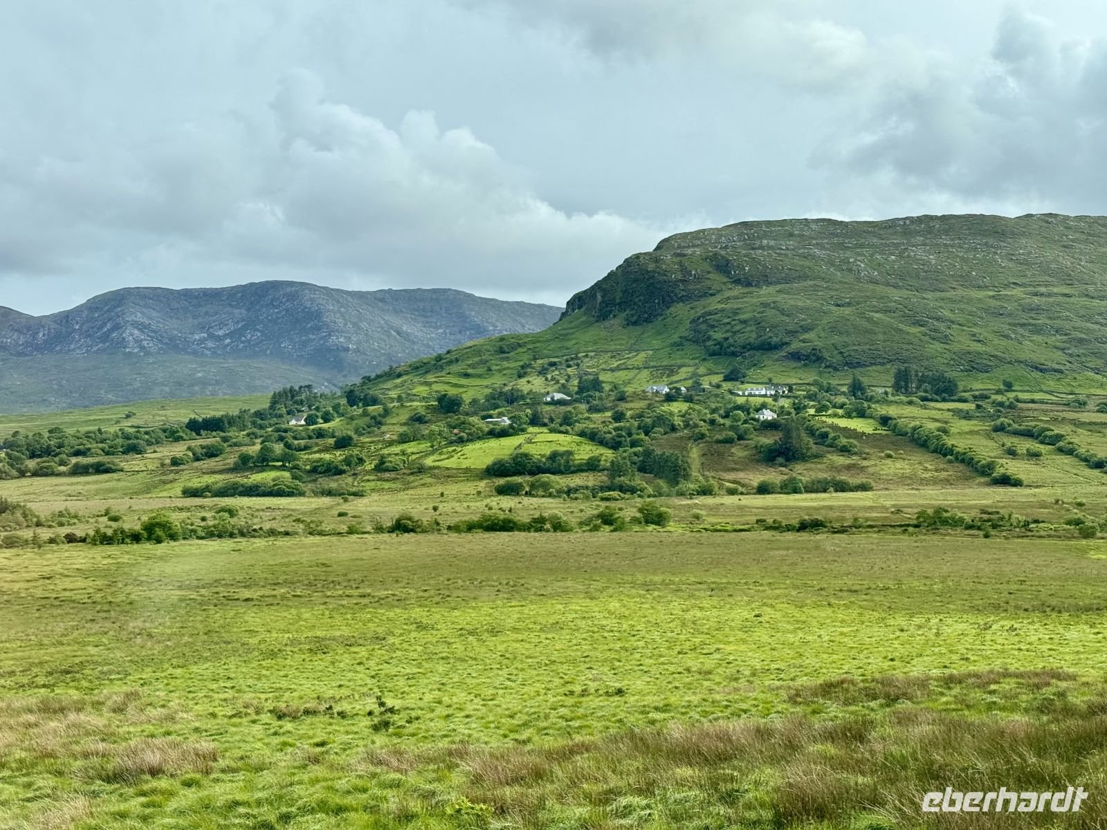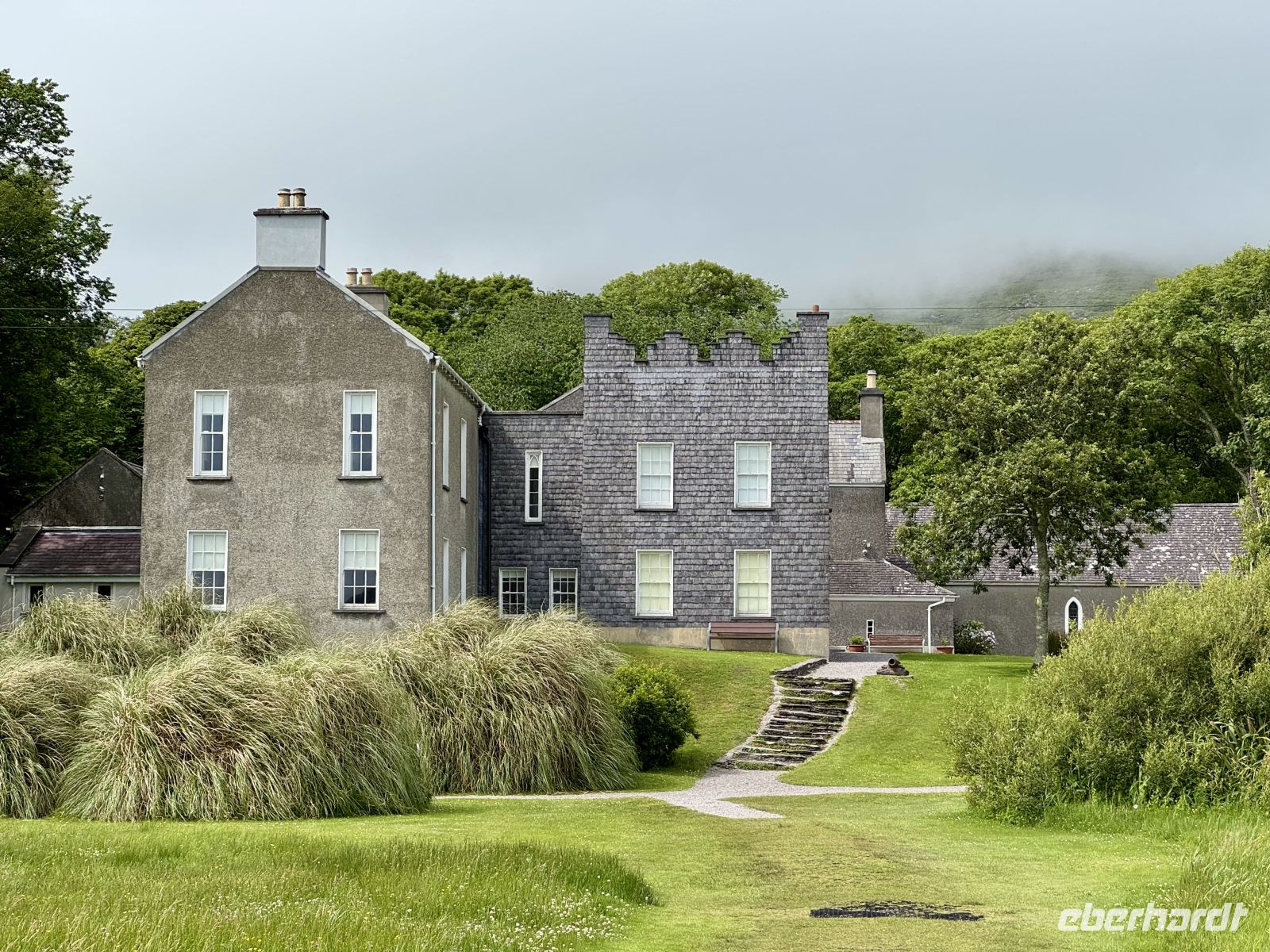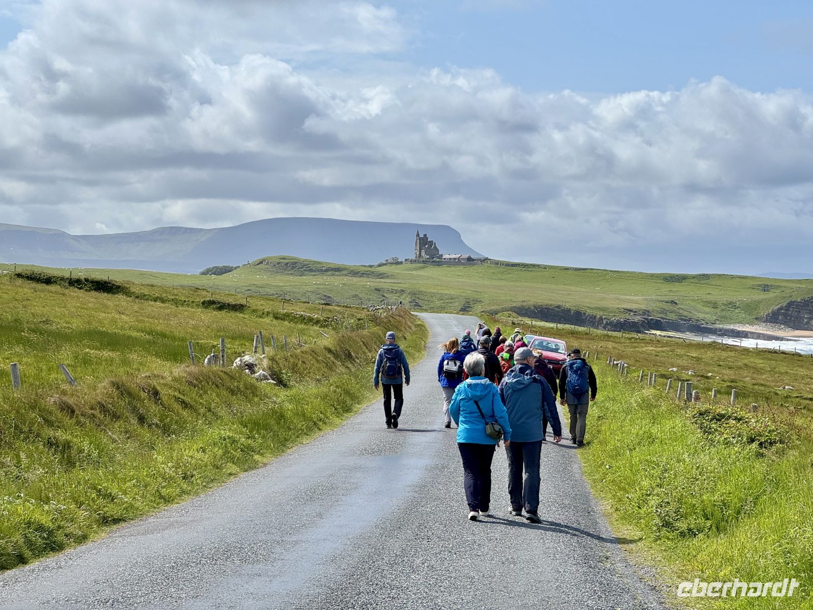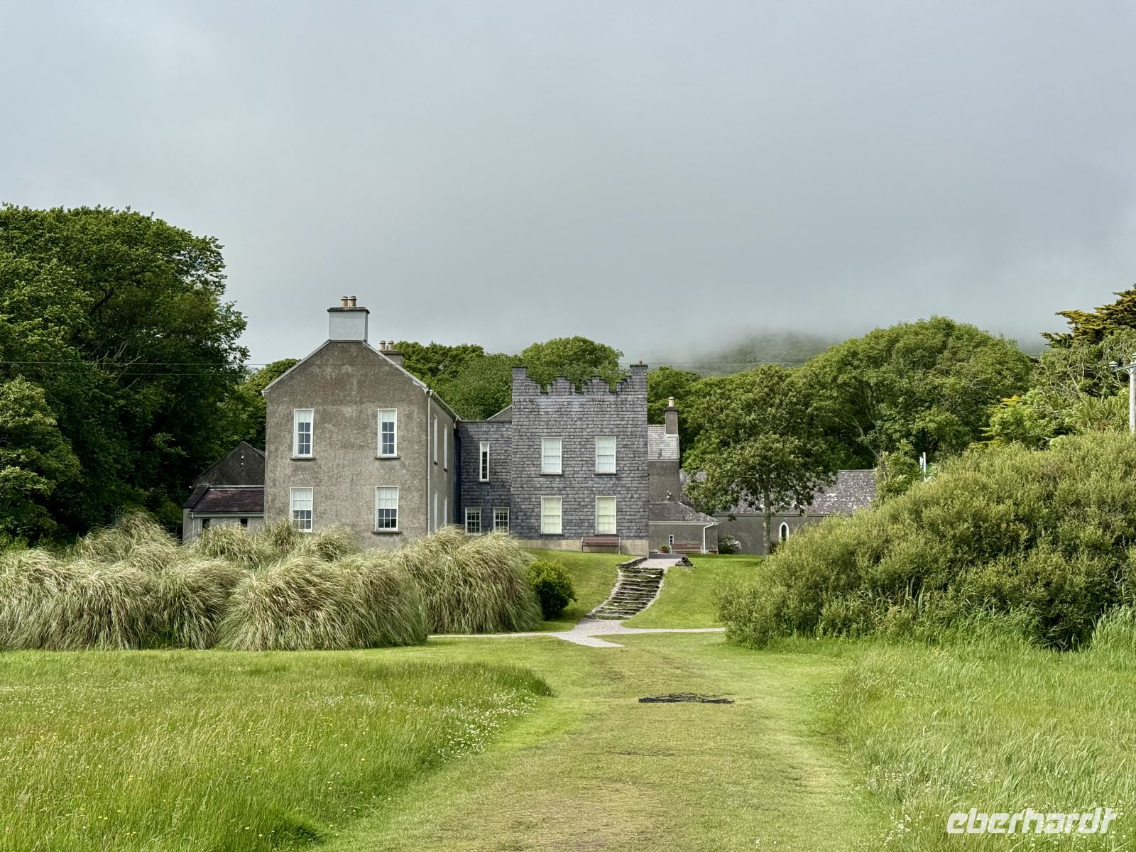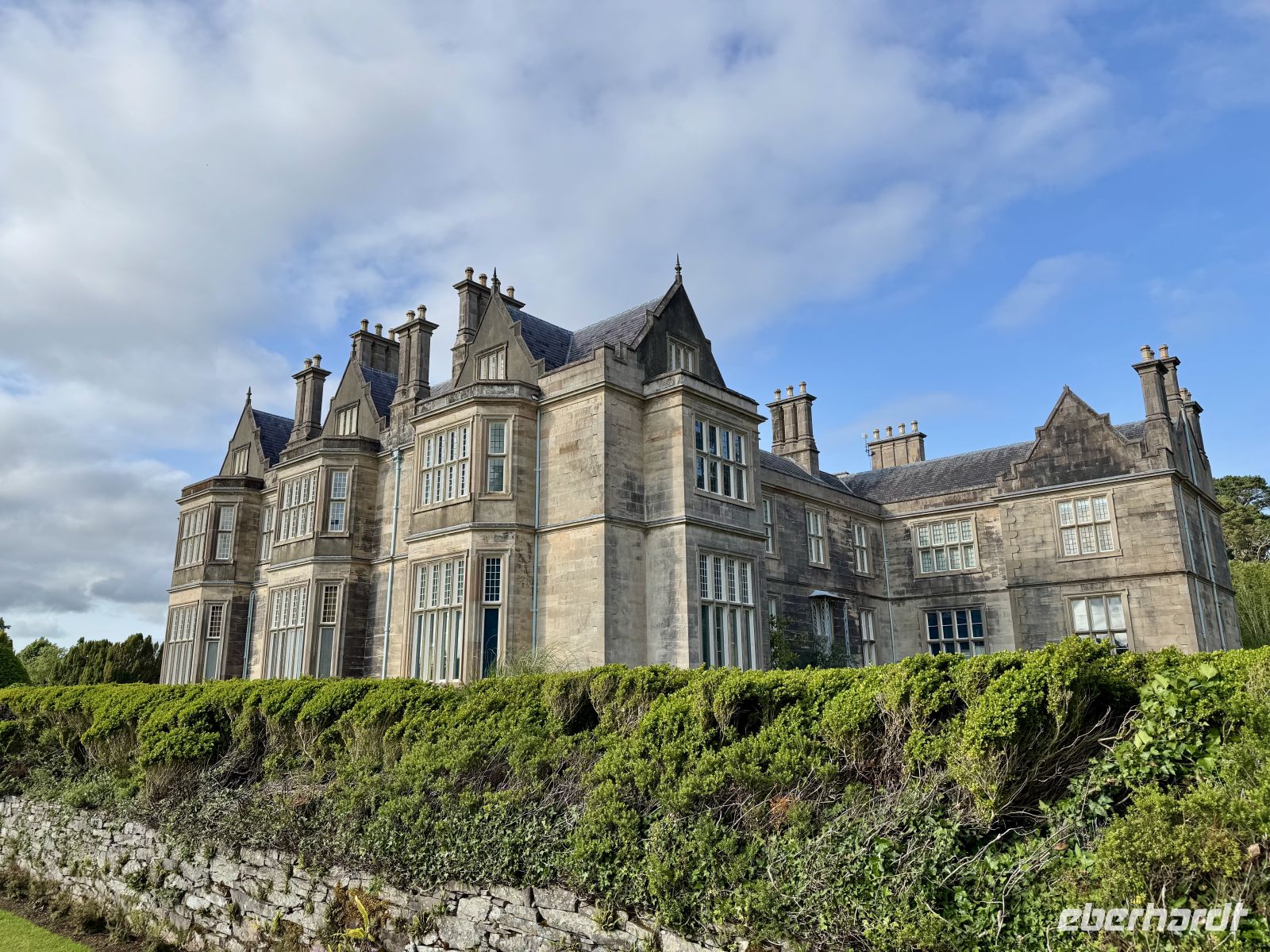 Bewölkt, aber kein Regen für den Tag — so lautet beim Frühstück Donals Prognose nach einem Blick auf sein Telefon. Nun, er ist zu seinem Glück (ein sehr guter) Busfahrer und kein Meteorologe, sonst hätte ich heute wohl Donald Trump zitieren müssen: „You're fired!“ Im Glenveagh-Nationalpark können wir nach der Filmvorführung im Besucherzentrum nämlich nicht direkt zu unserer Wanderung aufbrechen, sondern müssen uns am Castle erstmal einen Unterschlupf suchen. Um es positiv zu formulieren: perfekte Testbedingungen für meine neue Regenhose! Geduld ist in Irland wettertechnisch immer hilfreich, denn die nächste Jahreszeit ist meistens schon im Anmarsch. So können auch wir am Lough Veagh entlang tatsächlich eine sehr schöne und trockene Wanderung absolvieren. Wer hätte das vor zehn Minuten gedacht? Am Umkehrpunkt nehmen wir aber doch lieber im Inneren des kleinen Cottages Platz und nutzen die Pause gleich für eine Vorstellungsrunde. Von Schleswig-Holstein bis Bayern sind diesmal viele Bundesländer vertreten. Nachdem wir wieder zurück am Castle sind, können meine Gäste mit Donal noch hinauf zum Aussichtspunkt laufen. (Aufgrund meiner Bronchitis setze ich hier diesmal aus.) Von oben hat man einen tollen Blick über das ganze Tal. Schnell ein paar Fotos knipsen, denn die nächste Regenwolke ist schon im Anmarsch! Es bleibt noch ausreichend Freizeit für einen Bummel durch die Parkanlagen und den viktorianischen Walled Garden, einen Besuch im Schlosscafé oder auch im neuen Restaurant im Besucherzentrum. Im weiteren Verlauf des Nachmittags machen wir noch eine kleine Spritztour durch den Norden von Donegal, bei der wir auch den höchsten Berg der Grafschaft sehen, den Mount Errigal. Am Strand von Dunfanaghy sorgen heftiger Wind und Regen für nasse Rückenpartien, was ein ganz mutiges Exemplar der Gattung Reisegast jedoch nicht von einem Gang ins Meer abhält. Mit der Abfahrt wird es wieder schön — na ja, nicht immer kommt das bestellte Wetterpaket zum gewünschten Zeitpunkt, was jeder DHL- und Amazon-Kunde gewiss nachvollziehen kann. Etwa eine halbe Stunde später fahren wir auf der von vielen Pubs gesäumten Main Street durch Letterkenny und erreichen alsbald das Station House Hotel. Donal darf nun noch den Sand aus dem Bus kehren, dann hat auch er seinen wohlverdienten Feierabend.