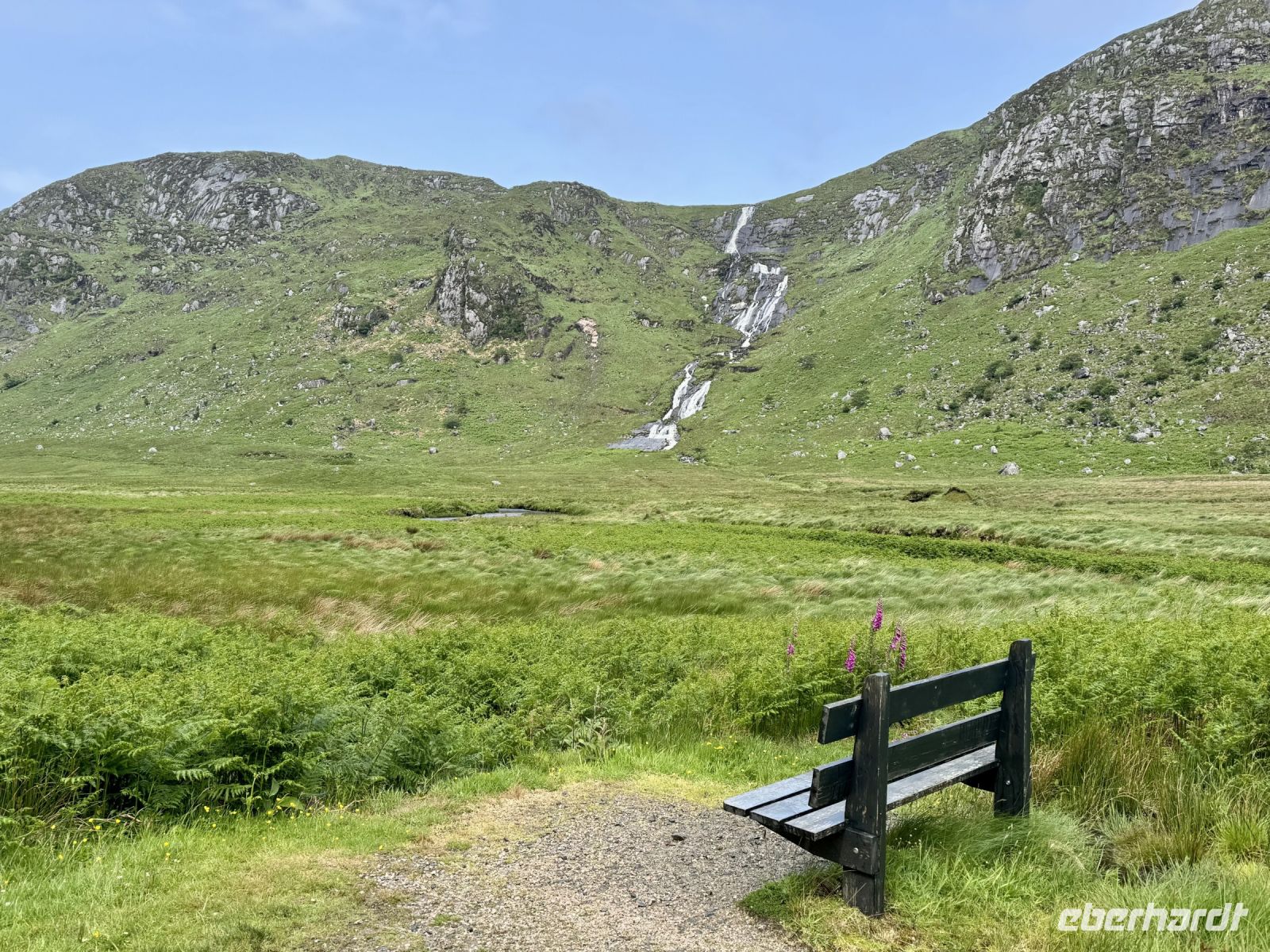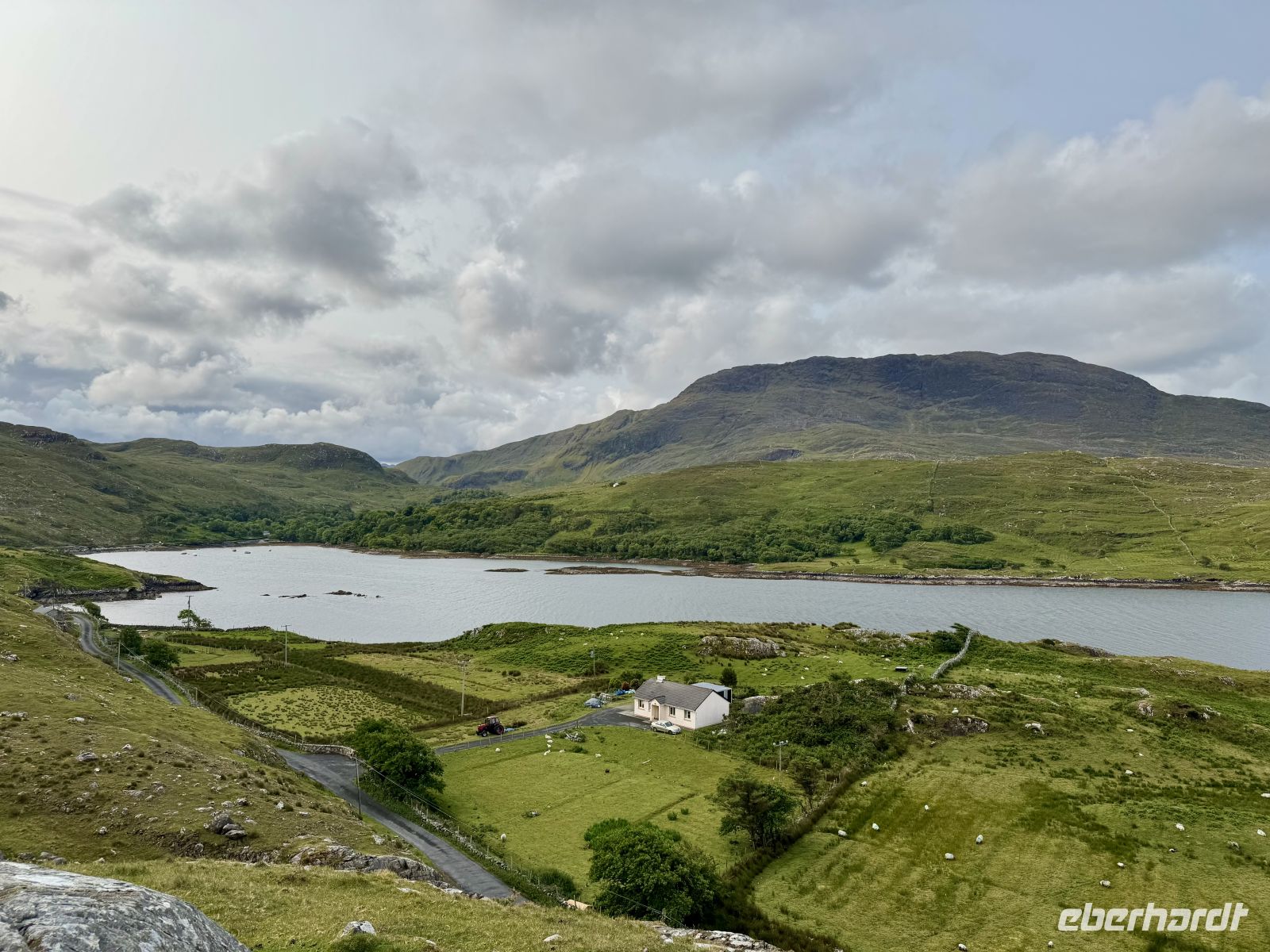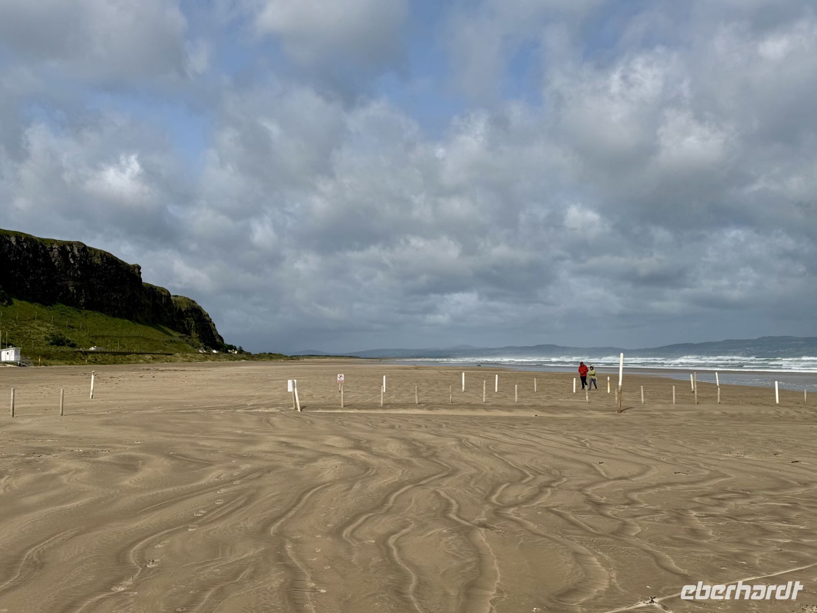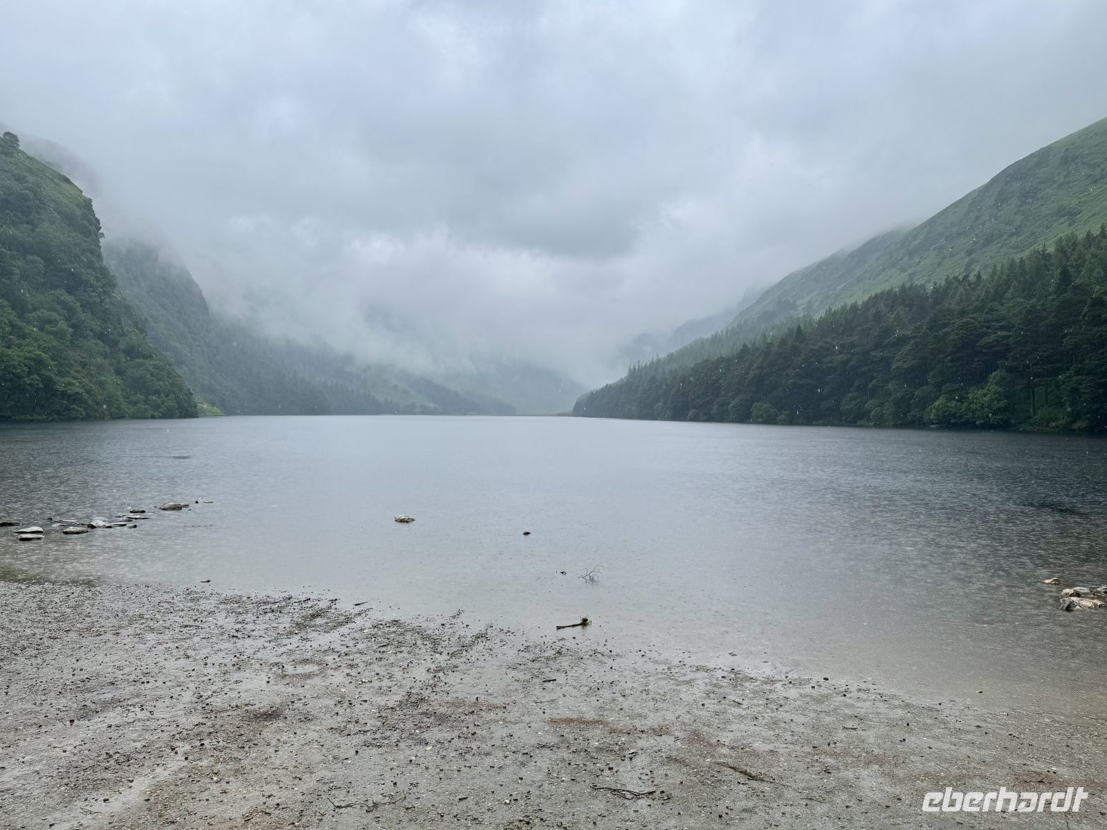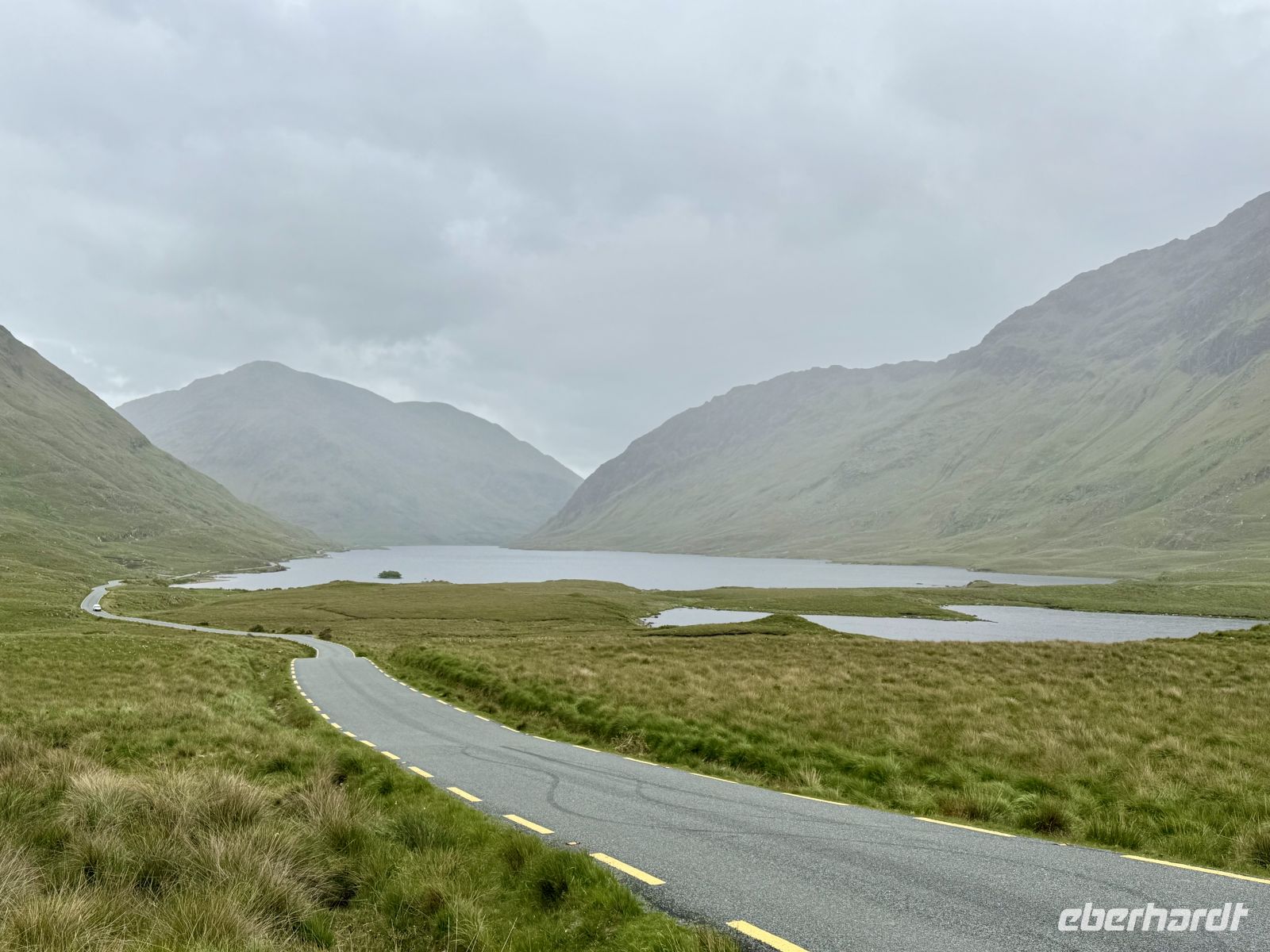 Bewölkt, aber kein Regen für den Tag — so lautet beim Frühstück Donals Prognose nach einem Blick auf sein Telefon. Nun, er ist zu seinem Glück (ein sehr guter) Busfahrer und kein Meteorologe, sonst hätte ich heute wohl Donald Trump zitieren müssen: „You're fired!“ Im Glenveagh-Nationalpark können wir nach der Filmvorführung im Besucherzentrum nämlich nicht direkt zu unserer Wanderung aufbrechen, sondern müssen uns am Castle erstmal einen Unterschlupf suchen. Um es positiv zu formulieren: perfekte Testbedingungen für meine neue Regenhose! Geduld ist in Irland wettertechnisch immer hilfreich, denn die nächste Jahreszeit ist meistens schon im Anmarsch. So können auch wir am Lough Veagh entlang tatsächlich eine sehr schöne und trockene Wanderung absolvieren. Wer hätte das vor zehn Minuten gedacht? Am Umkehrpunkt nehmen wir aber doch lieber im Inneren des kleinen Cottages Platz und nutzen die Pause gleich für eine Vorstellungsrunde. Von Schleswig-Holstein bis Bayern sind diesmal viele Bundesländer vertreten. Nachdem wir wieder zurück am Castle sind, können meine Gäste mit Donal noch hinauf zum Aussichtspunkt laufen. (Aufgrund meiner Bronchitis setze ich hier diesmal aus.) Von oben hat man einen tollen Blick über das ganze Tal. Schnell ein paar Fotos knipsen, denn die nächste Regenwolke ist schon im Anmarsch! Es bleibt noch ausreichend Freizeit für einen Bummel durch die Parkanlagen und den viktorianischen Walled Garden, einen Besuch im Schlosscafé oder auch im neuen Restaurant im Besucherzentrum. Im weiteren Verlauf des Nachmittags machen wir noch eine kleine Spritztour durch den Norden von Donegal, bei der wir auch den höchsten Berg der Grafschaft sehen, den Mount Errigal. Am Strand von Dunfanaghy sorgen heftiger Wind und Regen für nasse Rückenpartien, was ein ganz mutiges Exemplar der Gattung Reisegast jedoch nicht von einem Gang ins Meer abhält. Mit der Abfahrt wird es wieder schön — na ja, nicht immer kommt das bestellte Wetterpaket zum gewünschten Zeitpunkt, was jeder DHL- und Amazon-Kunde gewiss nachvollziehen kann. Etwa eine halbe Stunde später fahren wir auf der von vielen Pubs gesäumten Main Street durch Letterkenny und erreichen alsbald das Station House Hotel. Donal darf nun noch den Sand aus dem Bus kehren, dann hat auch er seinen wohlverdienten Feierabend.