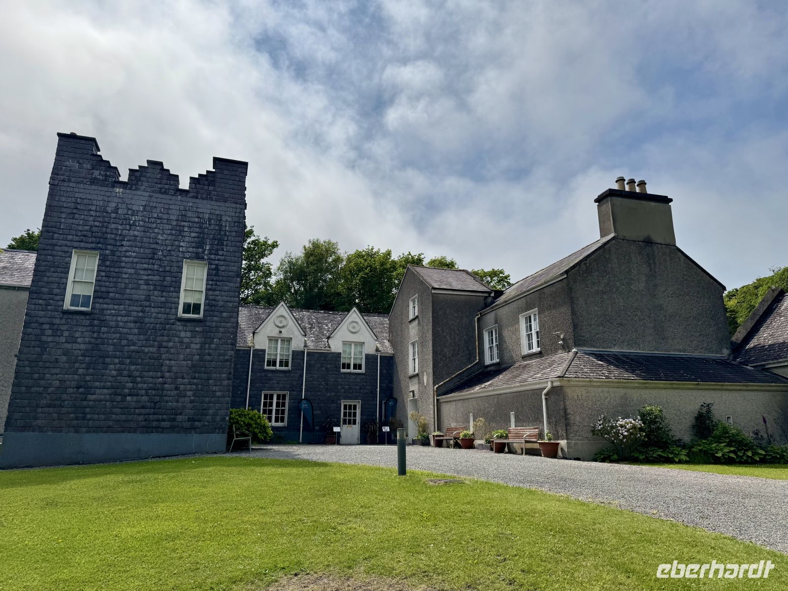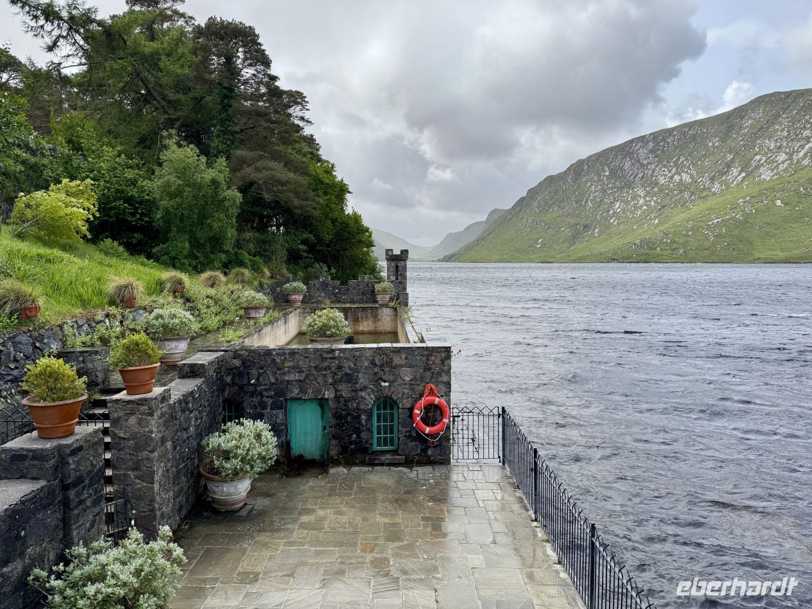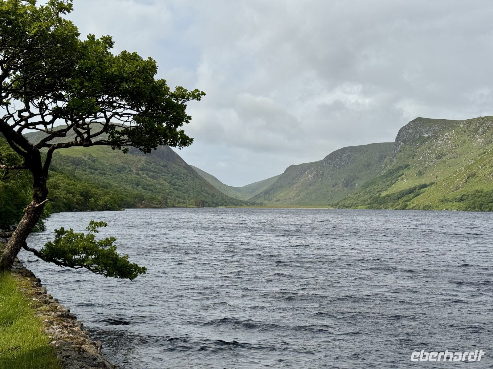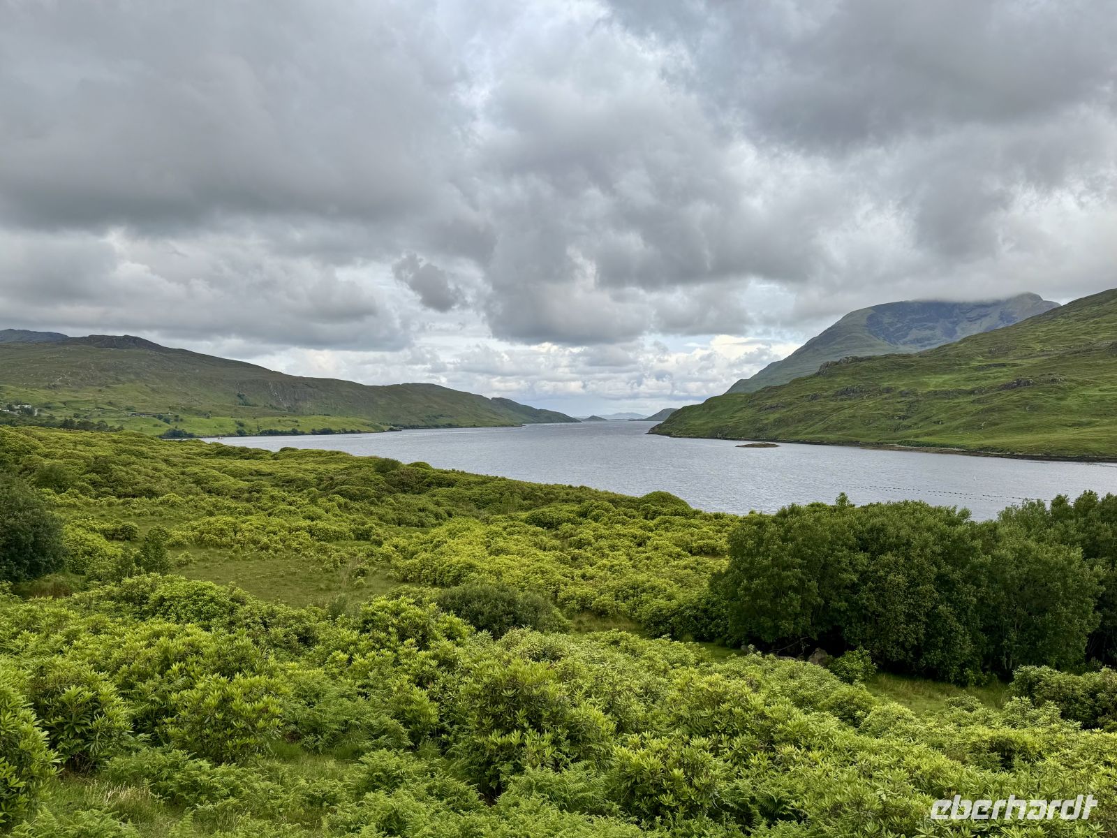 Bewölkt, aber kein Regen für den Tag — so lautet beim Frühstück Donals Prognose nach einem Blick auf sein Telefon. Nun, er ist zu seinem Glück (ein sehr guter) Busfahrer und kein Meteorologe, sonst hätte ich heute wohl Donald Trump zitieren müssen: „You're fired!“ Im Glenveagh-Nationalpark können wir nach der Filmvorführung im Besucherzentrum nämlich nicht direkt zu unserer Wanderung aufbrechen, sondern müssen uns am Castle erstmal einen Unterschlupf suchen. Um es positiv zu formulieren: perfekte Testbedingungen für meine neue Regenhose! Geduld ist in Irland wettertechnisch immer hilfreich, denn die nächste Jahreszeit ist meistens schon im Anmarsch. So können auch wir am Lough Veagh entlang tatsächlich eine sehr schöne und trockene Wanderung absolvieren. Wer hätte das vor zehn Minuten gedacht? Am Umkehrpunkt nehmen wir aber doch lieber im Inneren des kleinen Cottages Platz und nutzen die Pause gleich für eine Vorstellungsrunde. Von Schleswig-Holstein bis Bayern sind diesmal viele Bundesländer vertreten. Nachdem wir wieder zurück am Castle sind, können meine Gäste mit Donal noch hinauf zum Aussichtspunkt laufen. (Aufgrund meiner Bronchitis setze ich hier diesmal aus.) Von oben hat man einen tollen Blick über das ganze Tal. Schnell ein paar Fotos knipsen, denn die nächste Regenwolke ist schon im Anmarsch! Es bleibt noch ausreichend Freizeit für einen Bummel durch die Parkanlagen und den viktorianischen Walled Garden, einen Besuch im Schlosscafé oder auch im neuen Restaurant im Besucherzentrum. Im weiteren Verlauf des Nachmittags machen wir noch eine kleine Spritztour durch den Norden von Donegal, bei der wir auch den höchsten Berg der Grafschaft sehen, den Mount Errigal. Am Strand von Dunfanaghy sorgen heftiger Wind und Regen für nasse Rückenpartien, was ein ganz mutiges Exemplar der Gattung Reisegast jedoch nicht von einem Gang ins Meer abhält. Mit der Abfahrt wird es wieder schön — na ja, nicht immer kommt das bestellte Wetterpaket zum gewünschten Zeitpunkt, was jeder DHL- und Amazon-Kunde gewiss nachvollziehen kann. Etwa eine halbe Stunde später fahren wir auf der von vielen Pubs gesäumten Main Street durch Letterkenny und erreichen alsbald das Station House Hotel. Donal darf nun noch den Sand aus dem Bus kehren, dann hat auch er seinen wohlverdienten Feierabend.