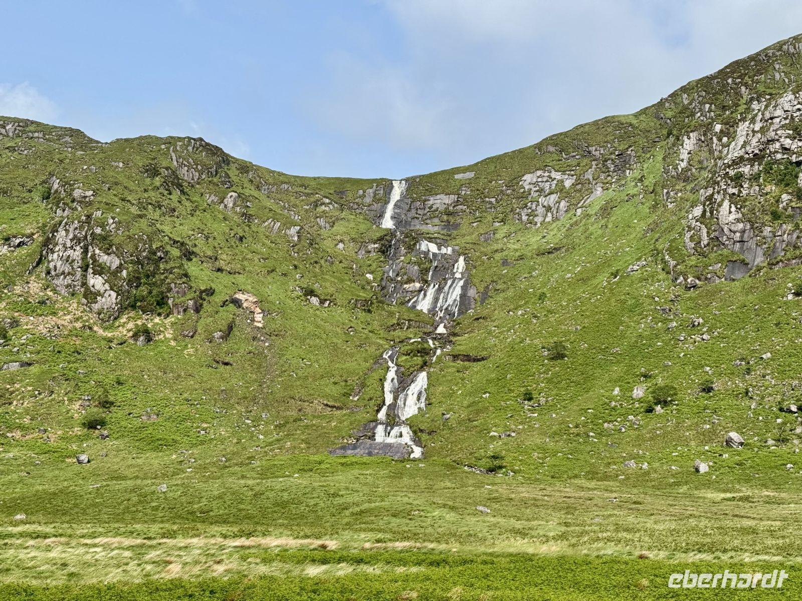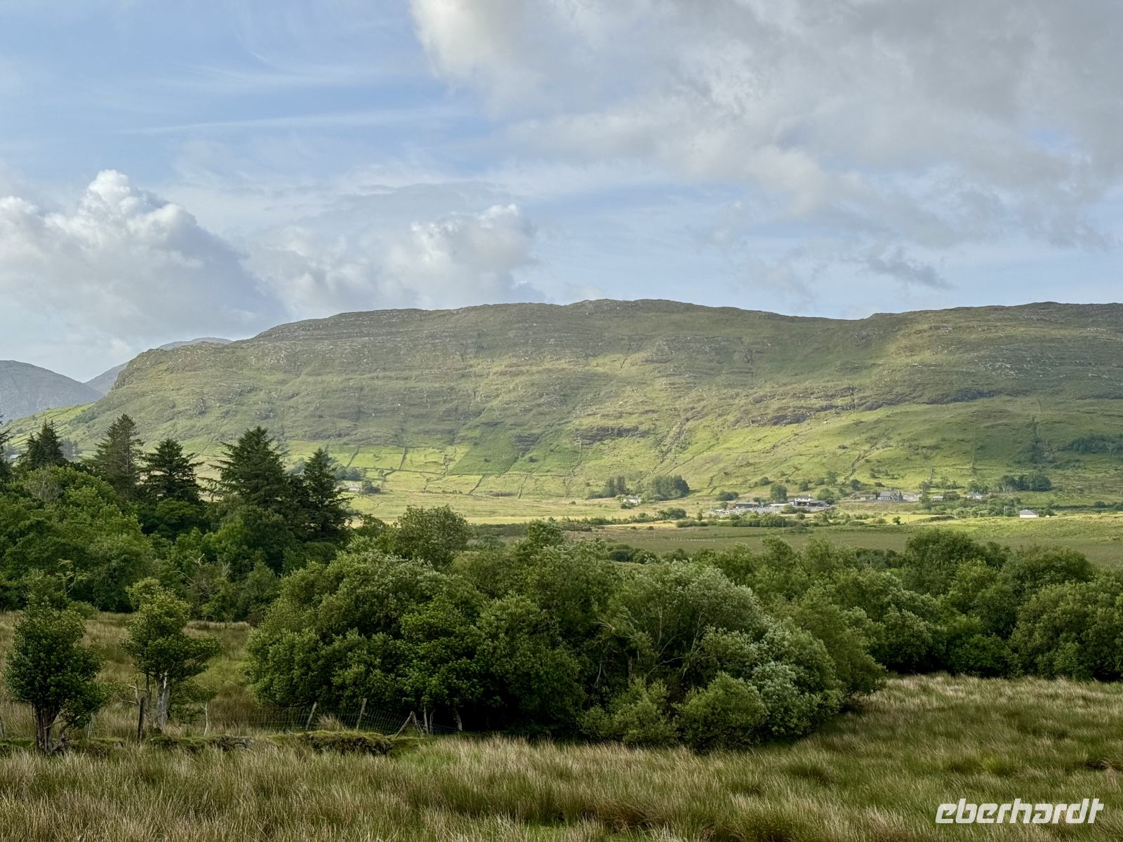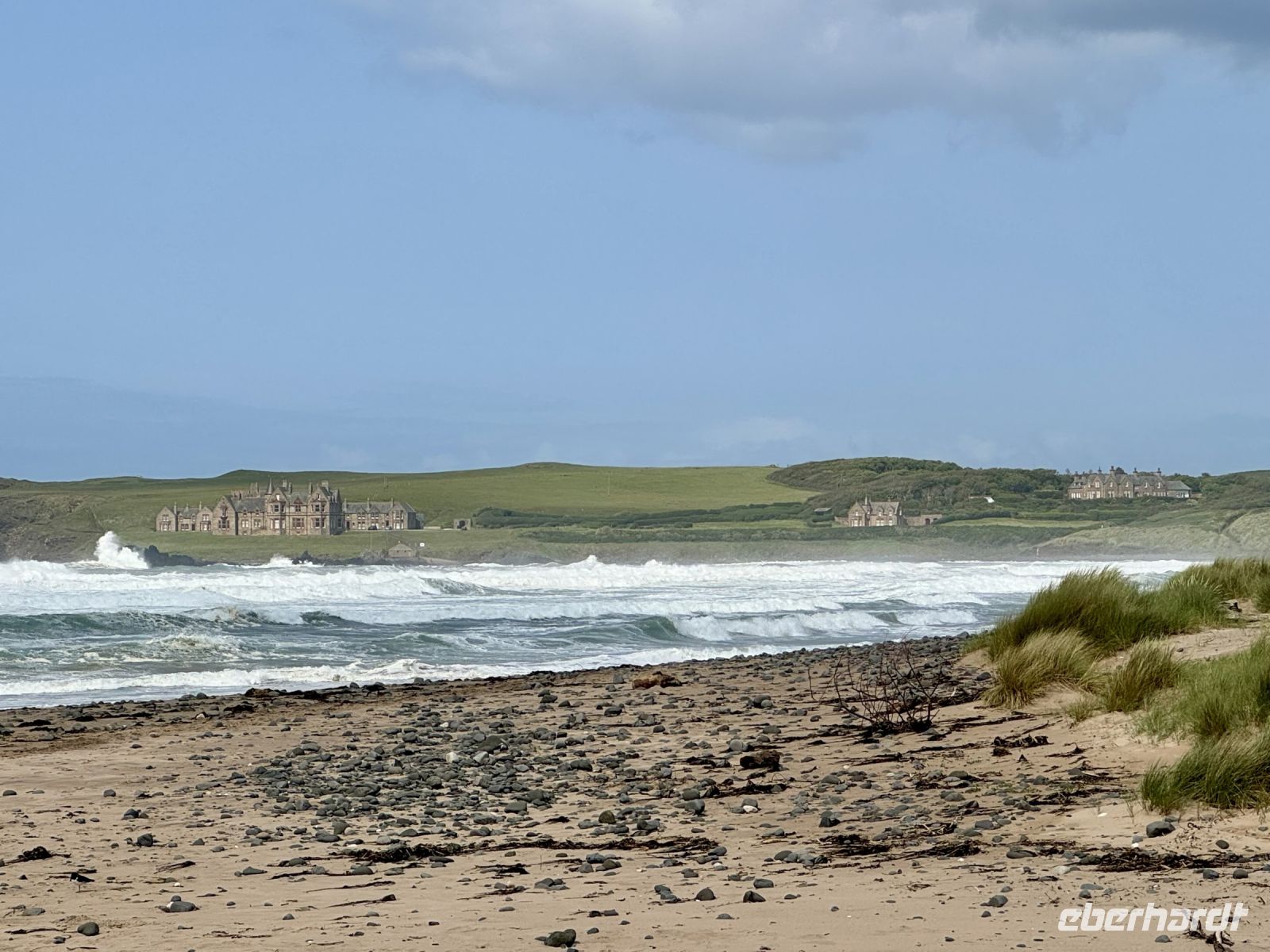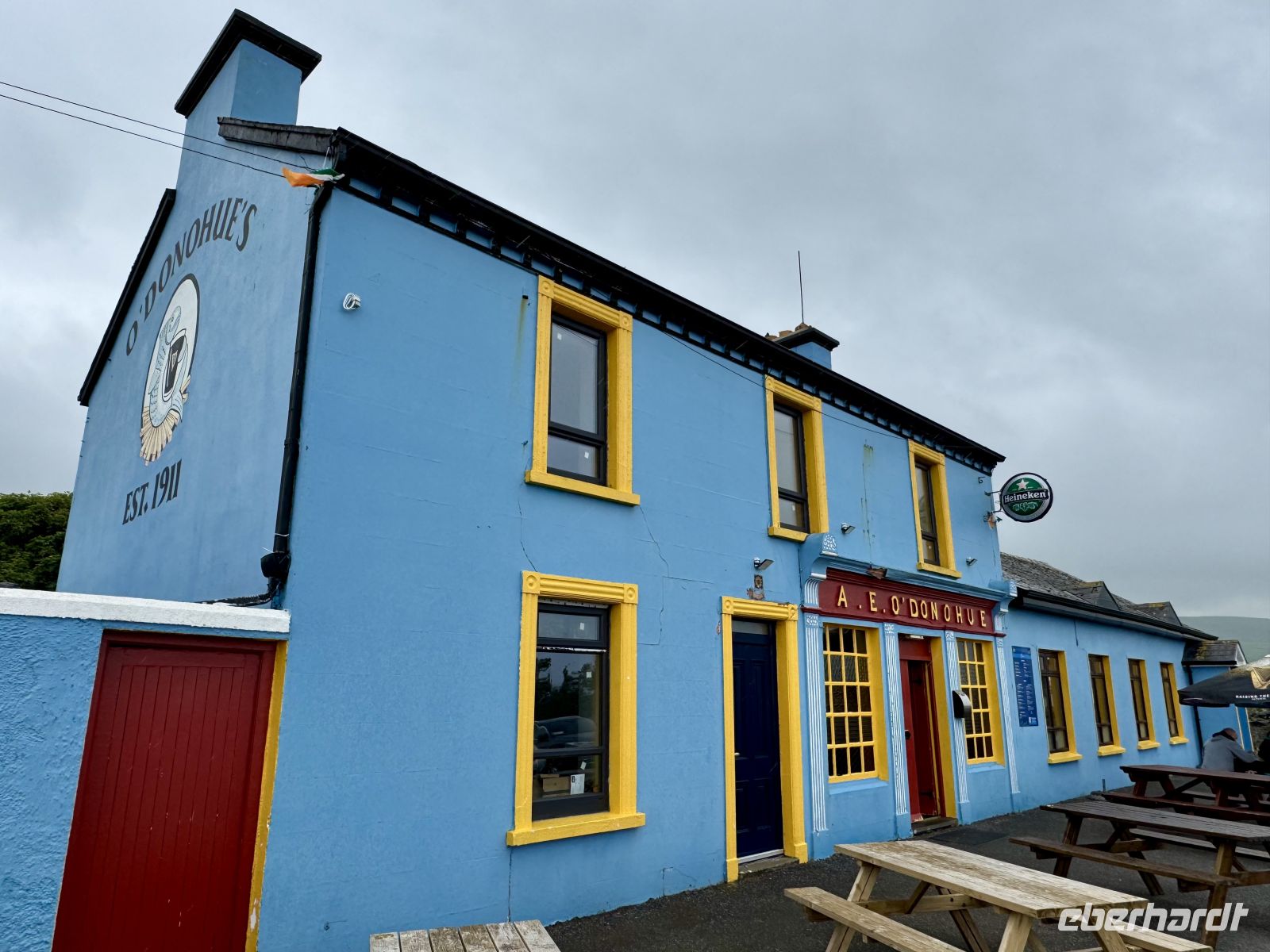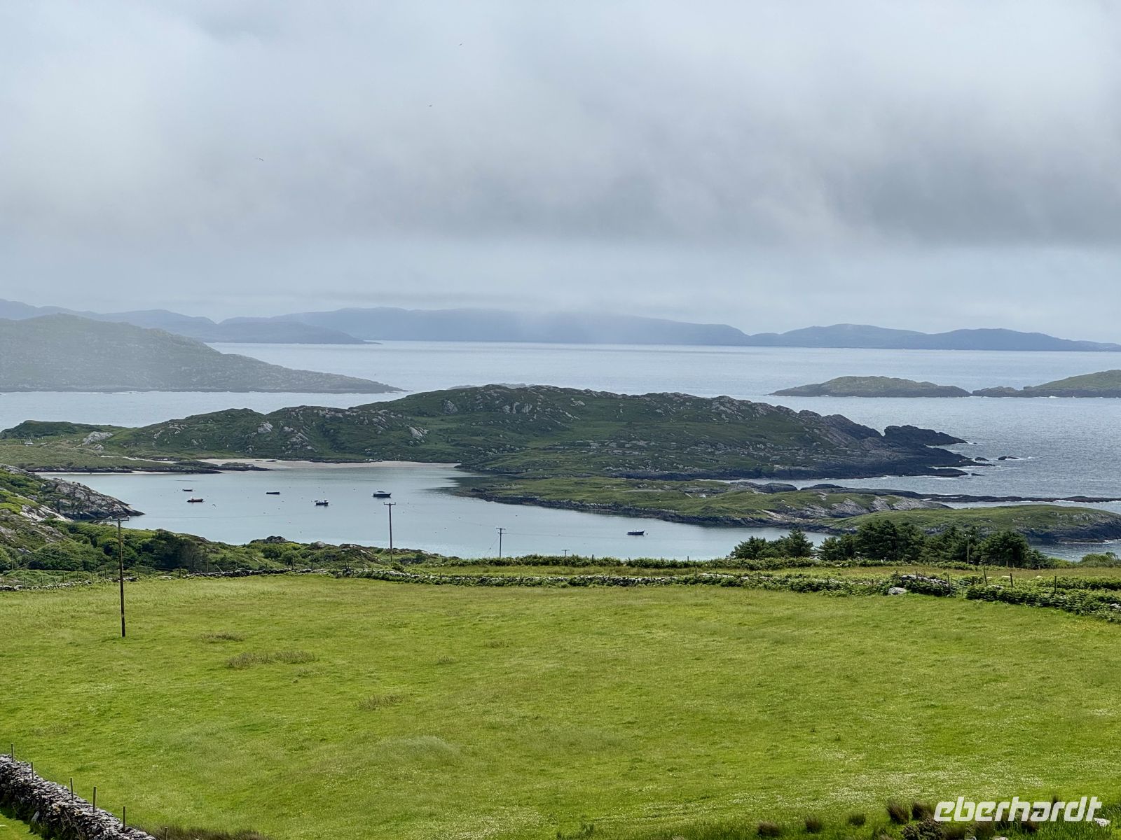 Bewölkt, aber kein Regen für den Tag — so lautet beim Frühstück Donals Prognose nach einem Blick auf sein Telefon. Nun, er ist zu seinem Glück (ein sehr guter) Busfahrer und kein Meteorologe, sonst hätte ich heute wohl Donald Trump zitieren müssen: „You're fired!“ Im Glenveagh-Nationalpark können wir nach der Filmvorführung im Besucherzentrum nämlich nicht direkt zu unserer Wanderung aufbrechen, sondern müssen uns am Castle erstmal einen Unterschlupf suchen. Um es positiv zu formulieren: perfekte Testbedingungen für meine neue Regenhose! Geduld ist in Irland wettertechnisch immer hilfreich, denn die nächste Jahreszeit ist meistens schon im Anmarsch. So können auch wir am Lough Veagh entlang tatsächlich eine sehr schöne und trockene Wanderung absolvieren. Wer hätte das vor zehn Minuten gedacht? Am Umkehrpunkt nehmen wir aber doch lieber im Inneren des kleinen Cottages Platz und nutzen die Pause gleich für eine Vorstellungsrunde. Von Schleswig-Holstein bis Bayern sind diesmal viele Bundesländer vertreten. Nachdem wir wieder zurück am Castle sind, können meine Gäste mit Donal noch hinauf zum Aussichtspunkt laufen. (Aufgrund meiner Bronchitis setze ich hier diesmal aus.) Von oben hat man einen tollen Blick über das ganze Tal. Schnell ein paar Fotos knipsen, denn die nächste Regenwolke ist schon im Anmarsch! Es bleibt noch ausreichend Freizeit für einen Bummel durch die Parkanlagen und den viktorianischen Walled Garden, einen Besuch im Schlosscafé oder auch im neuen Restaurant im Besucherzentrum. Im weiteren Verlauf des Nachmittags machen wir noch eine kleine Spritztour durch den Norden von Donegal, bei der wir auch den höchsten Berg der Grafschaft sehen, den Mount Errigal. Am Strand von Dunfanaghy sorgen heftiger Wind und Regen für nasse Rückenpartien, was ein ganz mutiges Exemplar der Gattung Reisegast jedoch nicht von einem Gang ins Meer abhält. Mit der Abfahrt wird es wieder schön — na ja, nicht immer kommt das bestellte Wetterpaket zum gewünschten Zeitpunkt, was jeder DHL- und Amazon-Kunde gewiss nachvollziehen kann. Etwa eine halbe Stunde später fahren wir auf der von vielen Pubs gesäumten Main Street durch Letterkenny und erreichen alsbald das Station House Hotel. Donal darf nun noch den Sand aus dem Bus kehren, dann hat auch er seinen wohlverdienten Feierabend.