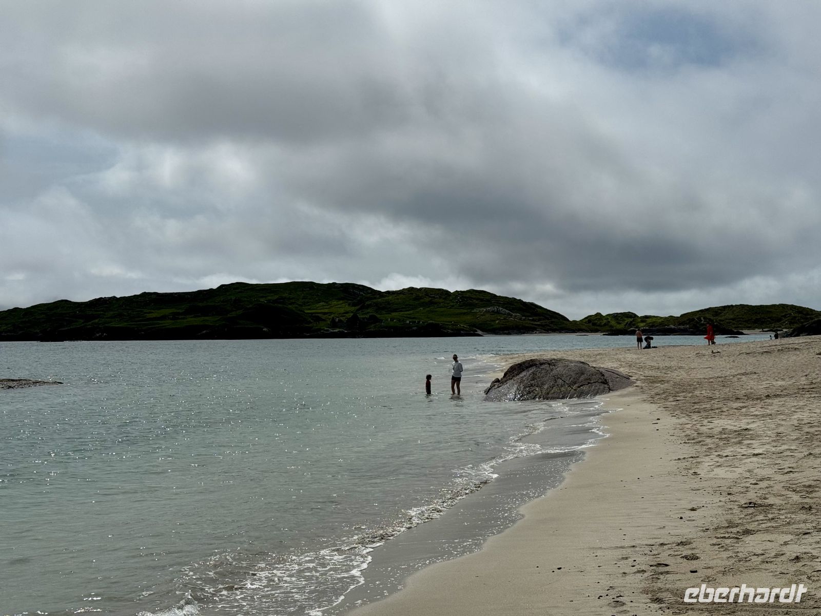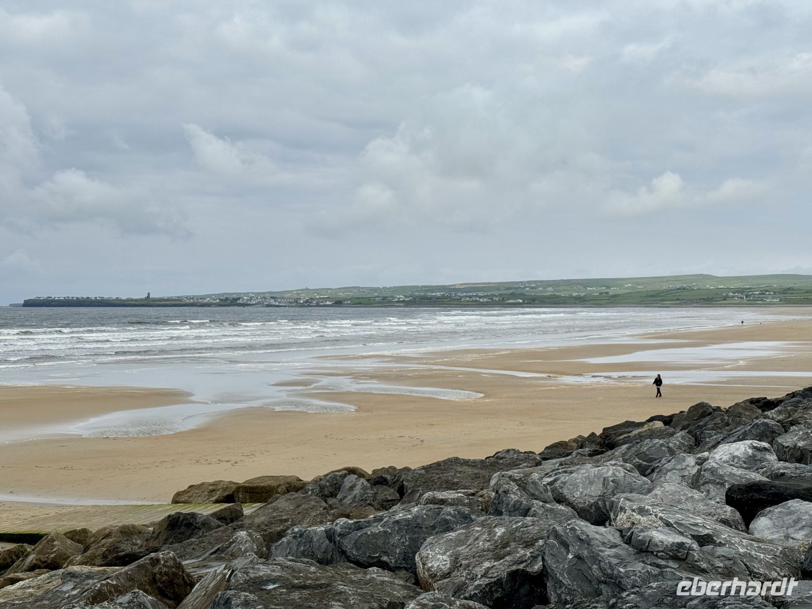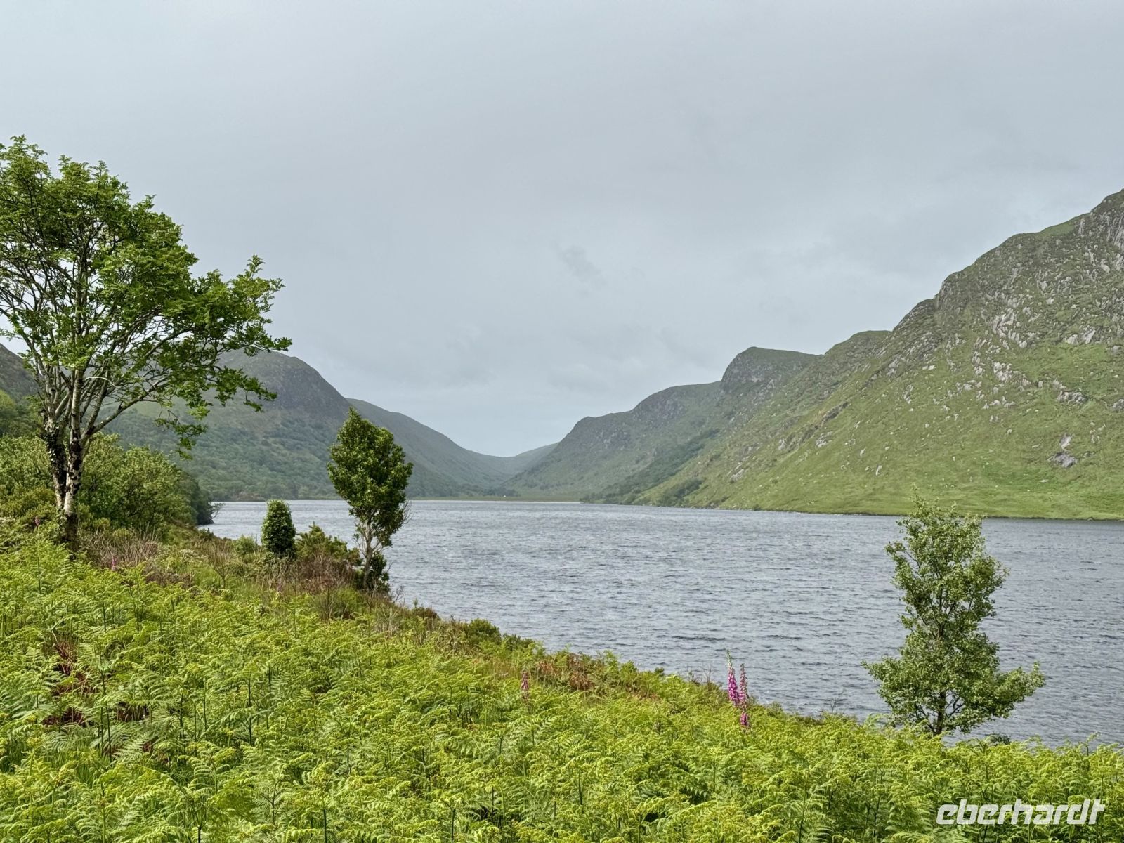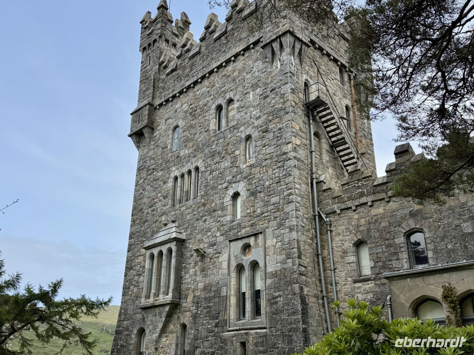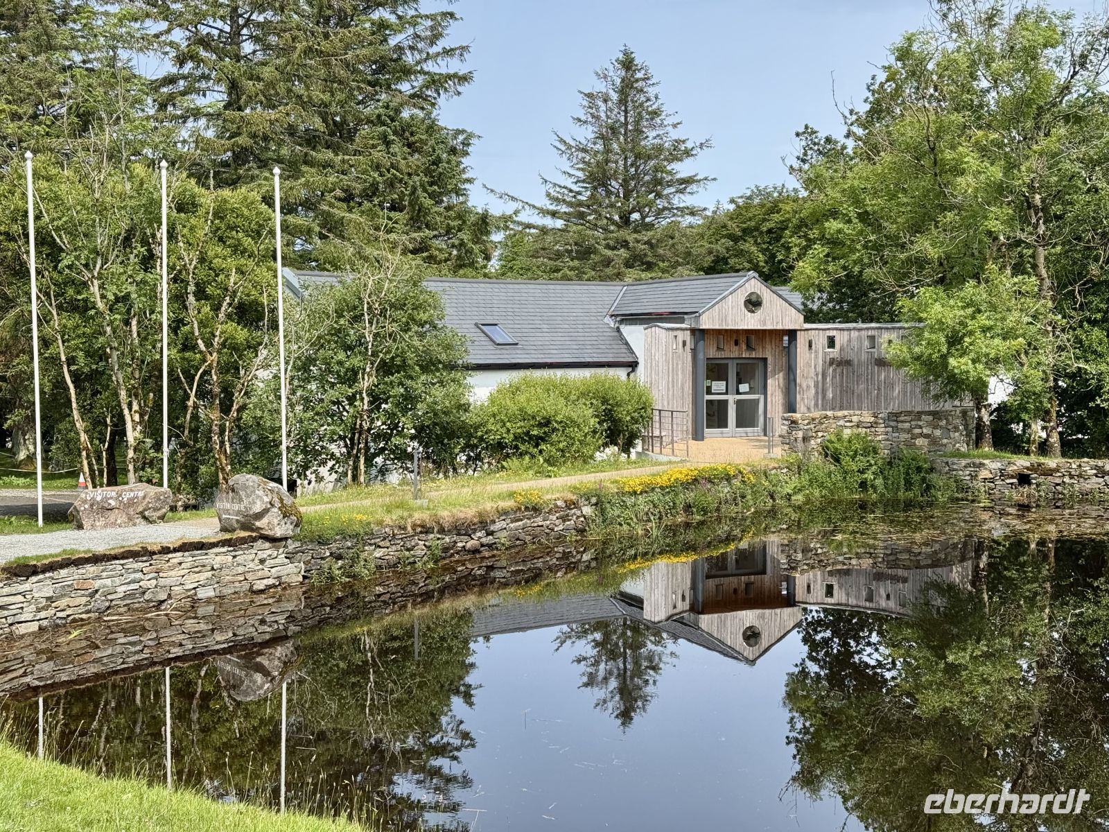 Bewölkt, aber kein Regen für den Tag — so lautet beim Frühstück Donals Prognose nach einem Blick auf sein Telefon. Nun, er ist zu seinem Glück (ein sehr guter) Busfahrer und kein Meteorologe, sonst hätte ich heute wohl Donald Trump zitieren müssen: „You're fired!“ Im Glenveagh-Nationalpark können wir nach der Filmvorführung im Besucherzentrum nämlich nicht direkt zu unserer Wanderung aufbrechen, sondern müssen uns am Castle erstmal einen Unterschlupf suchen. Um es positiv zu formulieren: perfekte Testbedingungen für meine neue Regenhose! Geduld ist in Irland wettertechnisch immer hilfreich, denn die nächste Jahreszeit ist meistens schon im Anmarsch. So können auch wir am Lough Veagh entlang tatsächlich eine sehr schöne und trockene Wanderung absolvieren. Wer hätte das vor zehn Minuten gedacht? Am Umkehrpunkt nehmen wir aber doch lieber im Inneren des kleinen Cottages Platz und nutzen die Pause gleich für eine Vorstellungsrunde. Von Schleswig-Holstein bis Bayern sind diesmal viele Bundesländer vertreten. Nachdem wir wieder zurück am Castle sind, können meine Gäste mit Donal noch hinauf zum Aussichtspunkt laufen. (Aufgrund meiner Bronchitis setze ich hier diesmal aus.) Von oben hat man einen tollen Blick über das ganze Tal. Schnell ein paar Fotos knipsen, denn die nächste Regenwolke ist schon im Anmarsch! Es bleibt noch ausreichend Freizeit für einen Bummel durch die Parkanlagen und den viktorianischen Walled Garden, einen Besuch im Schlosscafé oder auch im neuen Restaurant im Besucherzentrum. Im weiteren Verlauf des Nachmittags machen wir noch eine kleine Spritztour durch den Norden von Donegal, bei der wir auch den höchsten Berg der Grafschaft sehen, den Mount Errigal. Am Strand von Dunfanaghy sorgen heftiger Wind und Regen für nasse Rückenpartien, was ein ganz mutiges Exemplar der Gattung Reisegast jedoch nicht von einem Gang ins Meer abhält. Mit der Abfahrt wird es wieder schön — na ja, nicht immer kommt das bestellte Wetterpaket zum gewünschten Zeitpunkt, was jeder DHL- und Amazon-Kunde gewiss nachvollziehen kann. Etwa eine halbe Stunde später fahren wir auf der von vielen Pubs gesäumten Main Street durch Letterkenny und erreichen alsbald das Station House Hotel. Donal darf nun noch den Sand aus dem Bus kehren, dann hat auch er seinen wohlverdienten Feierabend.